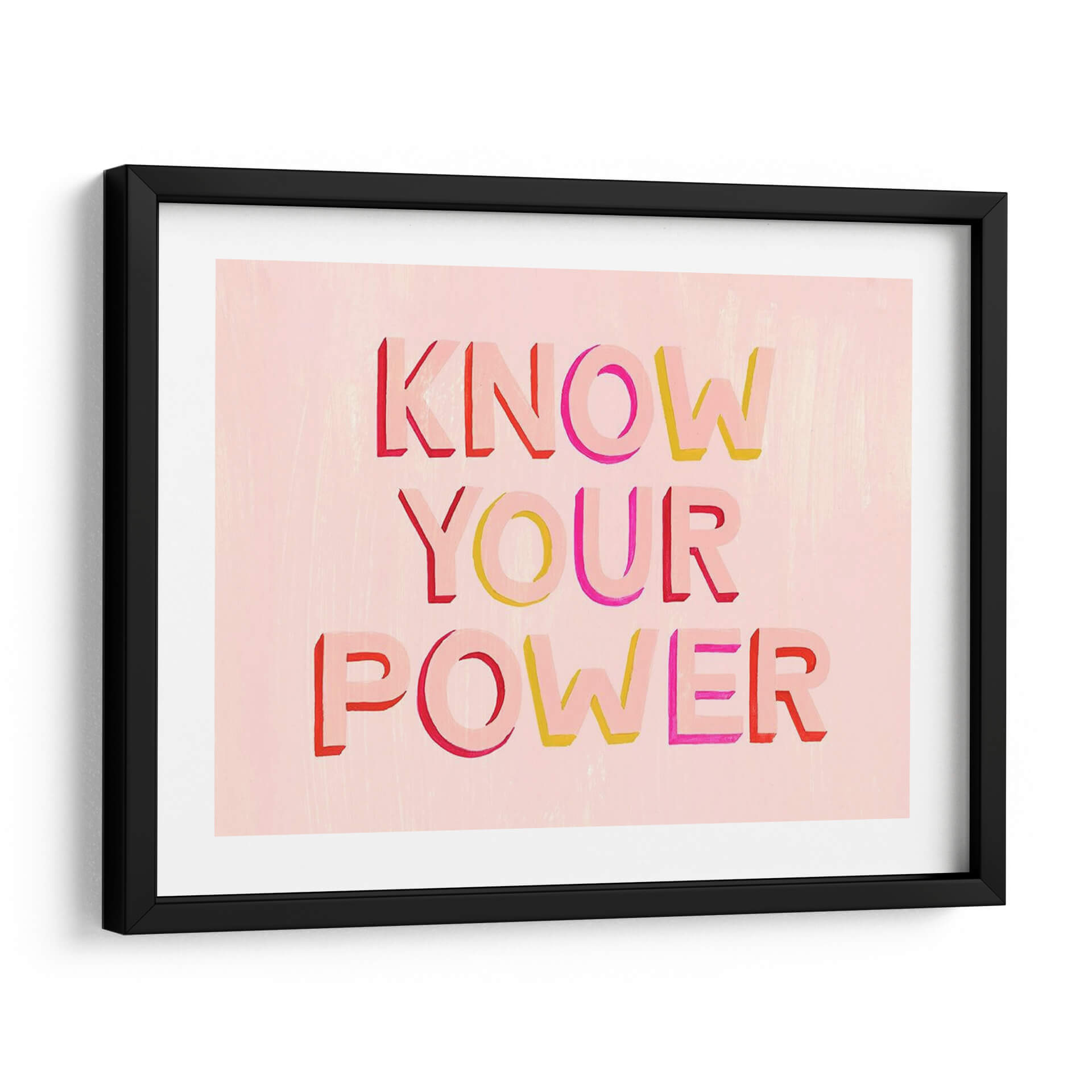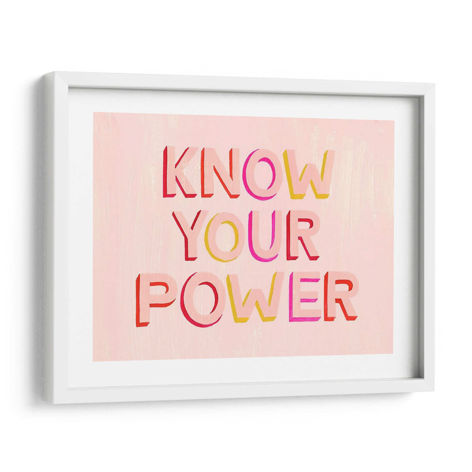 Este vibrante cuadro decorativo, titulado 'Eres Poderoso II' por Grace Popp, es una explosión de energía positiva y empoderamiento. La obra presenta la inspiradora frase "KNOW YOUR POWER" en letras tridimensionales y audaces, dispuestas en tres líneas. Las letras, pintadas en tonos cálidos de rojo, rosa intenso y amarillo, contrastan maravillosamente con un suave fondo de color rosa pálido con una textura sutil, reminiscente de pinceladas delicadas. La composición tipográfica es el eje central, creando un diseño gráfico contemporáneo y llamativo que irradia confianza y autoafirmación. Ideal para cualquier espacio que necesite un toque de motivación, este cuadro decorativo es perfecto para aulas, oficinas, gimnasios o dormitorios. Su estilo moderno y su mensaje universal lo convierten en una pieza versátil que inspira fuerza interior y celebración personal. Añade un acento de color y un poderoso recordatorio diario de tu potencial con esta obra única de arte de pared.