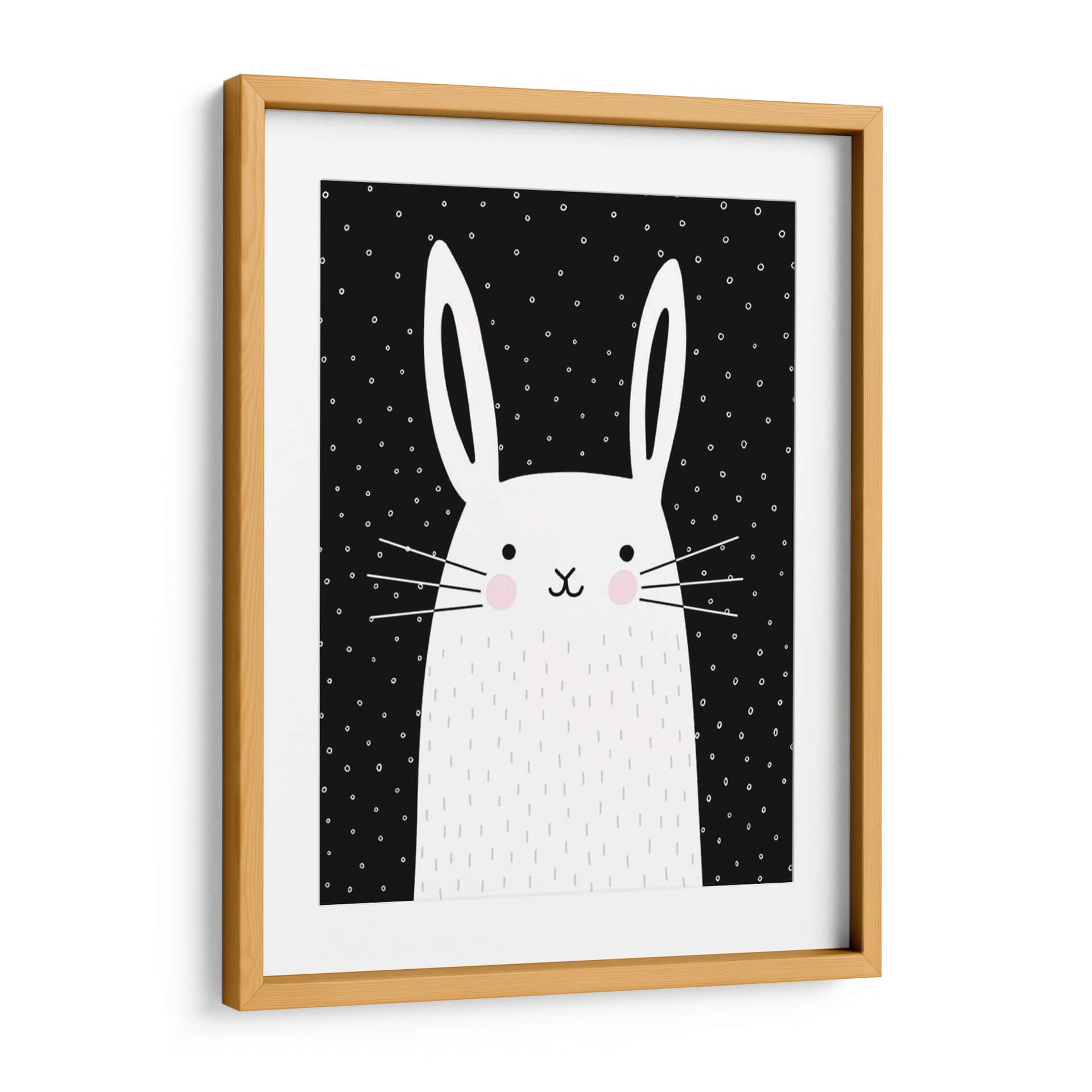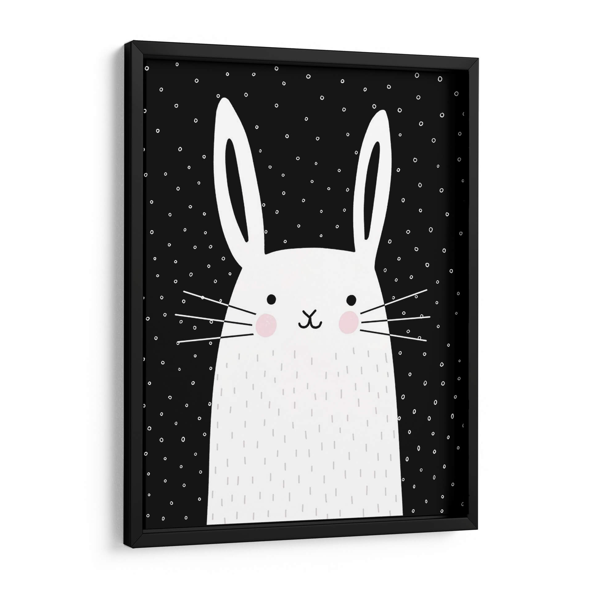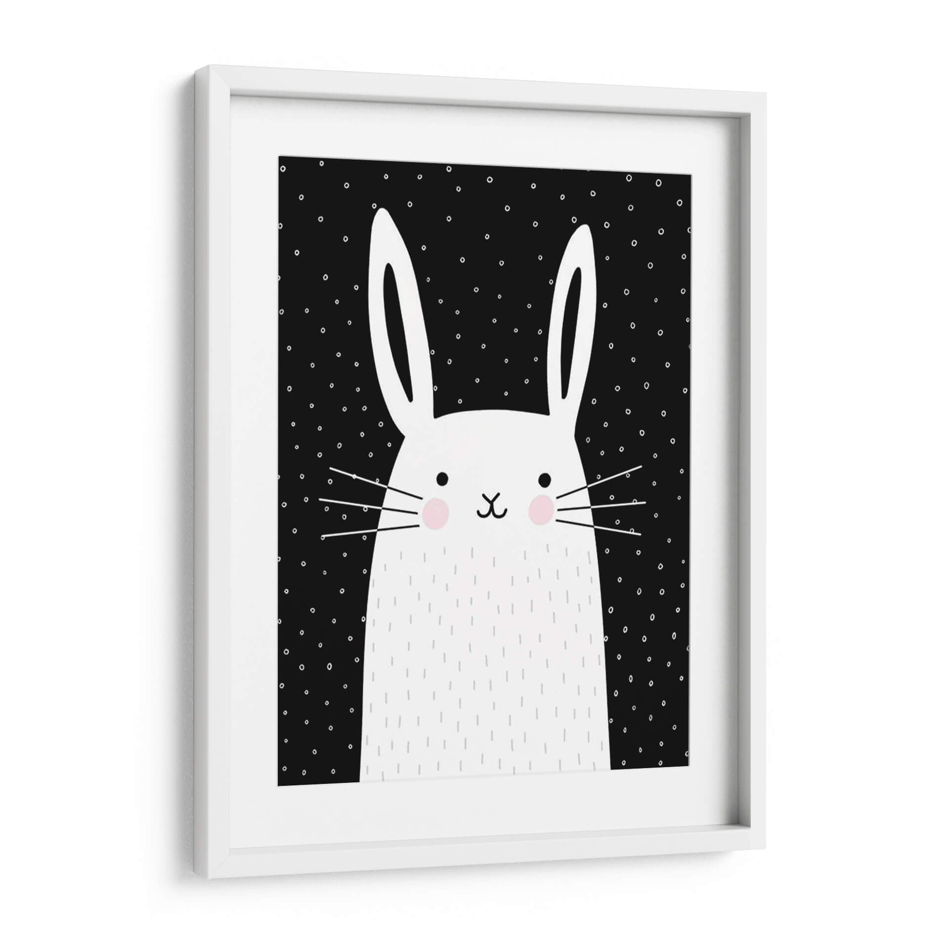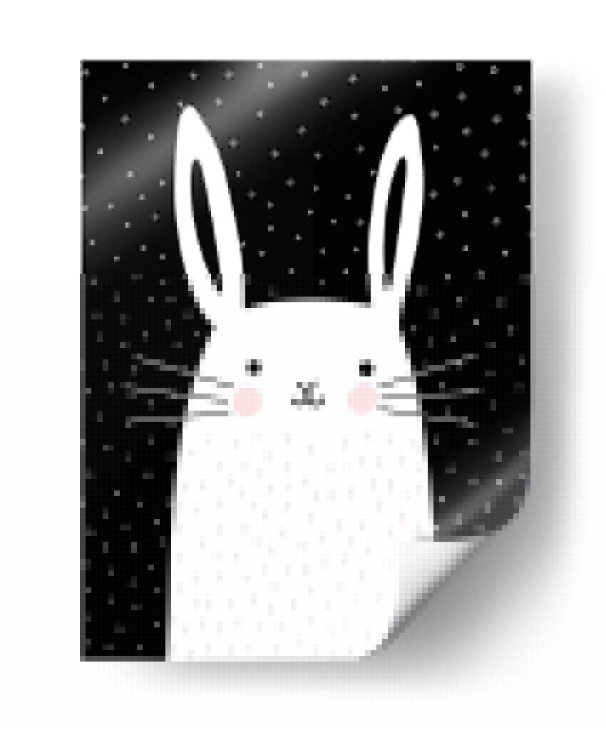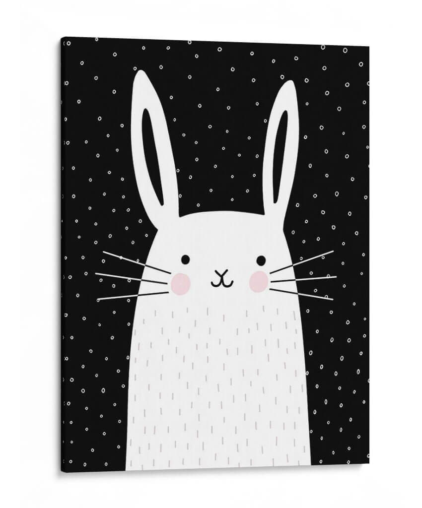 Inyecta una dosis de encanto y modernidad en tu hogar con este cautivador cuadro decorativo, una obra de arte digital titulada 'Mezclar Y Combinar Animal V' de la artista Victoria Borges. La pieza presenta un adorable conejo blanco con detalles minimalistas sobre un fondo negro salpicado de pequeños puntos blancos. Sus grandes orejas y mejillas sonrosadas le confieren una expresión dulce y juguetona, mientras que los trazos delicados que simulan pelaje y los bigotes añaden un toque tierno. La audaz paleta de colores, dominada por el contraste entre el blanco y el negro con sutiles toques de rosa, crea una atmósfera visualmente atractiva y contemporánea. Este diseño, con su estilo gráfico y limpio, es ideal para espacios que buscan un toque de personalidad y alegría, como habitaciones infantiles, estudios creativos o salas de estar modernas. Su composición centrada y la simplicidad de sus elementos lo convierten en un punto focal versátil, capaz de complementar una decoración escandinava, minimalista o incluso ecléctica. Un cuadro decorativo que evoca ternura y estilo, perfecto para quienes buscan arte de pared que combine diversión y sofisticación.