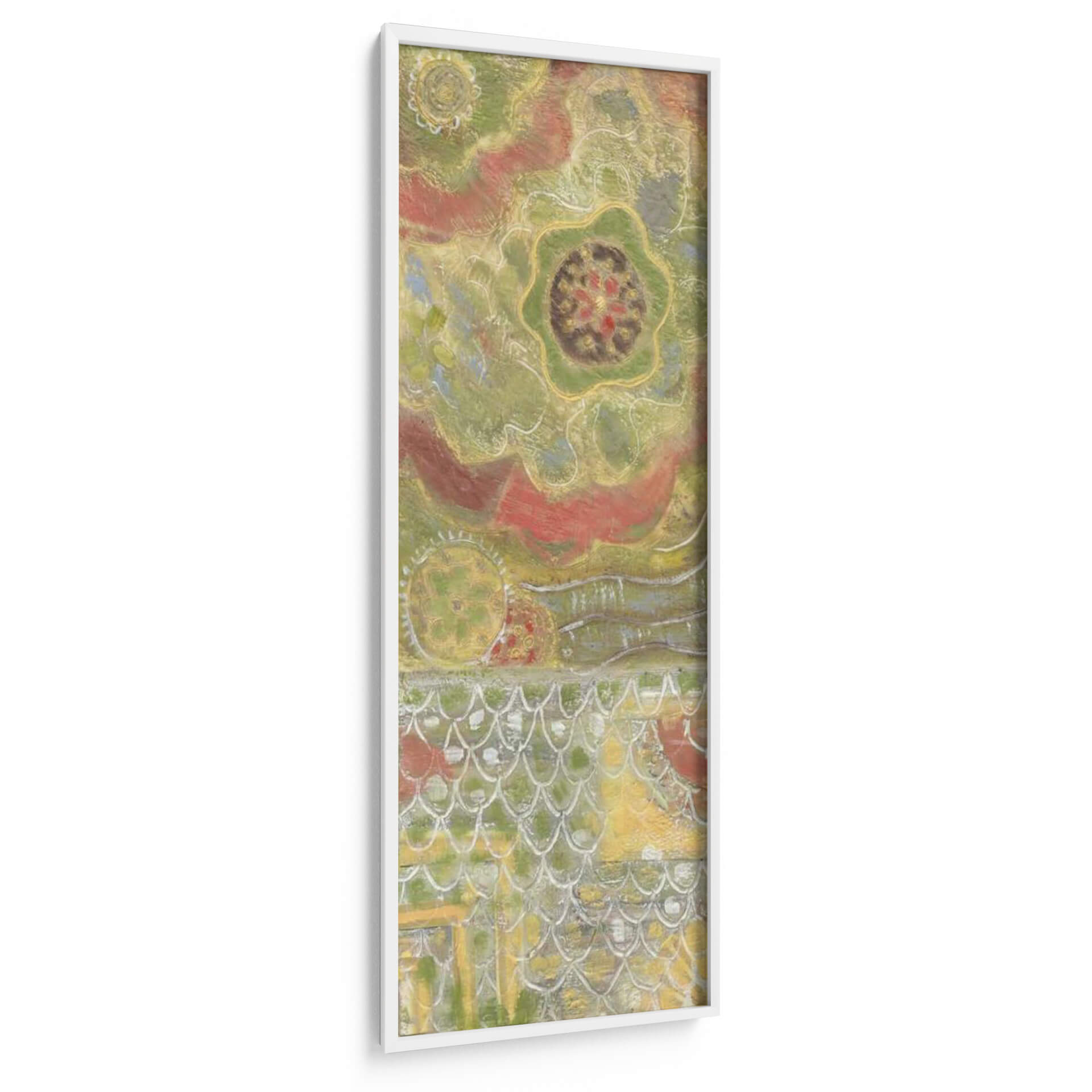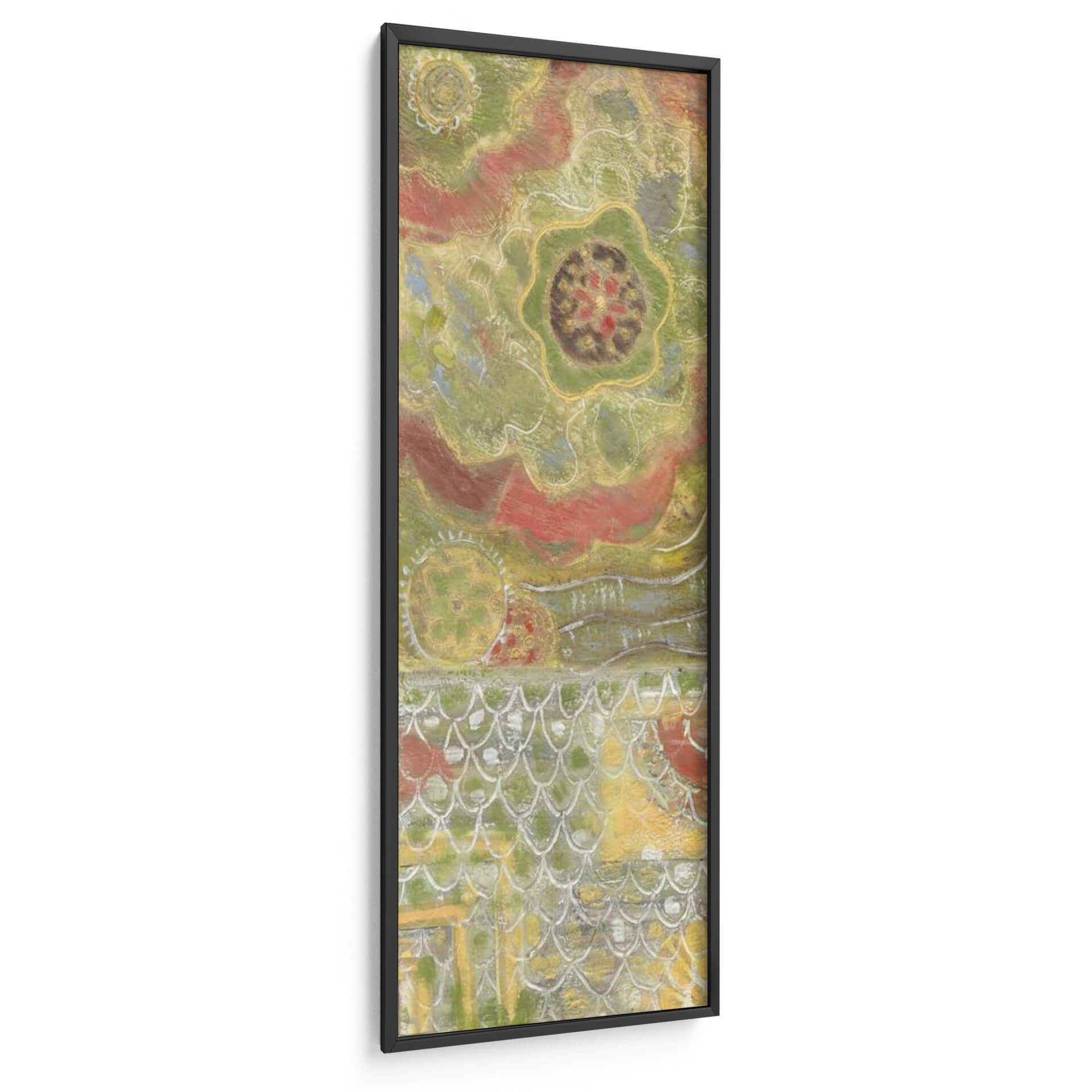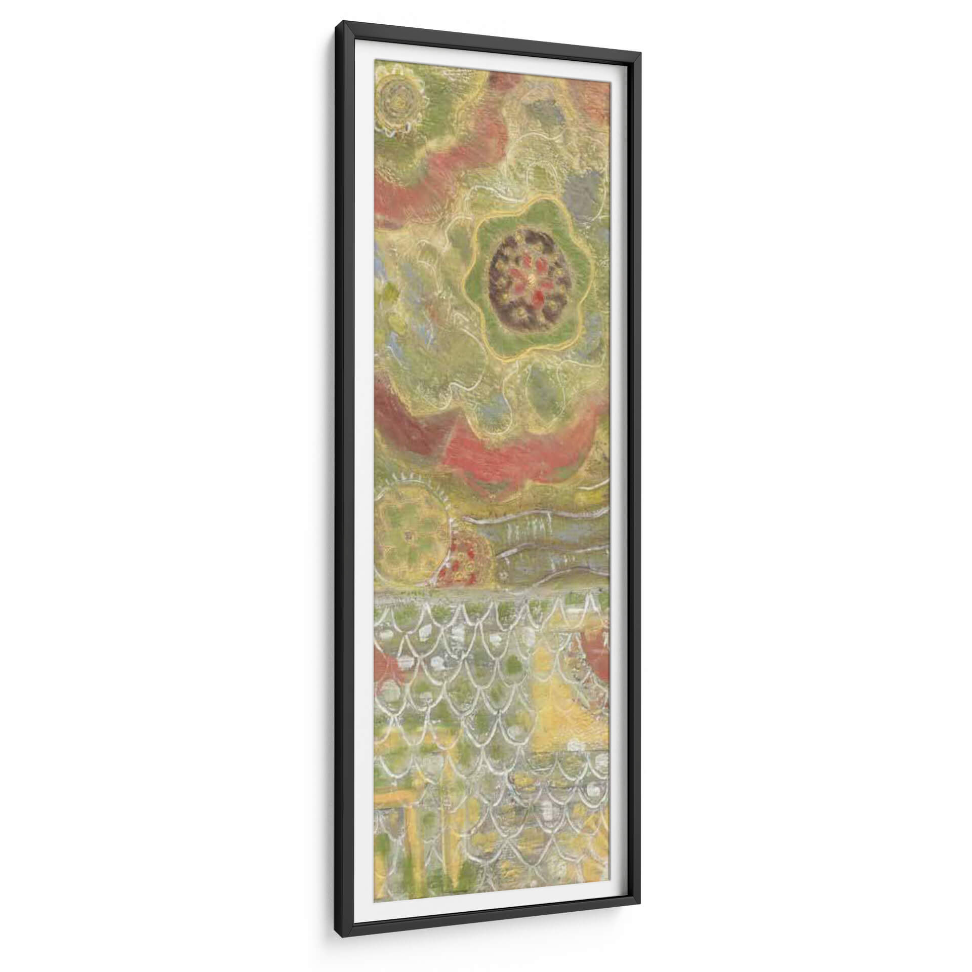 Sumérgete en la riqueza visual de "Borroso Marroquí I", una obra de arte contemporáneo de Karen Deans que evoca la esencia de los vibrantes mercados y la arquitectura intrincada de Marruecos. Este cuadro decorativo abstracto se caracteriza por su paleta de colores terrosos y cálidos, dominada por verdes musgo, ocres dorados y toques de rojo terracota, que se entrelazan en patrones orgánicos y texturas sugerentes. La composición, aunque abstracta, invita a la interpretación, con formas circulares que recuerdan a detalles ornamentales y líneas sinuosas que imitan paisajes o telas fluidas. Cada pincelada parece contar una historia, creando una atmósfera de misterio exótico y serenidad. "Borroso Marroquí I" es ideal para añadir un toque de sofisticación bohemia y calidez a cualquier espacio, desde una sala de estar moderna hasta un estudio personal o una oficina que busque inspirar creatividad y tranquilidad. Su formato vertical lo hace perfecto para complementar paredes estrechas o como parte de una composición mural más amplia, aportando profundidad y un aire de viajero del mundo a tu decoración.
