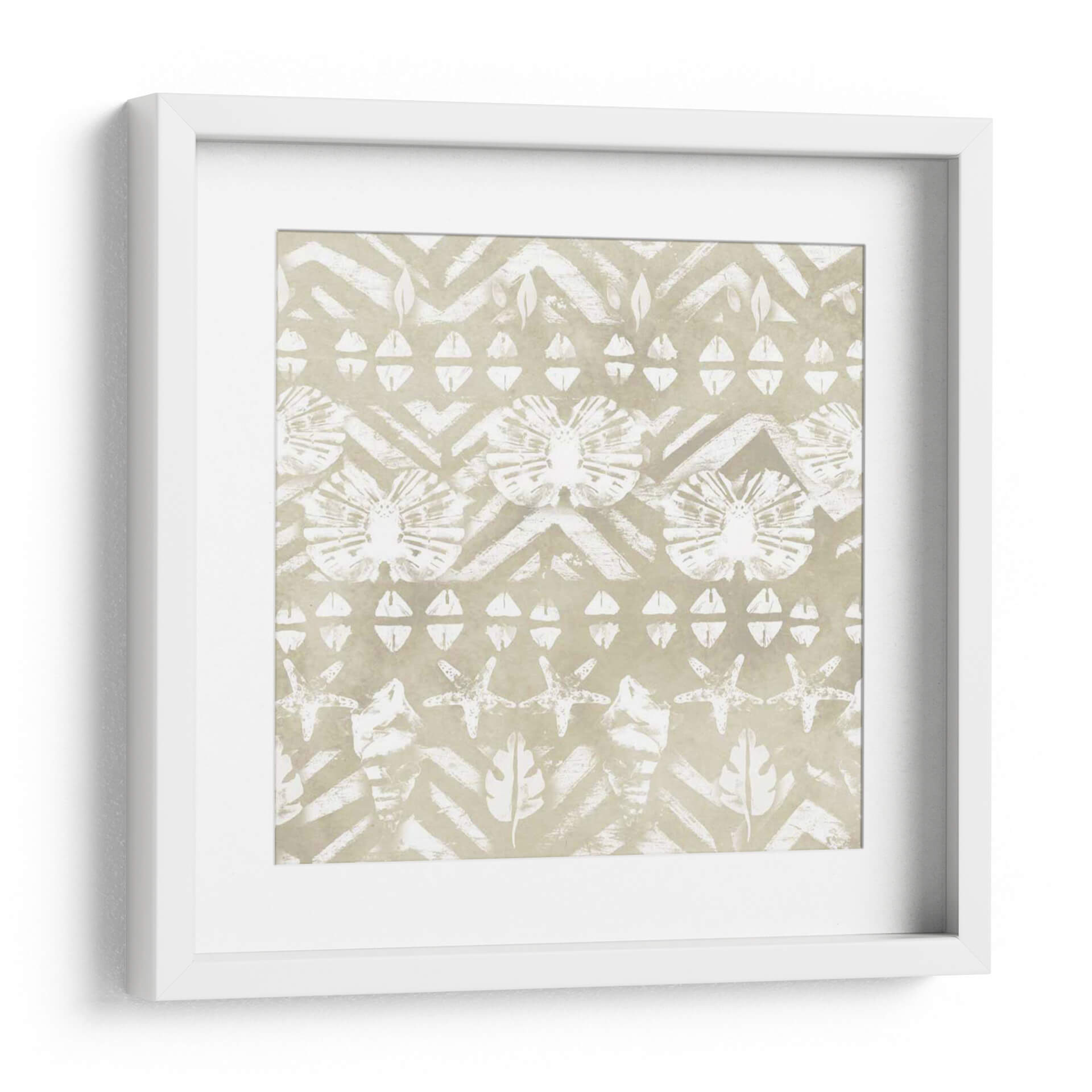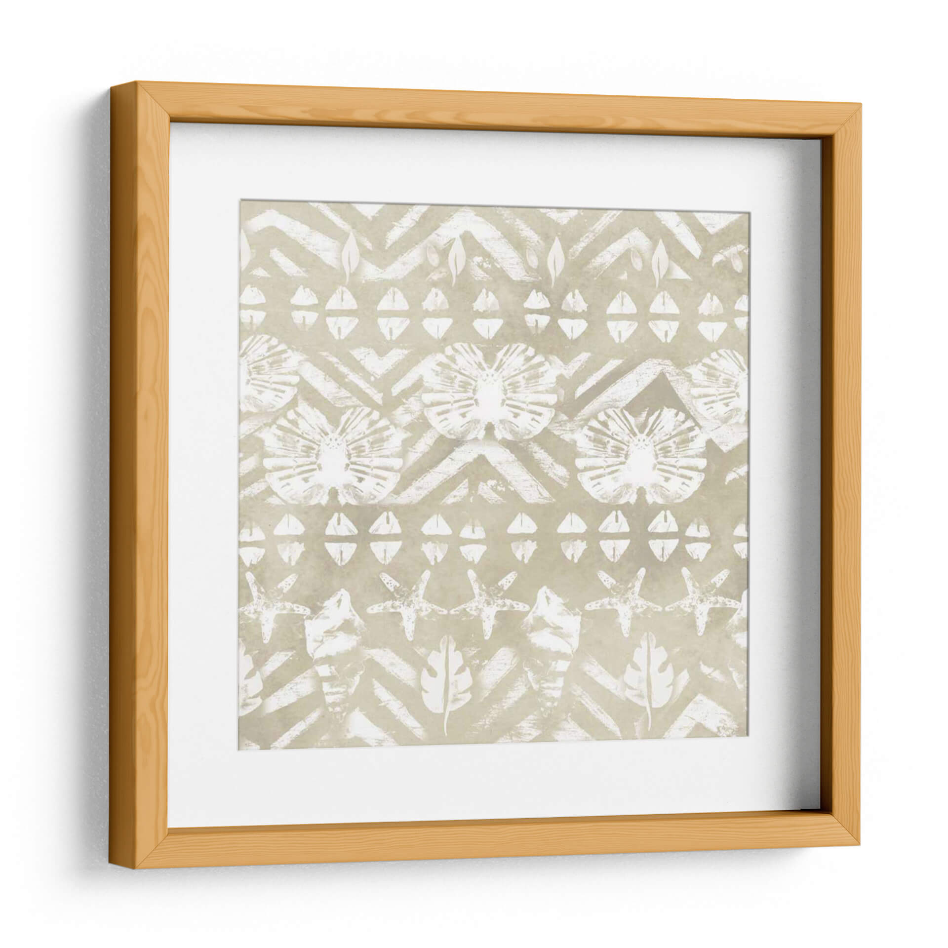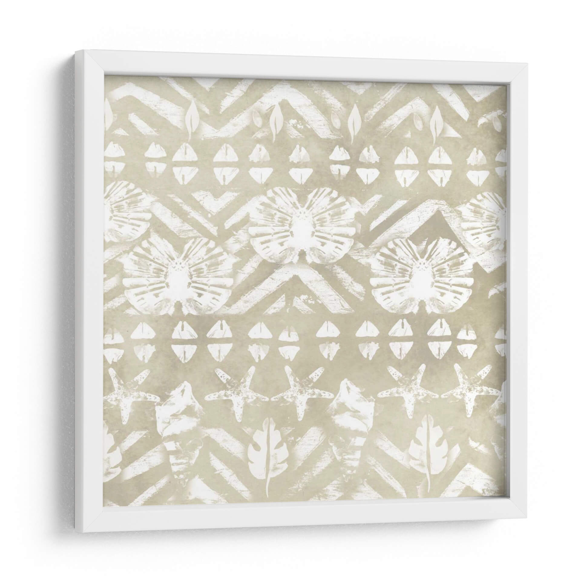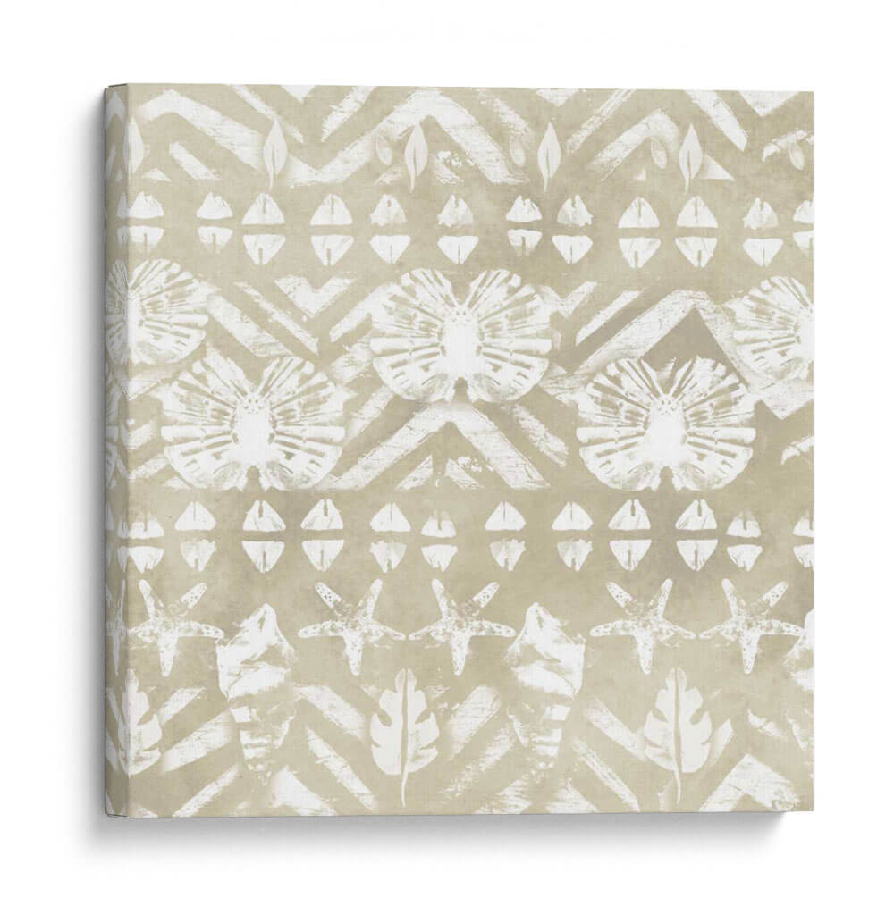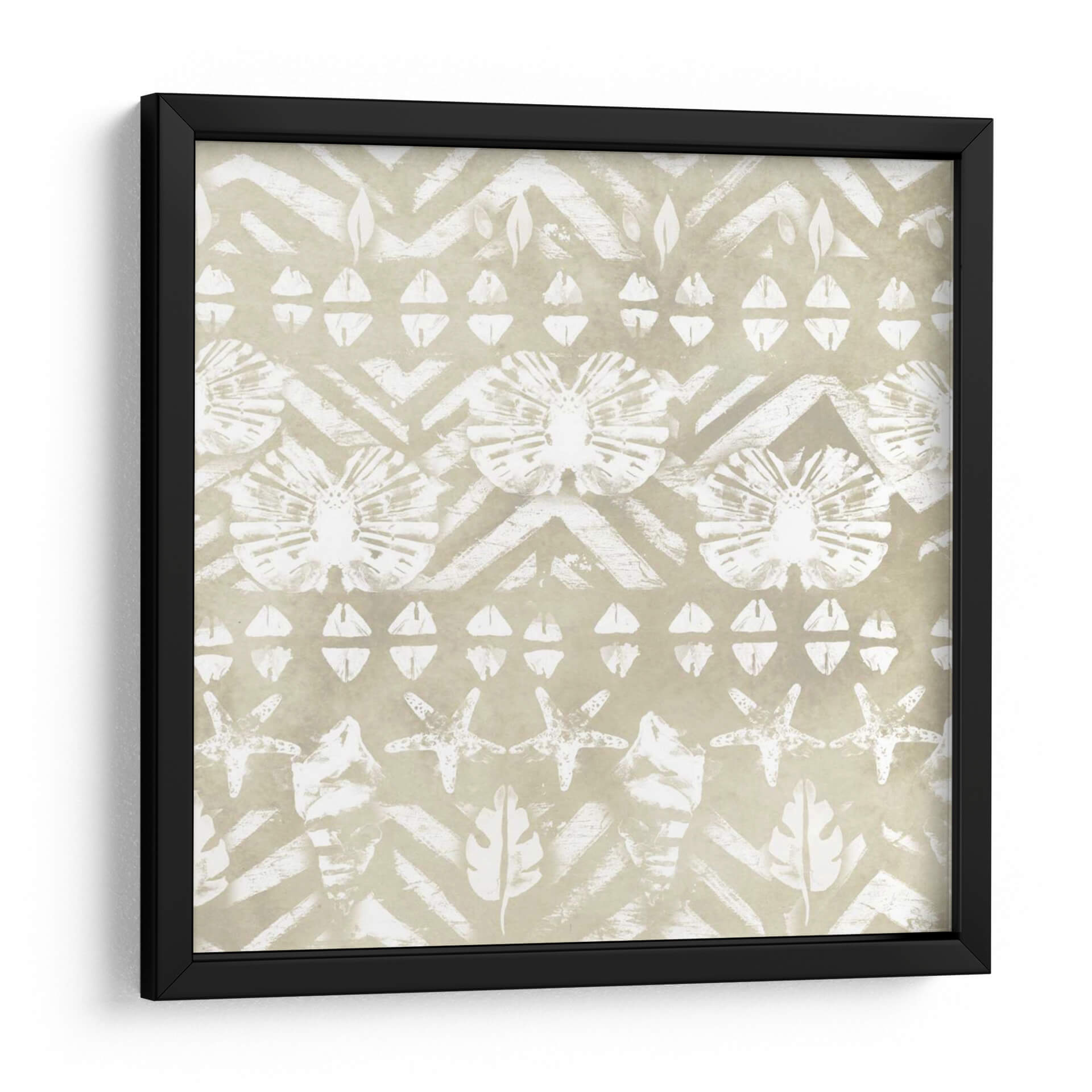 Sumérgete en la serenidad y el encanto natural con 'Costa Tribal I', una obra de arte contemporáneo que evoca la belleza sutil de la costa con un toque etéreo. Este cuadro decorativo presenta un patrón intrincado y texturizado, dominado por una paleta de colores tierra y crudos que aportan calidez y una sensación de calma al espacio. Los motivos de inspiración tribal, que incluyen formas orgánicas como hojas y elementos marinos estilizados como estrellas de mar, se entrelazan con patrones geométricos audaces, creando una composición visualmente rica pero equilibrada. La técnica de aplicación de pintura, que sugiere un acabado artesanal o con sello, añade profundidad y carácter a la pieza, invitando a la contemplación. "Costa Tribal I" es ideal para añadir un acento sofisticado y natural a cualquier decoración, desde salones modernos hasta dormitorios o estudios que busquen un ambiente relajado y estéticamente cuidado. Su diseño versátil permite que se integre armoniosamente en diversos estilos decorativos, aportando un toque de arte bohemio y orgánico. Descubre cómo esta pieza única puede transformar tu hogar en un refugio de estilo y tranquilidad.