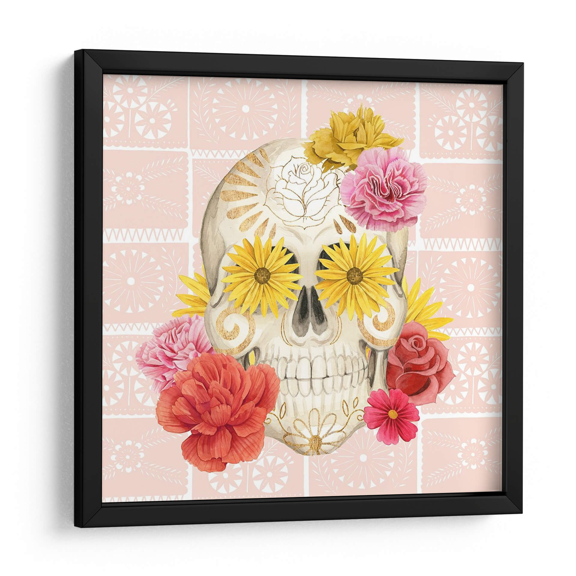 Celebra la vibrante tradición del Día de Muertos con este cautivador cuadro decorativo, "Fiesta De La Vida Muertos II" de Grace Popp. La obra presenta una calavera adornada con flores de vivos colores, evocando la celebración y el renacimiento que caracterizan a esta festividad mexicana. Los girasoles y las rosas en tonos amarillos, rosas y rojos contrastan maravillosamente con el fondo rosa pálido, creando una composición alegre y llena de vida. Los detalles dorados en la calavera añaden un toque de elegancia y misticismo. Este cuadro es ideal para añadir un toque de color y significado cultural a tu sala de estar, comedor u oficina. Su estilo único, que fusiona elementos tradicionales con una estética contemporánea, lo convierte en una pieza de arte de pared que no pasará desapercibida y que invita a la reflexión sobre la vida y la memoria. Añade esta obra maestra a tu colección y transforma cualquier espacio en una expresión de alegría y tradición.