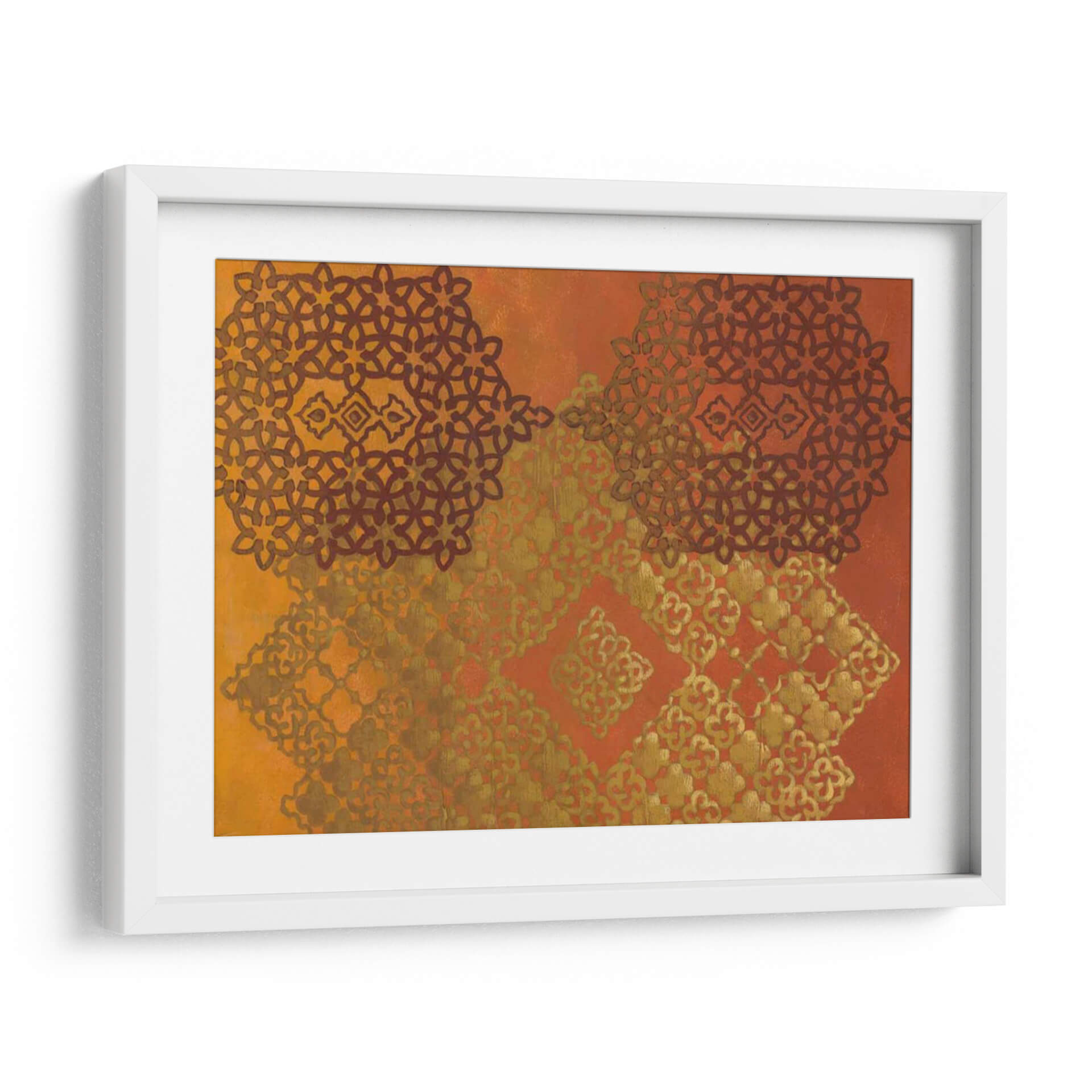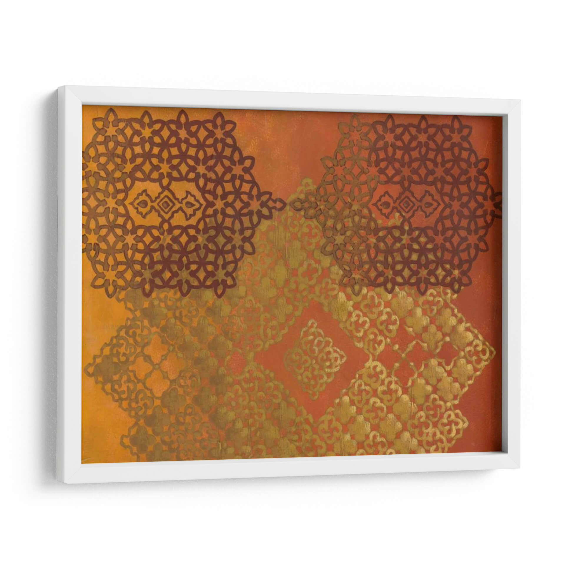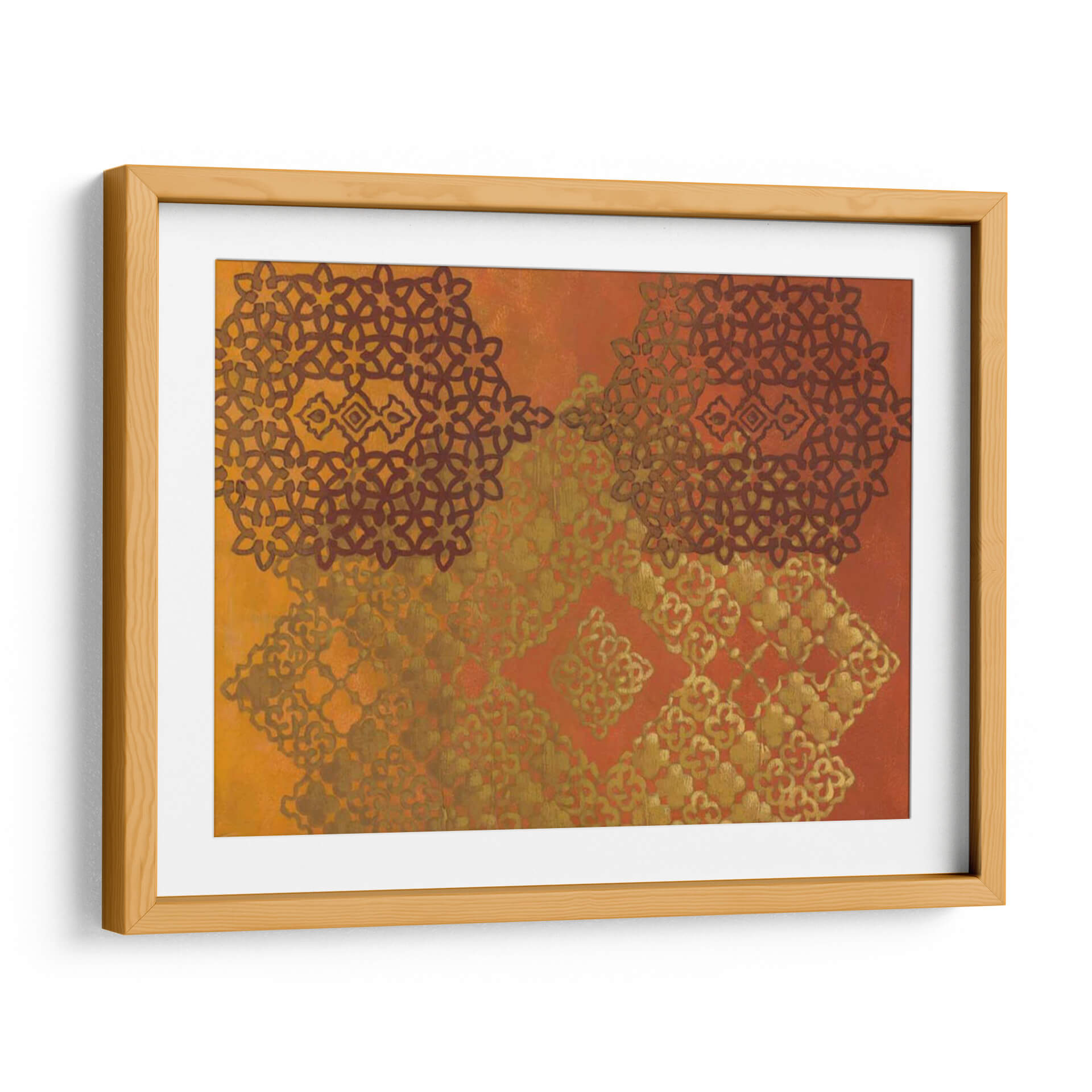 Embellece tu hogar con la cautivadora obra de arte 'Henna II De Oro' de Chariklia Zarris. Esta pieza abstracta fusiona intrincados patrones geométricos en tonos dorados y terracota, creando una sensación de calidez y sofisticación. Los detalles delicados y la paleta de colores terrosos, que van desde el ocre vibrante hasta el marrón profundo, evocan una atmósfera acogedora y rica. La composición presenta una superposición de motivos inspirados en el arte de la henna, con formas circulares y romboidales que se entrelazan de manera armoniosa. El estilo contemporáneo y la ejecución magistral de Zarris aportan una dimensión única a cualquier espacio. Ideal para quienes buscan añadir un toque de elegancia bohemia o un acento exótico a su sala de estar, dormitorio u oficina. Este cuadro decorativo es una invitación a la contemplación y un reflejo de la belleza atemporal. Transforma tus paredes en un lienzo de expresión y estilo con esta obra maestra.