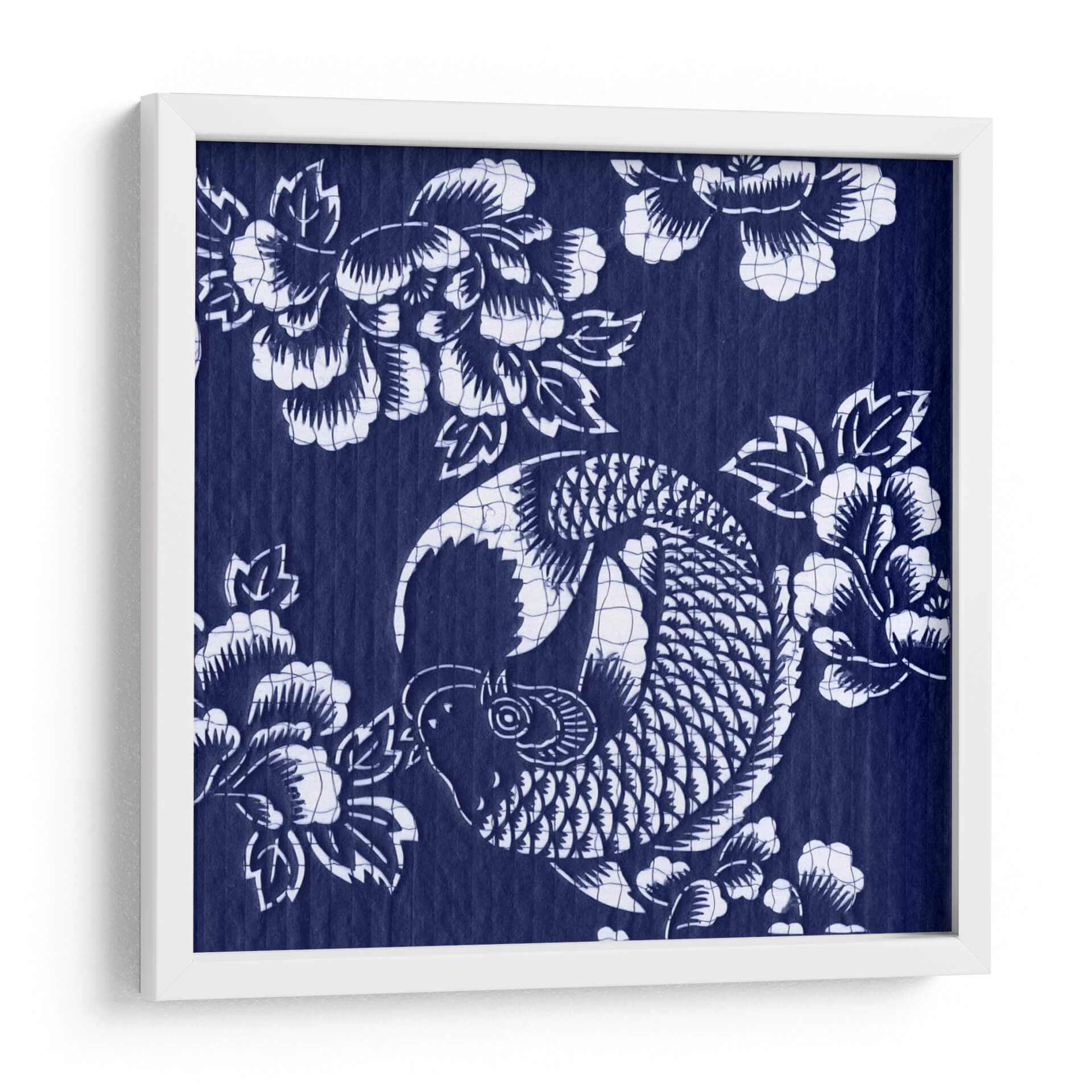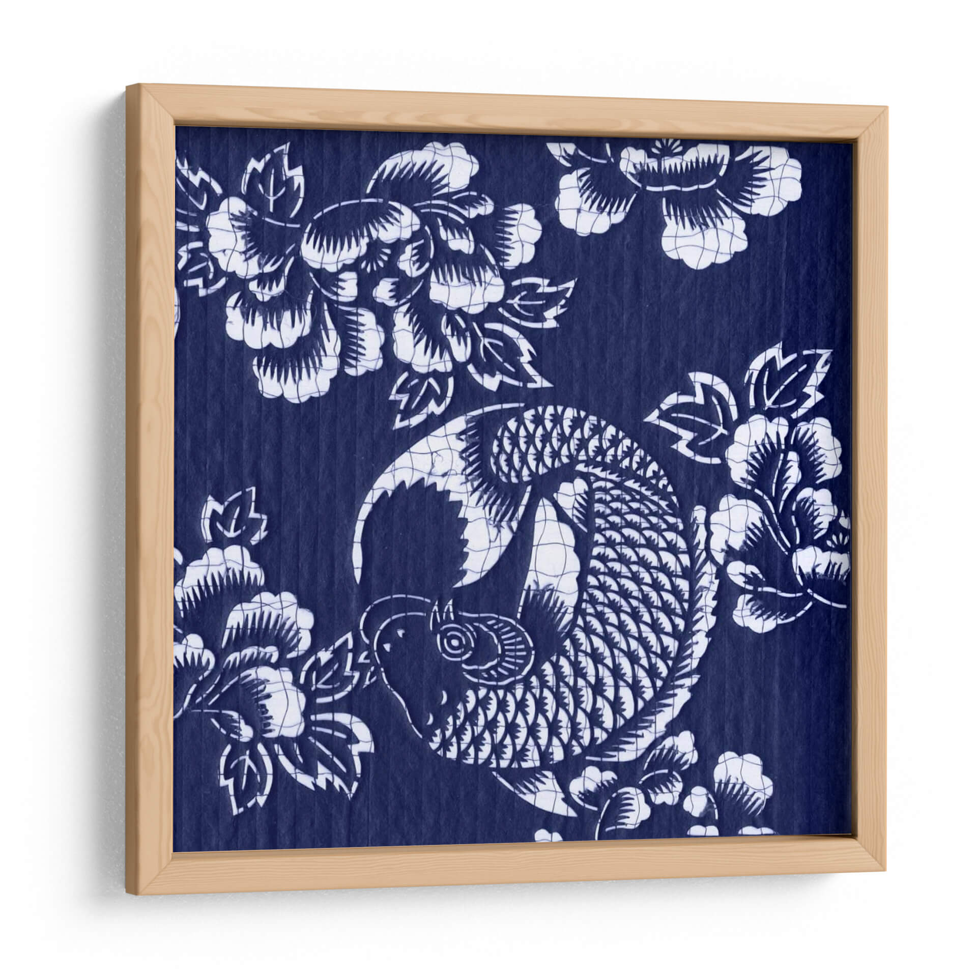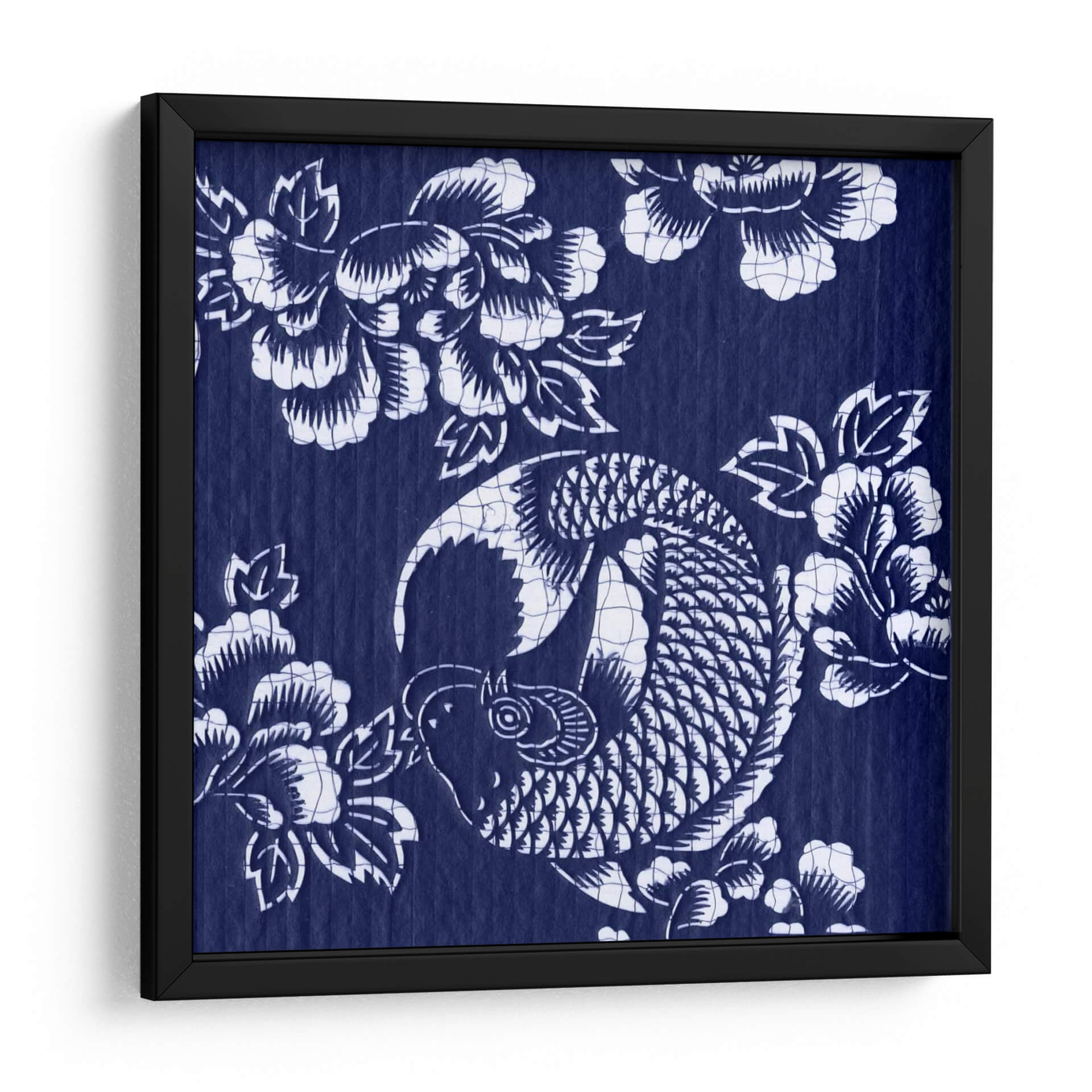 Sumérgete en la serenidad y la elegancia con "Índigo Carpa Katagami III", una obra de arte que captura la esencia de la cultura japonesa a través de un diseño intrincado y cautivador. Este cuadro decorativo presenta una estilizada carpa koi, símbolo de perseverancia y buena fortuna, nadando grácilmente entre flores de peonía, que representan prosperidad y belleza. La paleta de colores se centra en un vibrante y profundo índigo, contrastado con el blanco puro de los motivos, creando un efecto visual impactante y atemporal. Su estilo, que evoca las técnicas tradicionales de grabado japonés Katagami, aporta una textura y profundidad únicas a la pieza. La composición circular de la carpa y la disposición orgánica de las flores crean un equilibrio visual armonioso, transmitiendo una sensación de calma y fluidez. Este lienzo es ideal para añadir un toque de sofisticación y significado a cualquier espacio, ya sea una sala de estar moderna, un sereno dormitorio o una oficina que busque inspiración. "Índigo Carpa Katagami III" no es solo una decoración, es una invitación a la contemplación y un recordatorio de la belleza que se encuentra en la naturaleza y la tradición. Transforma tu hogar en un oasis de tranquilidad y estilo con esta pieza excepcional.