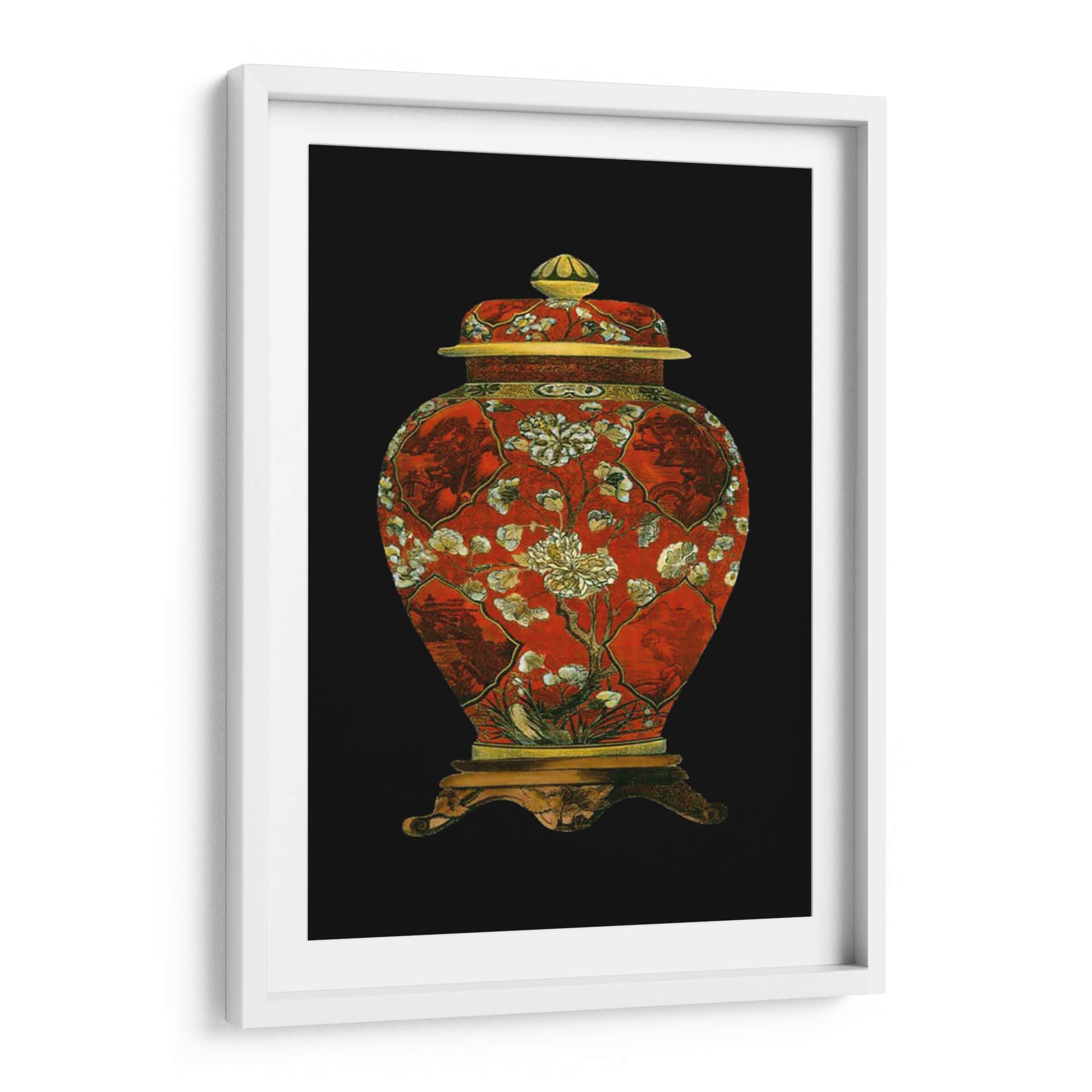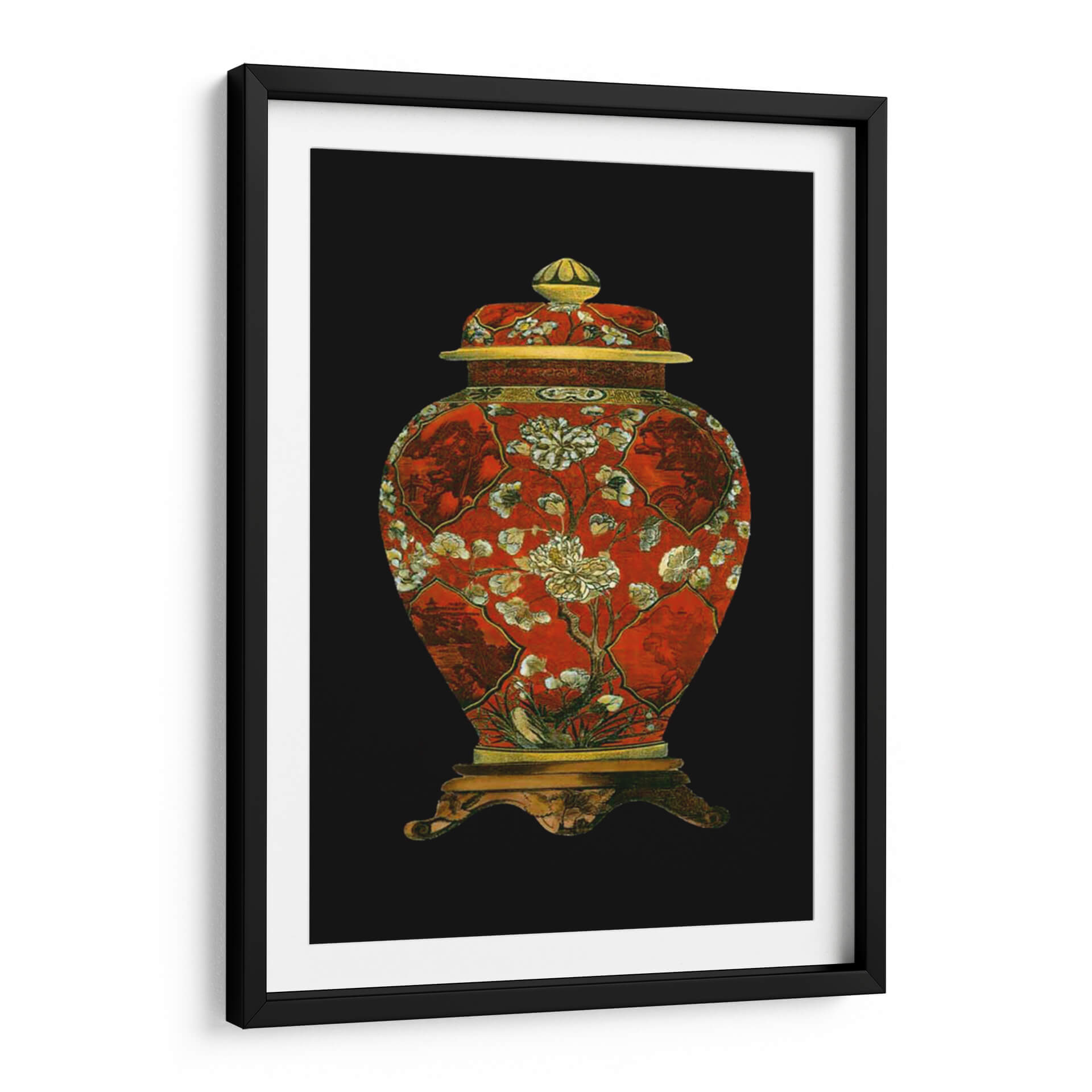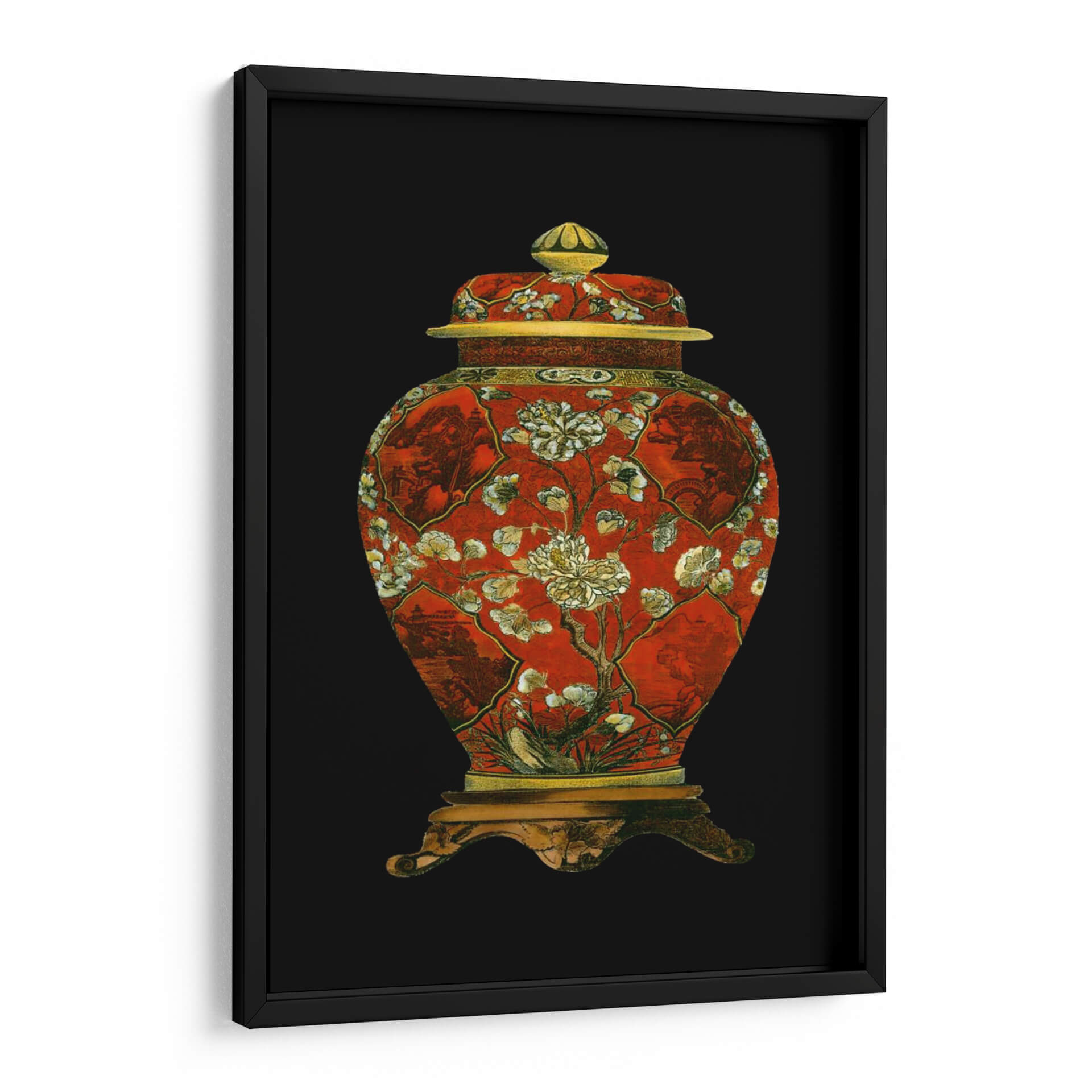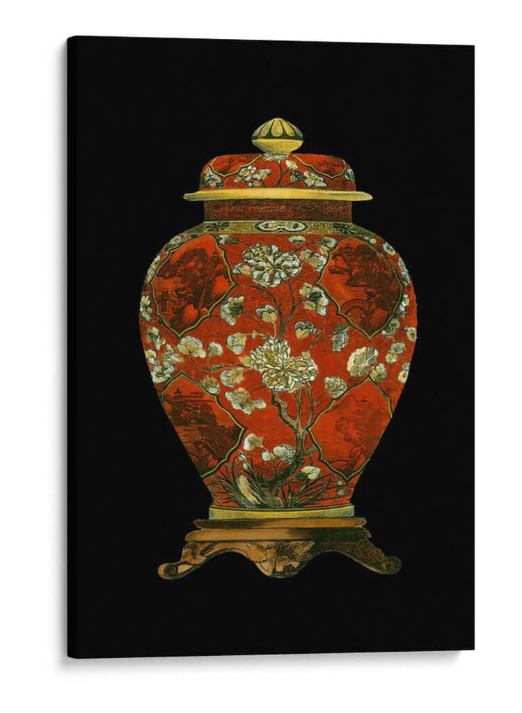 Este cautivador cuadro decorativo, titulado "Jarrón De Porcelana Roja II", es una pieza que evoca la riqueza y la delicadeza del arte oriental. La obra presenta un jarrón de porcelana de un vibrante color rojo, adornado con intrincados diseños florales en tonos blanco y crema, junto a detalles dorados que añaden un toque de opulencia. La composición, centrada en el jarrón y su base ornamentada, se destaca sobre un fondo negro profundo, creando un contraste dramático que resalta la belleza del objeto principal. Los sutiles motivos paisajísticos y botánicos integrados en los paneles del jarrón sugieren una narrativa visual de serenidad y naturaleza, típica de la estética asiática. Este cuadro decorativo es perfecto para añadir un punto focal de elegancia y un aire de sofisticación clásica a cualquier espacio, ya sea una sala de estar, un comedor o un estudio. Su diseño atemporal y su cuidada ejecución lo convierten en una elección ideal para quienes aprecian el arte con historia y la decoración que inspira tranquilidad y admiración. Ideal para crear un ambiente de refinamiento en tu hogar u oficina.