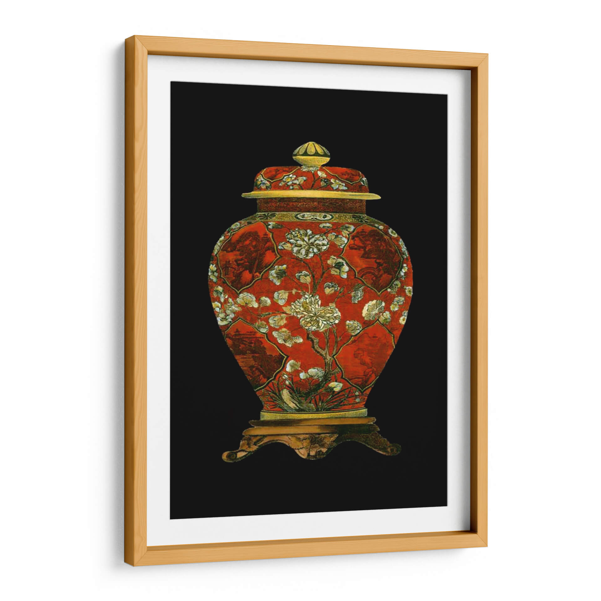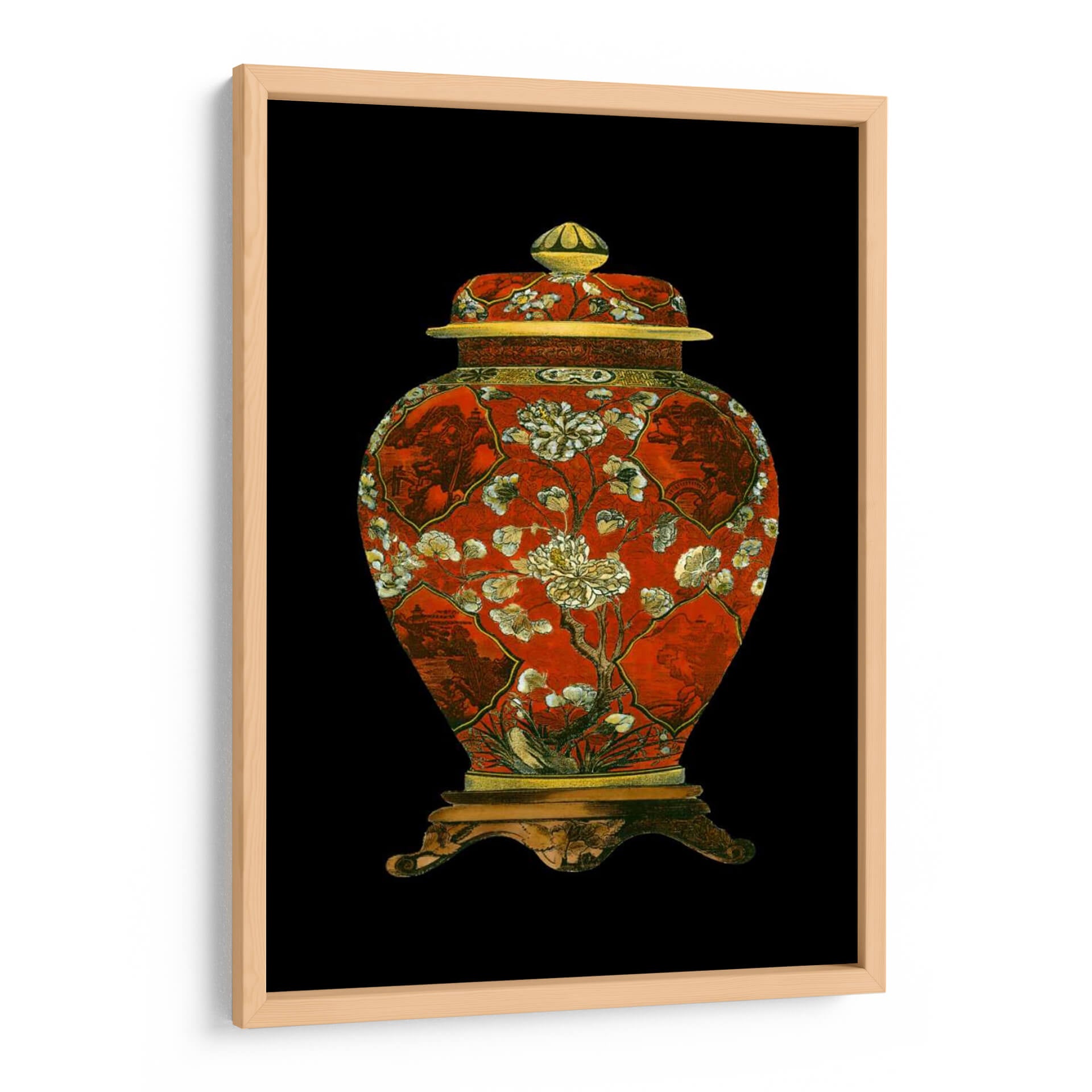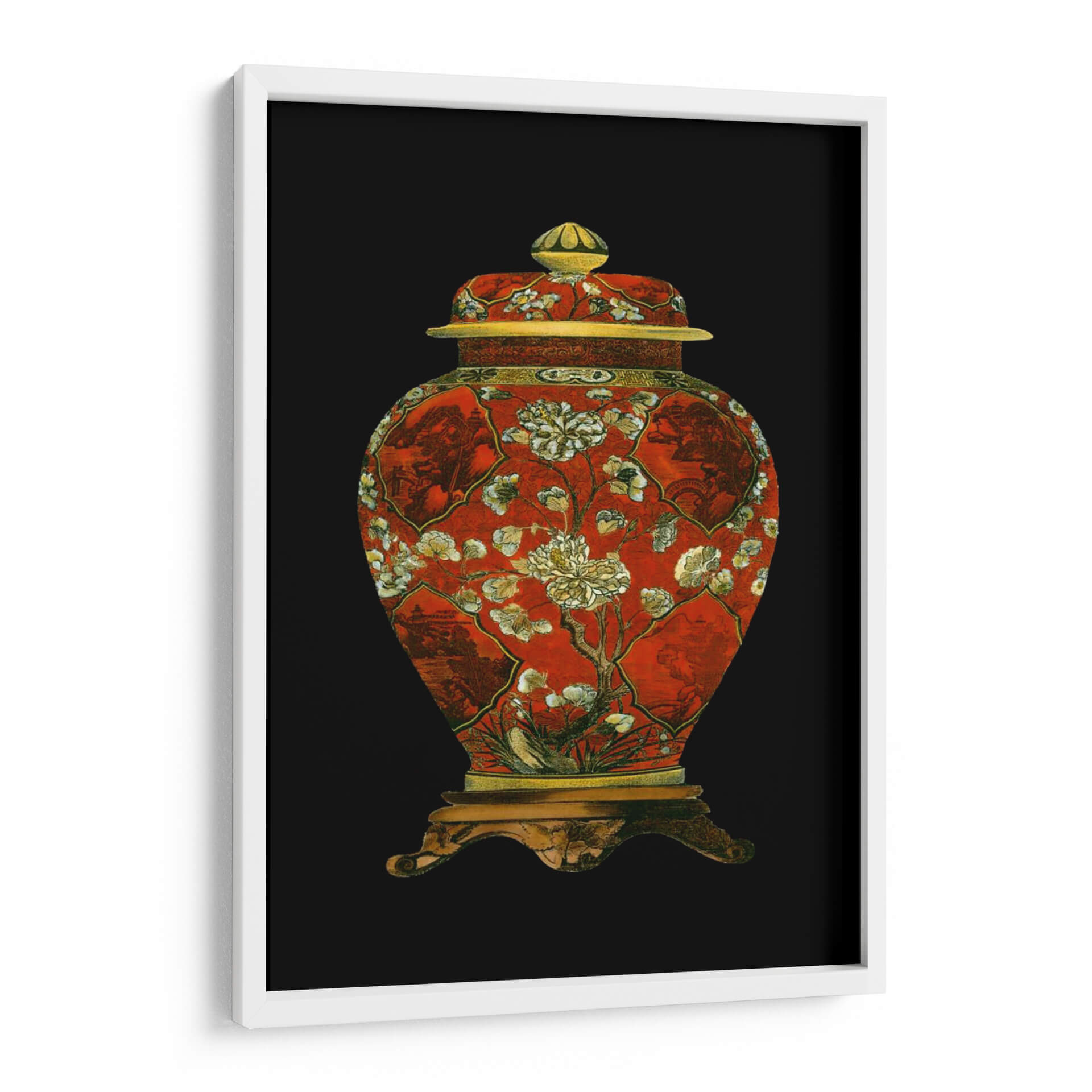 Este cautivador cuadro decorativo, titulado "Jarrón De Porcelana Roja II", es una pieza que evoca la riqueza y la delicadeza del arte oriental. La obra presenta un jarrón de porcelana de un vibrante color rojo, adornado con intrincados diseños florales en tonos blanco y crema, junto a detalles dorados que añaden un toque de opulencia. La composición, centrada en el jarrón y su base ornamentada, se destaca sobre un fondo negro profundo, creando un contraste dramático que resalta la belleza del objeto principal. Los sutiles motivos paisajísticos y botánicos integrados en los paneles del jarrón sugieren una narrativa visual de serenidad y naturaleza, típica de la estética asiática. Este cuadro decorativo es perfecto para añadir un punto focal de elegancia y un aire de sofisticación clásica a cualquier espacio, ya sea una sala de estar, un comedor o un estudio. Su diseño atemporal y su cuidada ejecución lo convierten en una elección ideal para quienes aprecian el arte con historia y la decoración que inspira tranquilidad y admiración. Ideal para crear un ambiente de refinamiento en tu hogar u oficina.