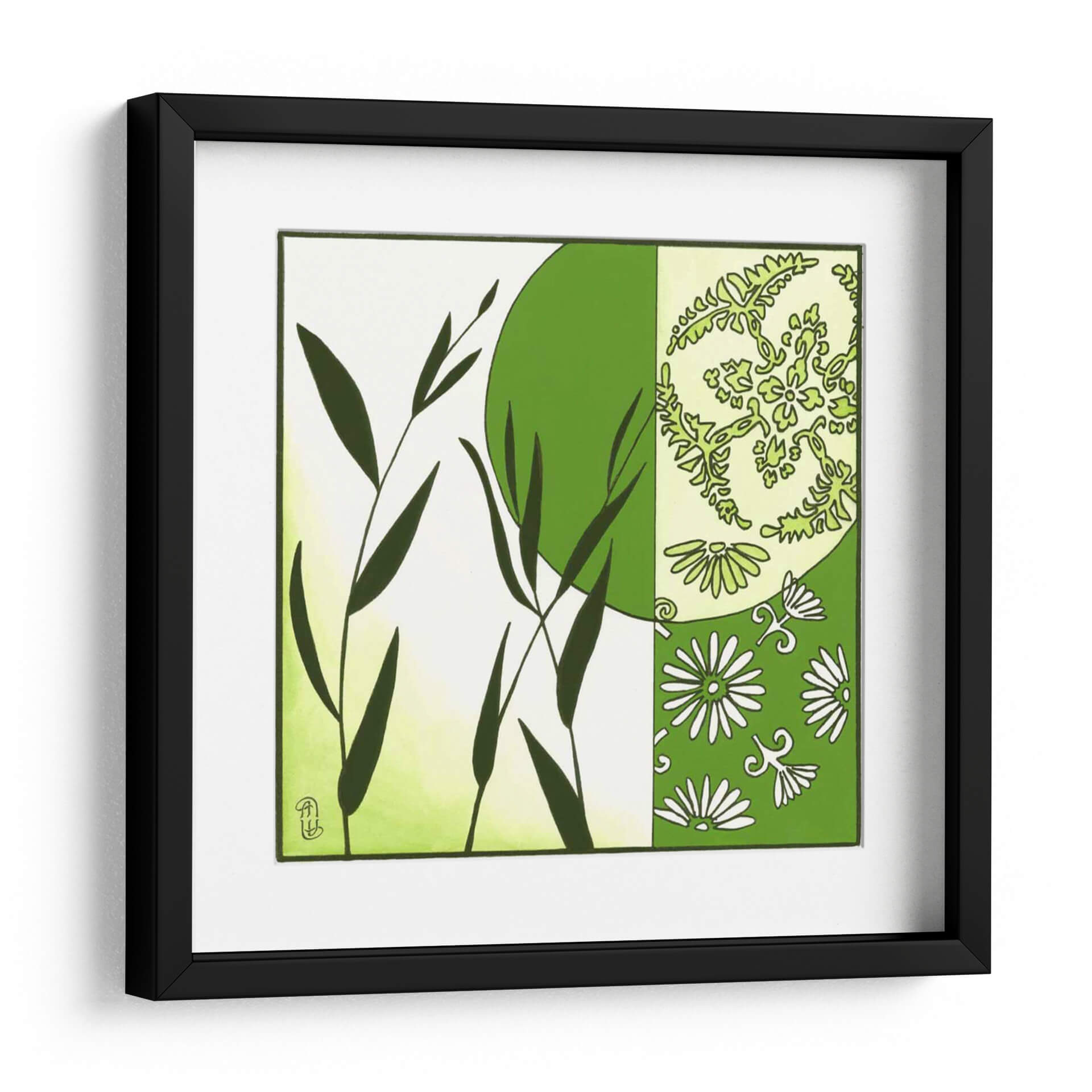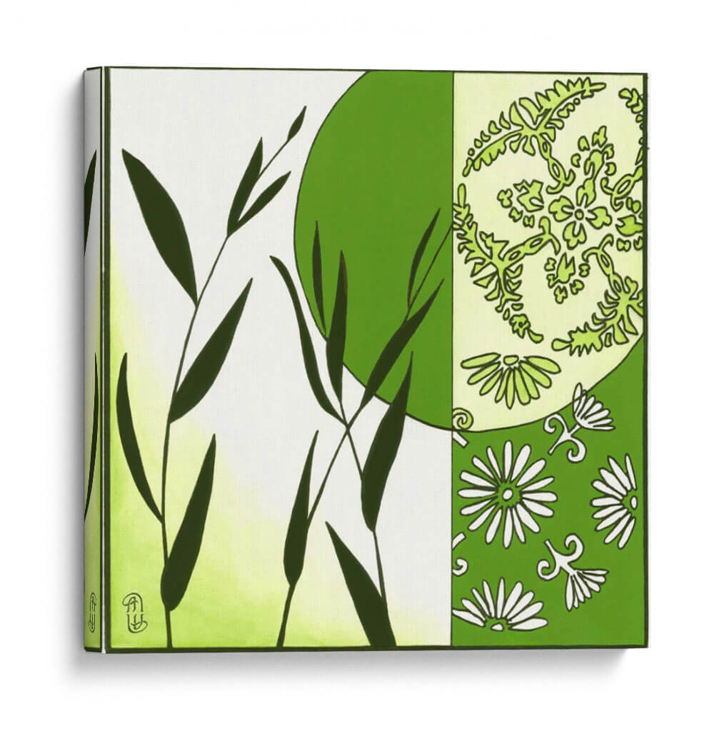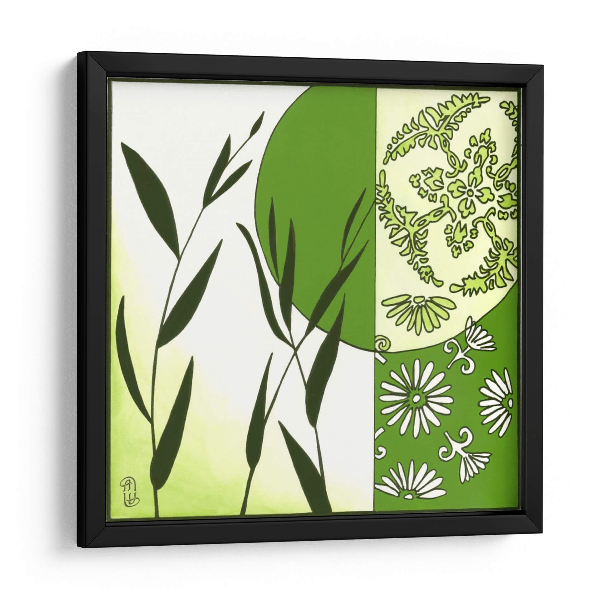 Sumérgete en la serena belleza de "Kimono Garden Iv", una cautivadora obra de arte de Megan Meagher que evoca la tranquilidad de un jardín japonés. Esta pieza presenta un díptico visual, donde la delicadeza de las cañas de bambú en silueta oscura sobre un fondo degradado de verdes vibrantes contrasta con un panel derecho adornado con motivos florales intrincados y un estilo que recuerda a los patrones tradicionales japoneses. La paleta de verdes, desde el lima brillante hasta el esmeralda profundo, crea una atmósfera fresca y revitalizante, perfecta para infundir calma en cualquier espacio. El estilo es una fascinante mezcla de lo gráfico y lo orgánico, con líneas limpias y formas fluidas que dan vida a la composición. "Kimono Garden Iv" es ideal para añadir un toque de sofisticación natural y un aire de serenidad a tu sala de estar, dormitorio o estudio, convirtiéndose en un punto focal que invita a la contemplación y al bienestar. Descubre la armonía y el arte contemporáneo con esta pieza única.