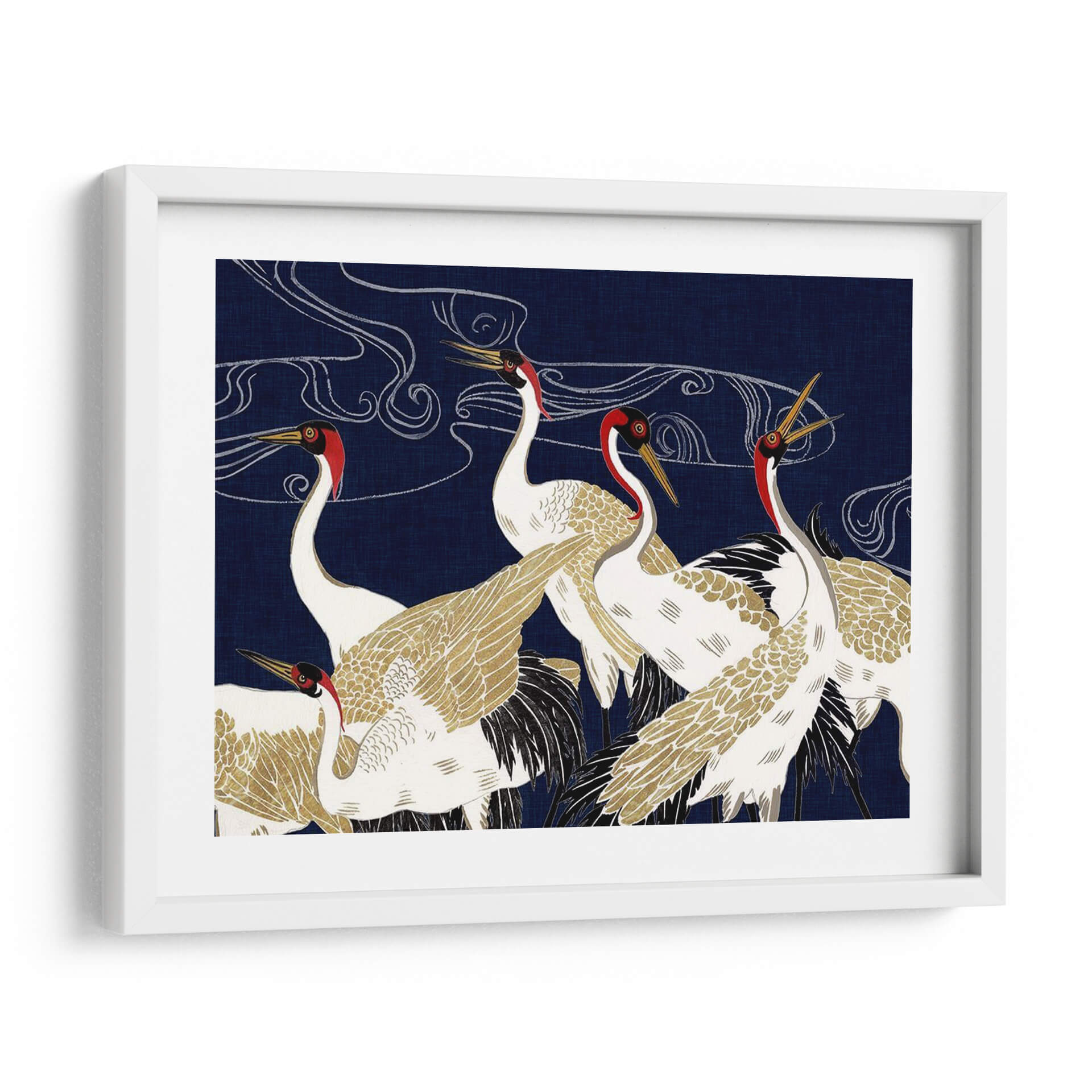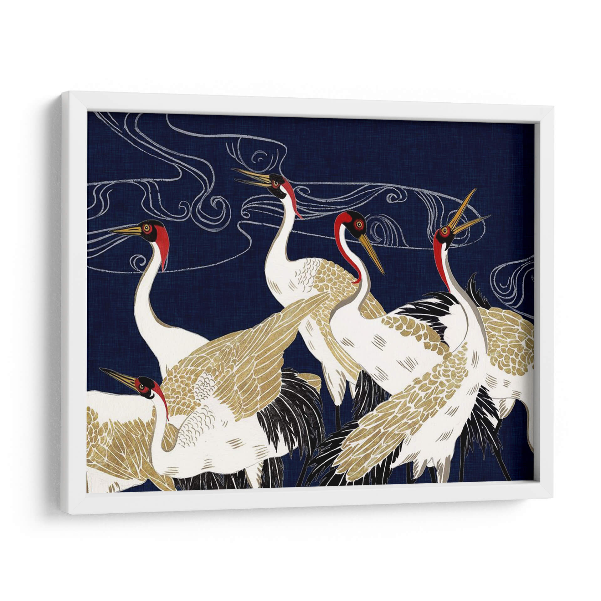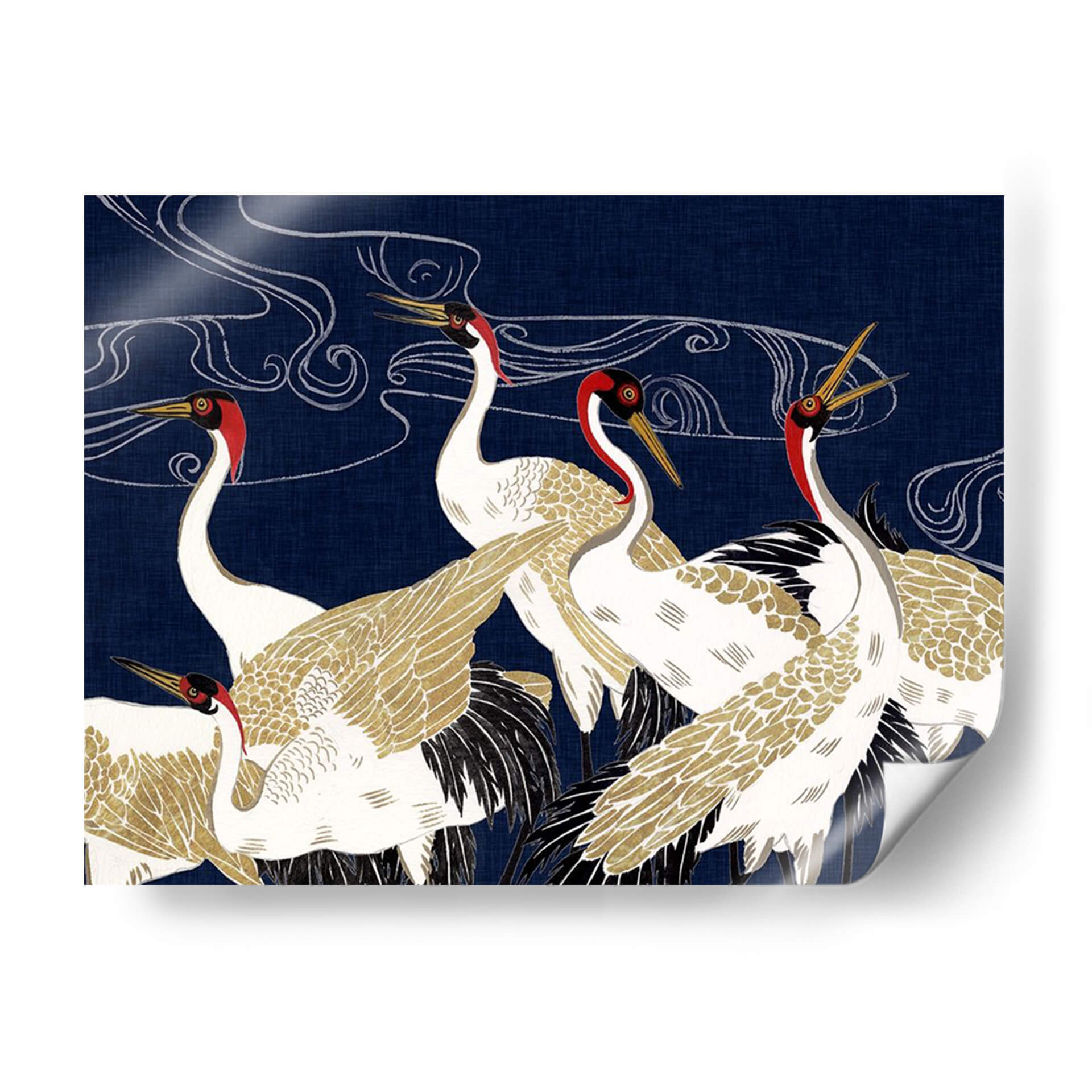 Sumérgete en la majestuosidad y el misterio de "Más Allá De La Luna Iv", una obra de arte contemporáneo de Melissa Wang que captura la esencia serena y elegante de las grullas. Con un fondo azul profundo que evoca la noche estrellada o las profundidades del océano, esta pieza presenta un grupo de grullas blancas y doradas, adornadas con detalles en rojo vibrante alrededor de sus cabezas. Las líneas fluidas y etéreas que se entrelazan en el cielo sugieren movimiento, viento o incluso la Vía Láctea, añadiendo una capa de misticismo a la composición. El detallado plumaje, con toques dorados que brillan sutilmente, contrasta maravillosamente con el vibrante azul, creando un efecto visual cautivador. Esta obra es perfecta para quienes buscan infundir sus espacios con una sensación de calma, elegancia y un toque de la naturaleza en su máxima expresión. Ideal como cuadro decorativo para salones, dormitorios o estudios, "Más Allá De La Luna Iv" se convierte en un punto focal que invita a la contemplación y añade sofisticación a cualquier decoración moderna o de inspiración asiática. Deja que la belleza atemporal de estas aves te transporte a un mundo de serenidad y ensueño, transformando tu hogar en un santuario de paz y estilo. Un cuadro decorativo que inspira tranquilidad y admiración.