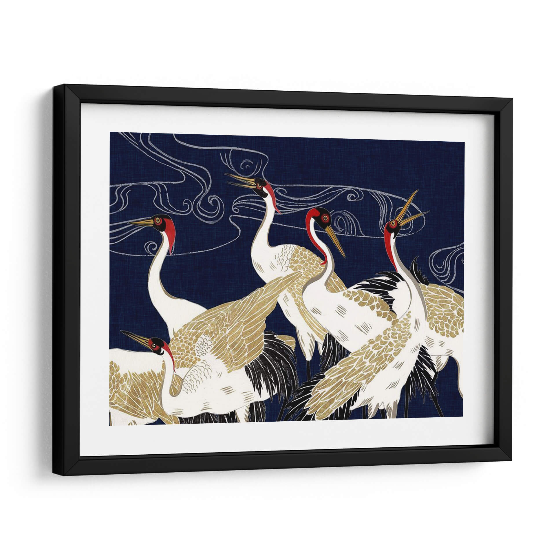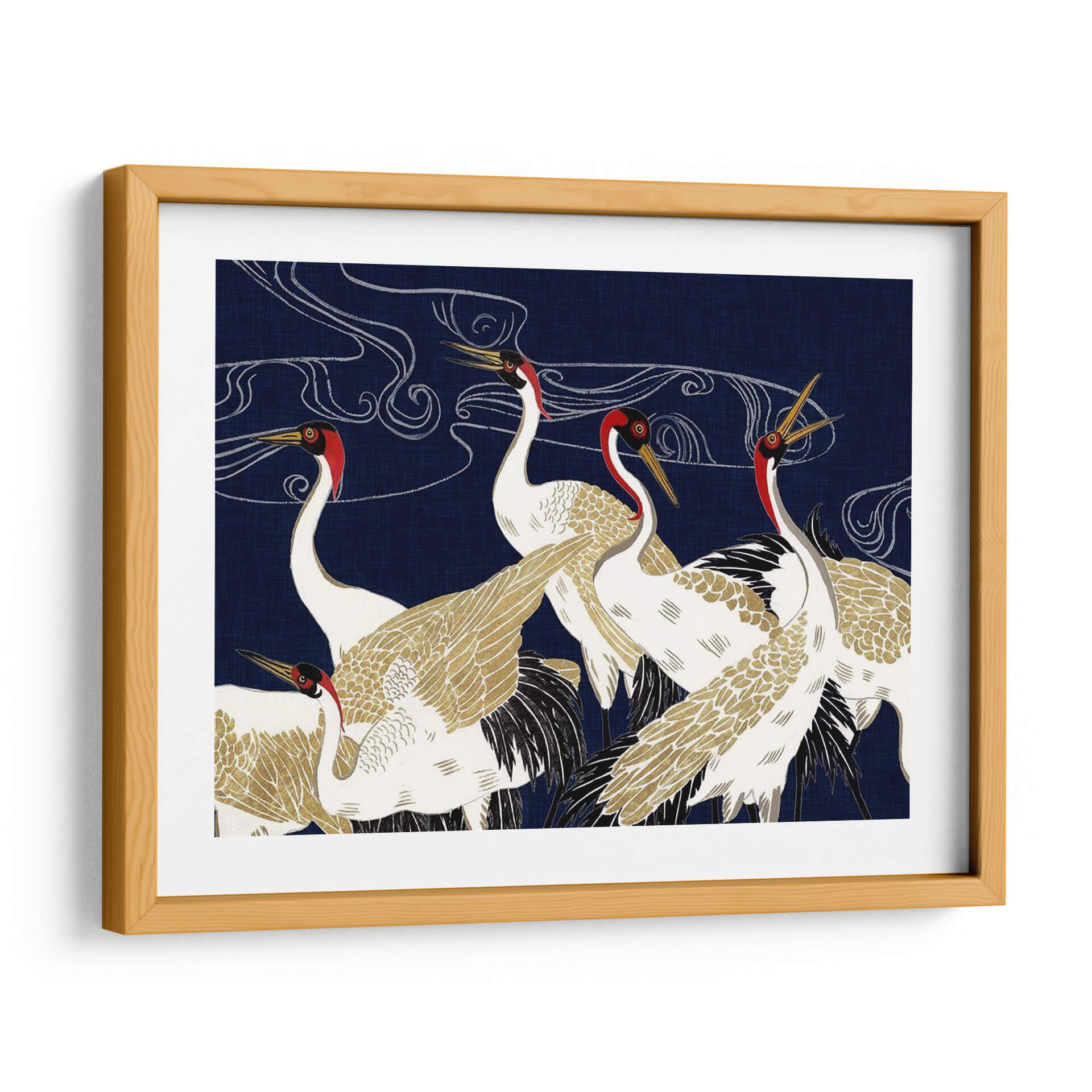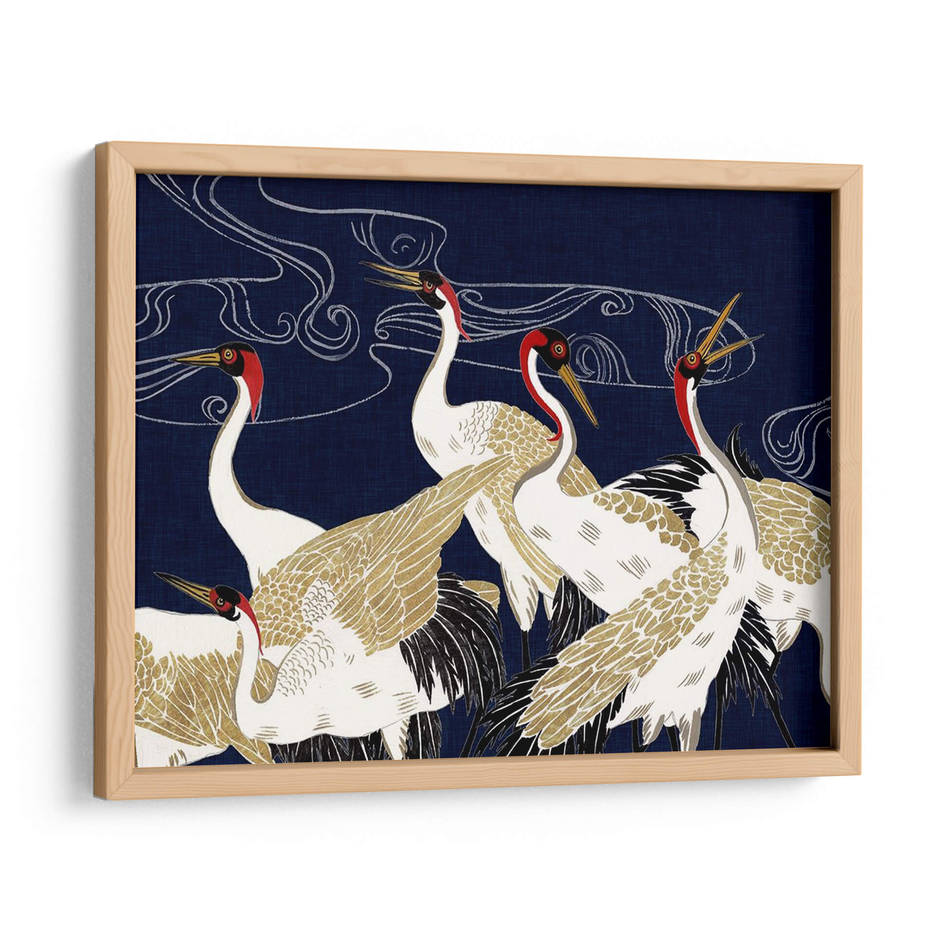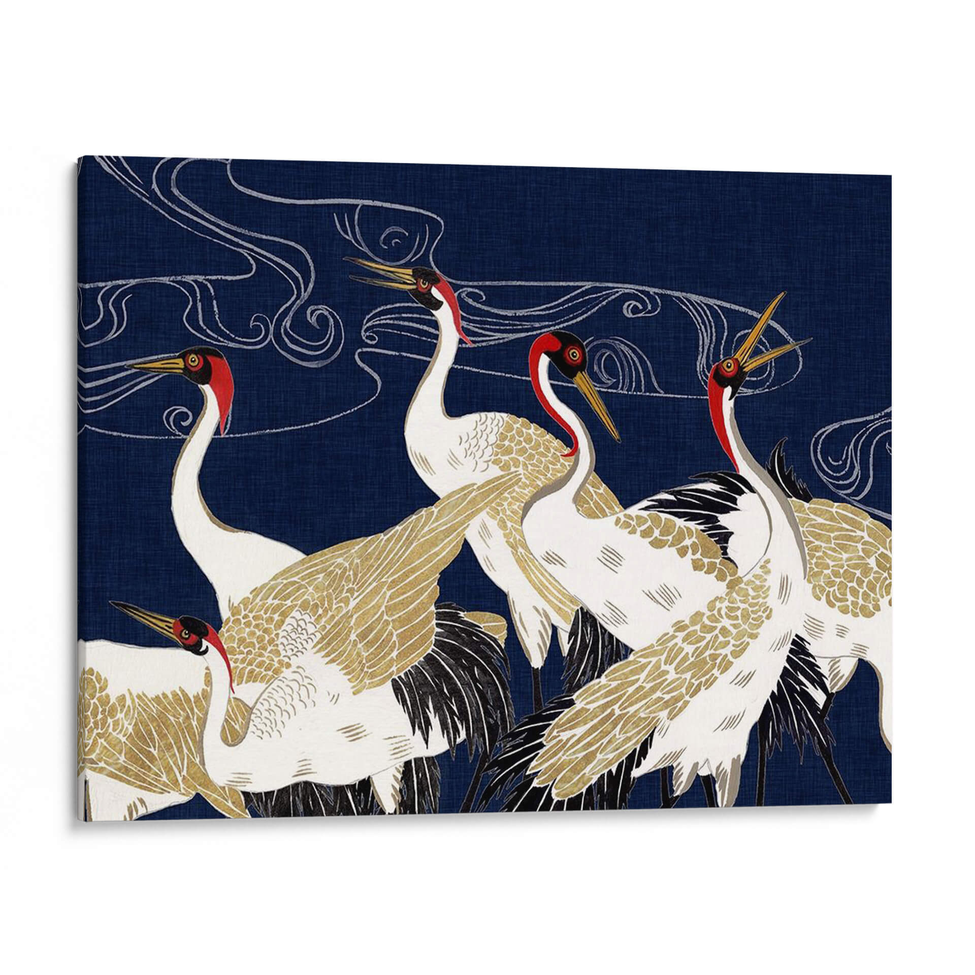 Sumérgete en la majestuosidad y el misterio de "Más Allá De La Luna Iv", una obra de arte contemporáneo de Melissa Wang que captura la esencia serena y elegante de las grullas. Con un fondo azul profundo que evoca la noche estrellada o las profundidades del océano, esta pieza presenta un grupo de grullas blancas y doradas, adornadas con detalles en rojo vibrante alrededor de sus cabezas. Las líneas fluidas y etéreas que se entrelazan en el cielo sugieren movimiento, viento o incluso la Vía Láctea, añadiendo una capa de misticismo a la composición. El detallado plumaje, con toques dorados que brillan sutilmente, contrasta maravillosamente con el vibrante azul, creando un efecto visual cautivador. Esta obra es perfecta para quienes buscan infundir sus espacios con una sensación de calma, elegancia y un toque de la naturaleza en su máxima expresión. Ideal como cuadro decorativo para salones, dormitorios o estudios, "Más Allá De La Luna Iv" se convierte en un punto focal que invita a la contemplación y añade sofisticación a cualquier decoración moderna o de inspiración asiática. Deja que la belleza atemporal de estas aves te transporte a un mundo de serenidad y ensueño, transformando tu hogar en un santuario de paz y estilo. Un cuadro decorativo que inspira tranquilidad y admiración.