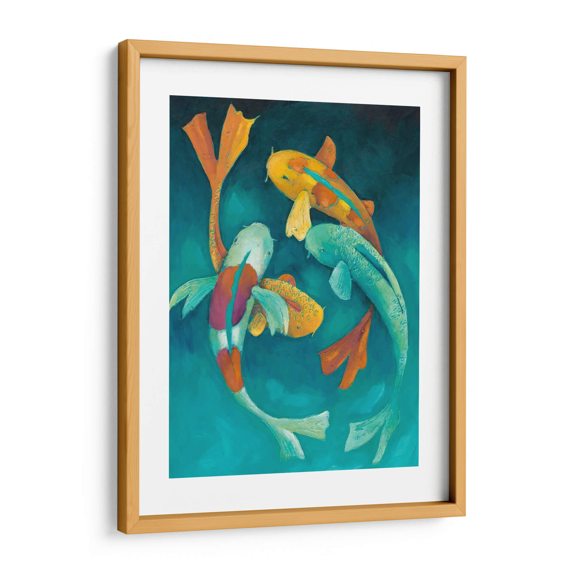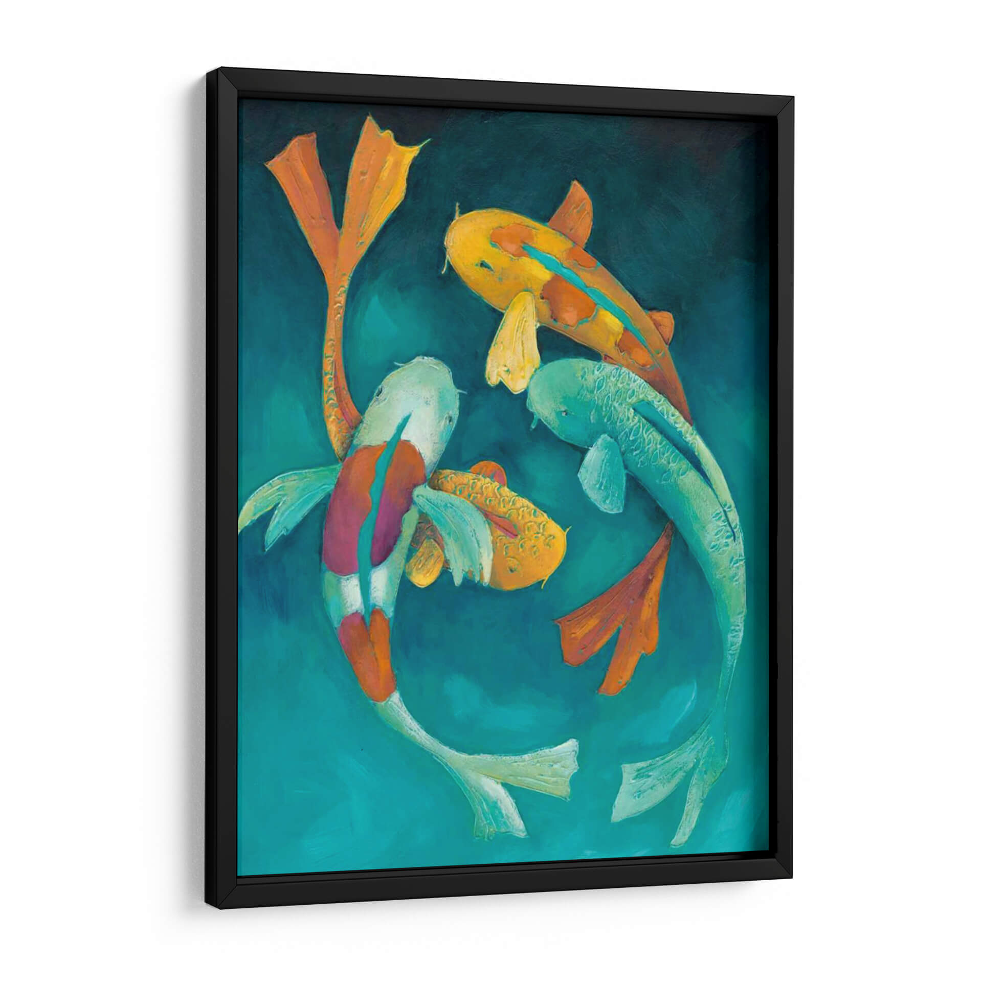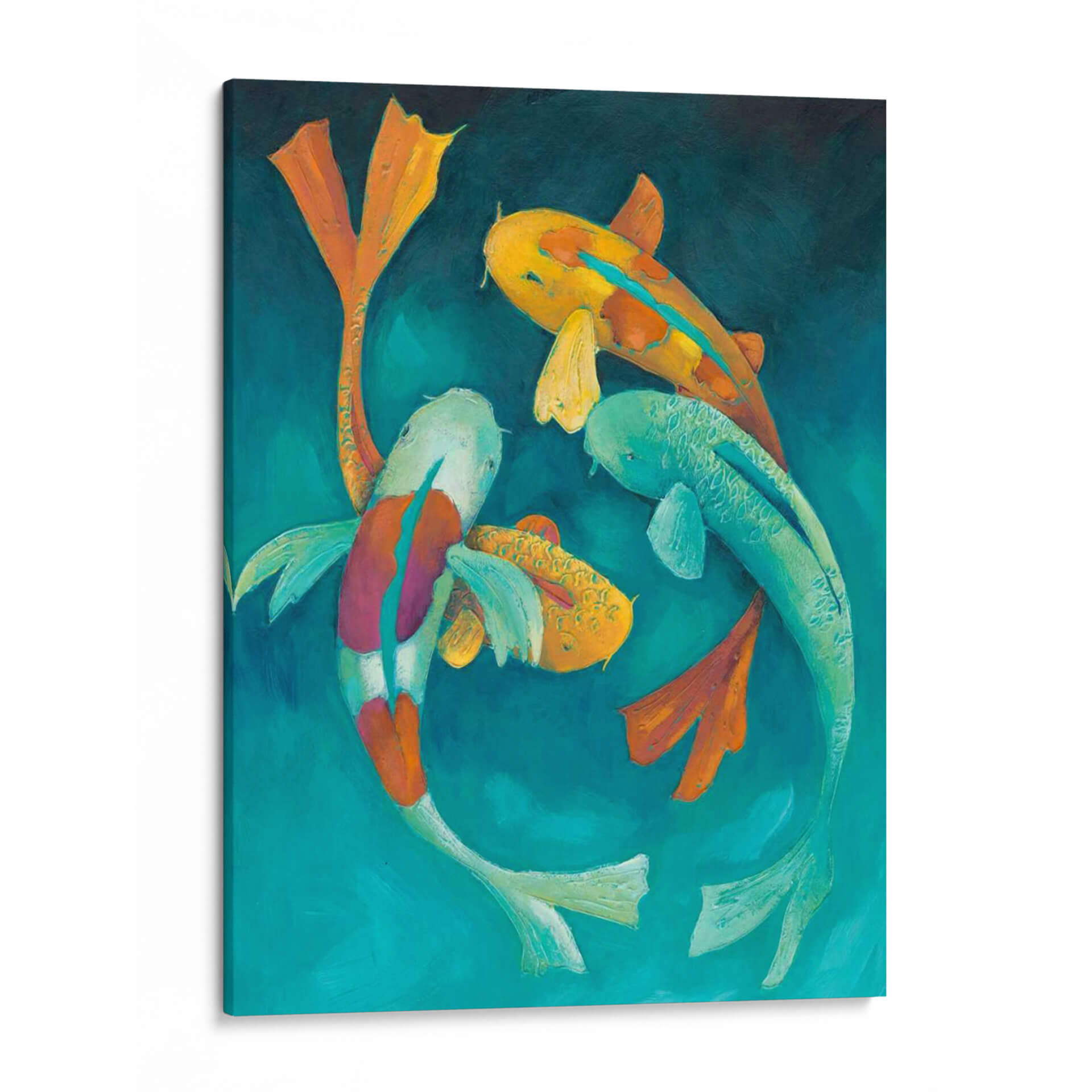 Sumérgete en la serenidad y la belleza con "Ornamental Koi II", una obra de arte que captura la esencia etérea de estos majestuosos peces. El cuadro decorativo presenta tres carpas koi nadando en un profundo y vibrante tono azul verdoso, evocando la tranquilidad de un estanque sereno. Los colores de las carpas son un festín visual: una vibrante carpa amarilla con detalles en turquesa y naranja, otra con un elegante diseño en blanco, rojo y púrpura, y una tercera en tonos agua marina con sutiles toques de verde. La pincelada suelta y expresiva del artista Chariklia Zarris añade una dimensión de movimiento y vida a la pieza, haciendo que cada pez parezca deslizarse suavemente por el agua. Esta composición dinámica y armoniosa es perfecta para infundir calma y elegancia en cualquier espacio. Imagina este cuadro como un punto focal inspirador en tu sala de estar, un toque de serenidad en tu dormitorio o un acento sofisticado en tu oficina. "Ornamental Koi II" no es solo una decoración de pared, es una invitación a la contemplación y a la apreciación de la belleza natural, aportando una sensación de paz y equilibrio a tu hogar.