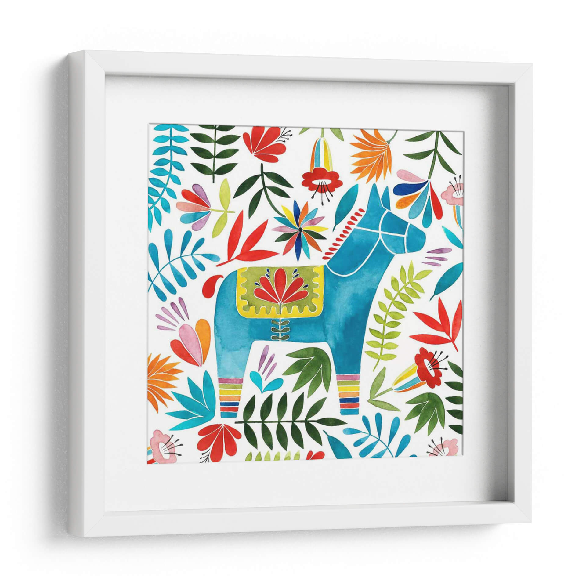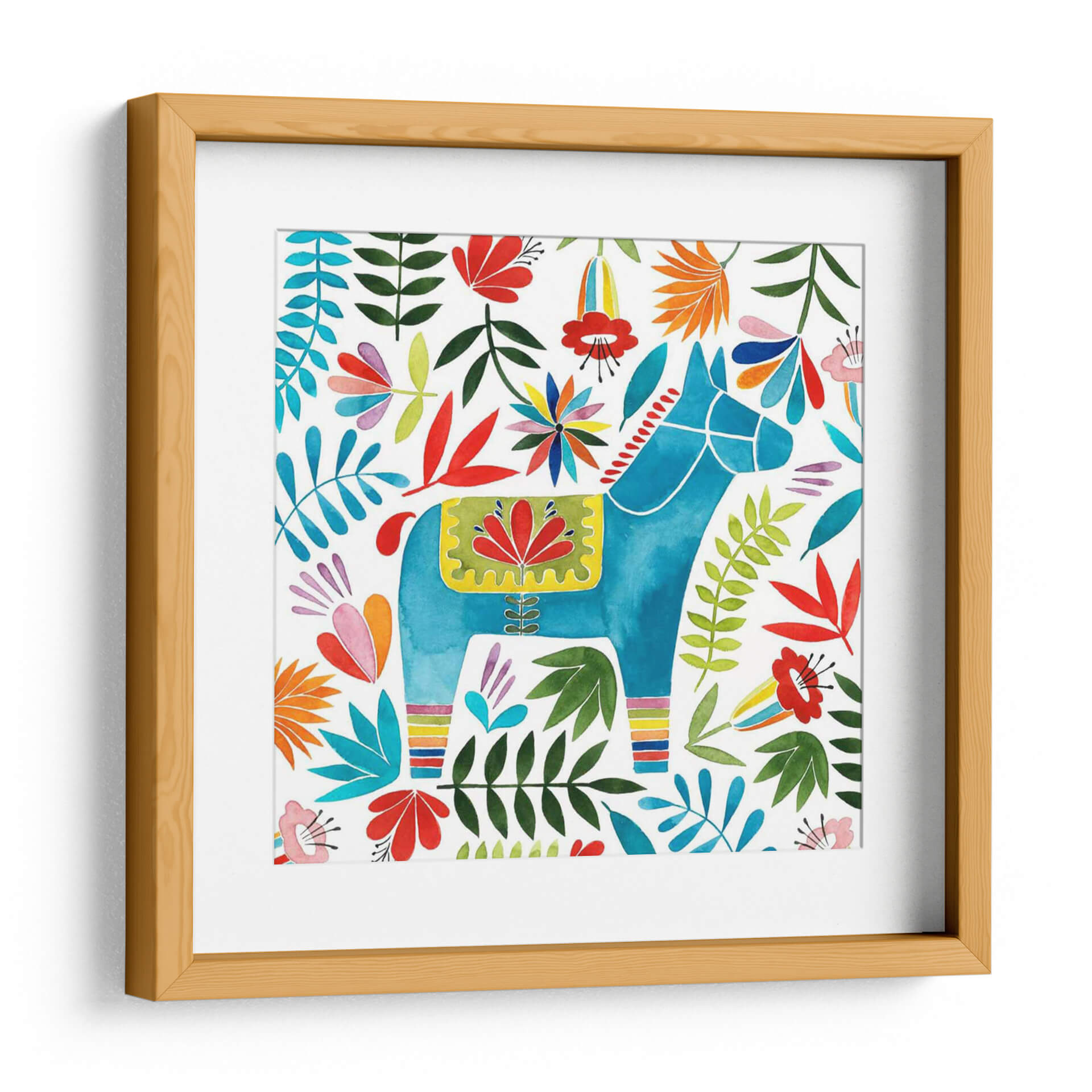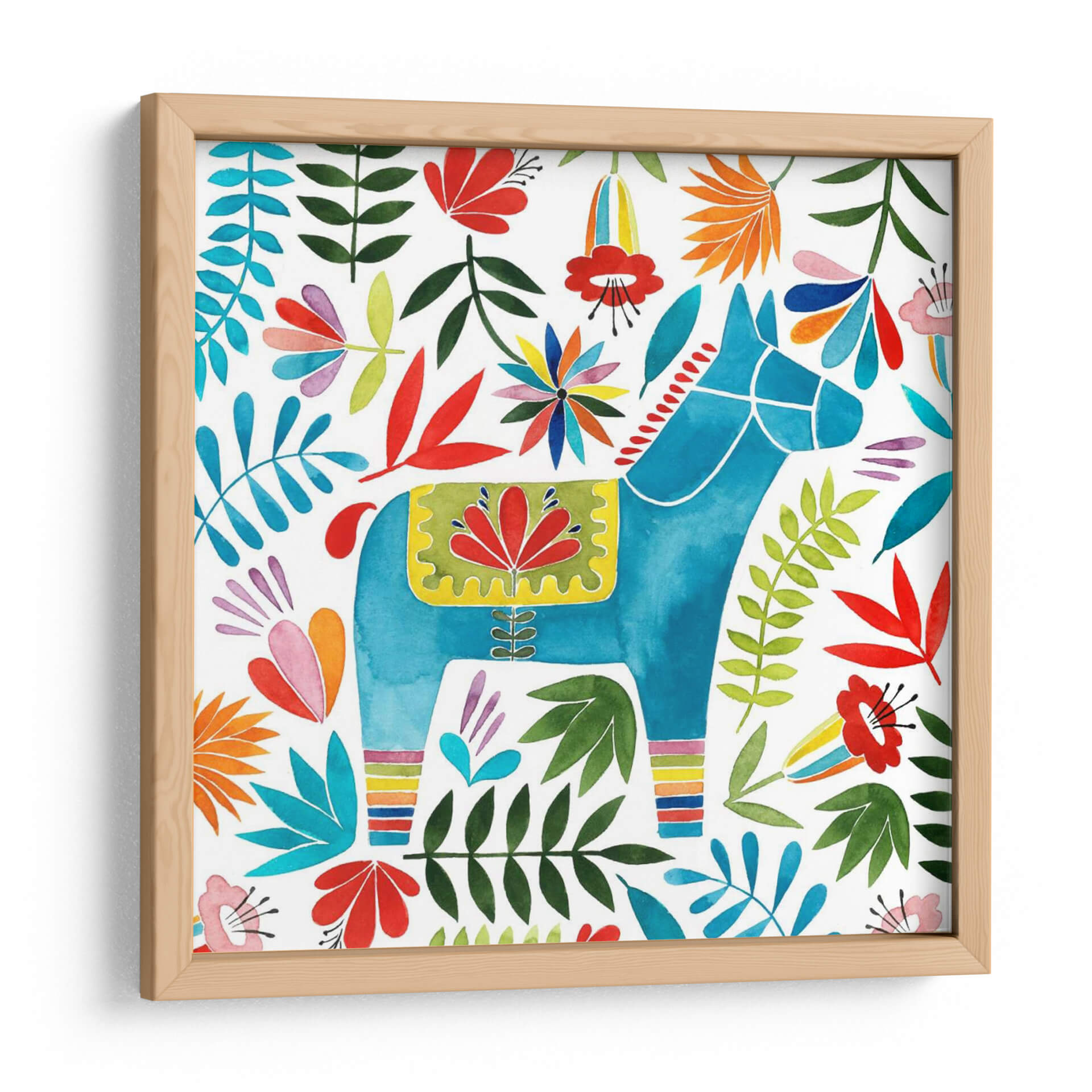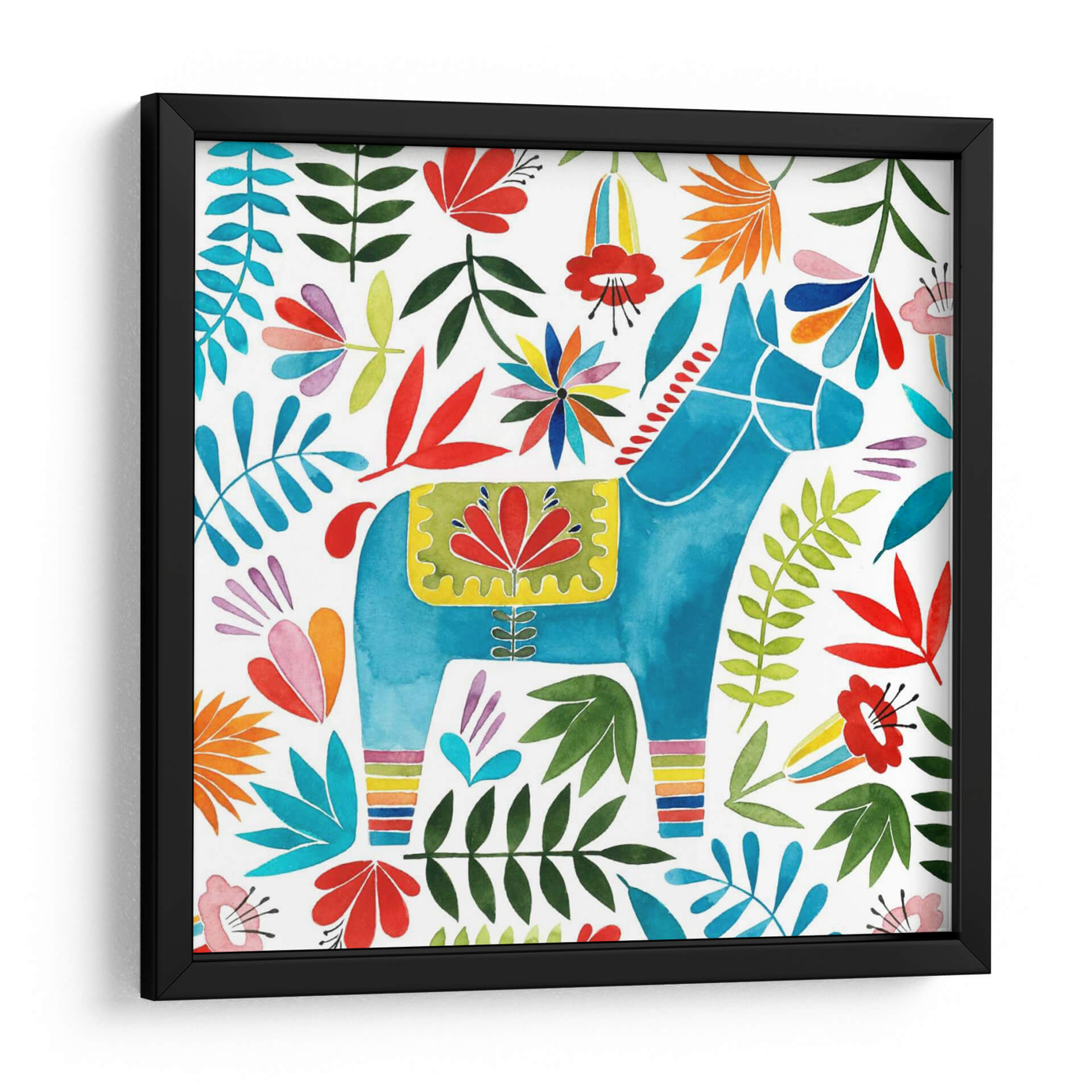 Celebra la vitalidad y el folclore con "Otomi Festivo I" de Grace Popp, un cuadro decorativo que irradia alegría y tradición. Esta obra de arte captura la esencia de una figura equina azul vibrante, adornada con un taparrabos geométrico y rayas de colores en sus patas, emergiendo de un exuberante follaje de flores y hojas exóticas en acuarela. La paleta de colores es un festín visual, con azules profundos, verdes frondosos, rojos intensos, naranjas energéticos y toques de amarillo y rosa que dan vida a cada elemento. El estilo, inspirado en el arte popular y con un toque contemporáneo, presenta trazos fluidos y un diseño audaz que atrae la mirada. "Otomi Festivo I" es perfecto para infundir un ambiente festivo y artístico en cualquier espacio, desde una sala de estar moderna hasta un rincón acogedor en el hogar u oficina. Su composición detallada y su atmósfera alegre lo convierten en una pieza de conversación ideal, aportando un toque de cultura y diseño único a tu decoración.