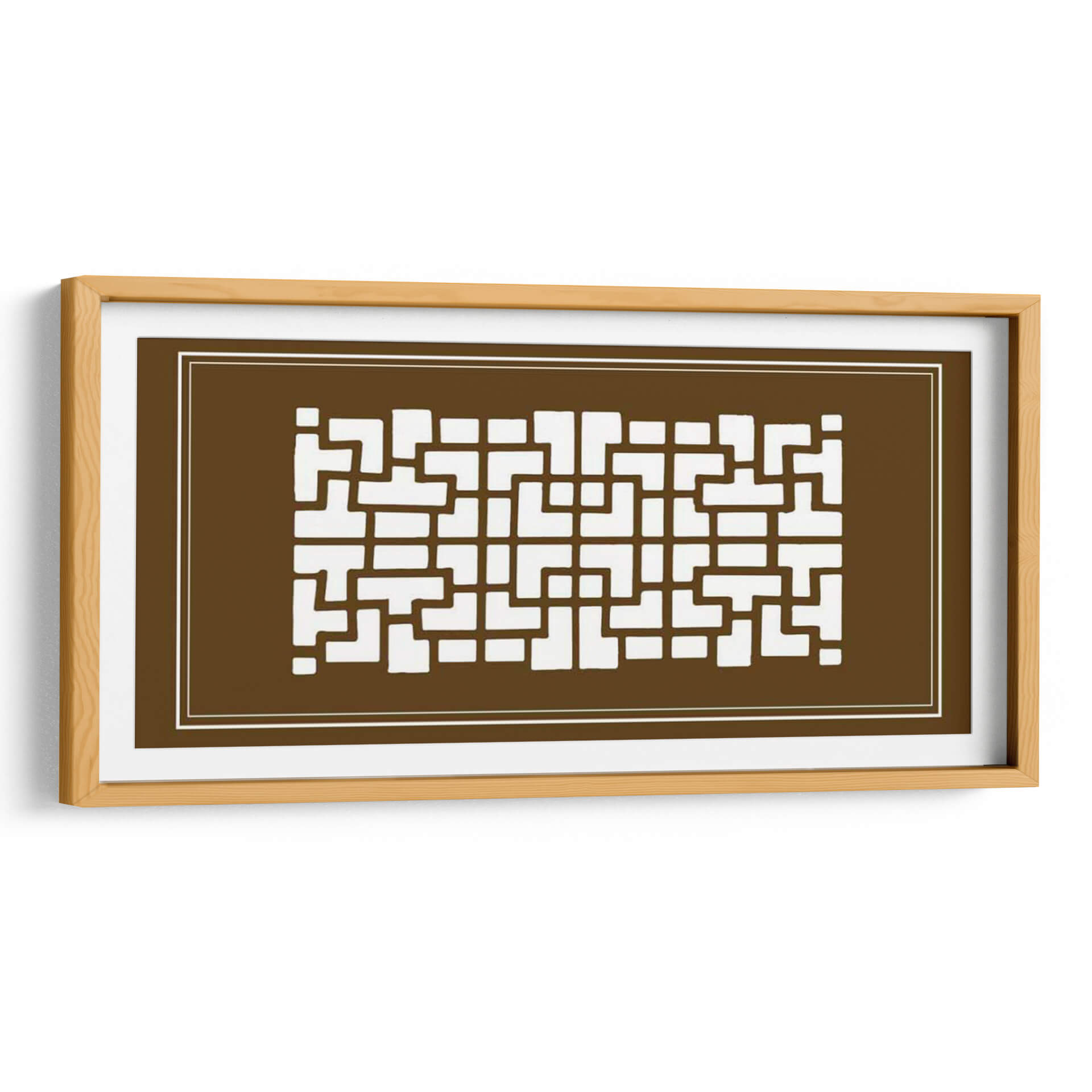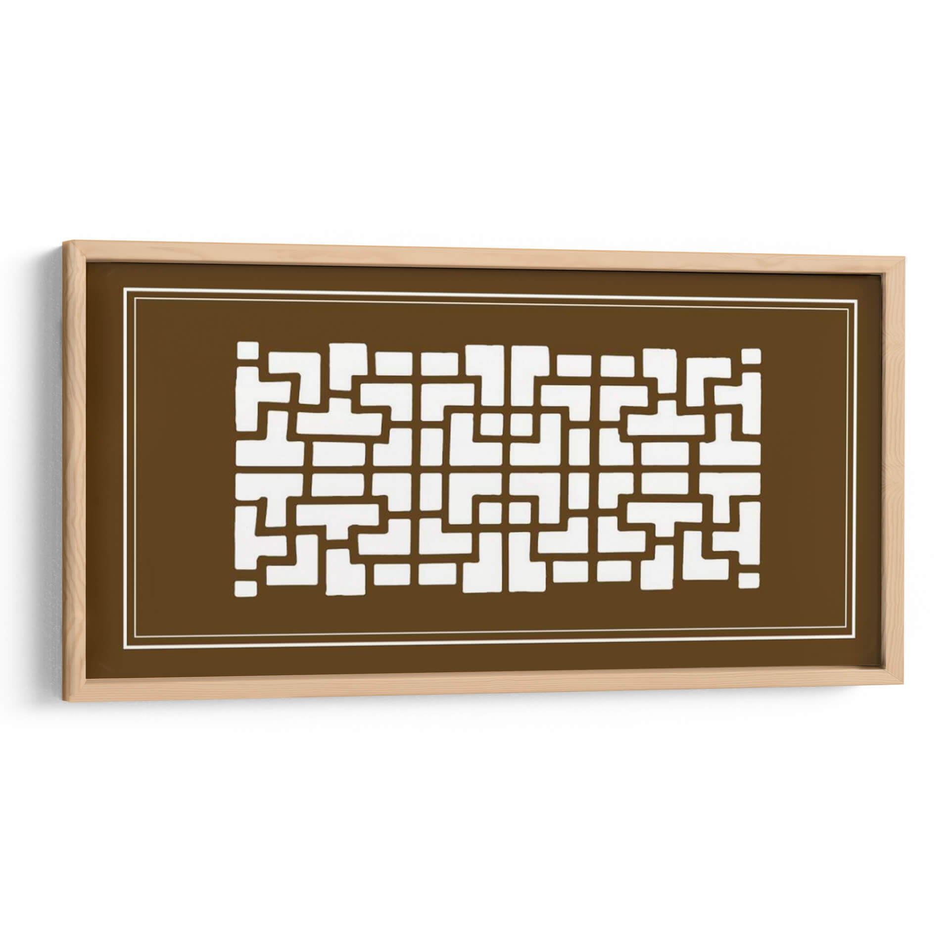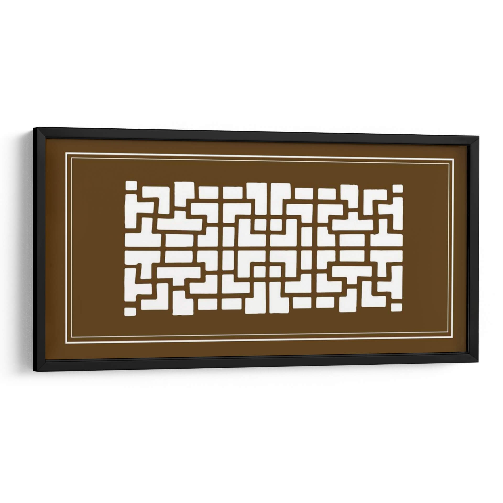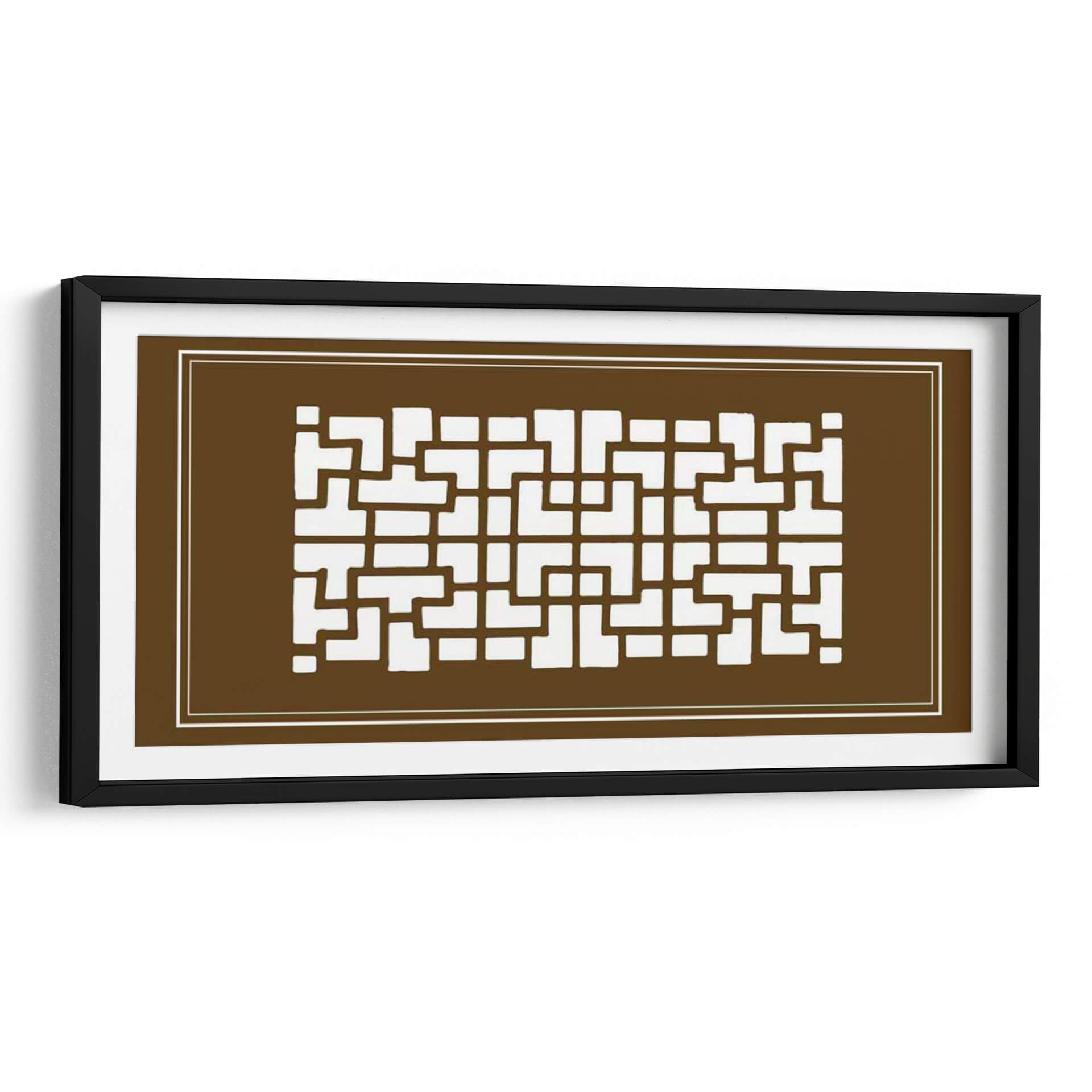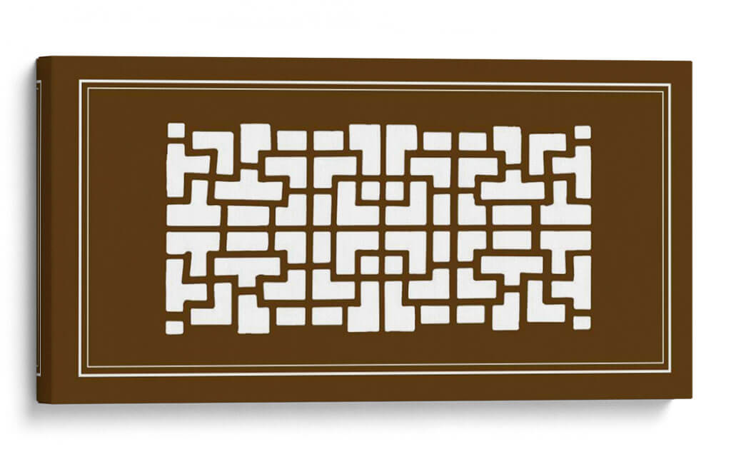 Este cautivador cuadro decorativo, titulado 'Pantalla Shoji En Brown Iii' por Vision Studio, ofrece una fusión sofisticada de diseño geométrico y una paleta de colores terrosos. La obra presenta un patrón intrincado de formas rectangulares y cuadradas blancas que recuerdan a las tradicionales pantallas shoji japonesas, contrastando elegantemente sobre un fondo marrón profundo y cálido. Las líneas limpias y la simetría del diseño transmiten una sensación de orden y serenidad, mientras que el tono marrón evoca estabilidad, calidez y conexión con la naturaleza. La composición, enmarcada por finas líneas blancas, guía la mirada a través del repetitivo y armónico patrón, creando un efecto visual hipnótico y equilibrado. Este cuadro decorativo es ideal para espacios que buscan un toque de elegancia minimalista con influencias asiáticas, como salas de estar modernas, estudios o incluso dormitorios, aportando un ambiente de calma y refinamiento. Su diseño versátil lo convierte en un complemento perfecto para decoraciones contemporáneas, asiáticas o eclécticas, añadiendo profundidad y carácter sin abrumar el espacio.