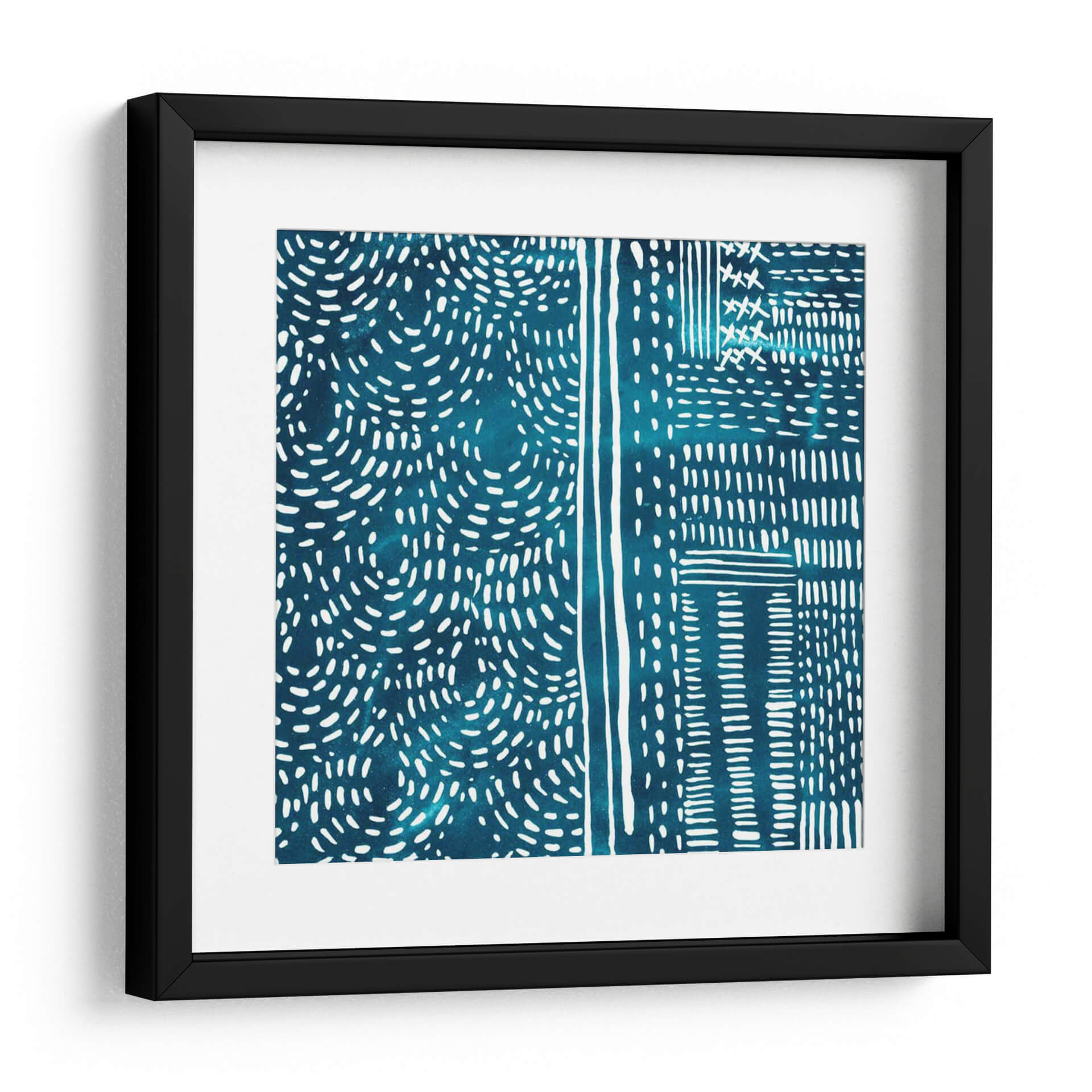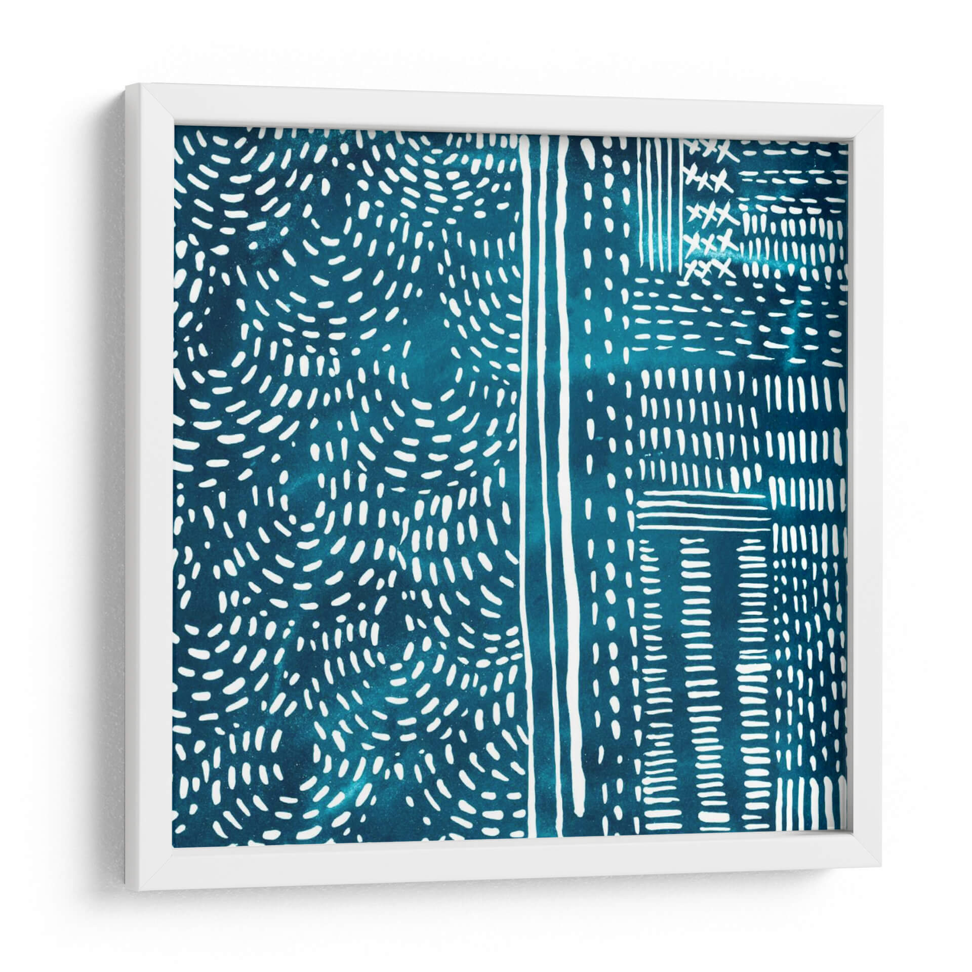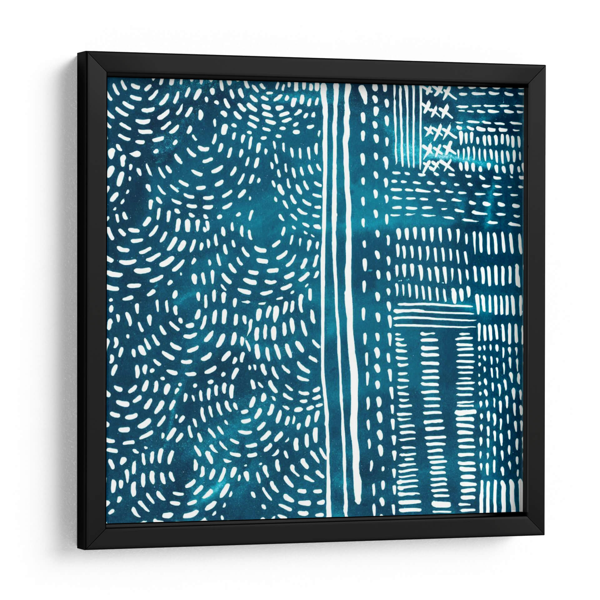 Adéntrate en la serenidad rítmica de 'Sashiko Stitches II', una cautivadora obra de arte de Chariklia Zarris que evoca la belleza de la artesanía tradicional japonesa. Esta pieza abstracta presenta un cautivador patrón de intrincadas puntadas blancas sobre un profundo y vibrante fondo azul verdoso, reminiscentes de la técnica de costura Sashiko. Las líneas fluidas y las formas orgánicas se entrelazan, creando una sensación de movimiento y profundidad, mientras que el contraste entre el blanco nítido y el azul saturado aporta una energía sutil pero impactante. El diseño, con sus secciones divididas y patrones repetitivos, sugiere un enfoque moderno y minimalista de la estética tradicional, invitando a la contemplación y la relajación. Ideal para añadir un toque de sofisticación texturizada y un aire de calma a cualquier espacio, desde un sereno dormitorio hasta una elegante sala de estar o un estudio enfocado. Este cuadro decorativo no es solo una pieza de arte, sino una invitación a experimentar la armonía y la precisión en su forma más pura, transformando su hogar en un santuario de estilo contemporáneo y serenidad inspirada en la naturaleza y la tradición.