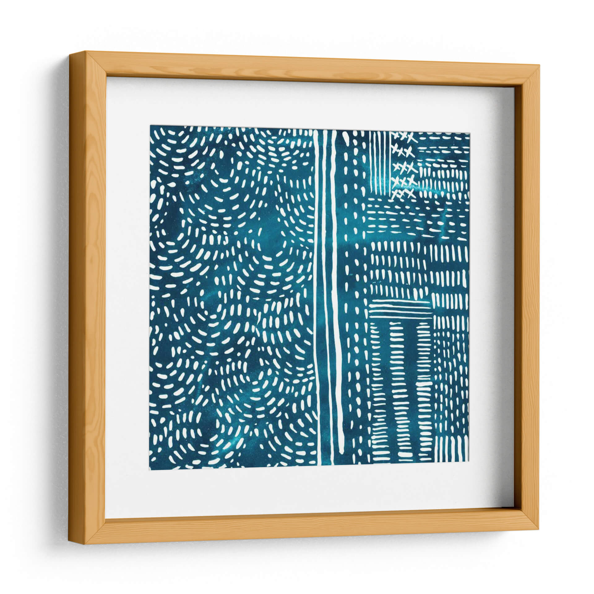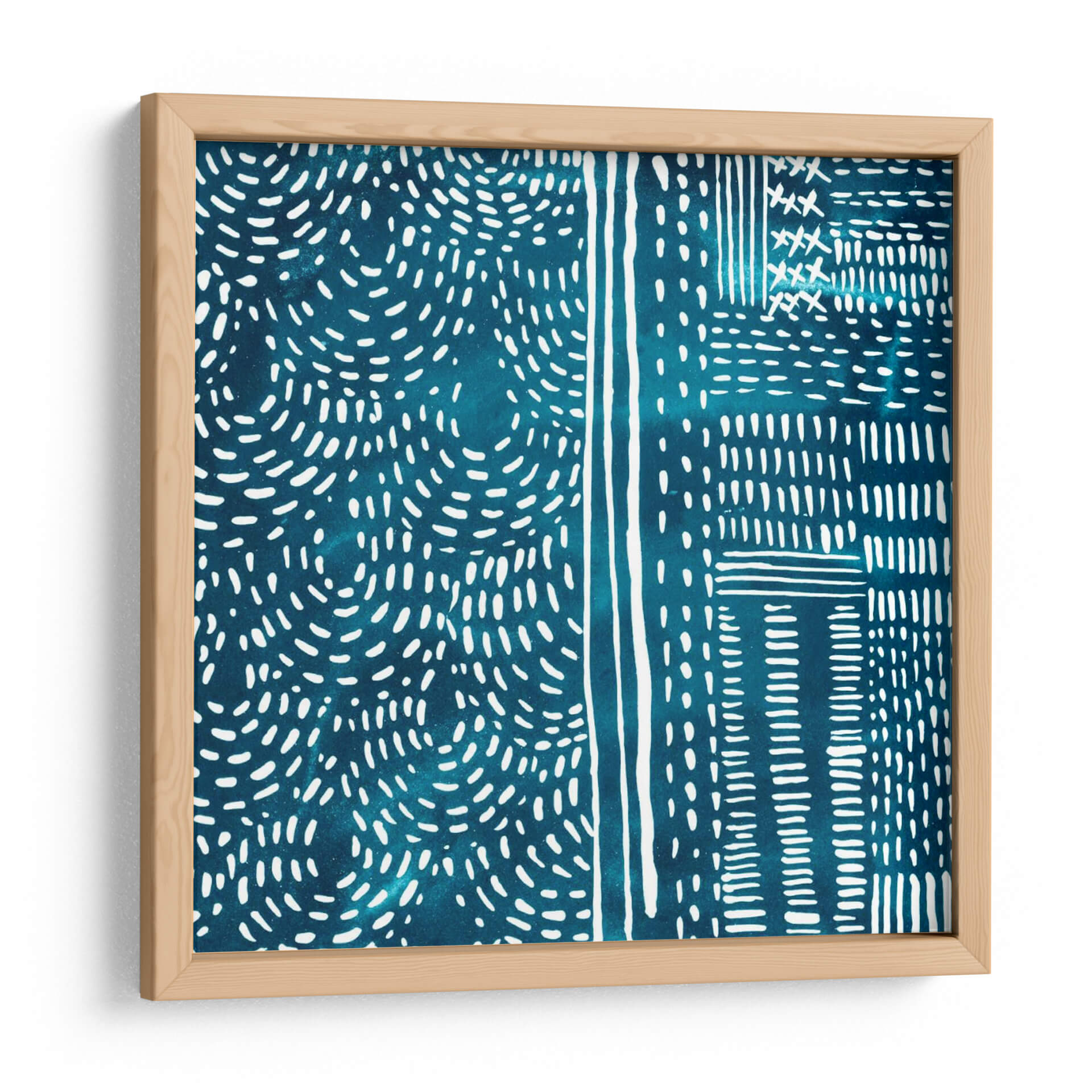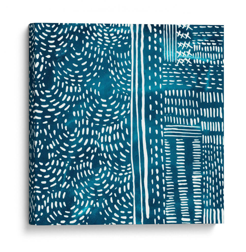 Adéntrate en la serenidad rítmica de 'Sashiko Stitches II', una cautivadora obra de arte de Chariklia Zarris que evoca la belleza de la artesanía tradicional japonesa. Esta pieza abstracta presenta un cautivador patrón de intrincadas puntadas blancas sobre un profundo y vibrante fondo azul verdoso, reminiscentes de la técnica de costura Sashiko. Las líneas fluidas y las formas orgánicas se entrelazan, creando una sensación de movimiento y profundidad, mientras que el contraste entre el blanco nítido y el azul saturado aporta una energía sutil pero impactante. El diseño, con sus secciones divididas y patrones repetitivos, sugiere un enfoque moderno y minimalista de la estética tradicional, invitando a la contemplación y la relajación. Ideal para añadir un toque de sofisticación texturizada y un aire de calma a cualquier espacio, desde un sereno dormitorio hasta una elegante sala de estar o un estudio enfocado. Este cuadro decorativo no es solo una pieza de arte, sino una invitación a experimentar la armonía y la precisión en su forma más pura, transformando su hogar en un santuario de estilo contemporáneo y serenidad inspirada en la naturaleza y la tradición.