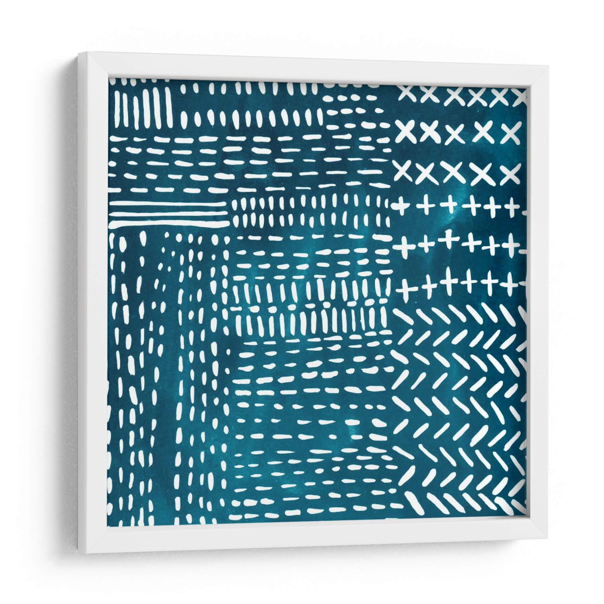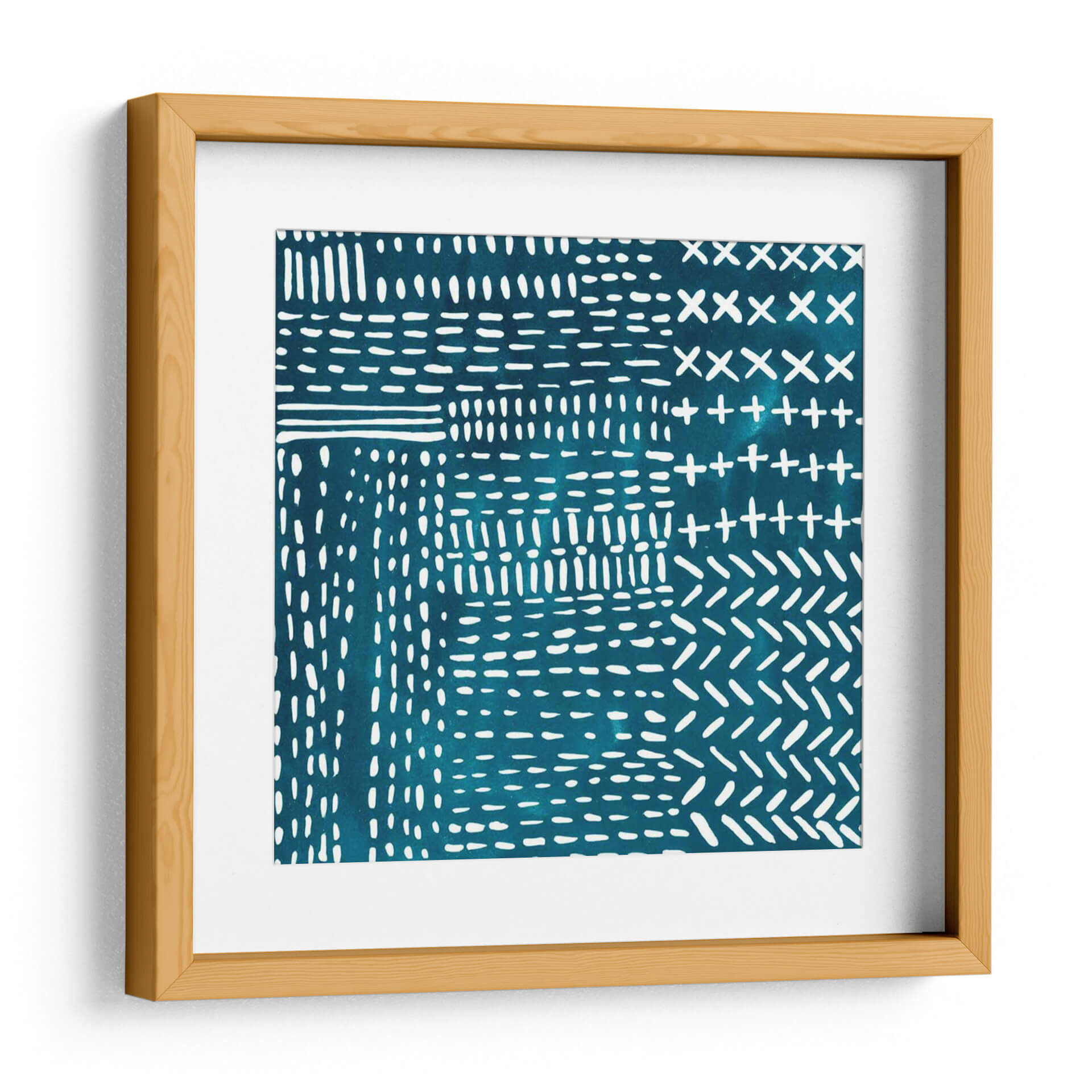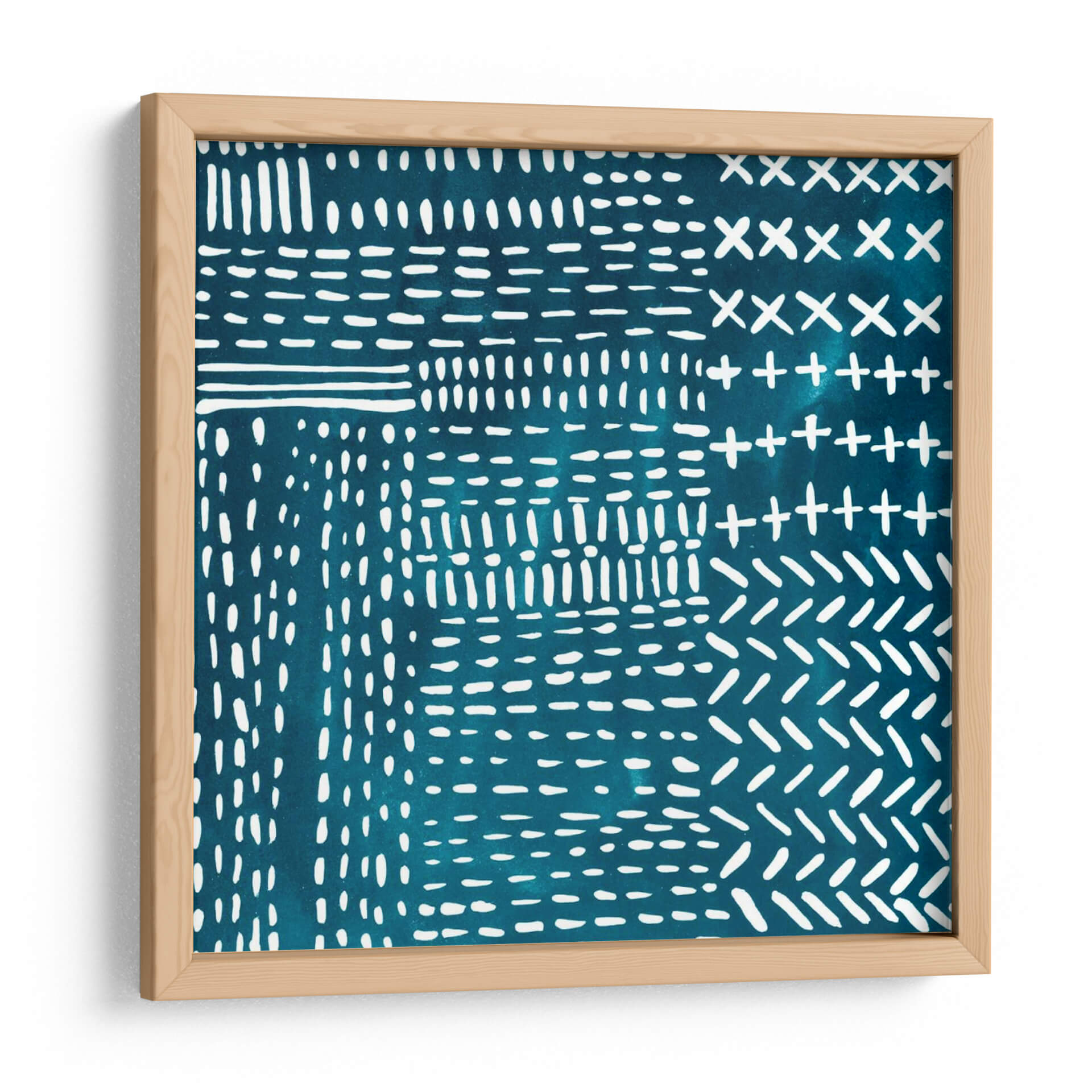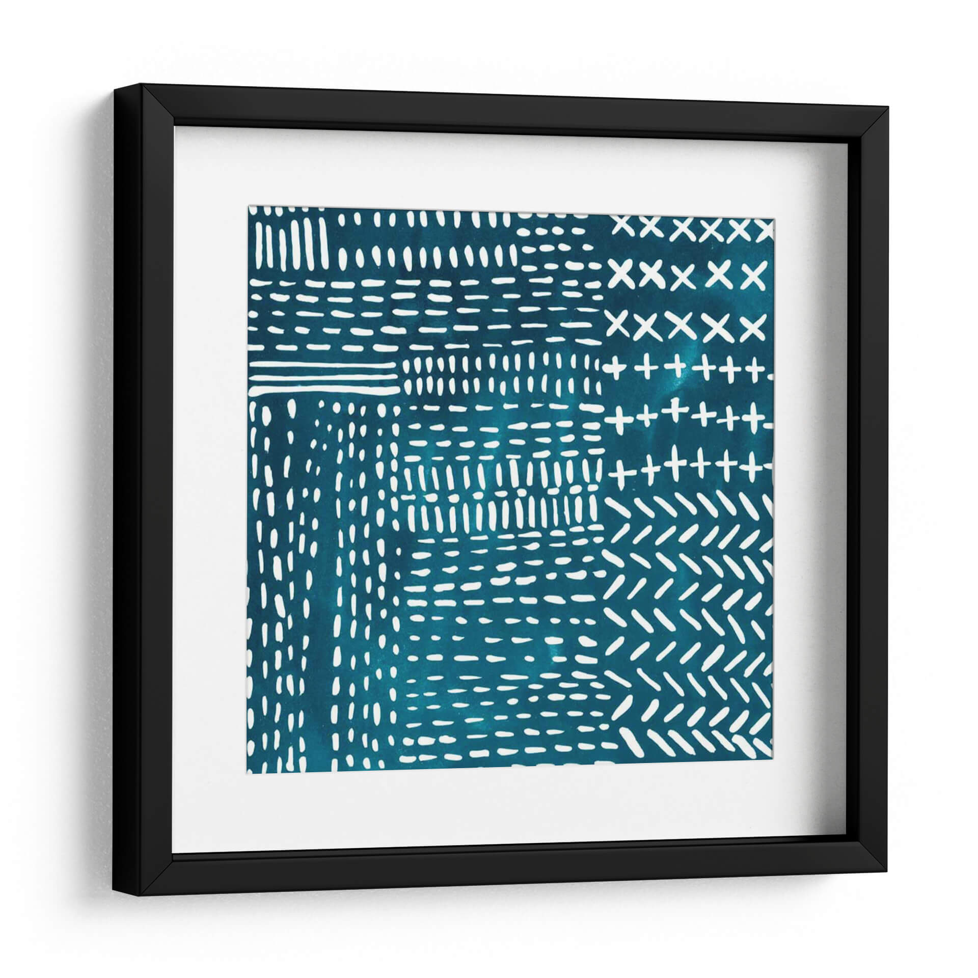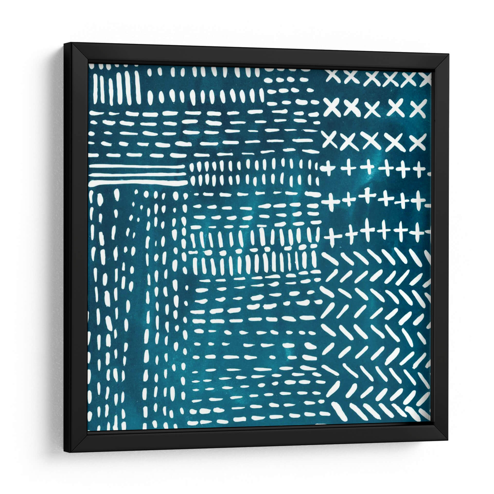 Sumérgete en la serenidad y el orden visual con "Sashiko Stitchs Iv", una obra de arte abstracta que evoca la precisión y la belleza del arte textil japonés. Esta pieza presenta un cautivador patrón de líneas y puntos en blanco sobre un profundo fondo azul verdoso, simulando las delicadas puntadas del sashiko. La composición se divide en secciones que alternan texturas y densidades, creando un ritmo visual dinámico pero armonioso. Cada línea y cada punto parecen colocados con intención, invitando a la contemplación y al descubrimiento de pequeños detalles en cada observación. Ideal para espacios que buscan un toque de calma y sofisticación, como salones modernos, oficinas o dormitorios, este cuadro decorativo contemporáneo aporta una sensación de tranquilidad y enfoque. Su estética minimalista y geométrica la convierte en una adición versátil que complementa una amplia gama de estilos decorativos, desde el escandinavo hasta el contemporáneo o el bohemio. Deja que "Sashiko Stitchs Iv" transforme tu pared en un lienzo de paz y diseño, aportando profundidad y carácter a tu hogar.