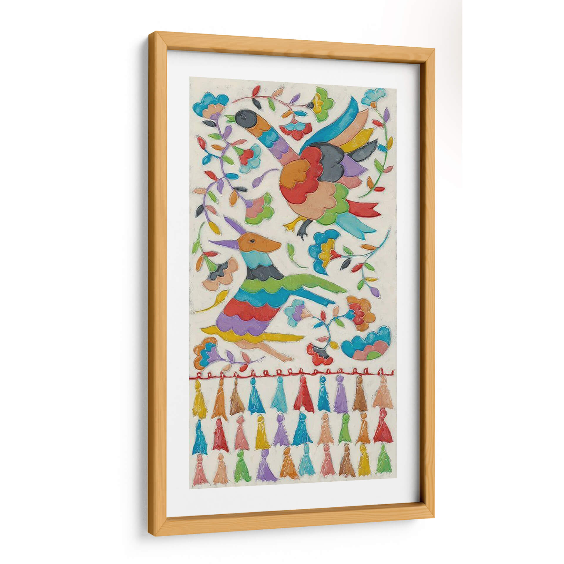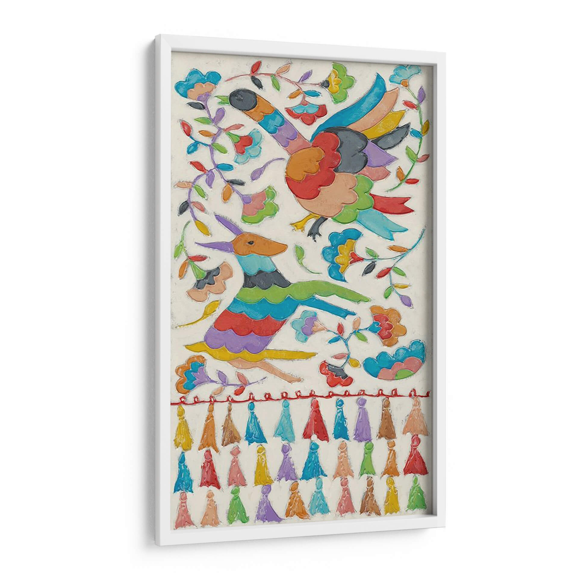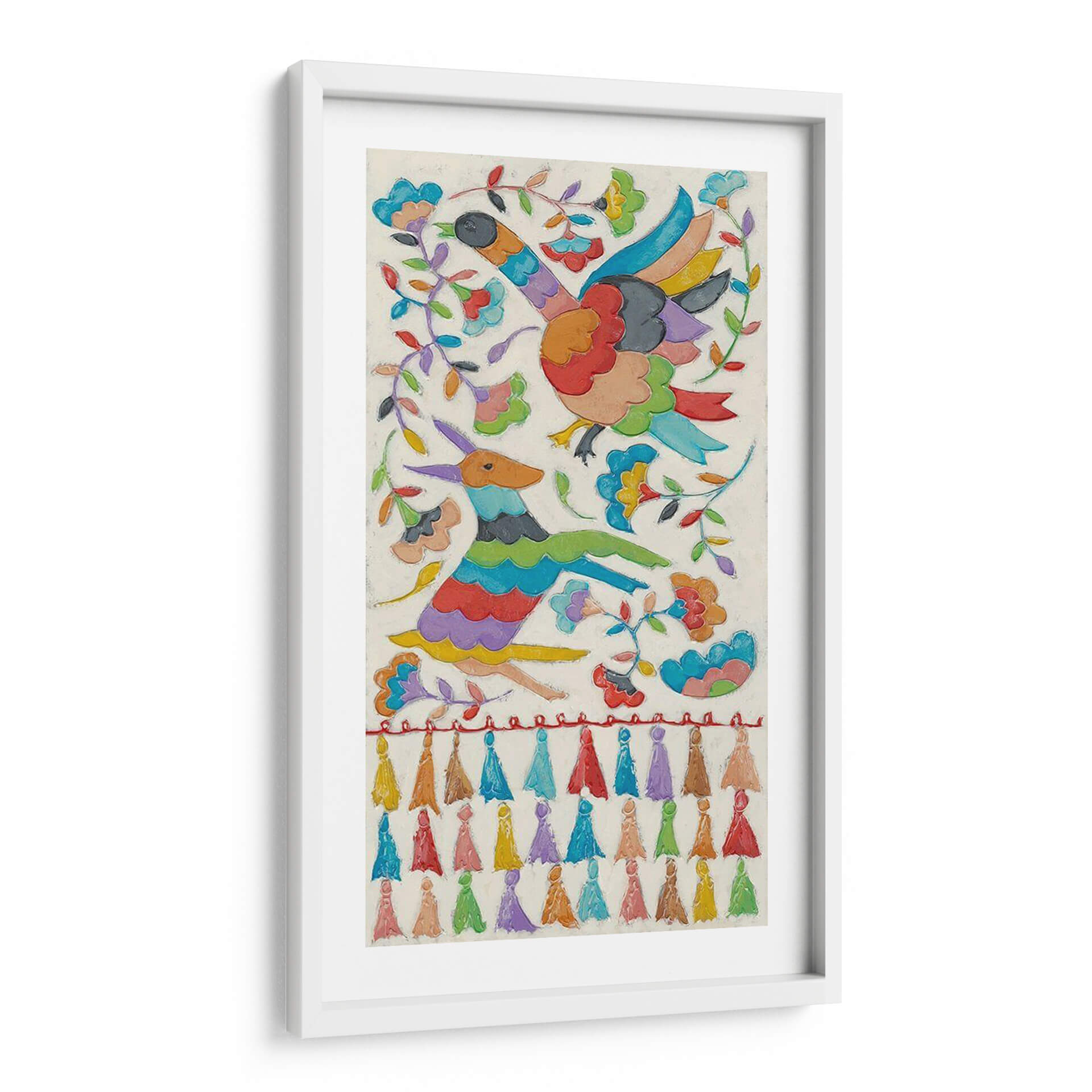 Sumérgete en la vibrante y alegre obra "Tapicería Animal I" de Chariklia Zarris, un cuadro decorativo que irradia vitalidad y un espíritu lúdico. Esta pieza captura la imaginación con su vívida representación de aves y una criatura similar a un ciervo, entrelazadas con flores y follaje en un diseño lleno de movimiento y color. La paleta de colores es un festín para los ojos, con tonos brillantes y contrastantes que dan vida a cada elemento, desde las plumas de las aves hasta los pétalos de las flores y la ondulante melena del animal. El estilo, que evoca la artesanía textil con sus texturas y detalles, añade una dimensión única, invitando a la contemplación de su rica composición. "Tapicería Animal I" es ideal para infundir energía y un toque de arte folclórico moderno en cualquier espacio, ya sea una sala de estar, un dormitorio o una oficina que busque una inyección de alegría y originalidad. Es más que una simple decoración de pared; es una ventana a un mundo de fantasía y celebración, perfecta para quienes aprecian el arte que cuenta una historia y provoca emociones positivas. Descubre cómo esta obra puede transformar tu entorno y añadir un punto focal lleno de carácter y encanto.