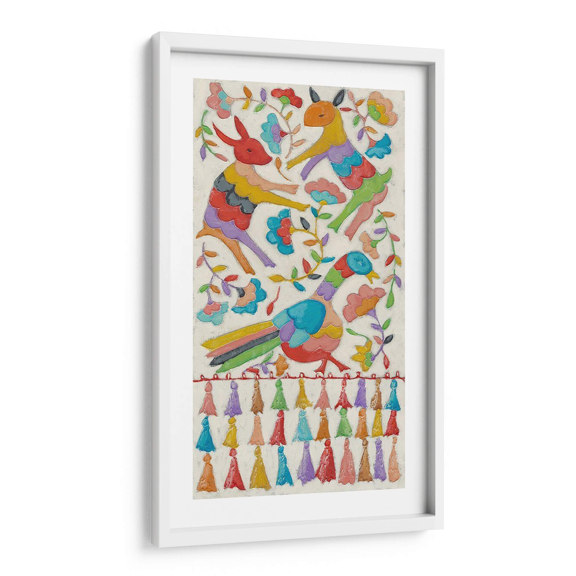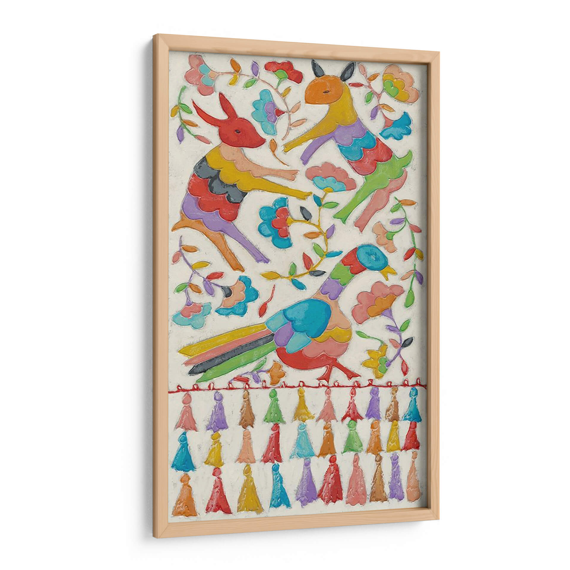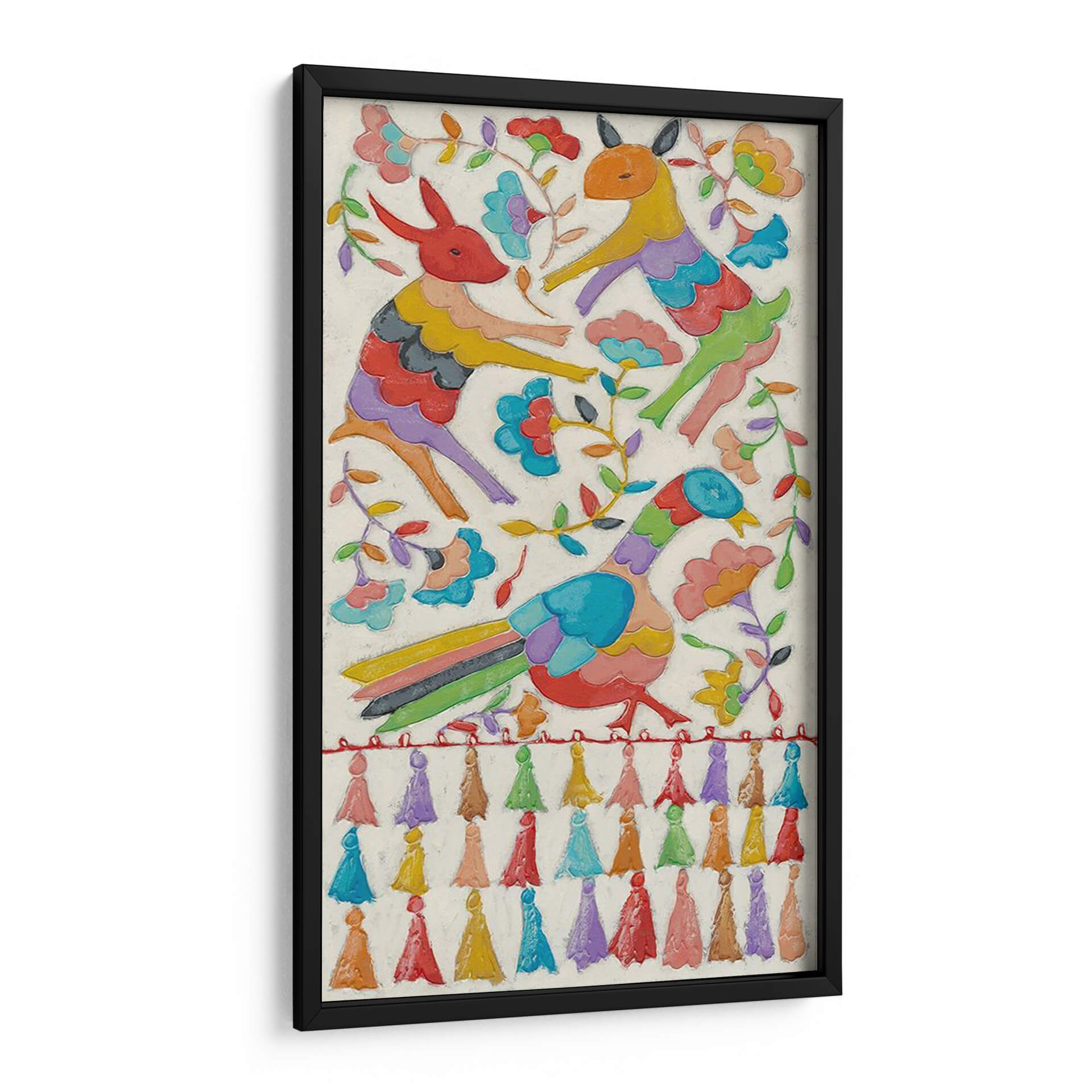 Sumérgete en la vibrante y alegre obra de arte "Tapicería Animal II" de Chariklia Zarris, una pieza que irradia un espíritu juguetón y festivo. Este cuadro decorativo presenta una encantadora composición de animales estilizados, un pájaro colorido y elementos florales, todo representado con un estilo naíf y folclórico que recuerda a las tradicionales tapicerías artesanales. La paleta de colores es un derroche de alegría, con tonos vivos y saturados como el rojo, amarillo, azul, verde y púrpura, que contrastan maravillosamente con el fondo de textura cremosa. Cada figura animal está representada con formas audaces y simplificadas, transmitiendo una sensación de movimiento y vitalidad. La presencia de flores y ramas añade un toque de naturaleza y frescura, mientras que la fila de coloridos pompones en la parte inferior refuerza la atmósfera lúdica y artesanal. "Tapicería Animal II" es ideal para añadir un toque de color y personalidad a cualquier espacio, ya sea una sala de estar, un dormitorio infantil o una oficina que necesite un toque de optimismo. Su estilo único y su ejecución detallada la convierten en una pieza de conversación que atraerá miradas y generará sonrisas.