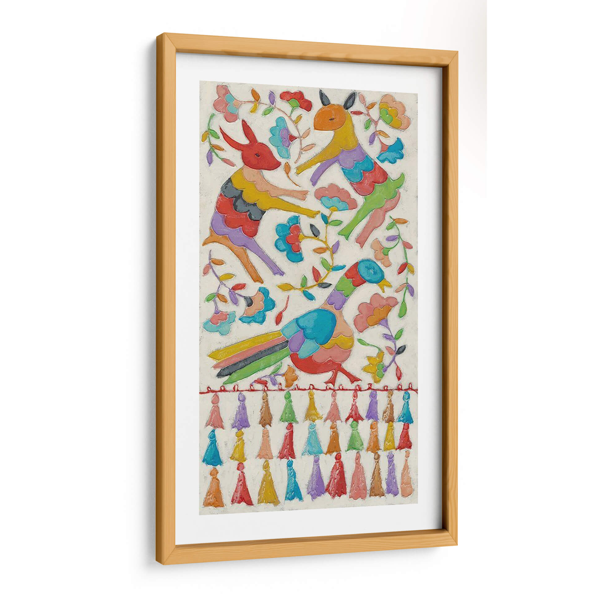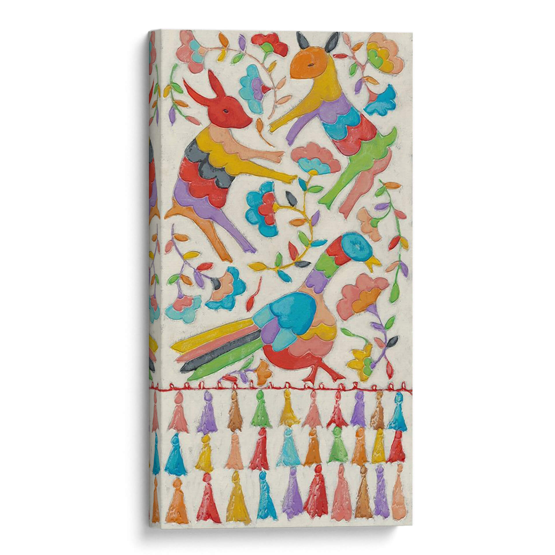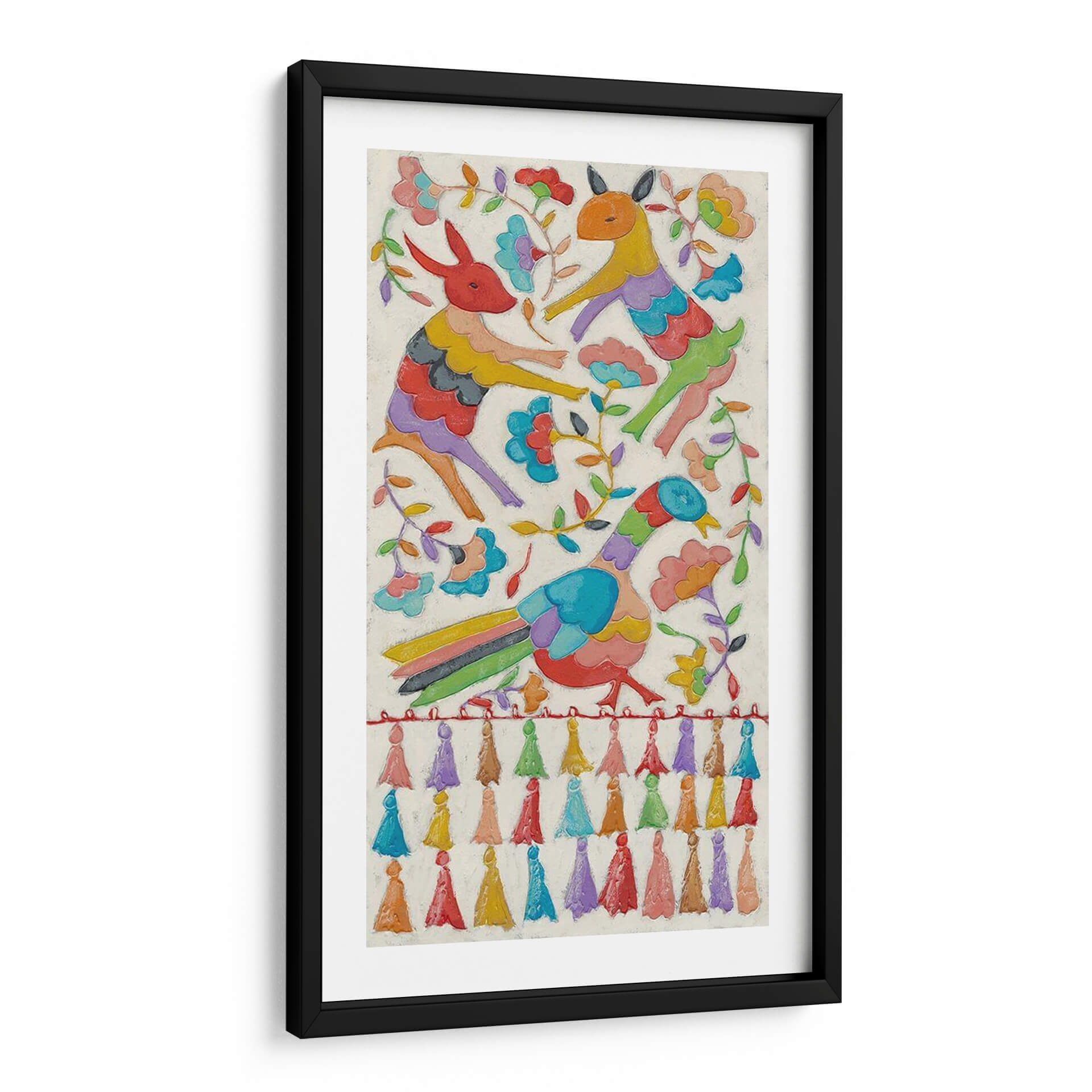 Sumérgete en la vibrante y alegre obra de arte "Tapicería Animal II" de Chariklia Zarris, una pieza que irradia un espíritu juguetón y festivo. Este cuadro decorativo presenta una encantadora composición de animales estilizados, un pájaro colorido y elementos florales, todo representado con un estilo naíf y folclórico que recuerda a las tradicionales tapicerías artesanales. La paleta de colores es un derroche de alegría, con tonos vivos y saturados como el rojo, amarillo, azul, verde y púrpura, que contrastan maravillosamente con el fondo de textura cremosa. Cada figura animal está representada con formas audaces y simplificadas, transmitiendo una sensación de movimiento y vitalidad. La presencia de flores y ramas añade un toque de naturaleza y frescura, mientras que la fila de coloridos pompones en la parte inferior refuerza la atmósfera lúdica y artesanal. "Tapicería Animal II" es ideal para añadir un toque de color y personalidad a cualquier espacio, ya sea una sala de estar, un dormitorio infantil o una oficina que necesite un toque de optimismo. Su estilo único y su ejecución detallada la convierten en una pieza de conversación que atraerá miradas y generará sonrisas.