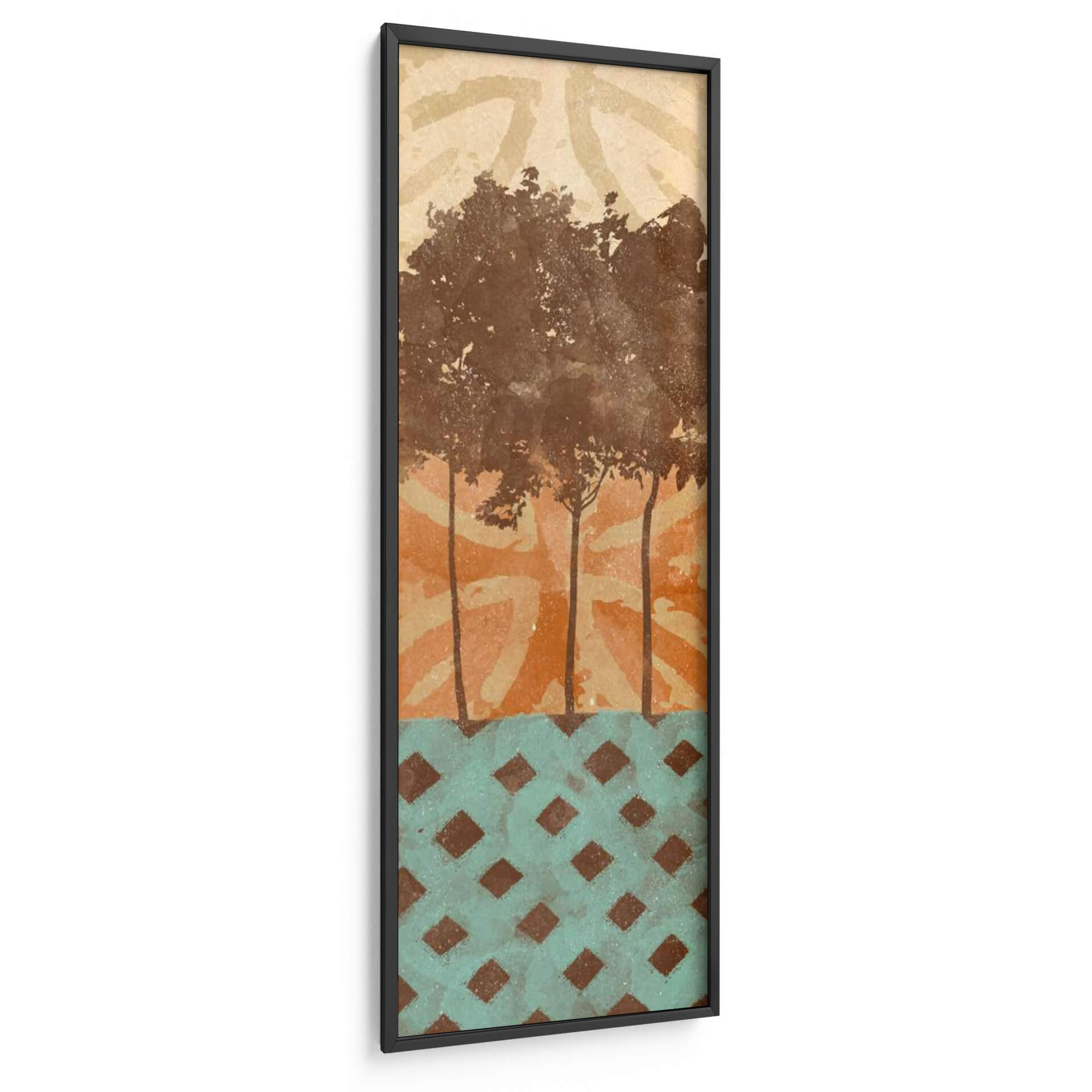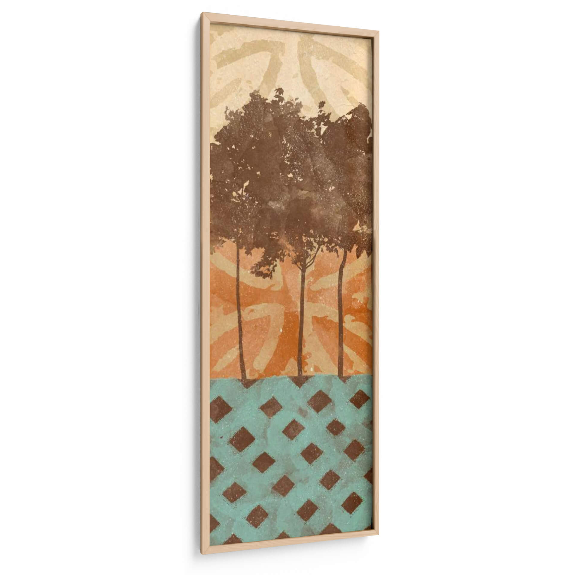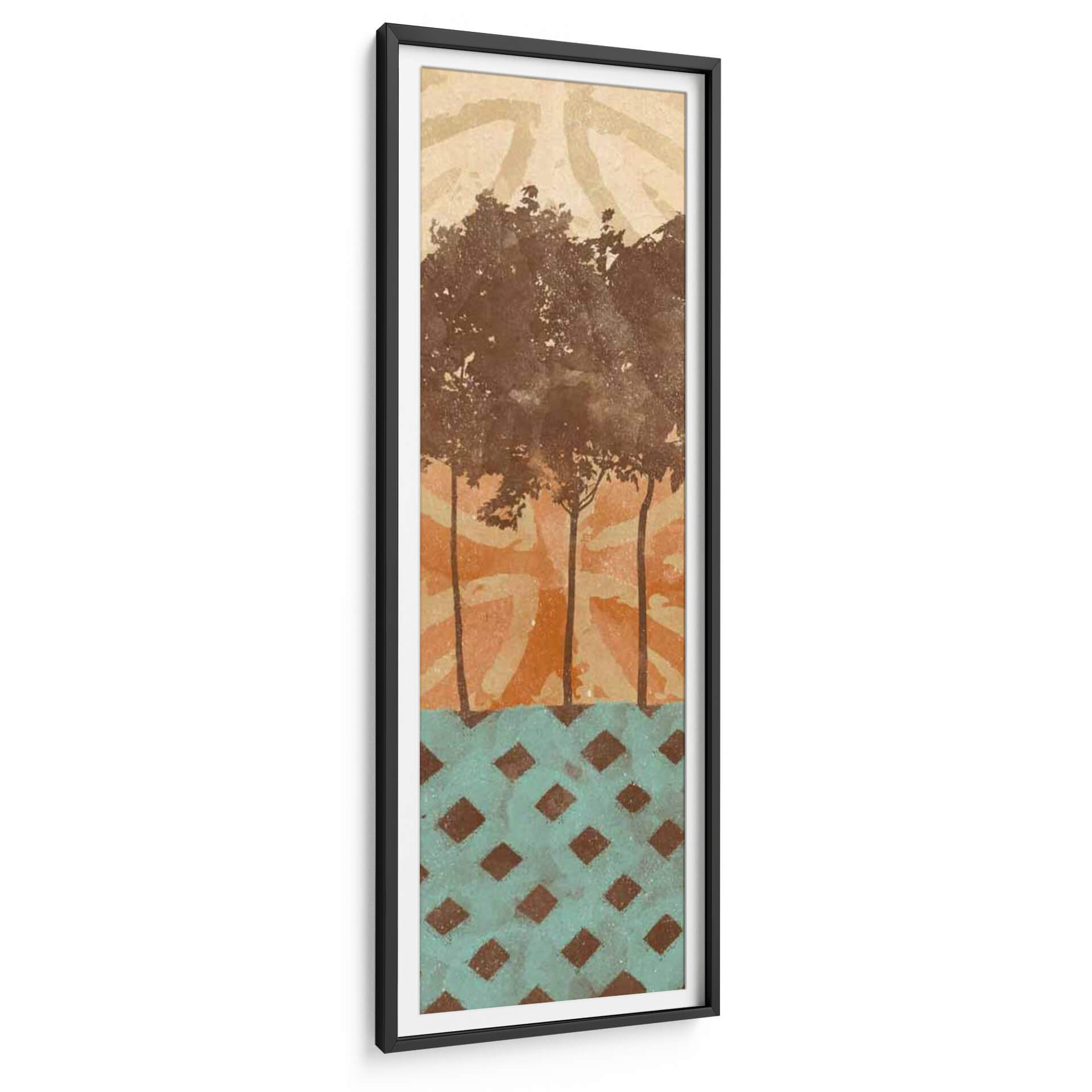 Sumérgete en la evocadora atmósfera de "Trio Tribal I", una obra de arte contemporáneo que combina elementos de la naturaleza con patrones geométricos audaces. Este cuadro decorativo presenta un grupo de árboles estilizados en tonos tierra oscuros, que se alzan sobre un fondo vibrante de rayos naranjas y amarillos, sugiriendo un atardecer o un amanecer lleno de energía. La parte inferior de la composición se define por un intrincado patrón tribal en turquesa y marrón, que añade un toque rústico y moderno a la pieza. La textura visual y la paleta de colores cálidos y fríos crean un equilibrio dinámico, lo que convierte a "Trio Tribal I" en un punto focal cautivador para cualquier espacio. Ideal para salas de estar, comedores o estudios que busquen añadir carácter y un toque de arte abstracto con inspiración étnica. Este cuadro decorativo es perfecto para quienes aprecian la fusión entre la estética orgánica y los diseños geométricos, aportando una sensación de conexión con la tierra y un estilo distintivo a la decoración de tu hogar u oficina.