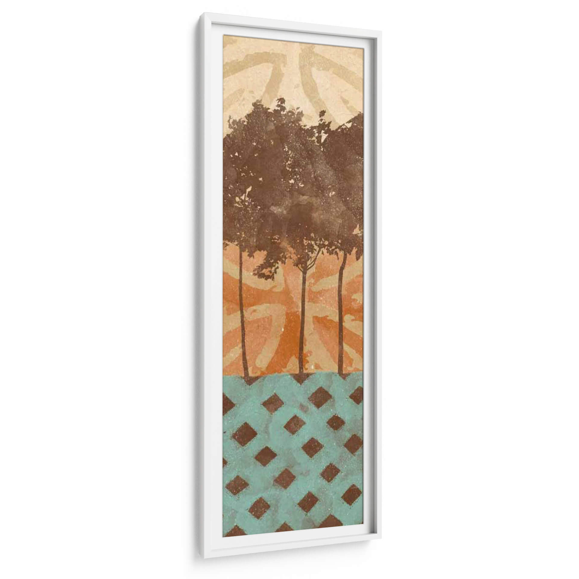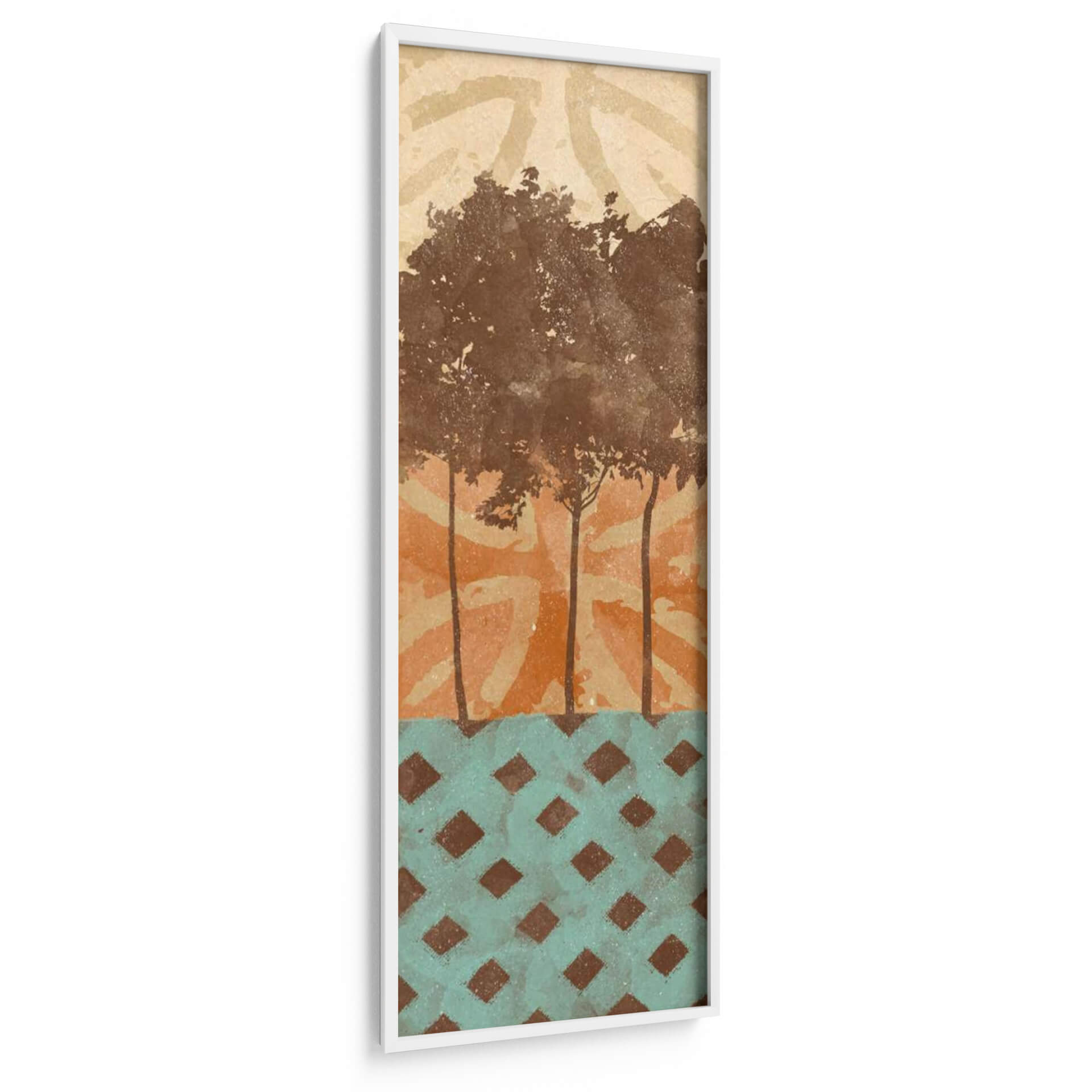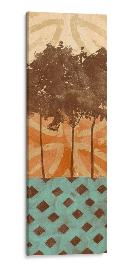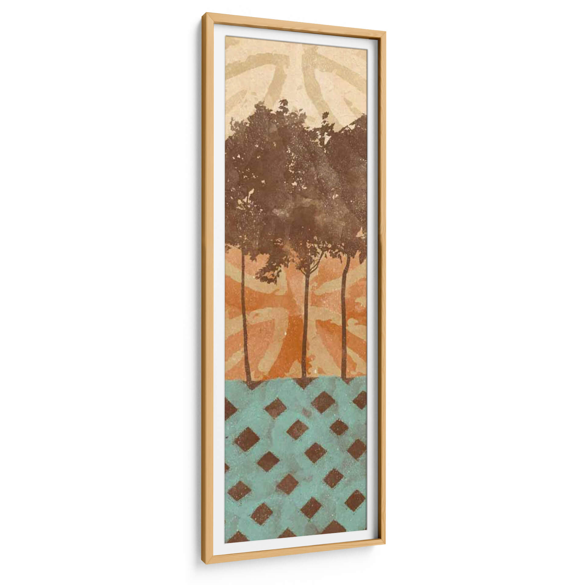 Sumérgete en la evocadora atmósfera de "Trio Tribal I", una obra de arte contemporáneo que combina elementos de la naturaleza con patrones geométricos audaces. Este cuadro decorativo presenta un grupo de árboles estilizados en tonos tierra oscuros, que se alzan sobre un fondo vibrante de rayos naranjas y amarillos, sugiriendo un atardecer o un amanecer lleno de energía. La parte inferior de la composición se define por un intrincado patrón tribal en turquesa y marrón, que añade un toque rústico y moderno a la pieza. La textura visual y la paleta de colores cálidos y fríos crean un equilibrio dinámico, lo que convierte a "Trio Tribal I" en un punto focal cautivador para cualquier espacio. Ideal para salas de estar, comedores o estudios que busquen añadir carácter y un toque de arte abstracto con inspiración étnica. Este cuadro decorativo es perfecto para quienes aprecian la fusión entre la estética orgánica y los diseños geométricos, aportando una sensación de conexión con la tierra y un estilo distintivo a la decoración de tu hogar u oficina.