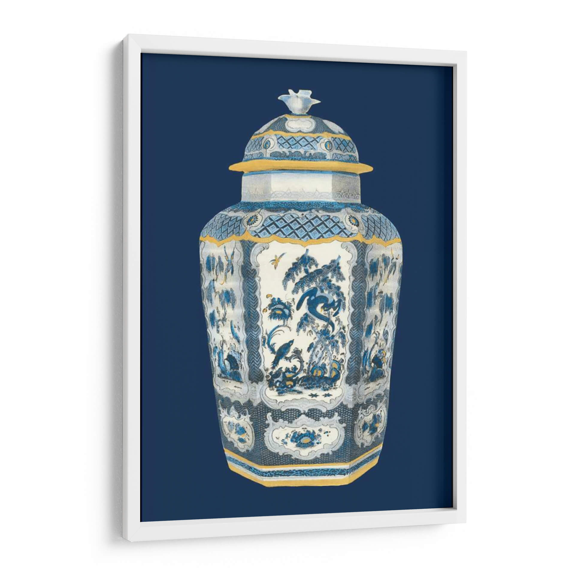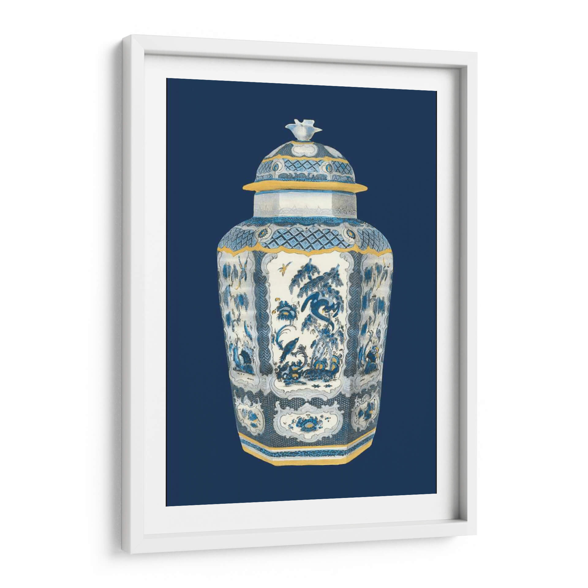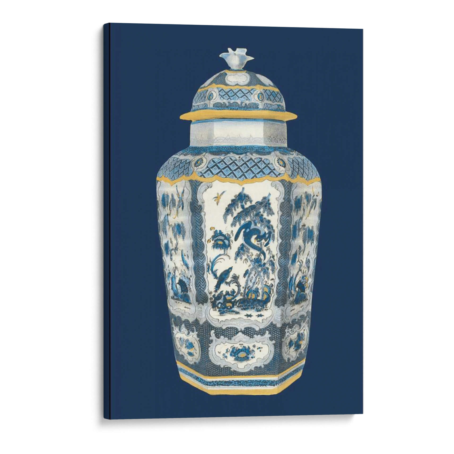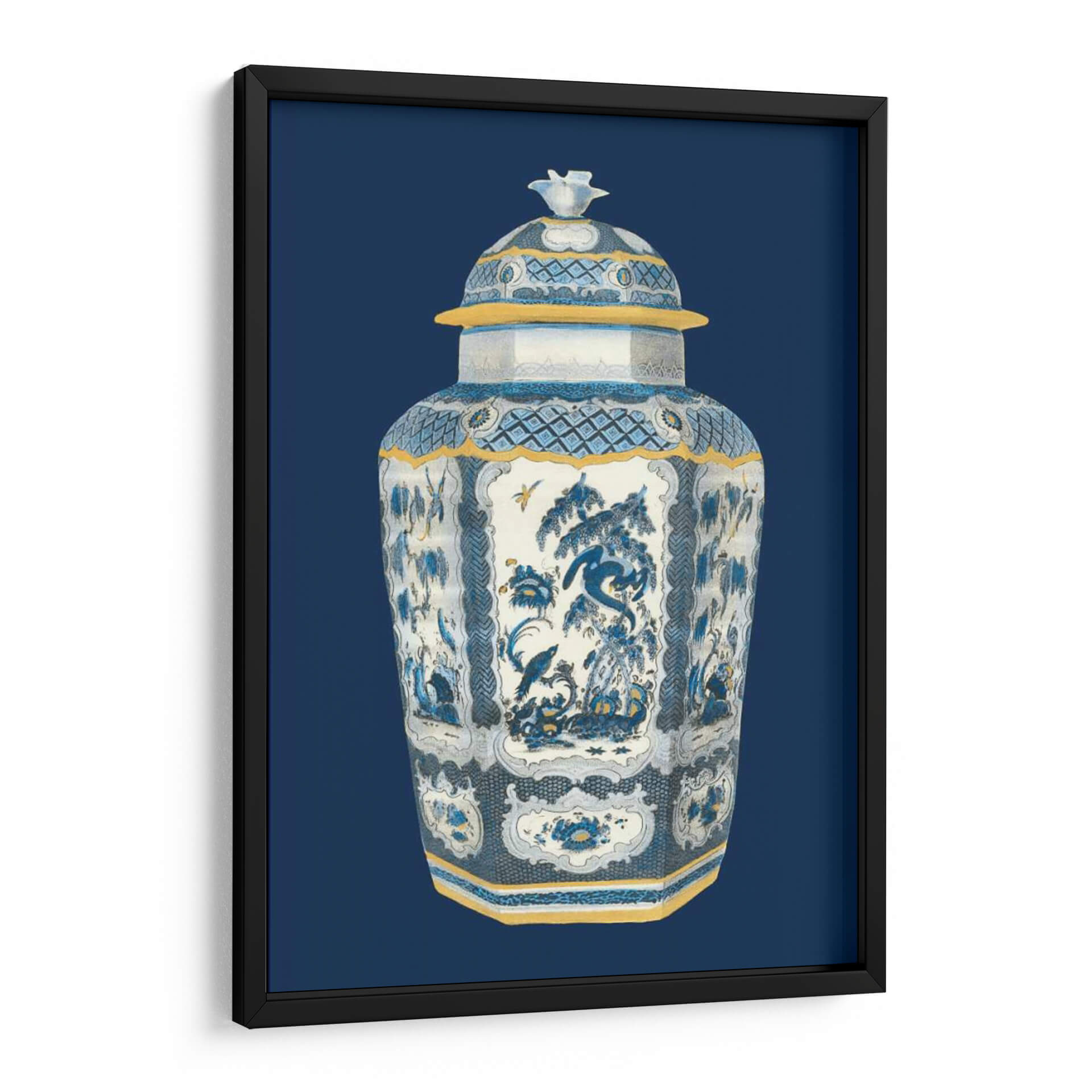 Aporta un toque de elegancia atemporal a tu espacio con este cautivador cuadro decorativo "Urna Asiática En Azul Y Blanco II" de Vision Studio. Esta exquisita obra de arte presenta una detallada representación de una urna china tradicional, bañada en una paleta de colores serena de azules profundos, blancos puros y acentos dorados cálidos. La intrincada ornamentación de la urna, con sus motivos florales delicados, escenas naturales y patrones geométricos sutiles, evoca una sensación de calma y sofisticación. La composición centra la atención en la majestuosidad del objeto, enmarcado por un fondo azul oscuro que realza su presencia. El estilo, que fusiona la delicadeza de la ilustración clásica con una estética contemporánea, lo convierte en una pieza versátil, ideal para complementar tanto decoraciones clásicas como modernas. Imagina este cuadro aportando serenidad a tu dormitorio, un punto focal de refinamiento en tu sala de estar, o una nota de distinción en tu estudio u oficina. Es más que una simple decoración de pared; es una invitación a la contemplación y a la apreciación de la belleza artística oriental, adaptada para enriquecer cualquier hogar contemporáneo. Un lienzo que promete transformar tu entorno con su encanto histórico y su refinada paleta cromática.