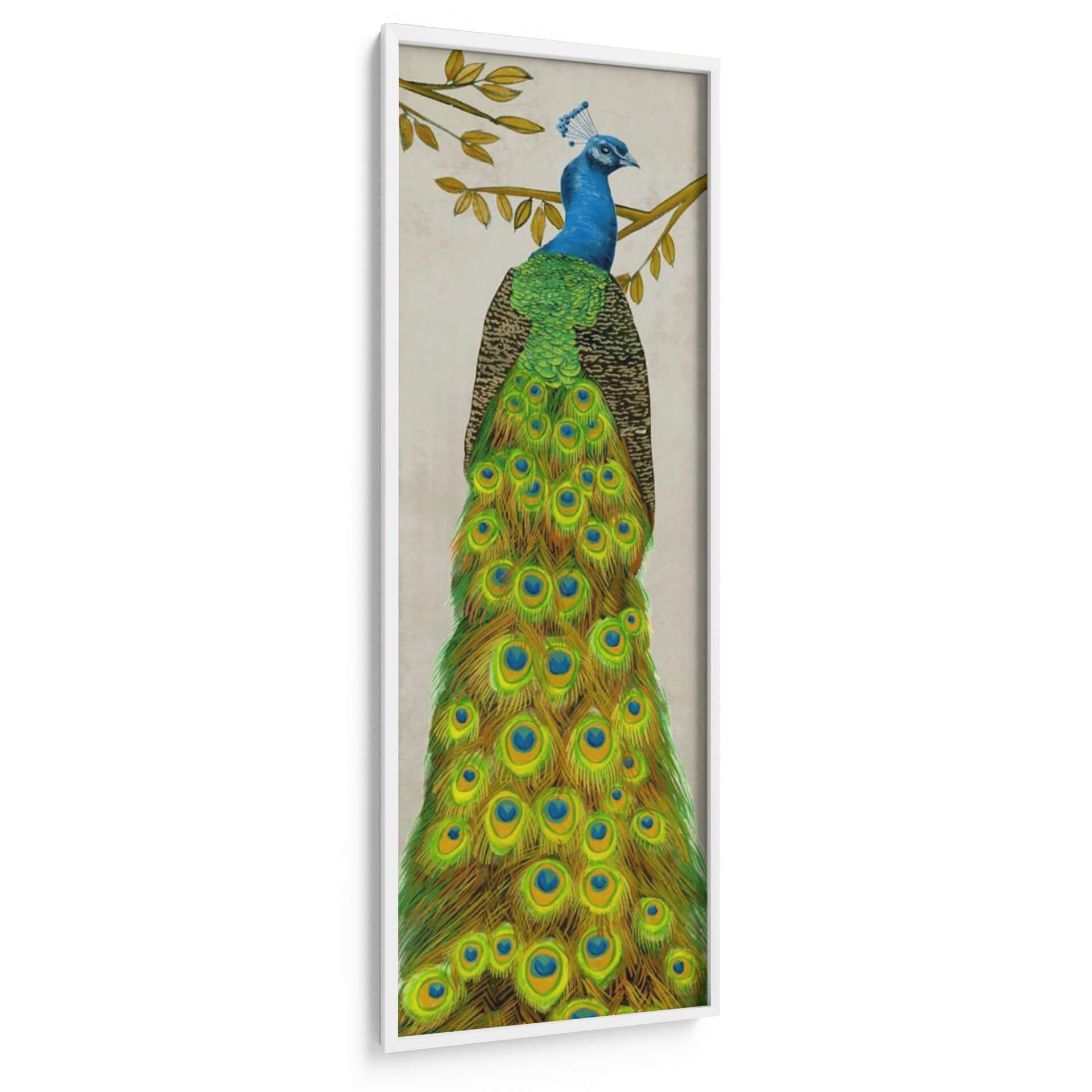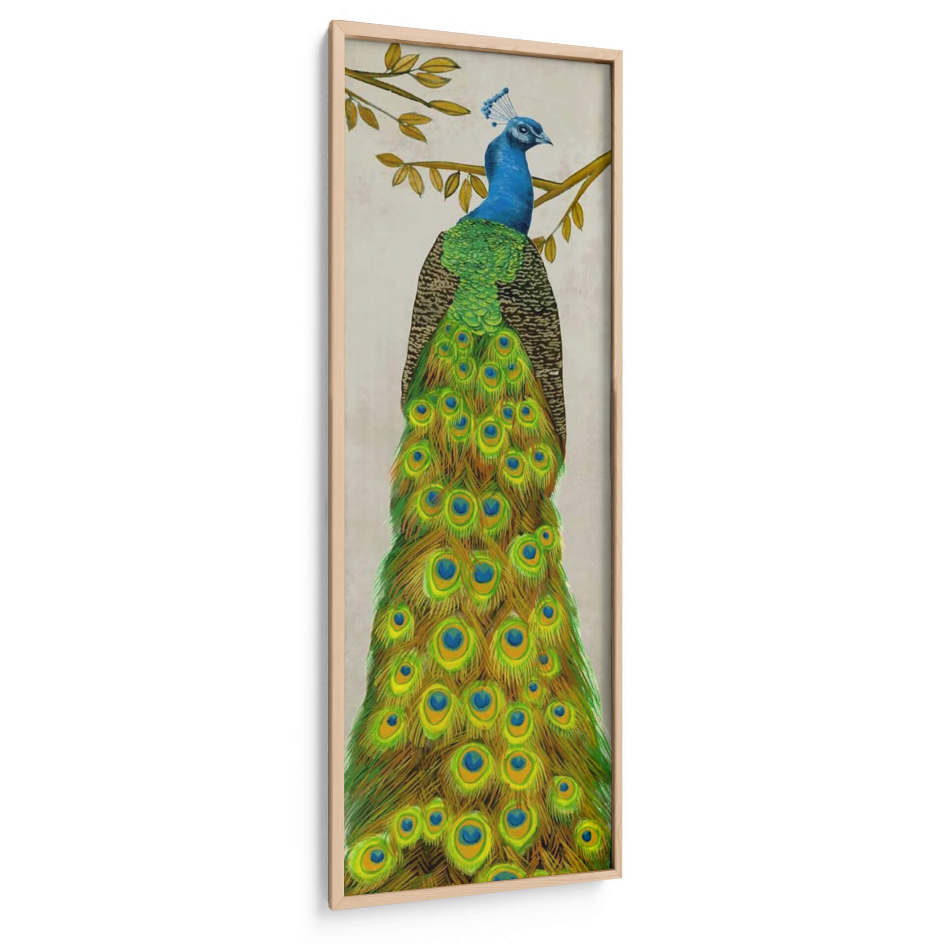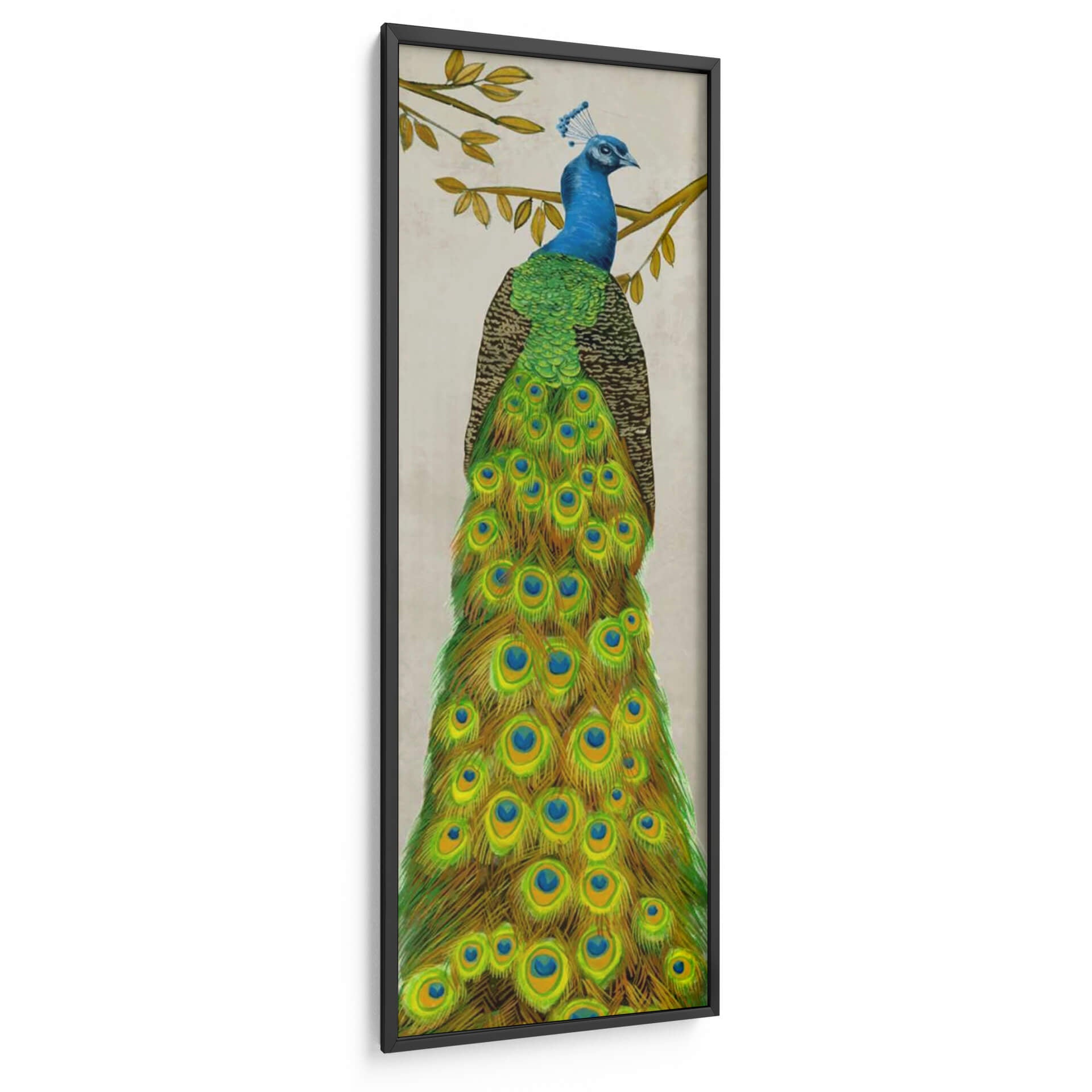 Sumérgete en la majestuosidad de la naturaleza con "Vintage Peacock I", una obra de arte de Melissa Wang que captura la opulencia y el encanto de esta ave icónica. Este cuadro decorativo presenta un pavo real en todo su esplendor, desplegando su abanico de plumas iridiscentes en una explosión de verdes vibrantes y azules profundos, acentuados por el detalle exquisito de sus ocelos. La paleta de colores, dominada por tonos joya y un suave fondo neutro, crea un contraste fascinante que atrae la mirada y evoca una sensación de lujo y elegancia atemporal. La composición vertical, centrada en la magnificencia del pavo real posado sobre una rama sutilmente ilustrada, añade un toque de sofisticación y equilibrio, haciendo de esta pieza un punto focal cautivador para cualquier estancia. Su estilo, que combina elementos realistas con un toque de fantasía, lo convierte en una adición perfecta para salones modernos, dormitorios serenos o recibidores que buscan transmitir un aire de distinción. Este cuadro no es solo una pieza decorativa, sino una ventana a la belleza natural con un aire vintage, ideal para quienes aprecian el arte con carácter y una historia que contar. Aporta un toque de color, vida y un aire de misterio encantador a tu hogar.