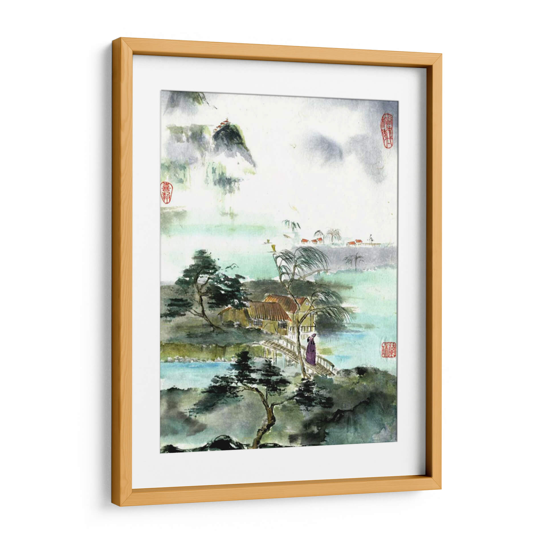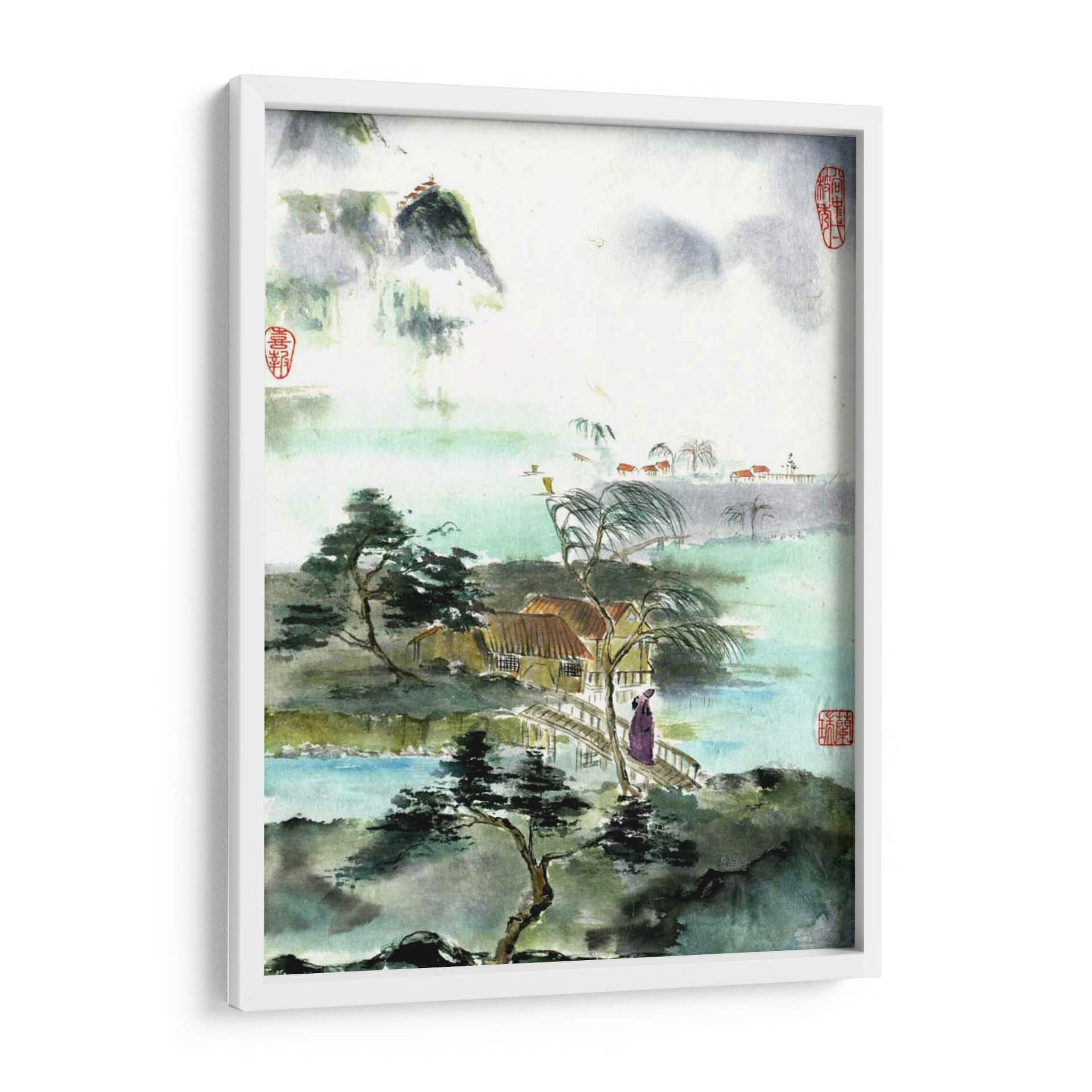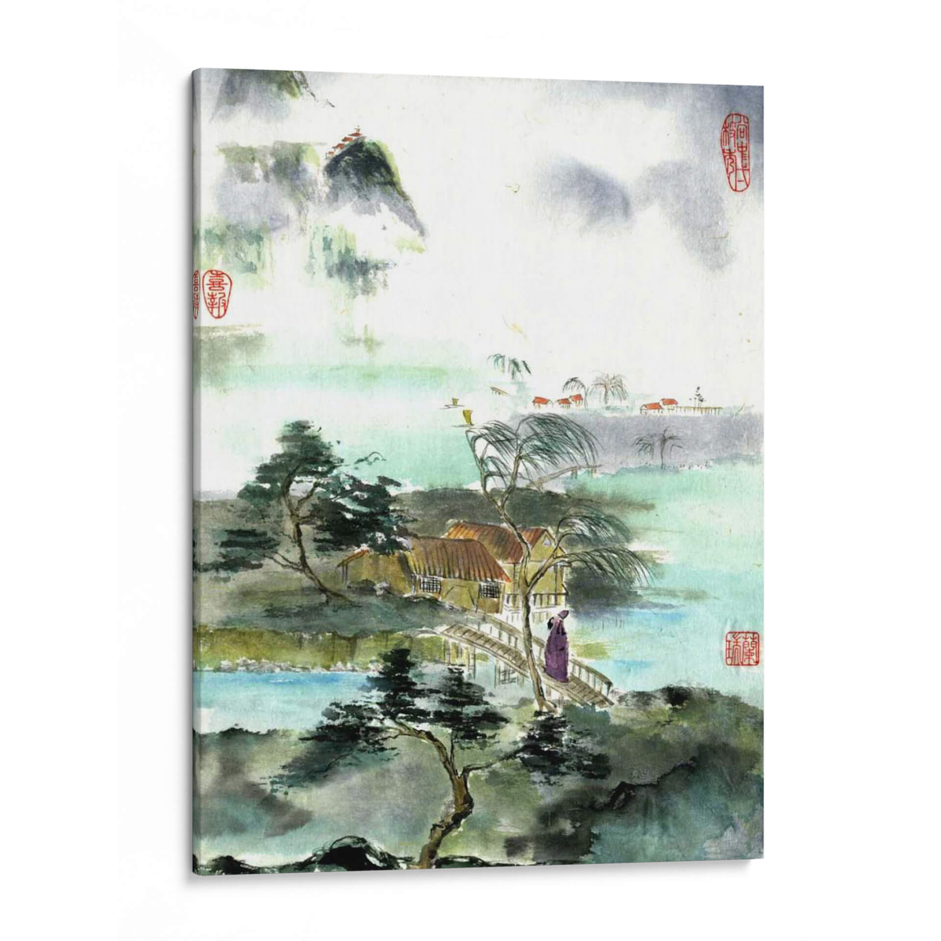 Sumérgete en la serenidad y el misterio de "Visitante de Afar", una cautivadora obra de arte que evoca la esencia de un paisaje oriental tradicional con un toque contemporáneo. Nan Rae nos transporta a un mundo sereno donde las montañas envueltas en niebla se encuentran con serenos cuerpos de agua, salpicados de pintorescas casas y un puente pintoresco. La paleta de colores, dominada por tonos suaves de verde, azul y toques de tierra, crea una atmósfera de calma y contemplación. La figura solitaria en el puente añade un elemento de intriga, invitando a la reflexión sobre la soledad, el viaje o la visita a lugares lejanos. El estilo de pincelada suelta y las sutiles gradaciones de color, reminiscentes de la pintura de tinta china, aportan una sensación de profundidad y movimiento etéreo. Este cuadro decorativo es perfecto para infundir paz y un toque de espiritualidad en tu sala de estar, dormitorio o espacio de meditación. Es una invitación a la introspección, ideal para aquellos que buscan arte que no solo embellezca, sino que también inspire y conecte a un nivel emocional profundo.
