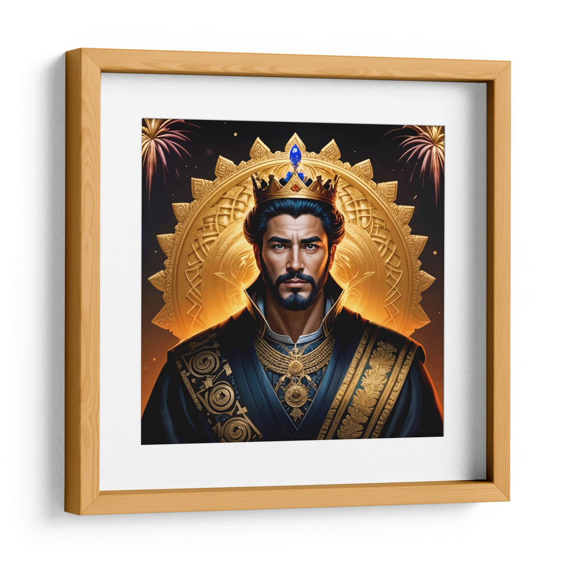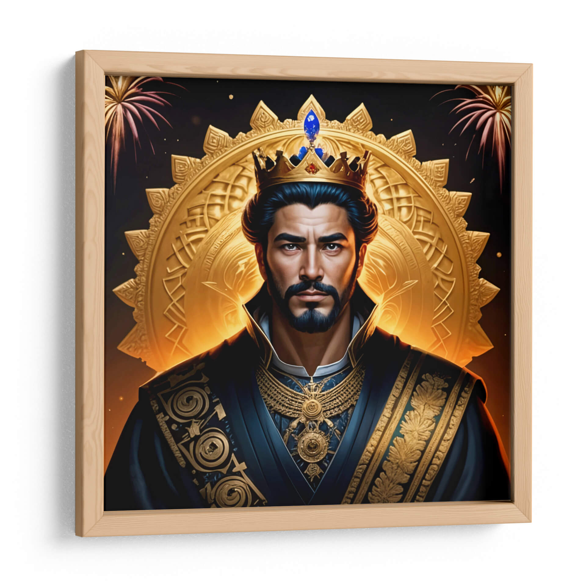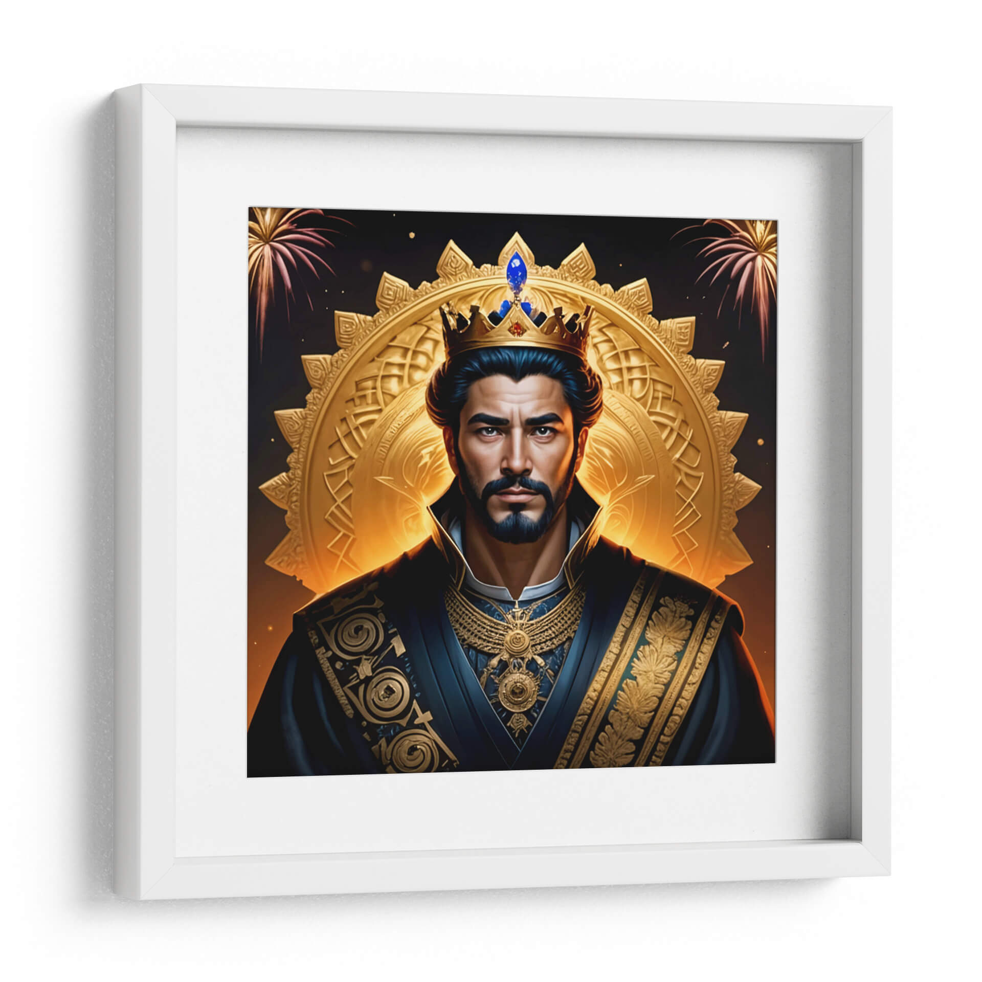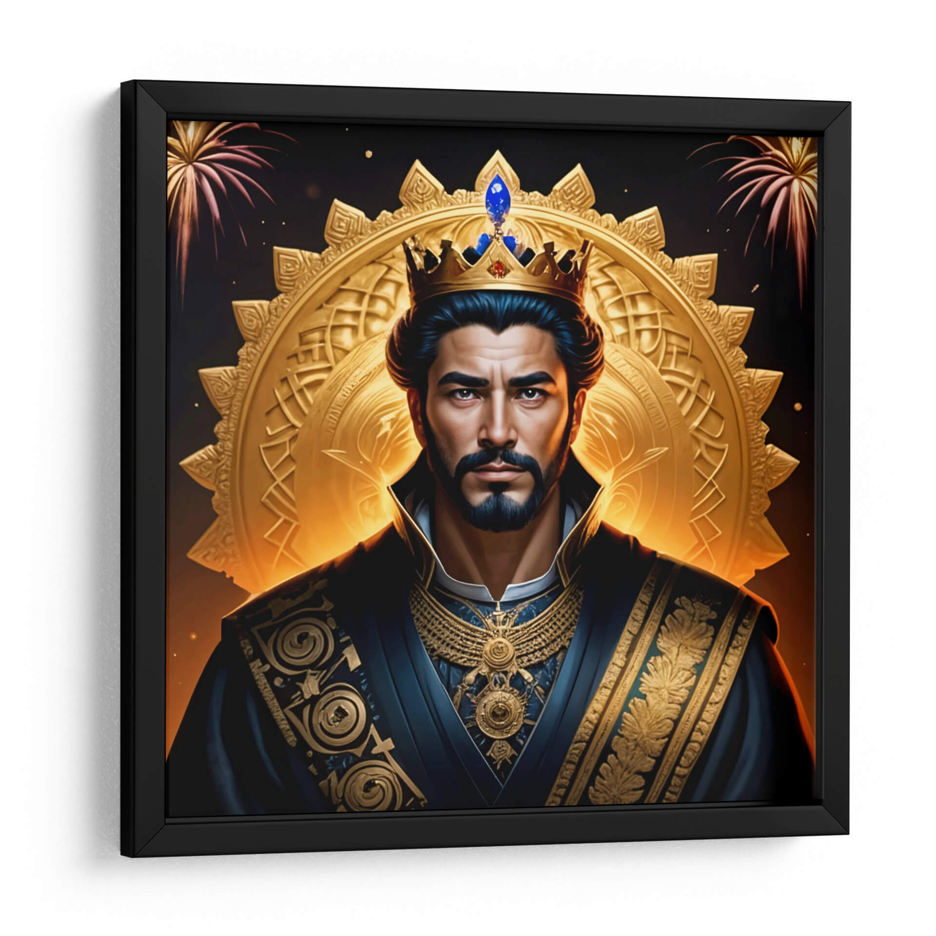 Sumérgete en la majestuosidad de "El Rey Dorado", un cuadro decorativo que irradia poder y opulencia. Esta cautivadora obra de arte presenta un retrato imponente de un rey, coronado con detalles dorados y adornado con intrincadas joyas y vestimentas opulentas. El fondo, dominado por un radiante sol estilizado y fogatas o fuegos artificiales festivos, crea una atmósfera de celebración y autoridad. La paleta de colores se centra en ricos tonos dorados, profundos azules y un cálido resplandor anaranjado que juntos proyectan una sensación de grandeza y exclusividad. El estilo, con sus líneas definidas y realismo estilizado, aporta un toque contemporáneo a la figura clásica de un monarca. Este cuadro decorativo es ideal para aquellos que buscan añadir un elemento de distinción y liderazgo a su sala de estar, estudio u oficina. Su presencia evoca confianza, estatus y un sentido de propósito. "El Rey Dorado" no es solo una pieza de decoración, sino una declaración de intenciones, perfecta para inspirar y elevar cualquier espacio con su presencia imponente y su rica simbología de poder y riqueza.