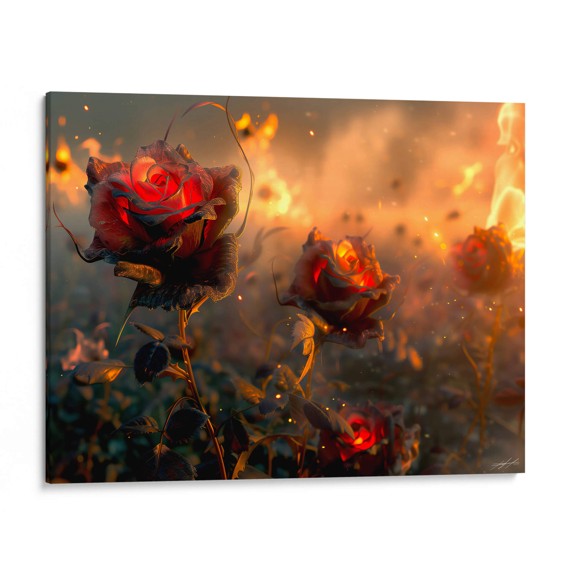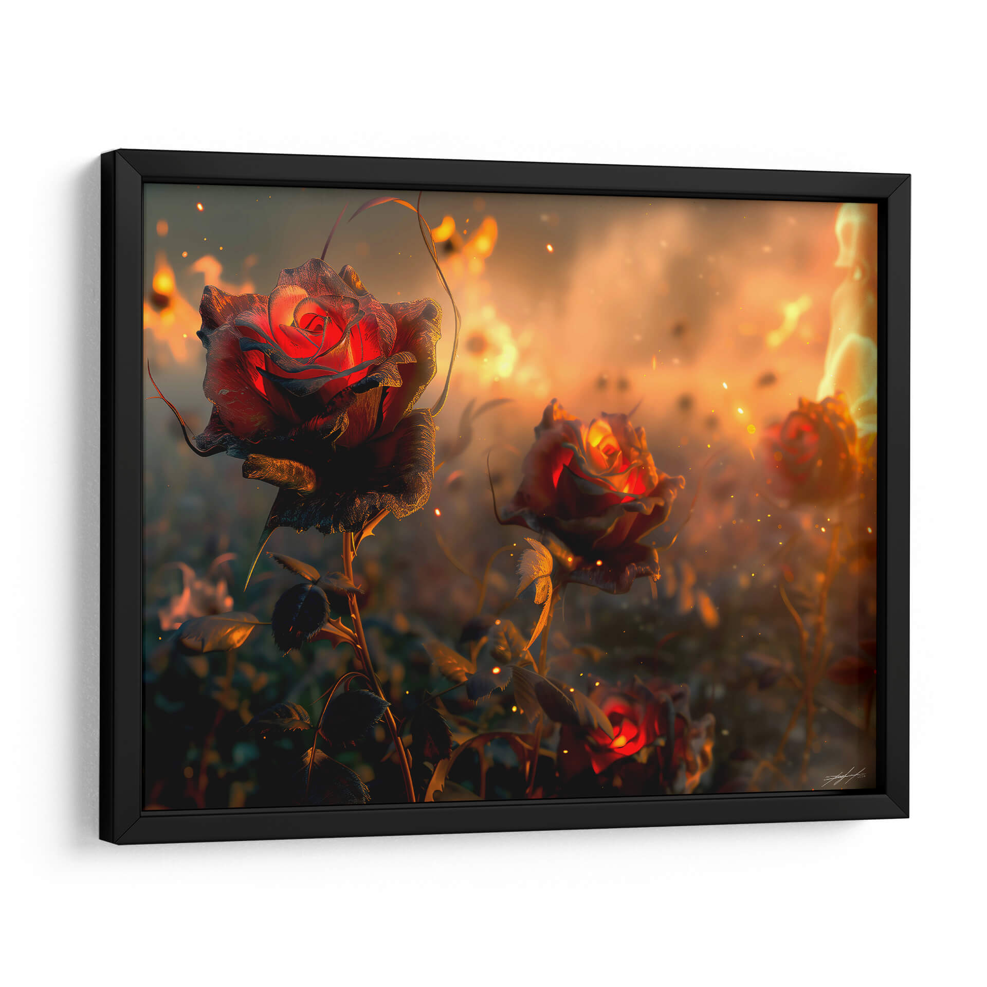 Sumérgete en la intensidad y el misterio de "Campo de Rosas de Fuego", una obra de arte digital que captura la belleza efímera de las rosas en medio de un paisaje ardiente. Los vibrantes pétalos carmesíes de las rosas contrastan dramáticamente con el fondo naranja y dorado del fuego y el humo, creando una escena de poder y pasión. Cada detalle, desde la delicadeza de los pétalos hasta las chispas incandescentes que flotan en el aire, está representado con una maestría visual que invita a la contemplación. Esta pieza evoca una dualidad fascinante: la fragilidad de la flor frente a la fuerza destructiva y transformadora del fuego. Es un cuadro decorativo ideal para añadir un toque de dramatismo y sofisticación a cualquier espacio, ya sea una sala de estar moderna, un estudio o un dormitorio que busque un punto focal impactante. "Campo de Rosas de Fuego" no es solo una decoración, es una experiencia visual que enciende la imaginación y deja una impresión duradera, fusionando la delicadeza de la naturaleza con la energía cruda de los elementos.