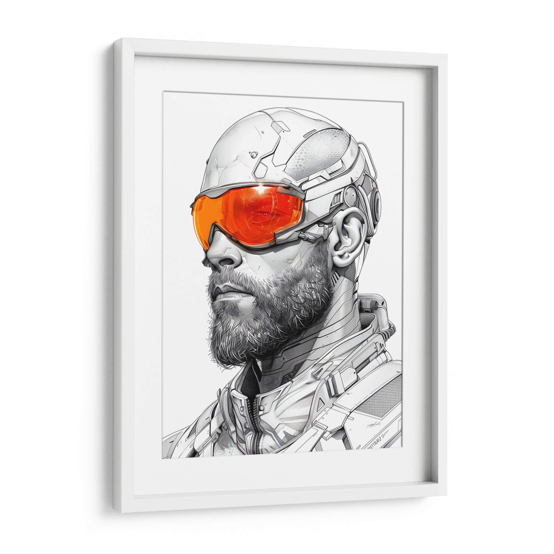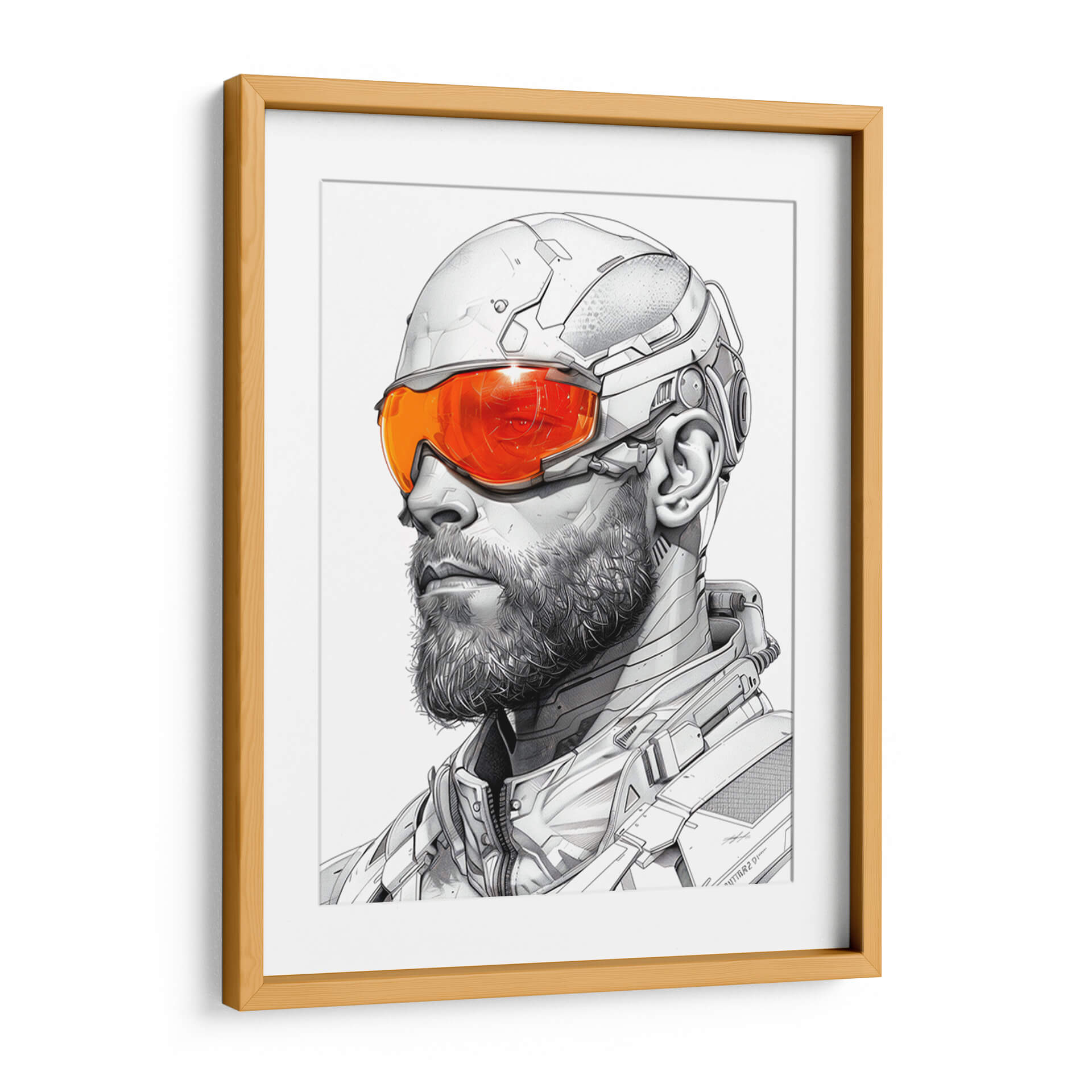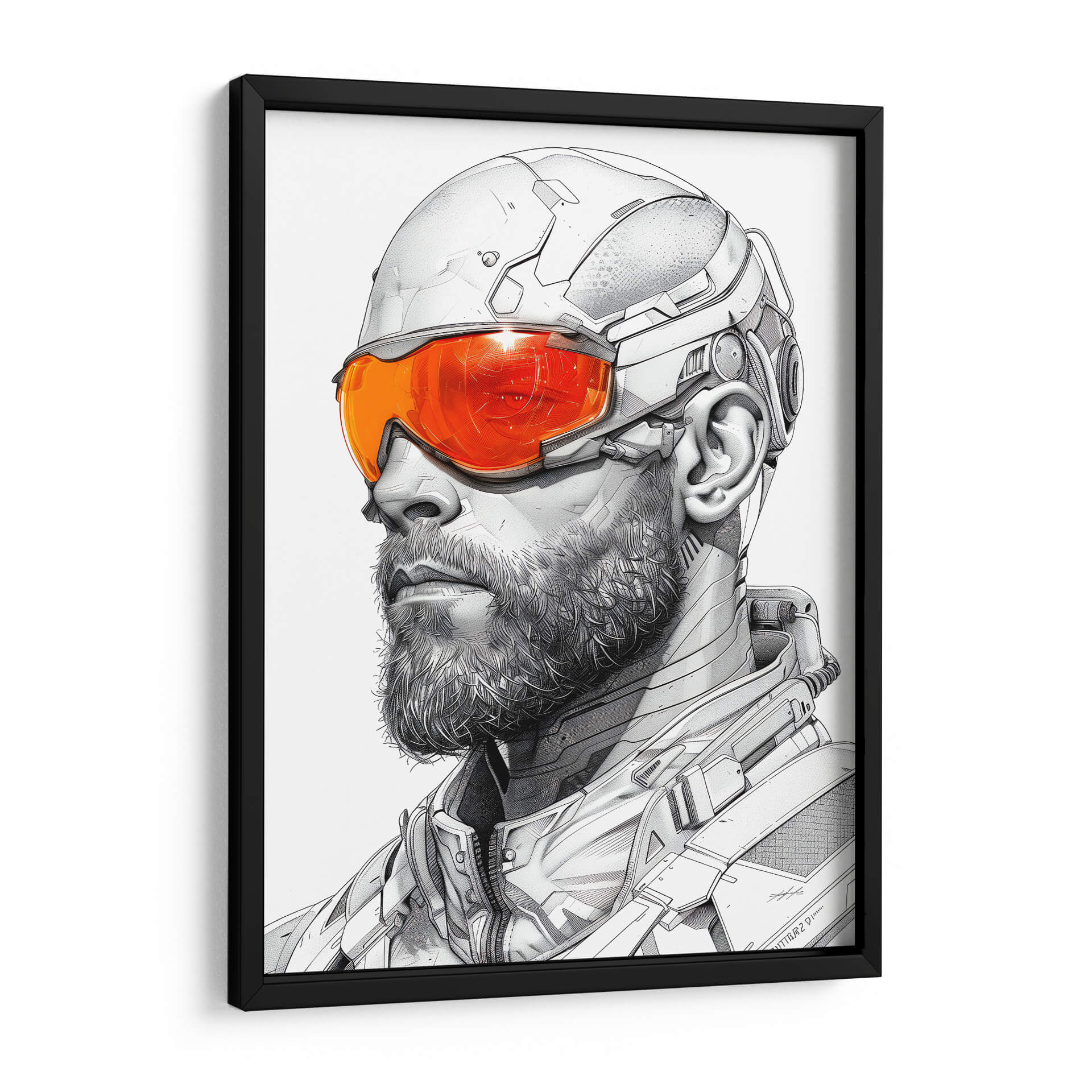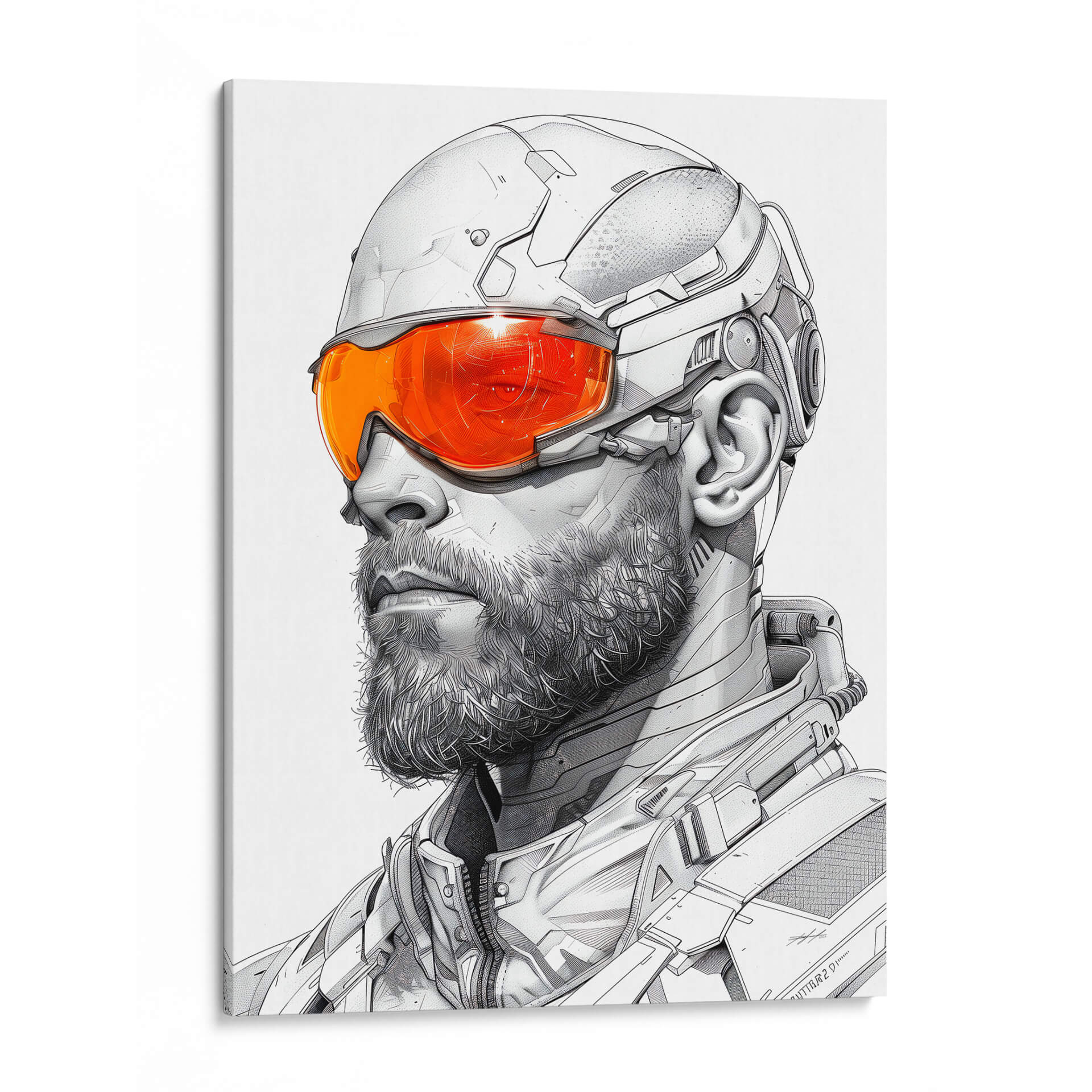 Sumérgete en la visión futurista de "El Hombre del Futuro", una obra de arte digital que captura la esencia de la evolución y la tecnología. Este cuadro decorativo presenta un retrato detallado de un hombre con un casco futurista y gafas naranjas vibrantes que contrastan con la paleta monocromática de la pieza. El estilo distintivo de DeLaVegaGaming fusiona elementos de ciencia ficción y realismo, creando una atmósfera de intriga y avance. La obra destaca por su intrincado diseño, la textura del cabello y la barba, y la precisión en los detalles mecánicos del traje. Los tonos grises y blancos predominantes, salpicados por el intenso naranja de las gafas, generan un impacto visual cautivador. Este cuadro es perfecto para añadir un toque de modernidad y sofisticación a tu sala de estar, estudio u oficina, inspirando conversaciones sobre el progreso y la identidad en la era digital. Su composición cercana y centrada invita a la contemplación de la figura, convirtiéndola en un punto focal poderoso para cualquier espacio.