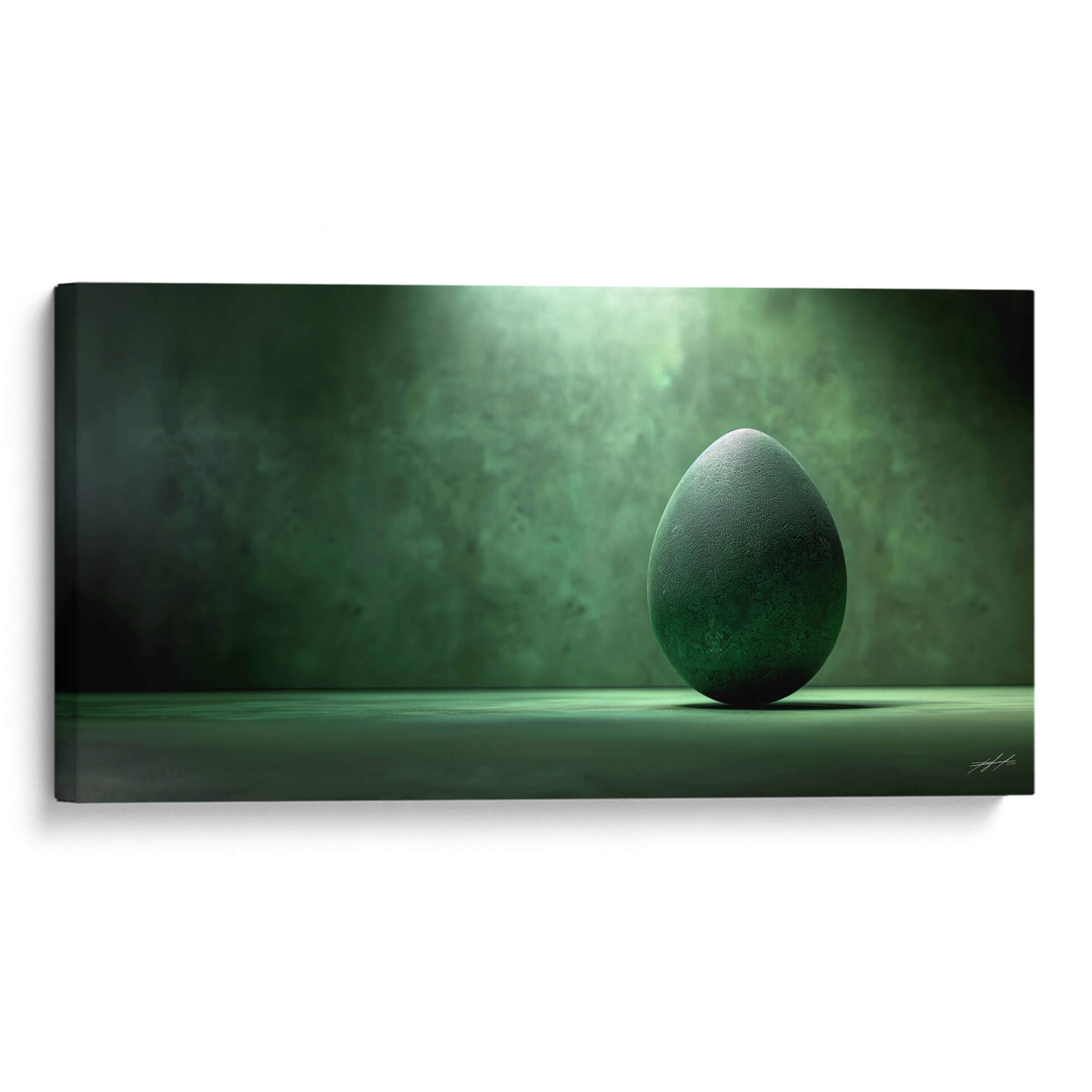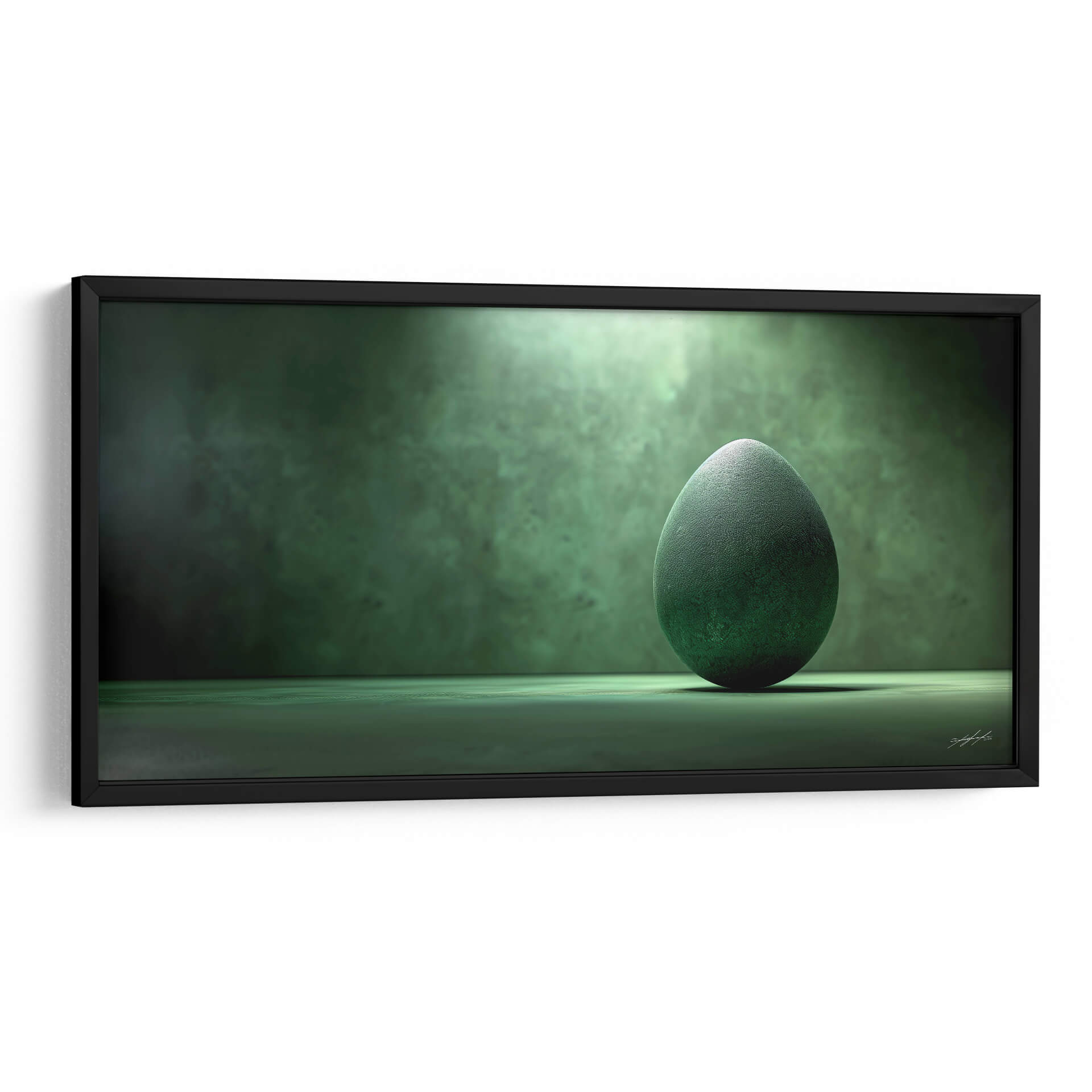 Sumérgete en la profundidad enigmática del "Huevo Abstracto - Verde - 2", una obra de arte digital que evoca misterio y serenidad a través de su cautivadora paleta de verdes. La pieza presenta un único huevo de textura orgánica, ricamente detallado y bañado por un foco de luz que crea una atmósfera etérea y casi mística. El fondo, con sus sutiles texturas y gradaciones de verde oscuro, complementa la forma central, generando un juego de luces y sombras que aporta volumen y dramatismo. La composición minimalista, centrada en la simplicidad de la forma y la potencia del color, invita a la contemplación y a la reflexión sobre la naturaleza, la vida y el potencial. Este cuadro decorativo abstracto es perfecto para añadir un toque de sofisticación y calma a cualquier espacio, ya sea un salón moderno, una oficina tranquila o un dormitorio que busque un rincón de paz visual. Su diseño contemporáneo y su atmósfera única lo convierten en una pieza versátil, capaz de integrarse y realzar decoraciones de estilo minimalista, escandinavo o incluso contemporáneo-bohemio. Descubre cómo este toque de verde abstracto puede transformar tu entorno y aportar una nueva dimensión a tu decoración.