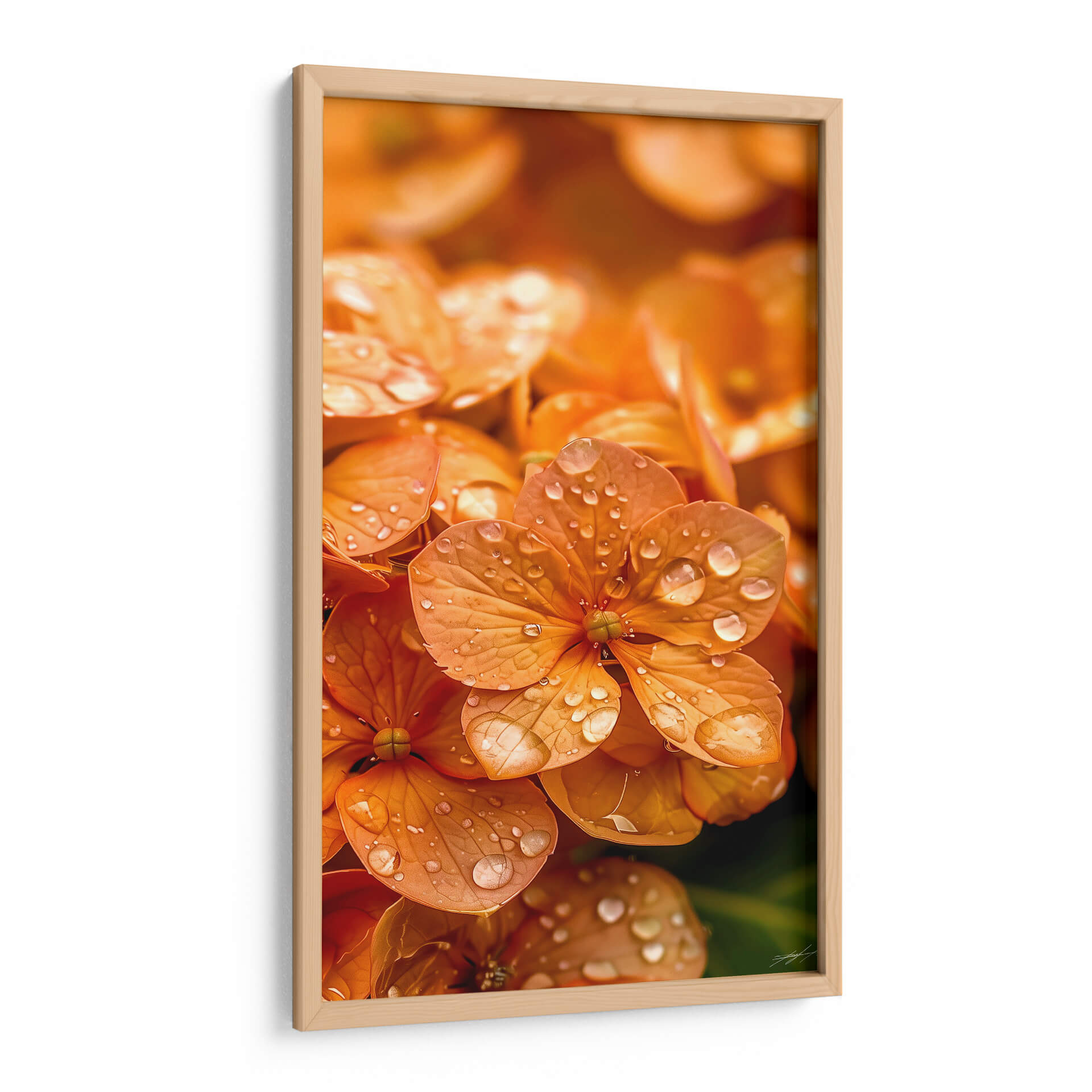 Sumérgete en la vibrante belleza de la naturaleza con este cautivador cuadro decorativo, 'Hydrangea Anaranjada'. La obra captura un primer plano íntimo de flores de hortensia bañadas por gotas de rocío, creando una imagen de frescura y vitalidad. Los pétalos, en un intenso tono anaranjado, se entrelazan formando una composición delicada y orgánica, mientras que las gotas de agua añaden un brillo y una textura tridimensional que invitan a la contemplación. La paleta de colores cálidos, dominada por naranjas y ocres, evoca una sensación de energía, alegría y calidez, ideal para infundir vida en cualquier espacio. El fondo sutilmente desenfocado en tonos verdes profundos contrasta armoniosamente, permitiendo que el tema principal resalte con todo su esplendor. Este cuadro es perfecto para añadir un toque de color y un aire de serenidad natural a salones modernos, recibidores acogedores o incluso oficinas que buscan un toque de optimismo. Su estilo fotográfico y detallado, con un enfoque macro, ofrece una perspectiva única sobre la complejidad y la belleza de las flores. Transforma tu hogar con esta pieza que celebra la efímera perfección de la naturaleza, creando un punto focal que inspirará y deleitará a tus invitados.