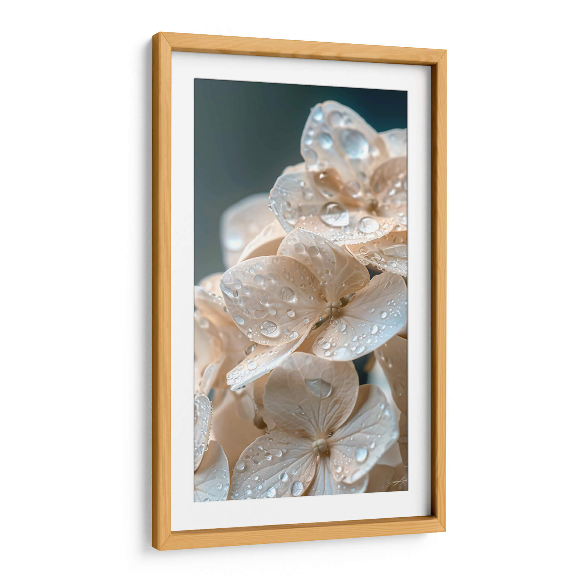 Sumérgete en la delicadeza y serenidad de "Hydrangea Beige", una obra de arte que captura la belleza efímera de las hortensias bañadas en gotas de rocío. Los pétalos suaves en tonos beige y crema, adornados con diminutas perlas de agua, crean una escena íntima y reconfortante. La composición macro fotográfica te acerca a la textura sutil de cada pétalo y al brillo prismático del agua, invitando a la contemplación. El fondo oscuro y difuminado realza la luminosidad de las flores, aportando profundidad y un toque de misterio. Esta pieza es ideal para añadir un aura de calma y elegancia natural a cualquier espacio, desde un dormitorio acogedor hasta una sala de estar minimalista o una oficina que busque un respiro visual. "Hydrangea Beige" no es solo una imagen, es una invitación a la paz interior y a la apreciación de los pequeños detalles de la naturaleza. Su estilo fotográfico y su paleta de colores neutros la convierten en un complemento versátil para diversas decoraciones, aportando sofisticación sin abrumar.