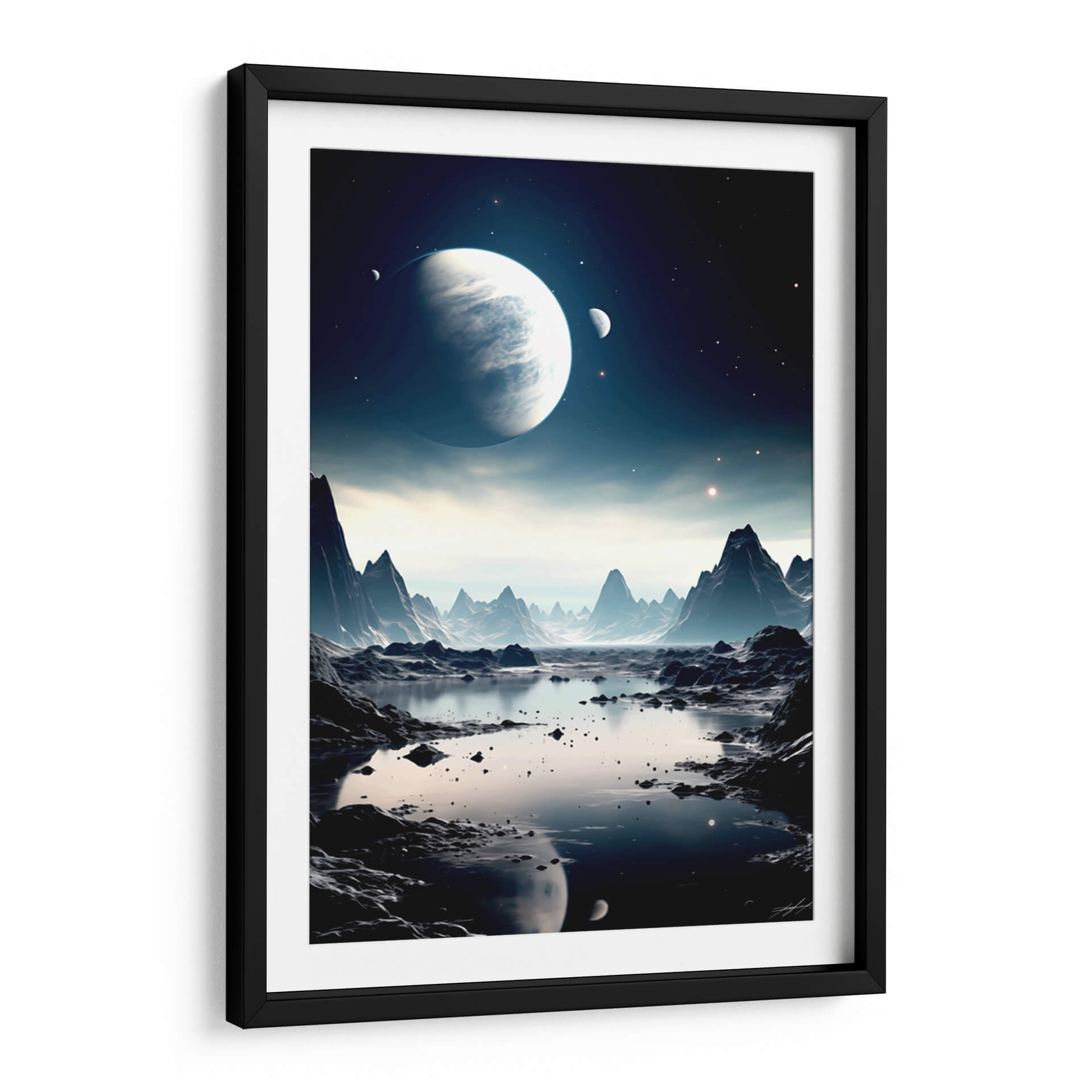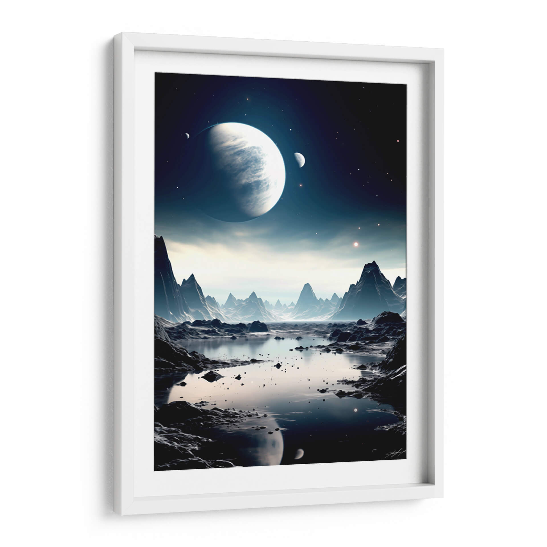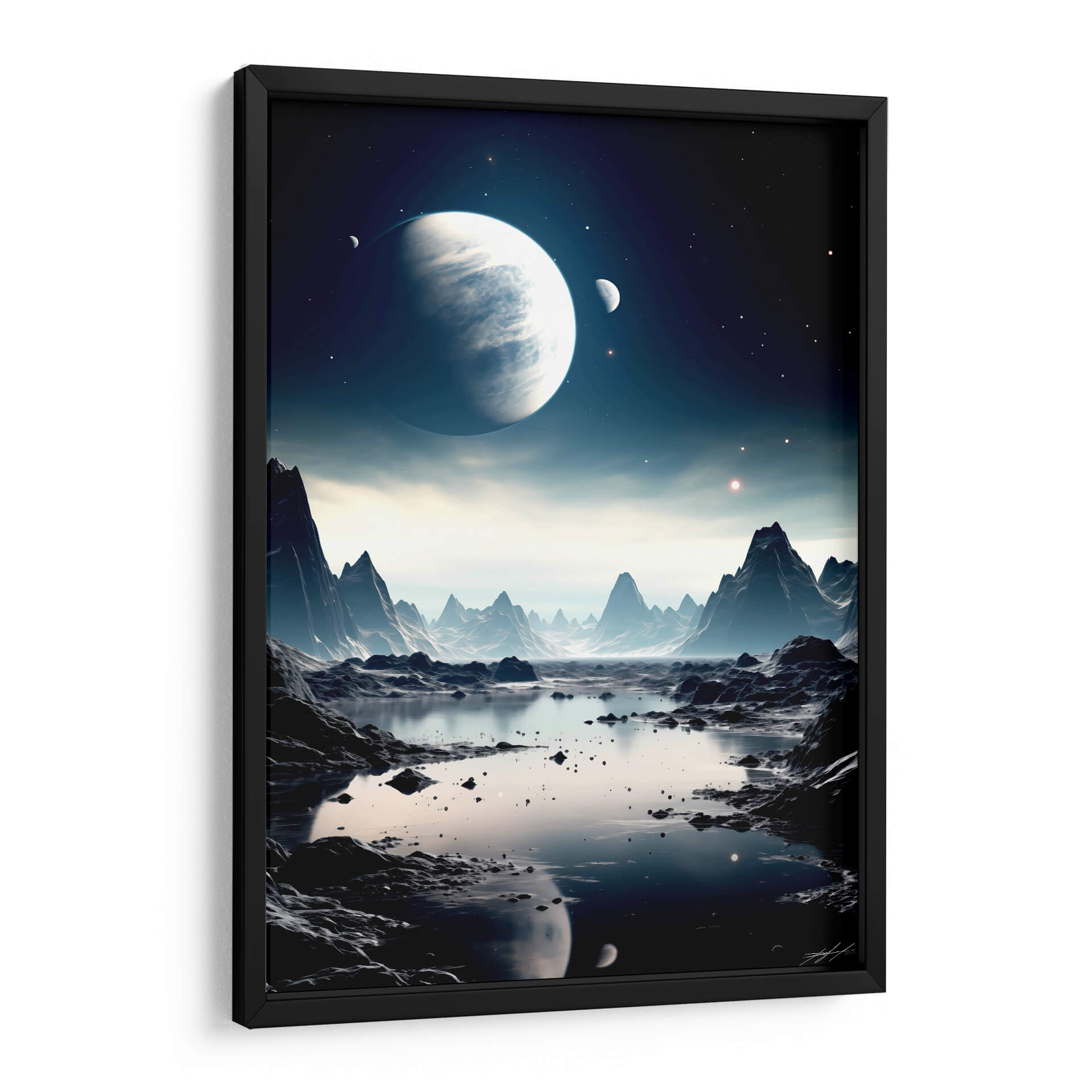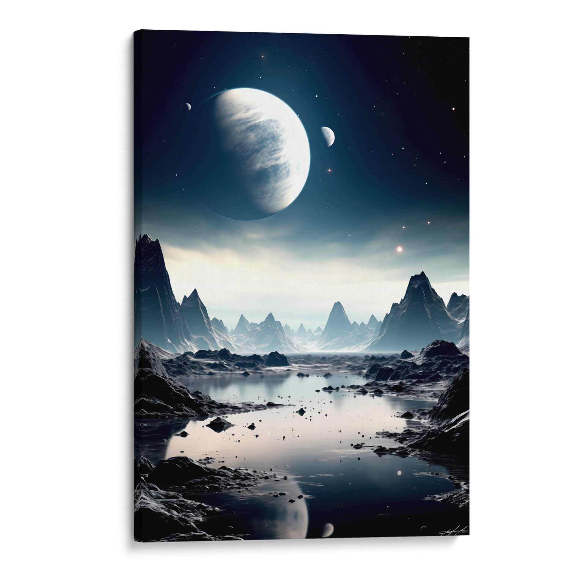 Embárquese en un viaje visual alucinante con "Mi Espacio - 3", una obra de arte digital que captura la majestuosidad de un paisaje alienígena bañado por la luz de lunas y planetas distantes. Esta pieza evoca una profunda sensación de misterio y asombro, transportando al espectador a un reino de fantasía y exploración cósmica. La paleta de colores, dominada por profundos azules, grises fríos y sutiles toques de luz estelar, crea una atmósfera serena pero enigmática. Las formaciones rocosas escarpadas y un sereno cuerpo de agua reflejan la inmensidad del cosmos, invitando a la contemplación. Este cuadro decorativo es ideal para quienes buscan añadir un toque de intriga y sofisticación a su hogar u oficina. Su composición detallada y su atmósfera envolvente lo convierten en un punto focal cautivador para cualquier sala de estar, estudio o dormitorio, transformando cualquier espacio en un portal a lo desconocido. "Mi Espacio - 3" no es solo una decoración, es una invitación a soñar y explorar los límites de la imaginación, perfecta para los amantes de la ciencia ficción y el arte contemporáneo.