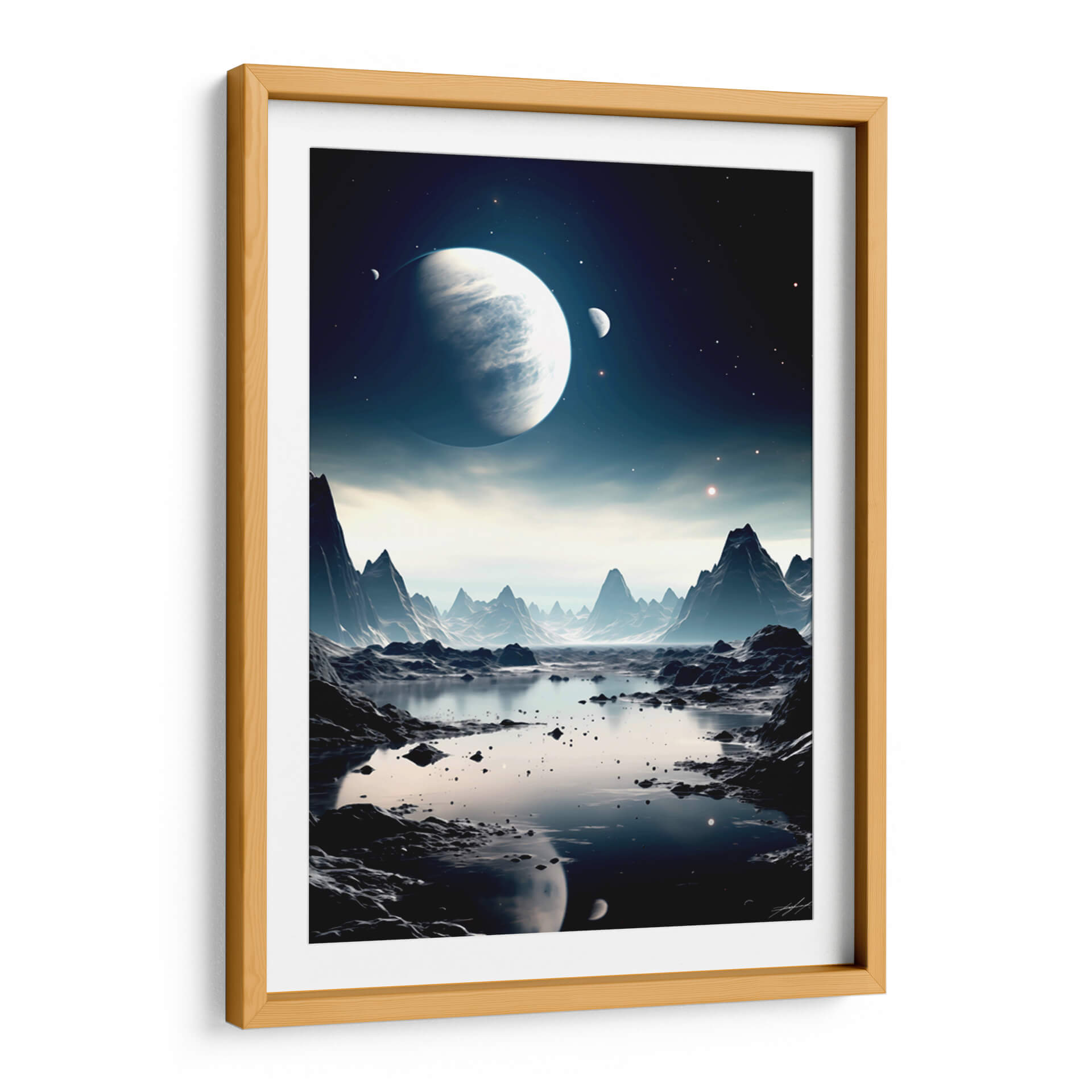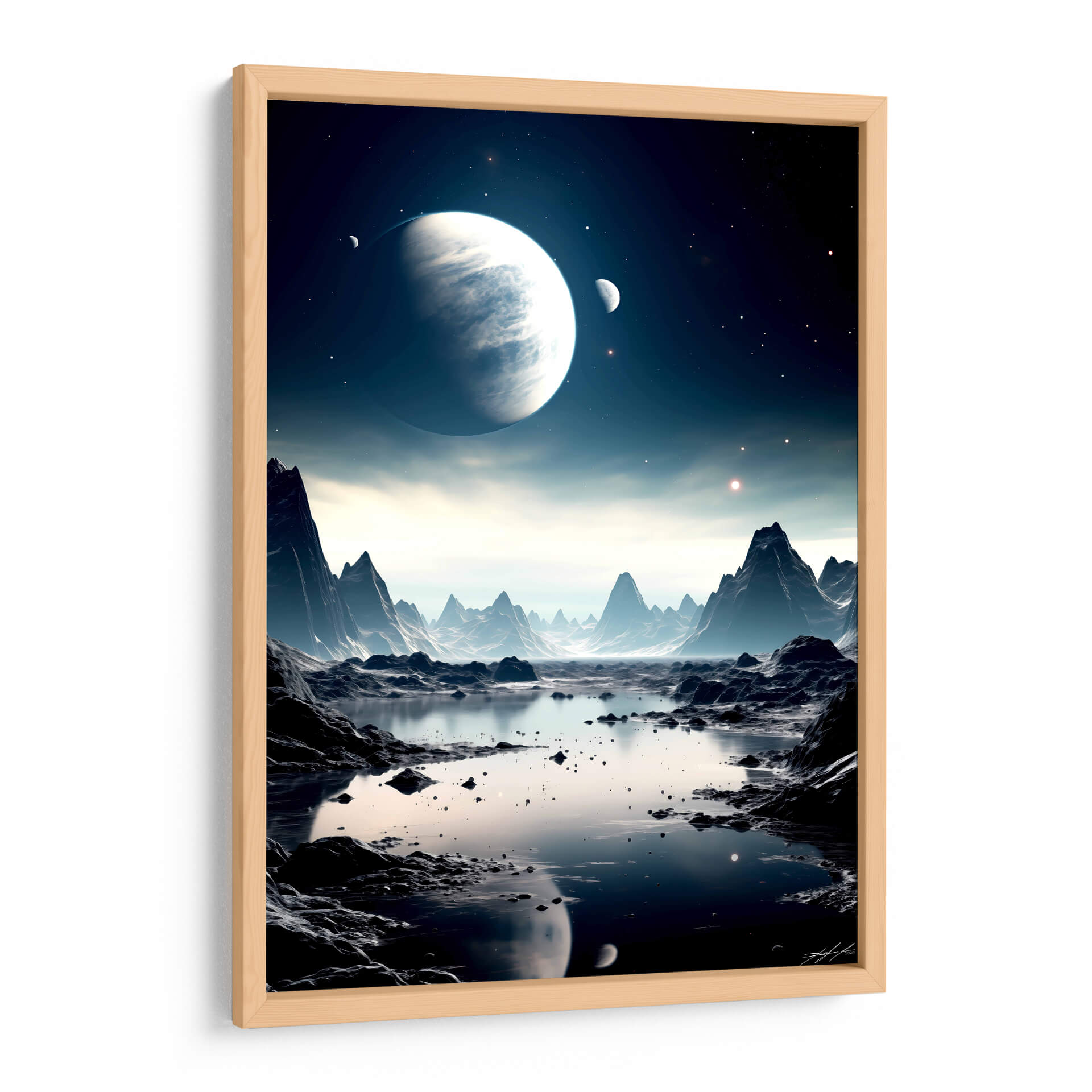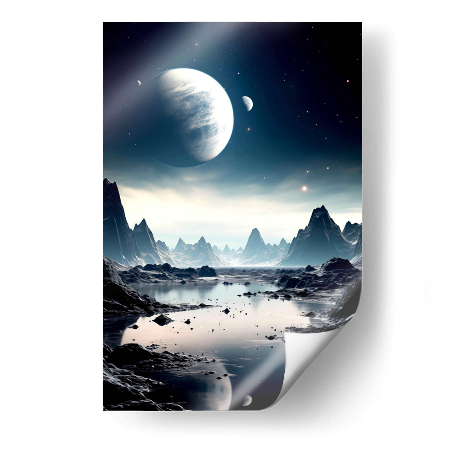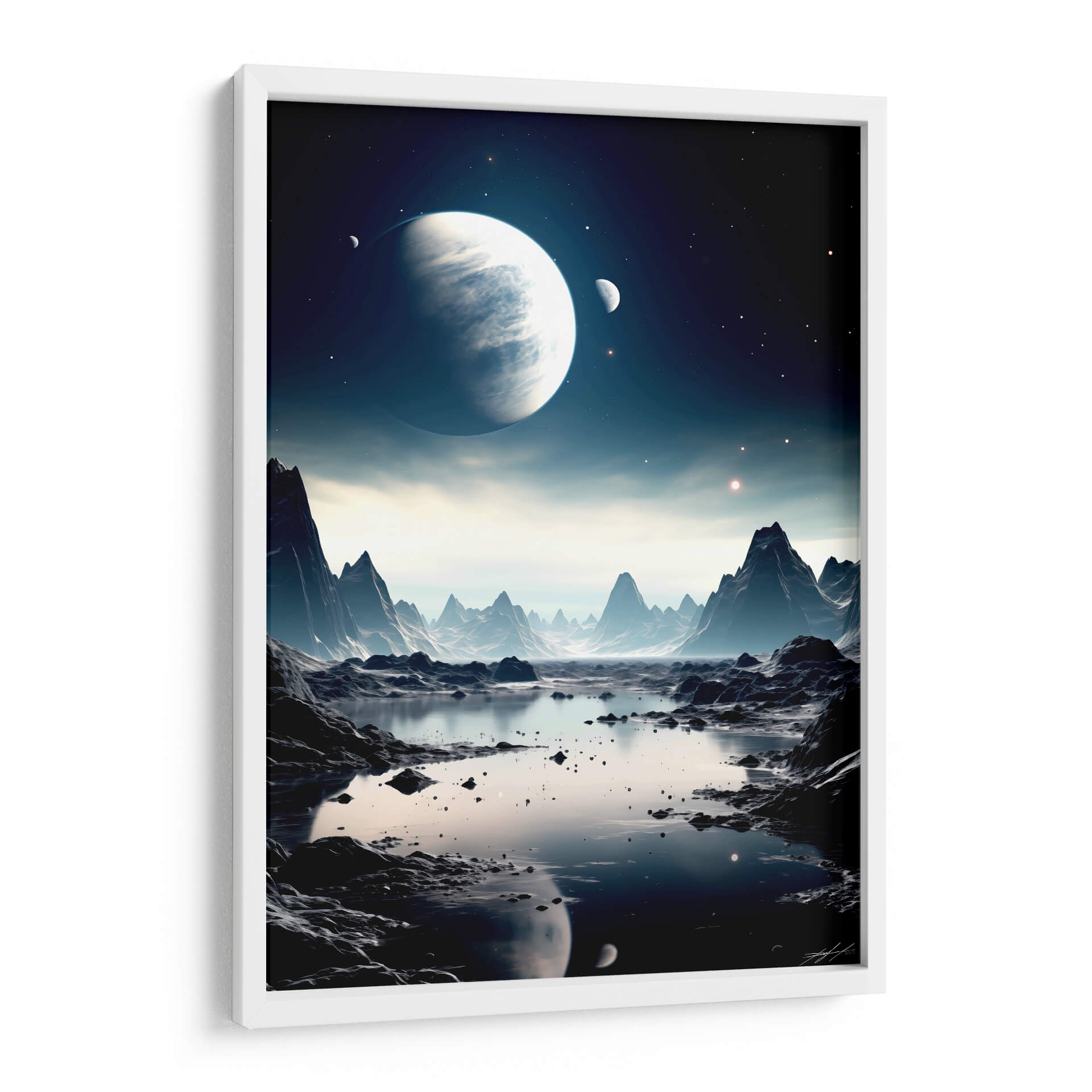 Embárquese en un viaje visual alucinante con "Mi Espacio - 3", una obra de arte digital que captura la majestuosidad de un paisaje alienígena bañado por la luz de lunas y planetas distantes. Esta pieza evoca una profunda sensación de misterio y asombro, transportando al espectador a un reino de fantasía y exploración cósmica. La paleta de colores, dominada por profundos azules, grises fríos y sutiles toques de luz estelar, crea una atmósfera serena pero enigmática. Las formaciones rocosas escarpadas y un sereno cuerpo de agua reflejan la inmensidad del cosmos, invitando a la contemplación. Este cuadro decorativo es ideal para quienes buscan añadir un toque de intriga y sofisticación a su hogar u oficina. Su composición detallada y su atmósfera envolvente lo convierten en un punto focal cautivador para cualquier sala de estar, estudio o dormitorio, transformando cualquier espacio en un portal a lo desconocido. "Mi Espacio - 3" no es solo una decoración, es una invitación a soñar y explorar los límites de la imaginación, perfecta para los amantes de la ciencia ficción y el arte contemporáneo.