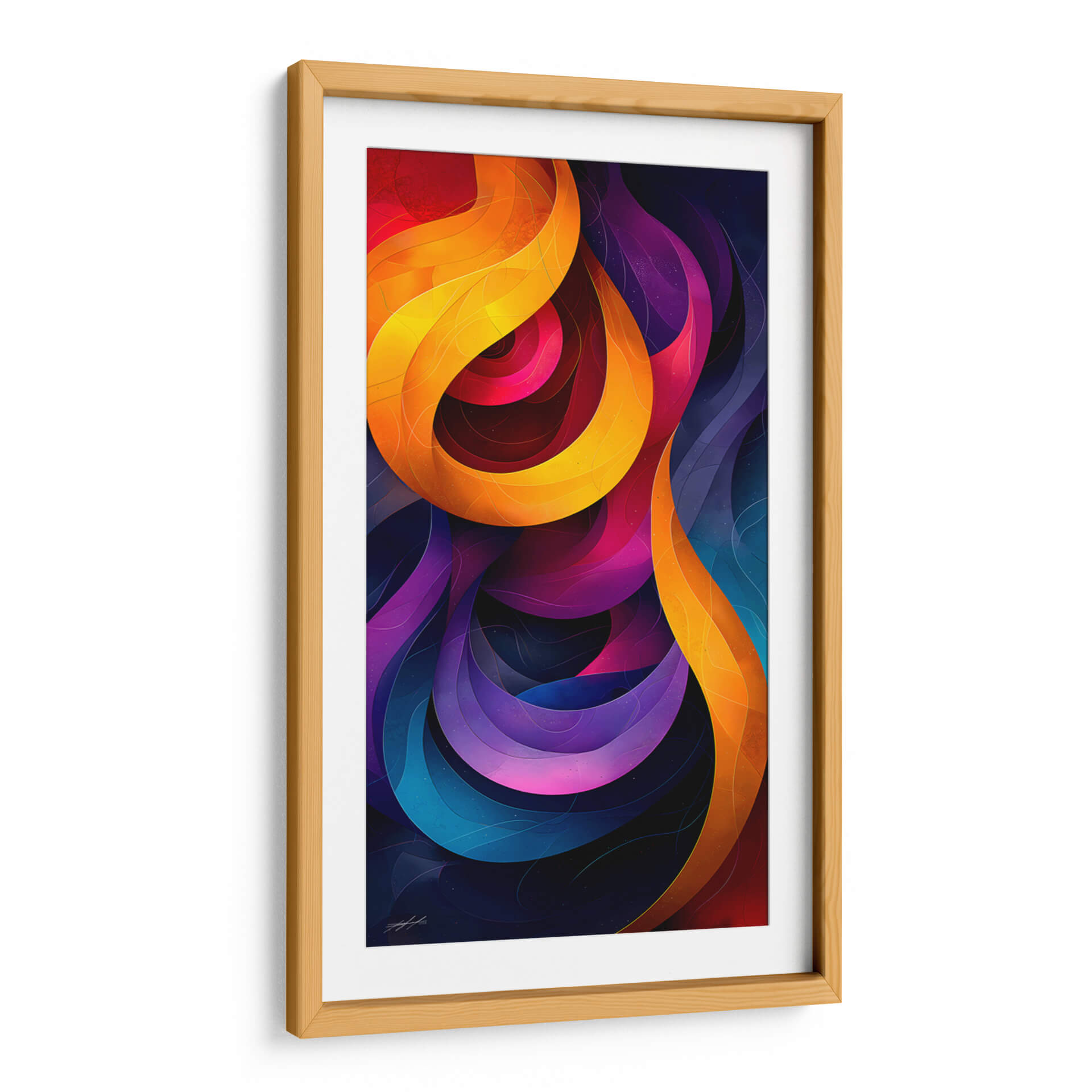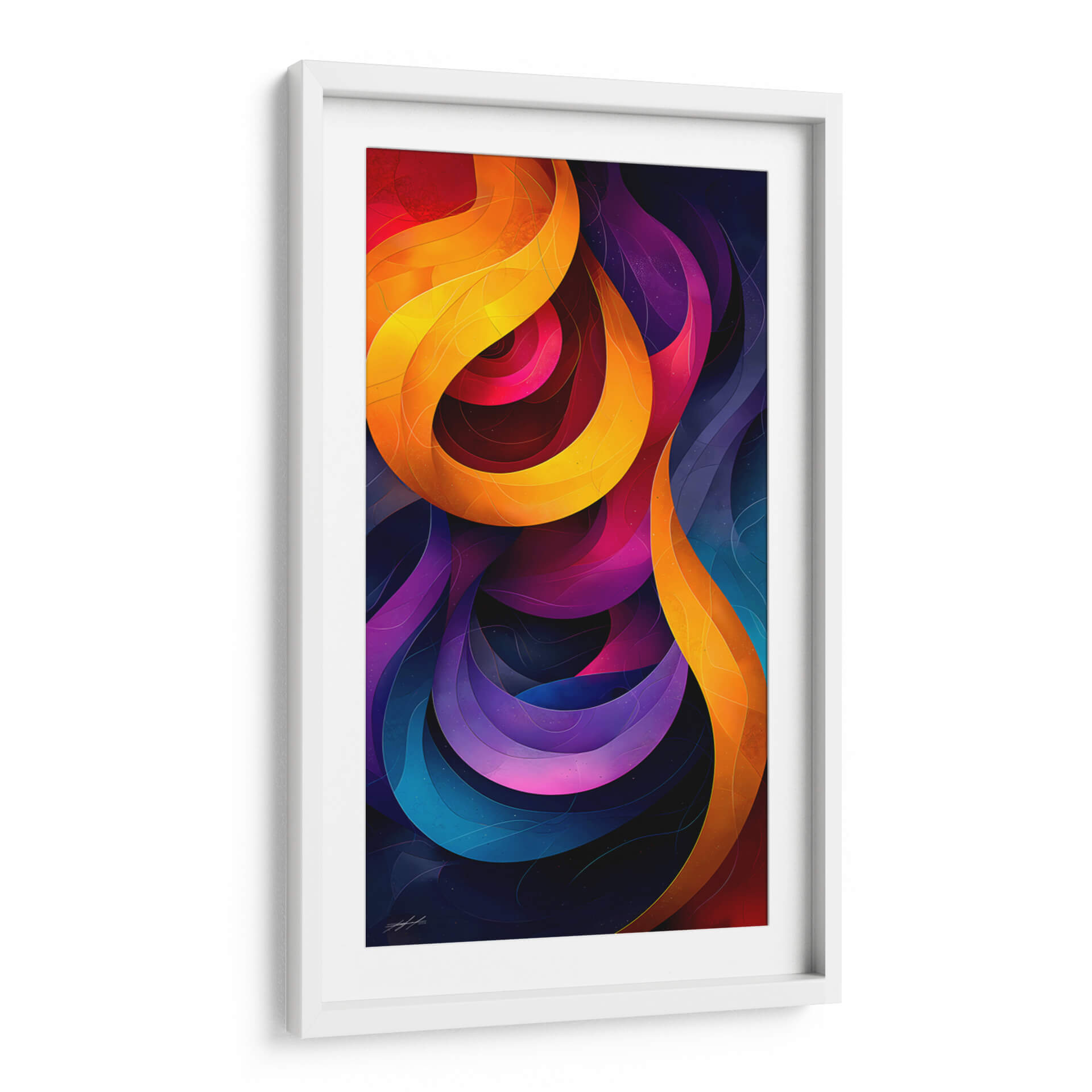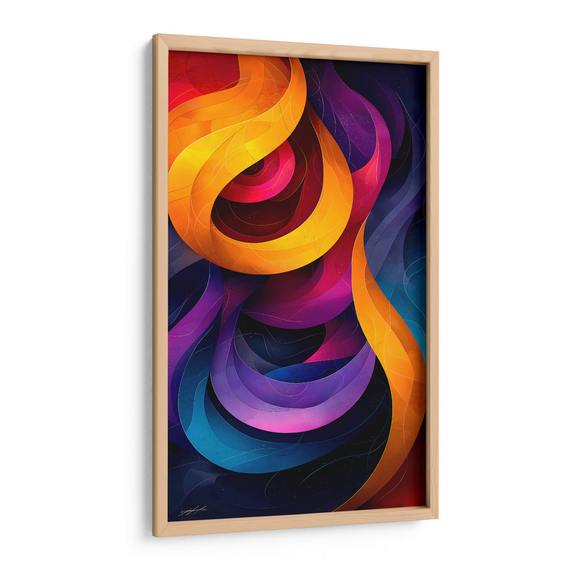 Sumérgete en la profundidad cósmica y la energía vibrante de 'Mi Universo Abstracto - 5', una obra de arte digital que trasciende lo ordinario. Este cuadro decorativo abstracto cautiva con sus formas fluidas y entrelazadas que recuerdan a nebulosas celestiales y a la intrincada danza de la vida. La paleta de colores es un espectáculo visual, transitando desde los cálidos y enérgicos naranjas y amarillos hasta los profundos y misteriosos púrpuras, azules y rojos. Cada curva y pliegue está bañado en una luz que sugiere movimiento y dinamismo, creando una sensación de profundidad inigualable. Las sutiles texturas y los diminutos puntos brillantes esparcidos por el fondo oscuro evocan un cielo estrellado, invitando a la contemplación y la imaginación. "Mi Universo Abstracto - 5" es más que una pieza decorativa; es una ventana a un cosmos personal, una explosión de creatividad que transformará cualquier espacio. Ideal para salones modernos, oficinas creativas o cualquier lugar donde se desee añadir un toque de sofisticación y un punto focal que despierte conversaciones. Este lienzo abstracto es la elección perfecta para quienes buscan una decoración de pared que sea a la vez impactante y evocadora, añadiendo un toque de arte contemporáneo que resuene con tu individualidad.