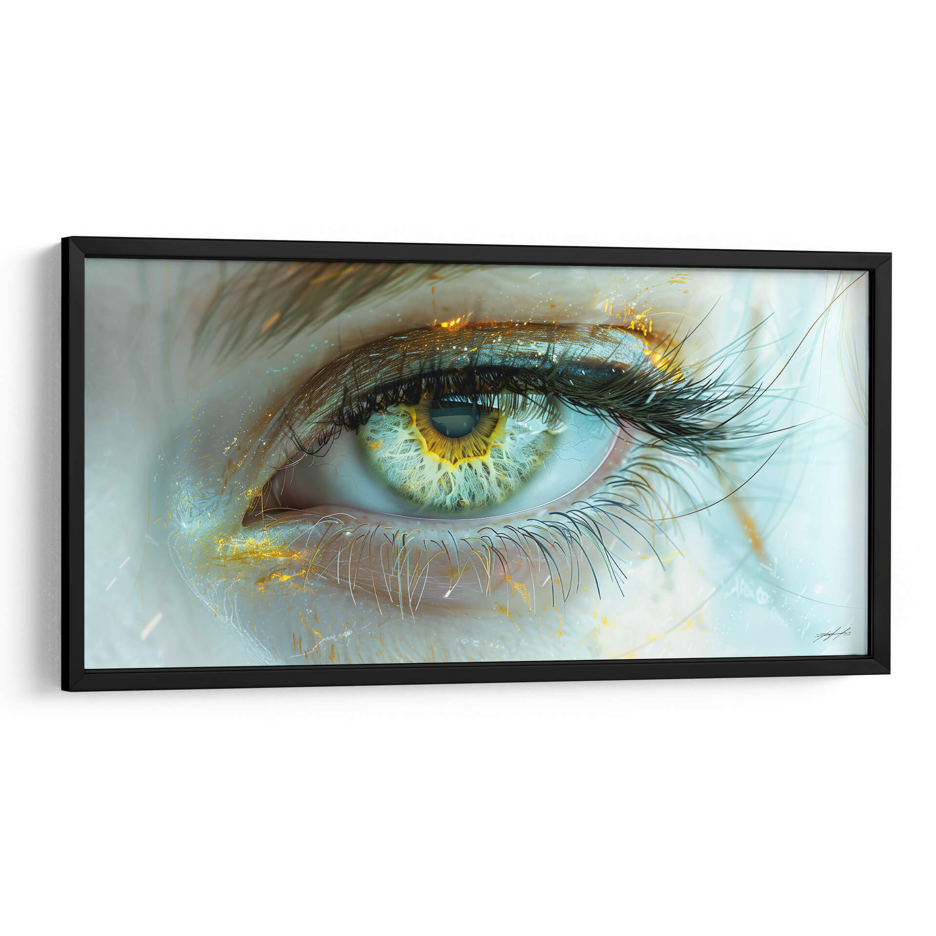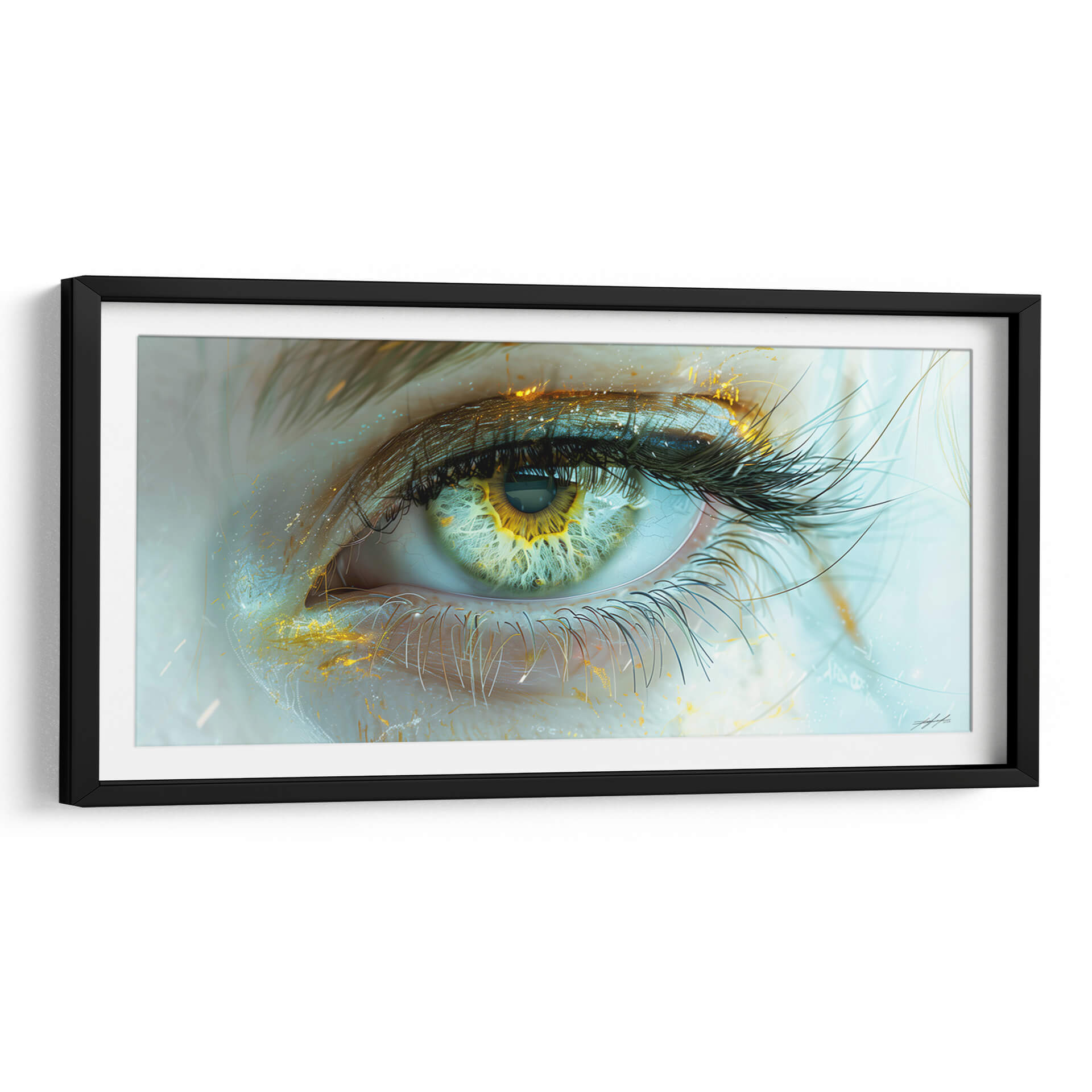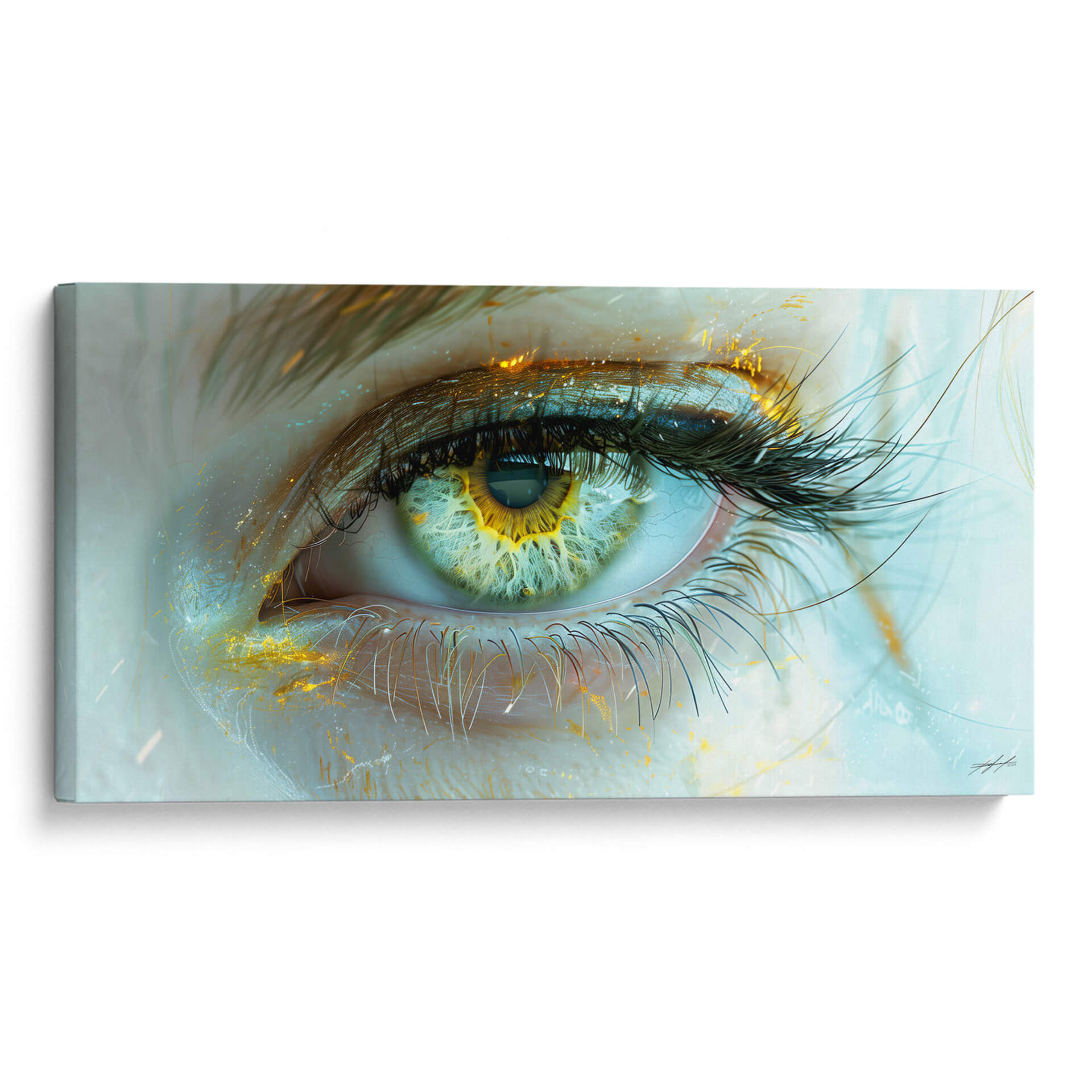 Sumérgete en la intensidad de "MÍRAME - 5", una obra de arte contemporáneo que captura la esencia de la mirada humana con un detalle hipnótico. Este cuadro decorativo presenta un primer plano extremo de un ojo, donde el iris se despliega en un caleidoscopio de tonos verdes y amarillos, salpicado de destellos dorados que evocan polvo de estrellas o destellos de magia. Las pestañas, largas y definidas, enmarcan la profundidad de la pupila, creando una conexión directa y poderosa con el espectador. La paleta de colores se centra en contrastes vibrantes, con azules pálidos y blancos etéreos que aportan un toque de serenidad y misterio, equilibrando la energía del iris. La composición es audaz y minimalista, enfocándose en un solo elemento para maximizar su impacto visual. "MÍRAME - 5" es perfecto para añadir un toque de intriga y sofisticación a cualquier espacio, ya sea una sala de estar moderna, un estudio personal o una oficina. Esta pieza invita a la reflexión y a la introspección, convirtiéndose en un punto focal que inspira conversaciones y admiración. Su estilo digital y detallado lo hace ideal para quienes buscan arte moderno y cautivador que destaque en cualquier decoración.
