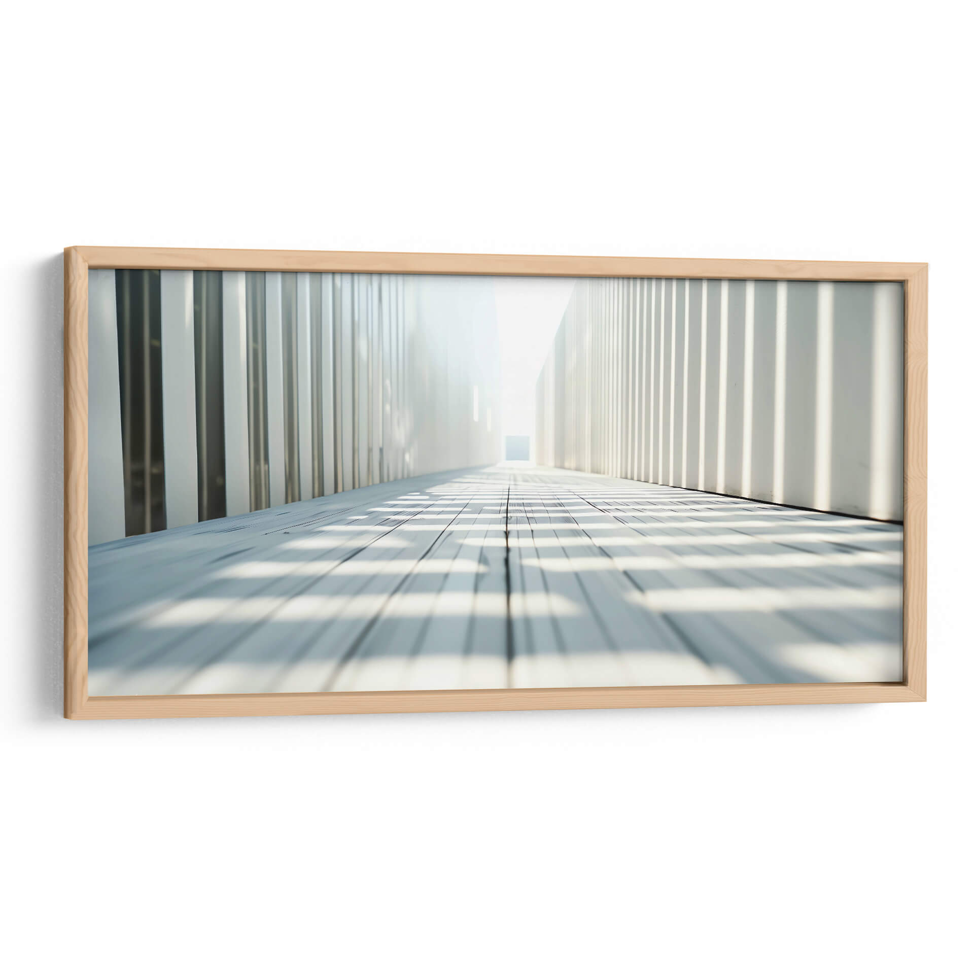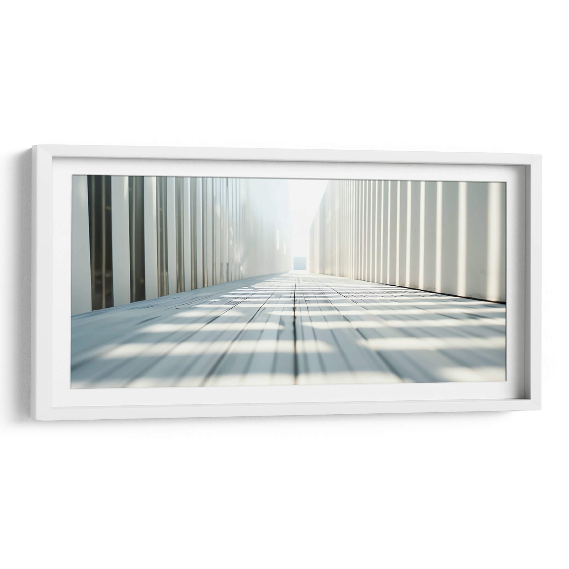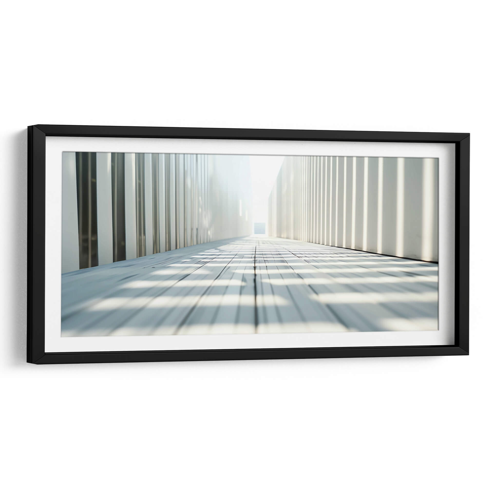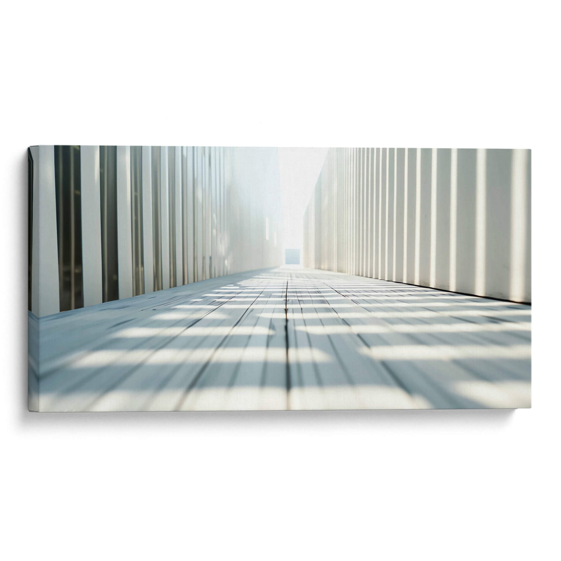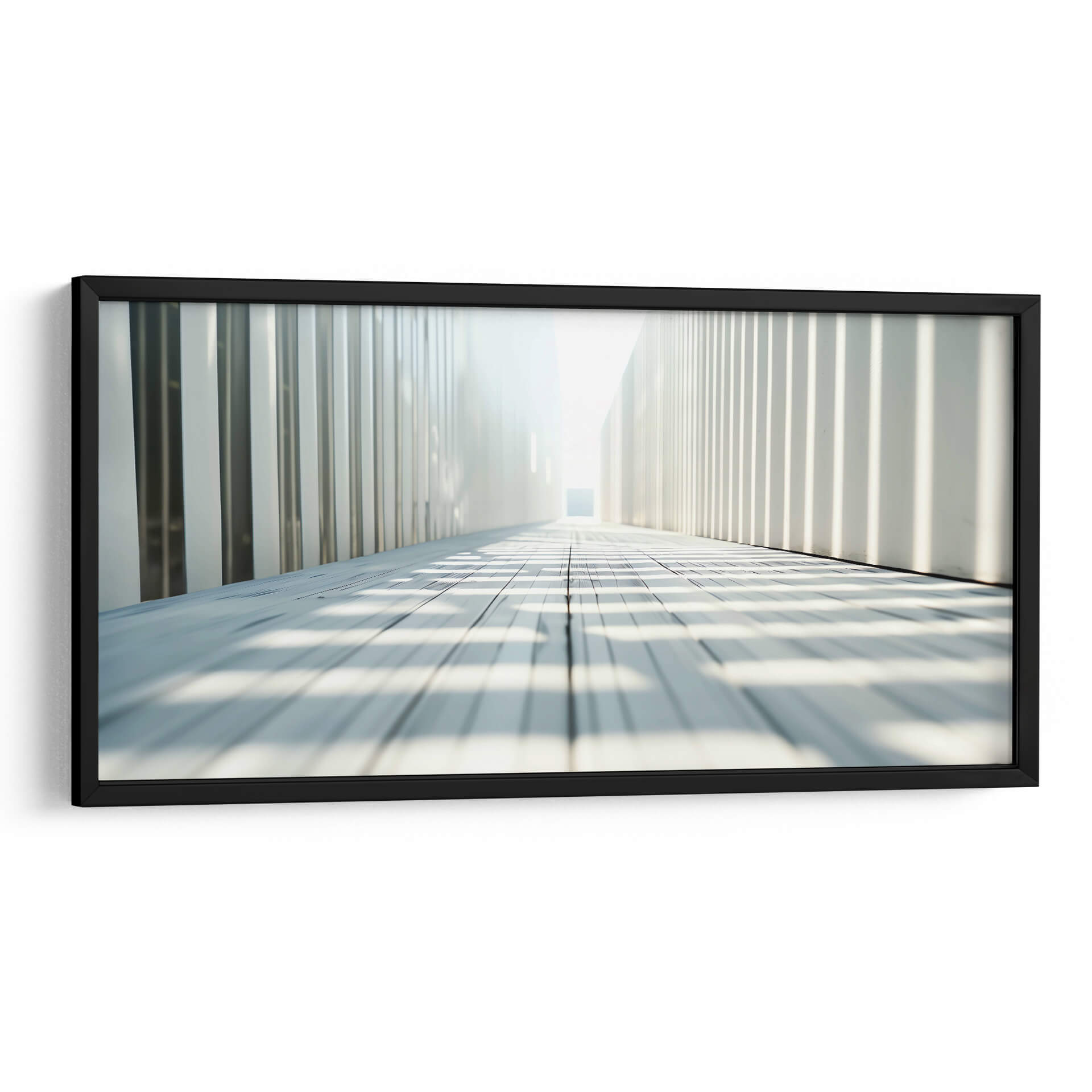 Sumérgete en la perspectiva cautivadora de "Movimiento - Blanco - 1", una obra de arte digital que te transporta a través de un pasillo de líneas arquitectónicas y juegos de luces. La composición, dominada por una paleta de blancos y grises sutiles, crea una atmósfera de calma y serenidad, invitando a la contemplación. Las sombras proyectadas sobre el suelo de madera añaden profundidad y un ritmo visual que evoca la sensación de avance y flujo, como su título sugiere. Este cuadro decorativo minimalista es perfecto para espacios que buscan una declaración de estilo discreta pero impactante. Su diseño lineal y la luz etérea lo convierten en una pieza ideal para oficinas modernas, recibidores o incluso un dormitorio que aspire a la paz y la claridad. "Movimiento - Blanco - 1" no es solo una imagen, es una invitación a explorar la belleza de las formas y la luz en el arte contemporáneo, añadiendo una dimensión de sofisticación y tranquilidad a tu decoración. Transforma tu pared en una ventana hacia la abstracción serena y el diseño geométrico depurado.