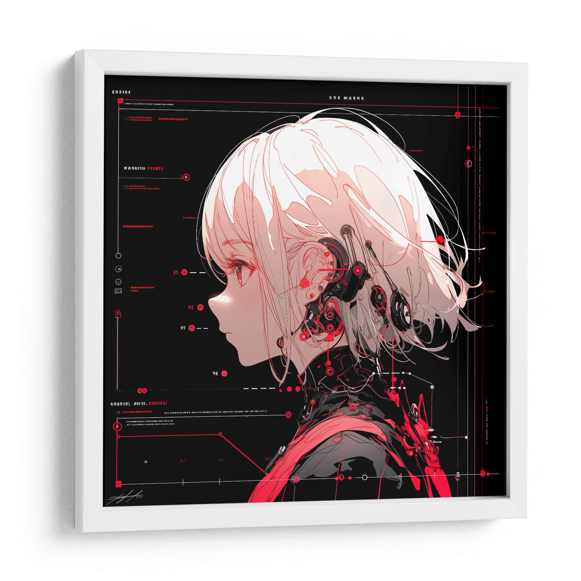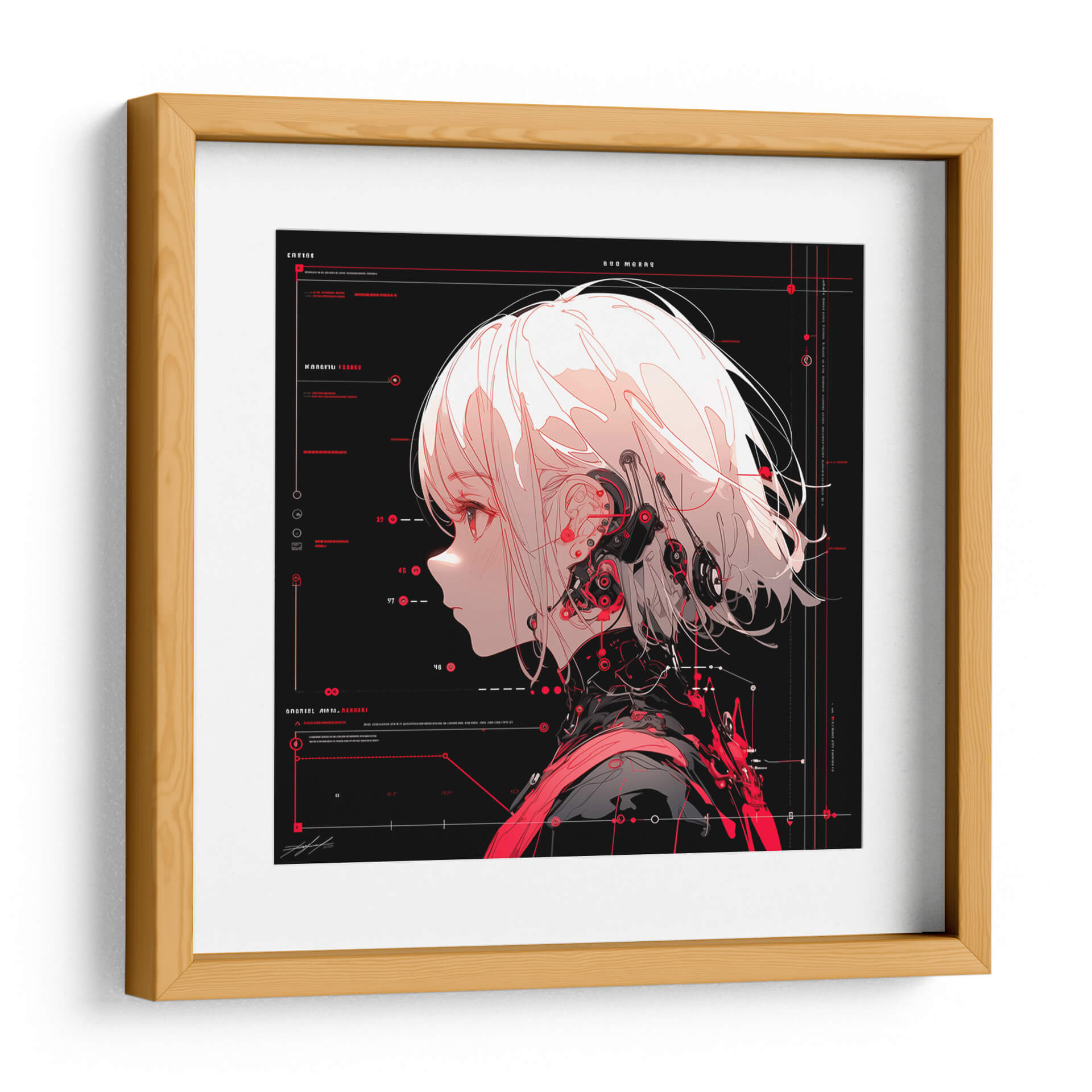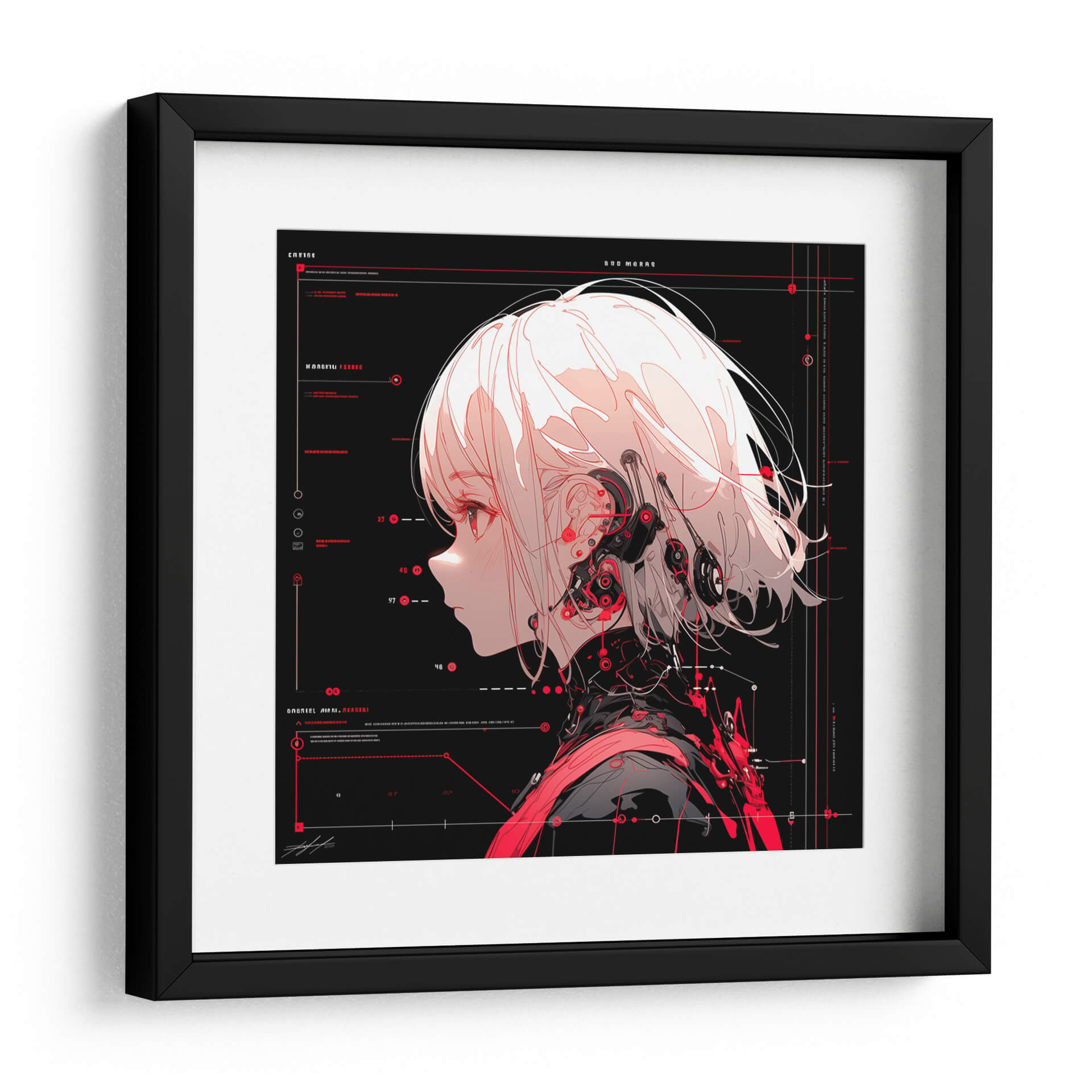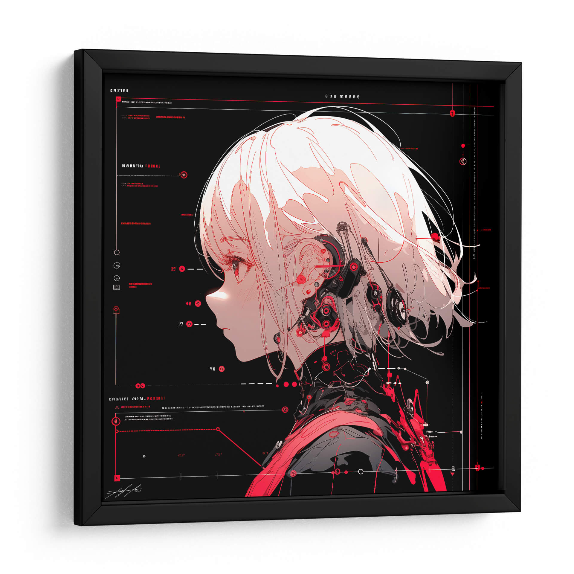 Sumérgete en el futuro con "Plano Anime - 2", una obra de arte digital que fusiona la estética del anime con elementos de ciencia ficción y tecnología. La pieza presenta el perfil de un personaje de anime con cabello blanco y ojos expresivos, adornado con intrincados detalles cibernéticos en su cabeza y cuello, resaltados en un vibrante tono rojo contra un fondo negro profundo. Las líneas de datos, diagramas y marcadores numéricos que rodean al personaje añaden una capa de complejidad y misterio, evocando un universo de información y conexión digital. Este cuadro decorativo es perfecto para añadir un toque vanguardista y distintivo a cualquier espacio moderno, ya sea una oficina, un estudio o una sala de estar. Su paleta de colores limitada pero impactante, dominada por el rojo, negro y blanco, crea un contraste visual fuerte que atrae la mirada y genera intriga. "Plano Anime - 2" no es solo una imagen, es una invitación a explorar la intersección entre lo humano y lo tecnológico, ideal para los amantes del arte contemporáneo, la cultura pop y los diseños futuristas. Transforma tu pared con esta pieza única que inspira conversación y refleja un estilo audaz y contemporáneo.