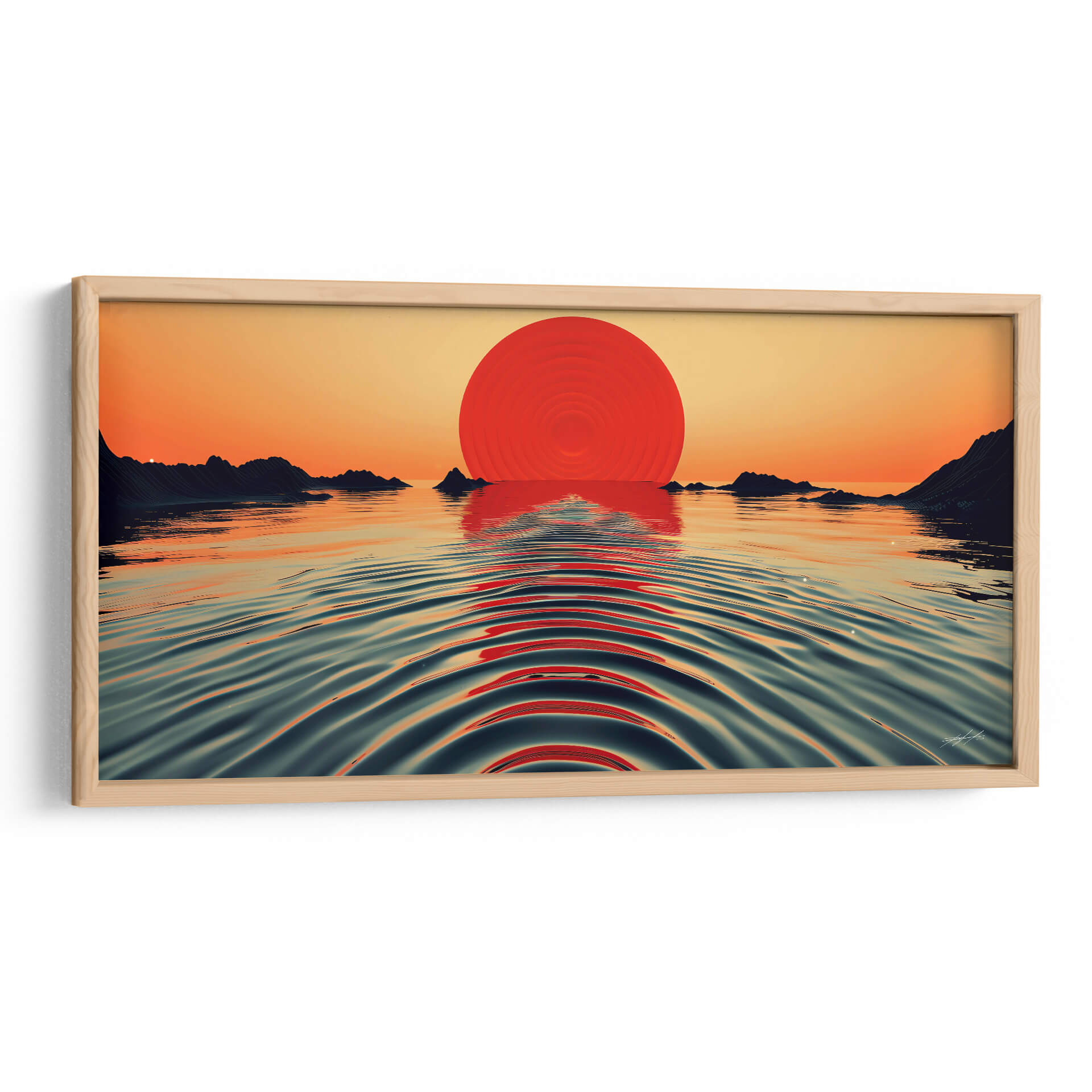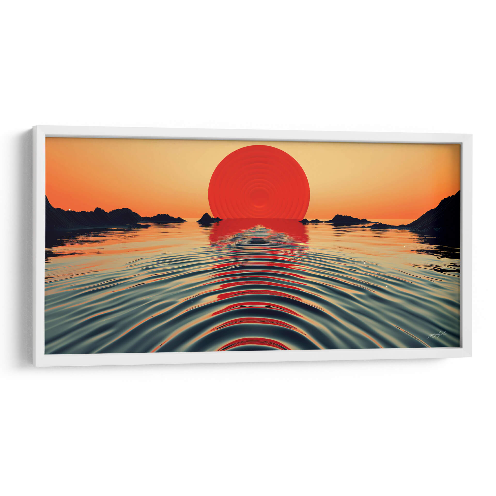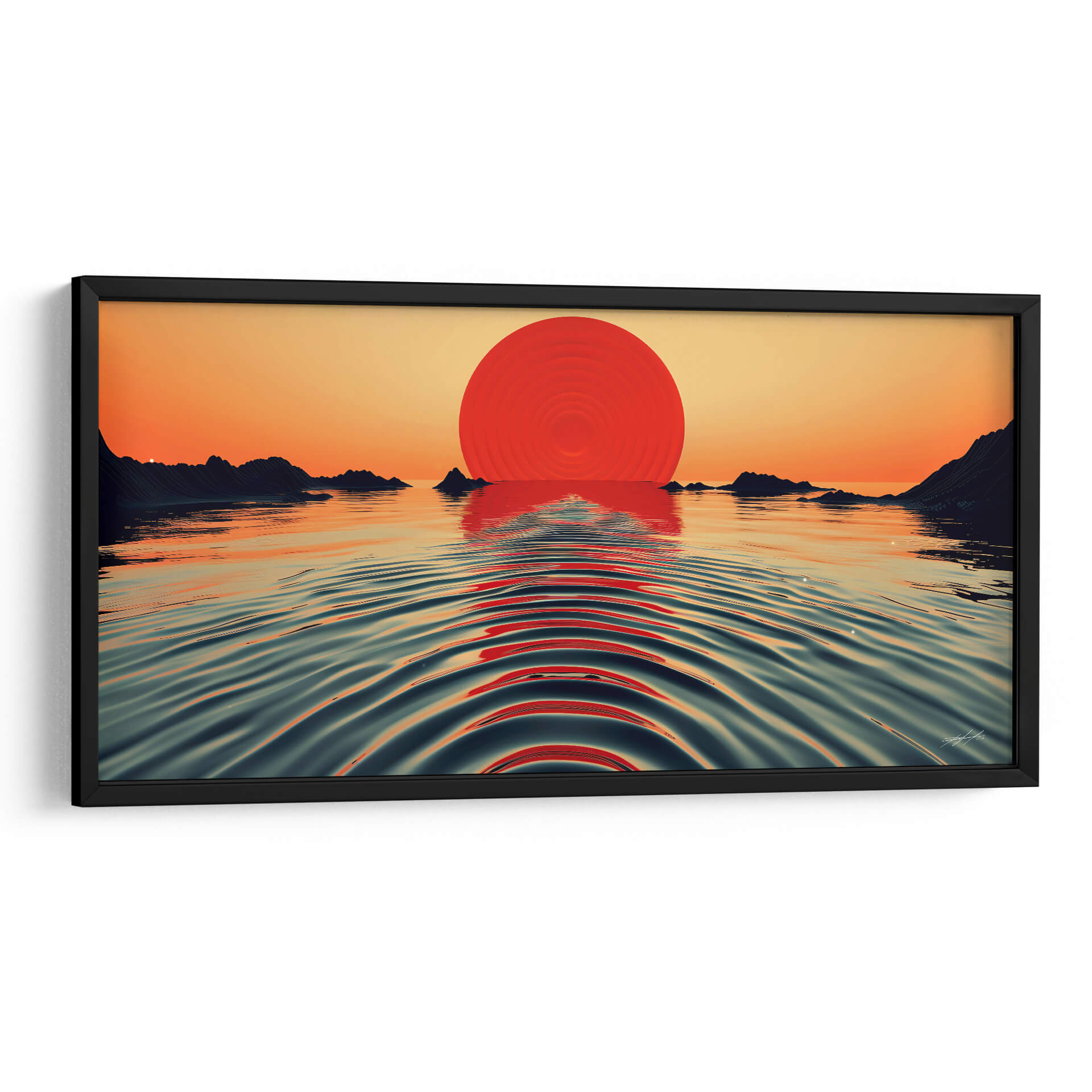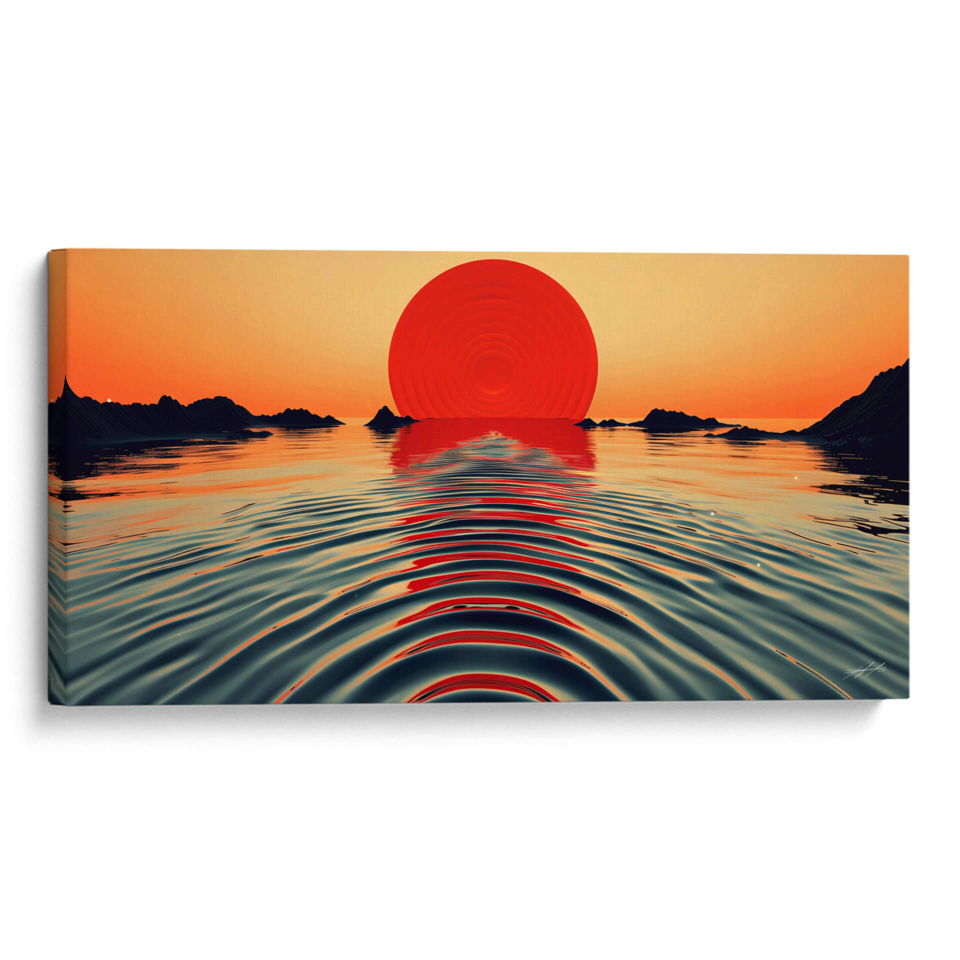 Sumérgete en la serenidad de "Sereno - 5", una obra de arte contemporáneo que captura la esencia de un atardecer en calma. Este cuadro decorativo presenta un sol rojo vibrante y estilizado, cuya luz se refleja en un mar sereno, creando ondas hipnóticas que parecen emanar del centro de la composición. Las siluetas oscuras de las montañas o islas en el horizonte contrastan con el degradado cálido del cielo, que va desde un naranja intenso hasta un amarillo suave. La paleta de colores, dominada por tonos cálidos y fríos contrastantes, genera una atmósfera de paz y contemplación. Las texturas suaves y fluidas del agua y el cielo invitan a la meditación, haciendo de esta pieza una adición perfecta para cualquier espacio que busque transmitir tranquilidad y elegancia. Ideal para salones modernos, dormitorios o incluso oficinas que necesiten un toque de calma visual. "Sereno - 5" no es solo una imagen, es una invitación a desconectar y encontrar tu propio espacio de paz. Su diseño minimalista y potente lo convierte en un punto focal cautivador, capaz de transformar la atmósfera de cualquier habitación.