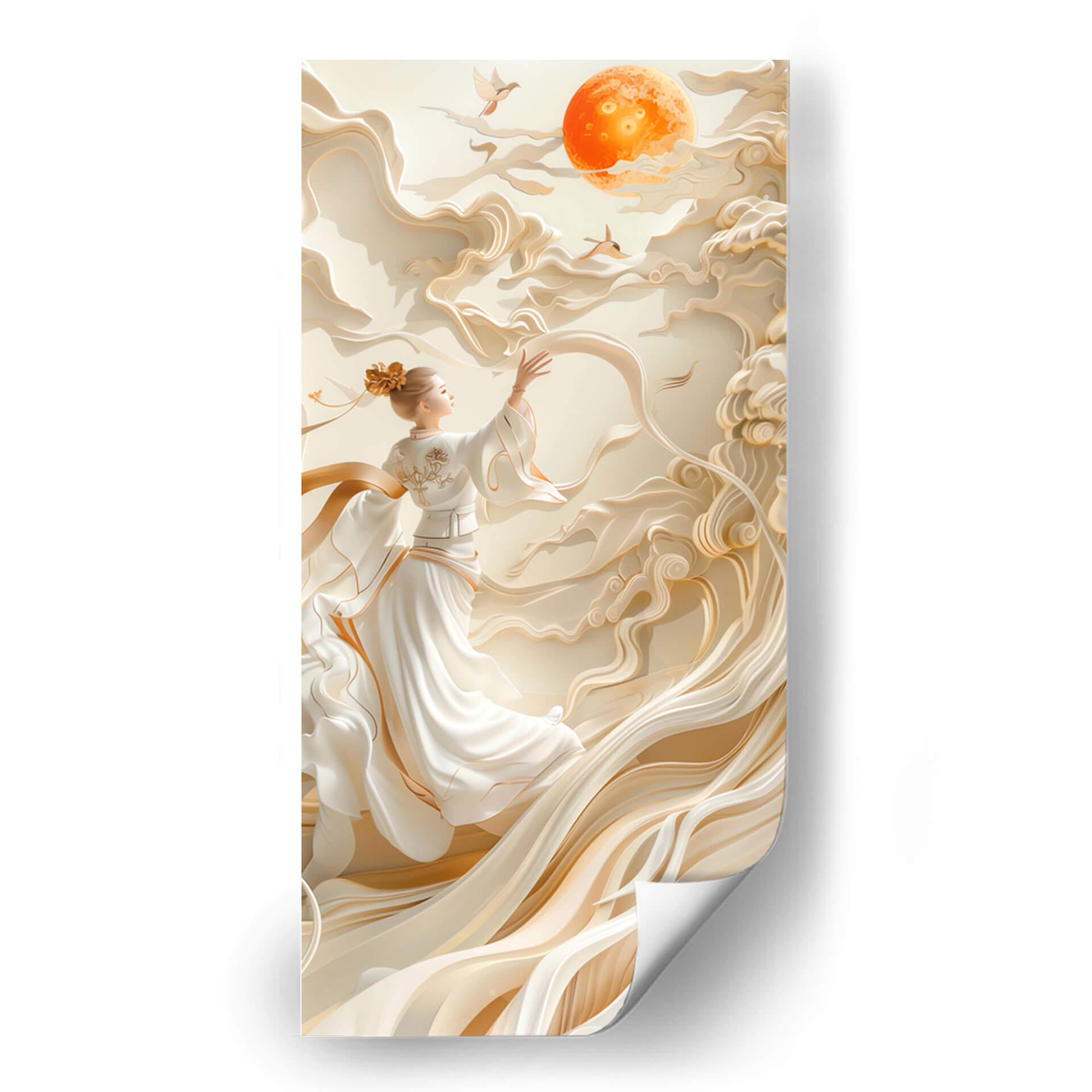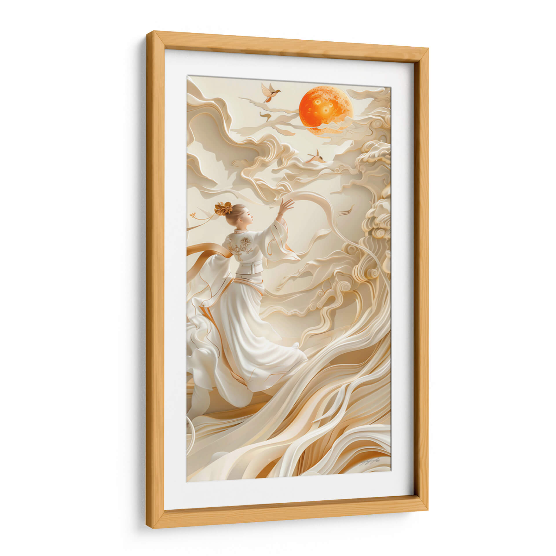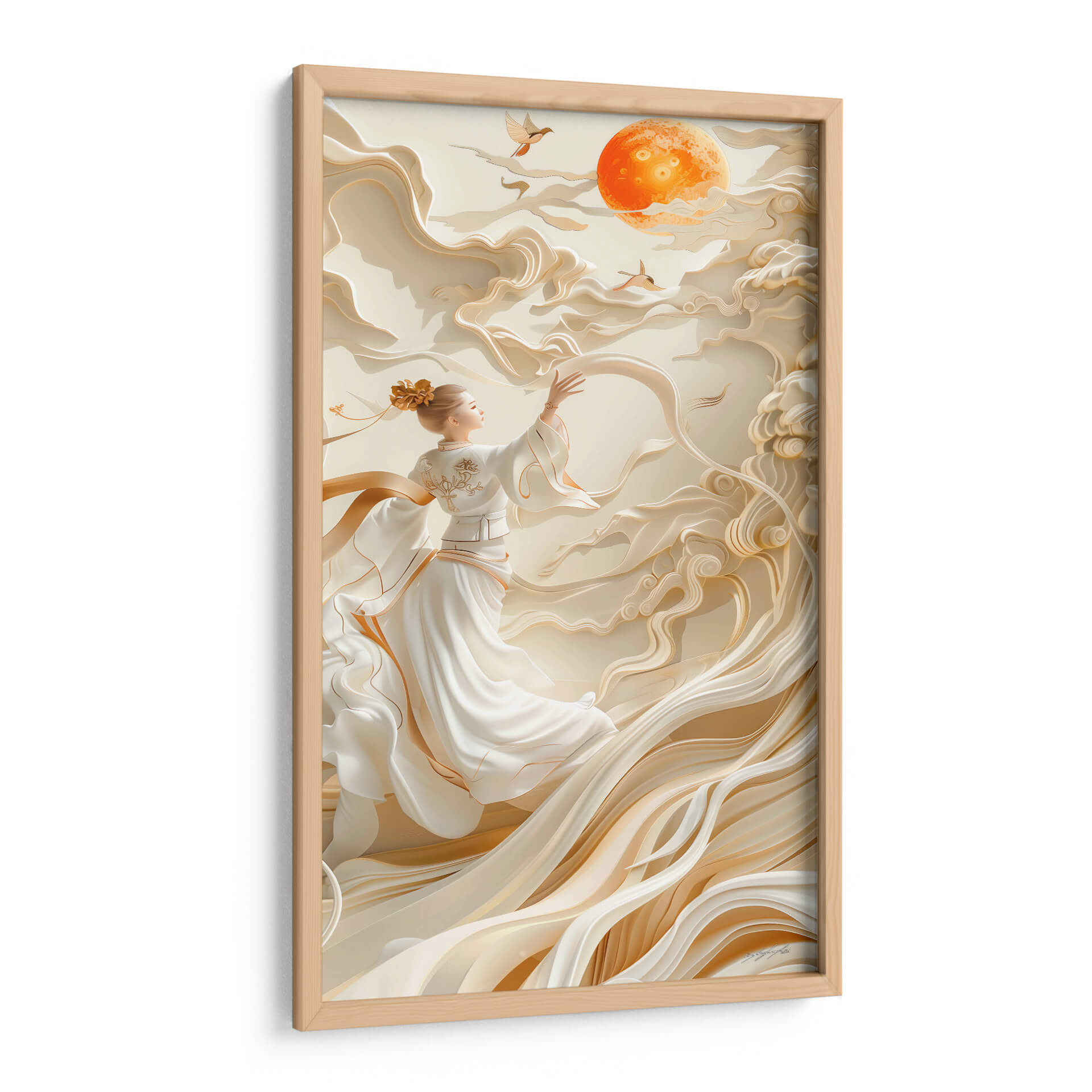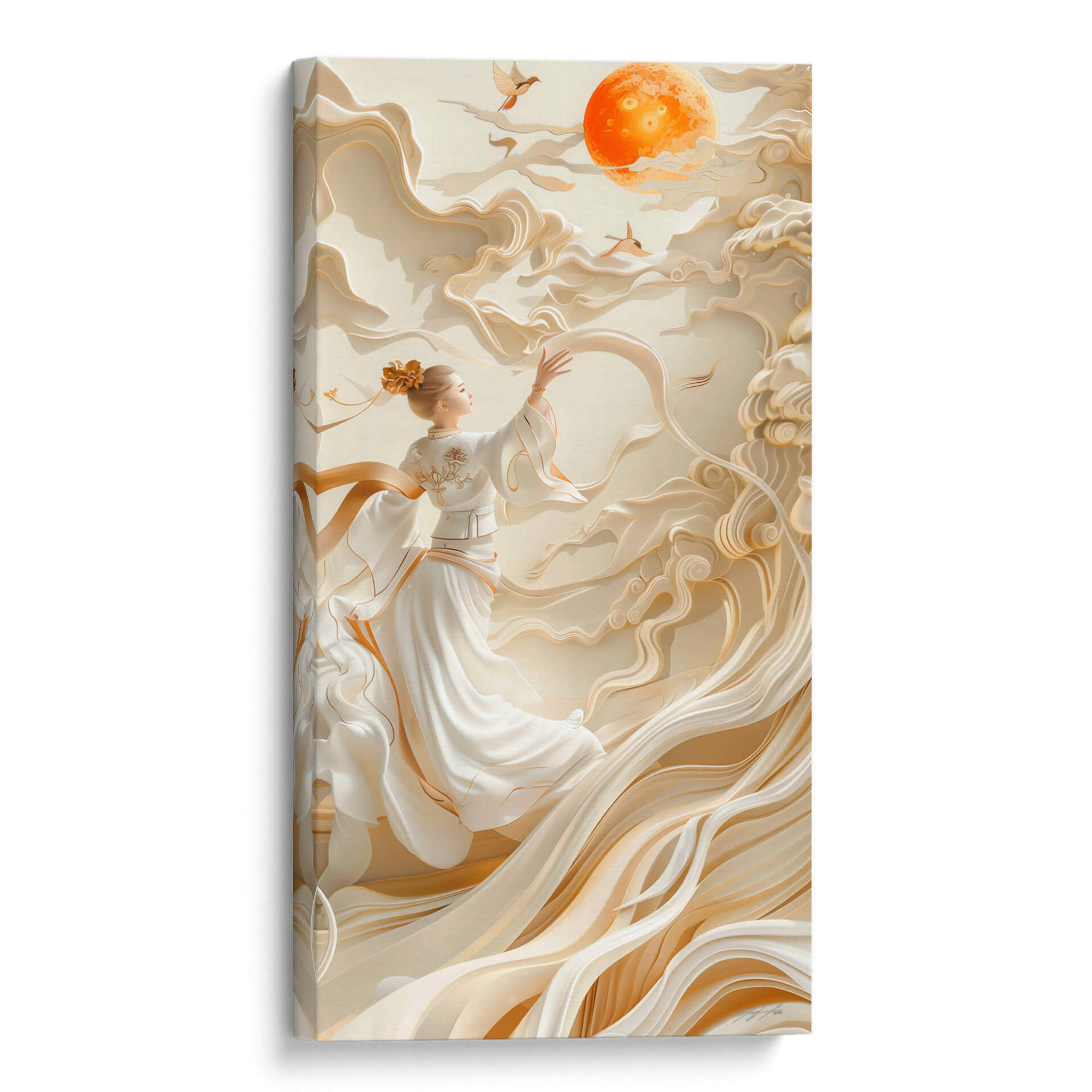 Sumérgete en la serenidad y el misterio del 'Sueño Oriental - 3', una obra de arte que evoca la gracia y la delicadeza de la cultura oriental. La pieza presenta una figura femenina etérea vestida con túnicas blancas fluidas, adornadas con sutiles toques dorados. Se encuentra rodeada de formas abstractas que imitan nubes o telas vaporosas, creando una atmósfera onírica y pacífica. La paleta de colores, dominada por tonos beige, crema y acentos dorados, aporta una sensación de calidez y sofisticación. El sol anaranjado brillante en el cielo, junto con dos pájaros en vuelo, añade un toque de vitalidad y simbolismo, sugiriendo aspiración o libertad. Este cuadro decorativo es perfecto para añadir un punto de calma y elegancia a cualquier espacio, ya sea un dormitorio, un salón o un estudio. Su estilo contemporáneo con influencias orientales lo convierte en una pieza versátil que complementará decoraciones modernas y minimalistas, aportando profundidad y un toque de ensueño. Ideal para quienes buscan arte que inspire tranquilidad y belleza, 'Sueño Oriental - 3' es una invitación a la contemplación y al bienestar en tu hogar.