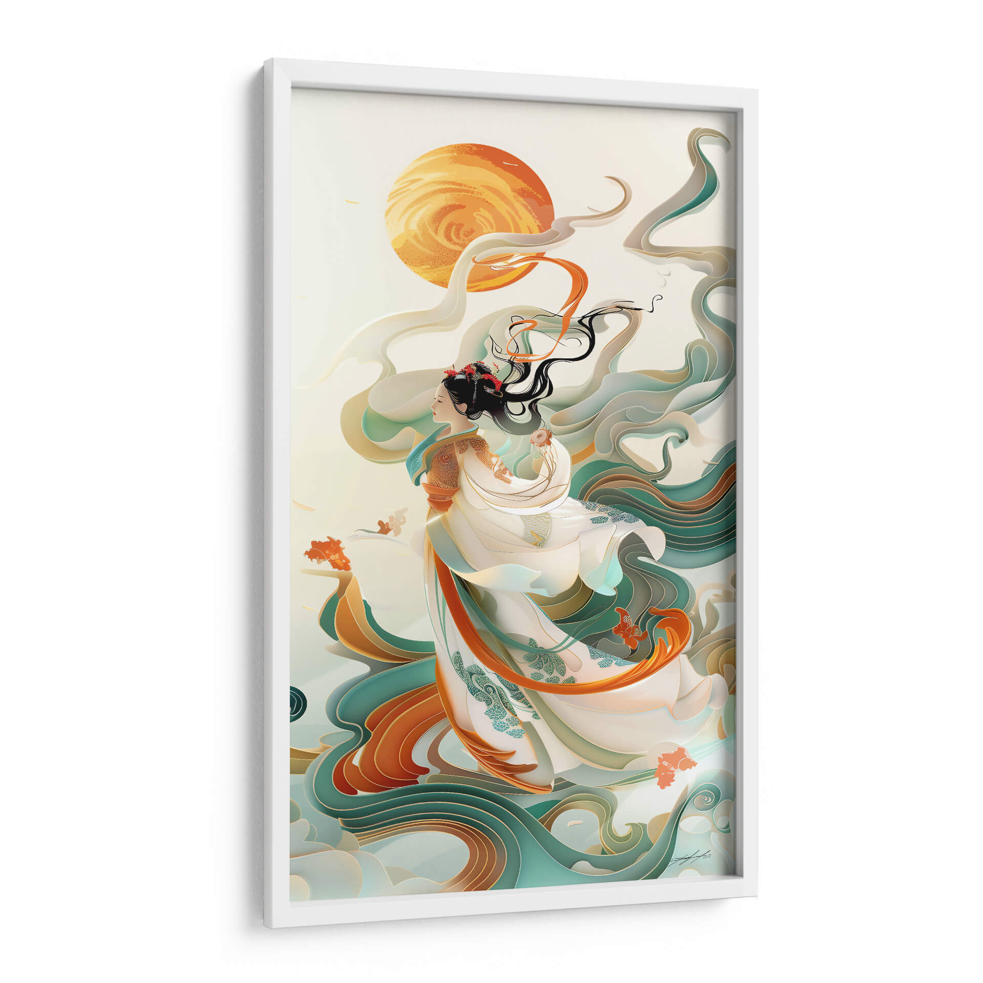 Sumérgete en la serena belleza de "Sueño Oriental - 4", una obra de arte digital que captura la esencia mística y la gracia de la cultura oriental. Esta pieza presenta una figura femenina etérea vestida con ropajes fluidos y adornados, moviéndose en un entorno onírico de volutas abstractas y un sol radiante. Los colores, una armoniosa mezcla de tonos tierra, verdes azulados suaves y vibrantes acentos anaranjados, crean una atmósfera de calma y ensueño. El estilo, que fusiona elementos tradicionales con una estética contemporánea y un toque de surrealismo, convierte a este cuadro decorativo en una adición cautivadora para cualquier espacio. Ideal para quienes buscan infundir sus hogares u oficinas con una sensación de paz, elegancia y una conexión con lo místico. "Sueño Oriental - 4" no es solo una imagen, sino una invitación a la contemplación y un punto focal que atraerá todas las miradas, aportando un toque de sofisticación y espiritualidad a tu decoración.
