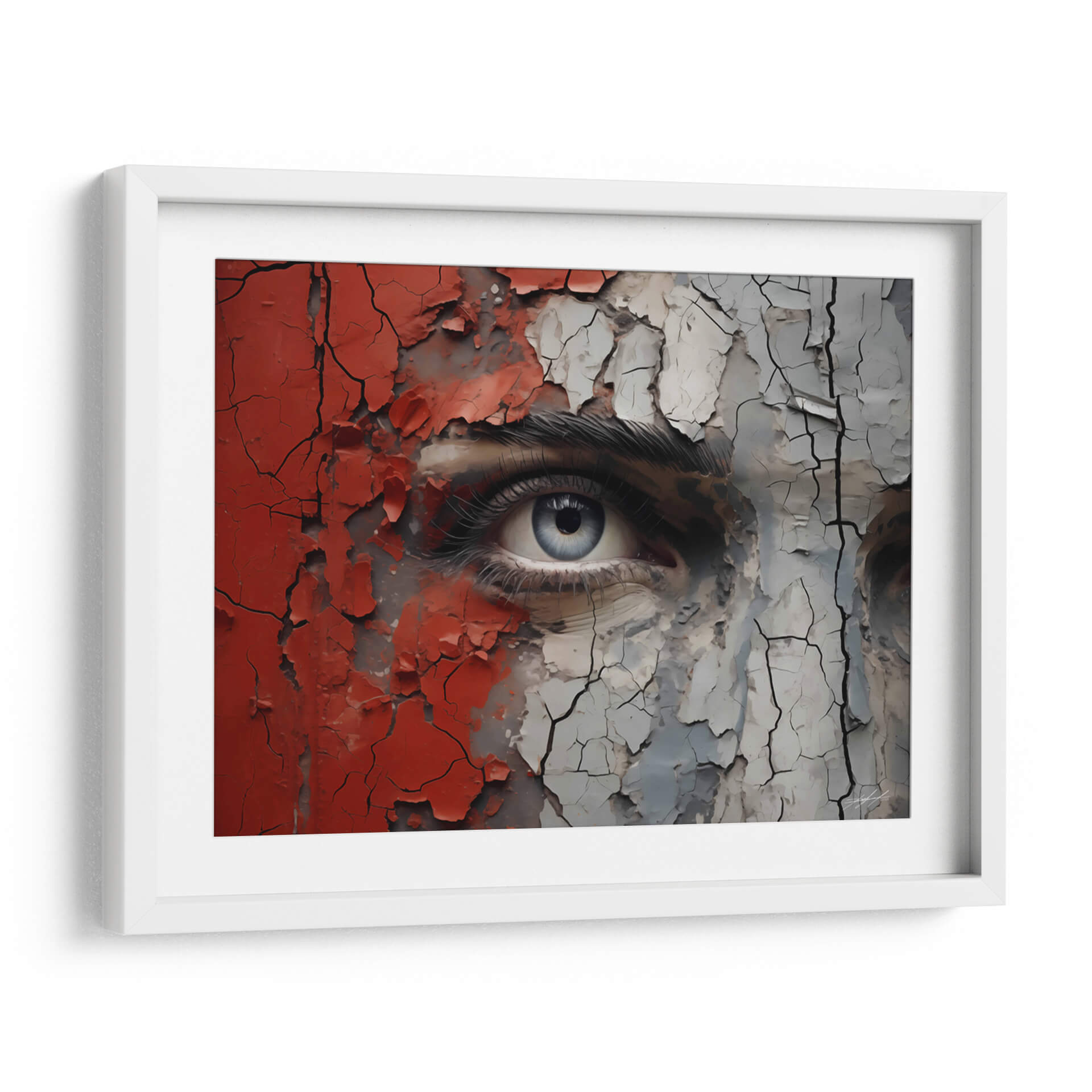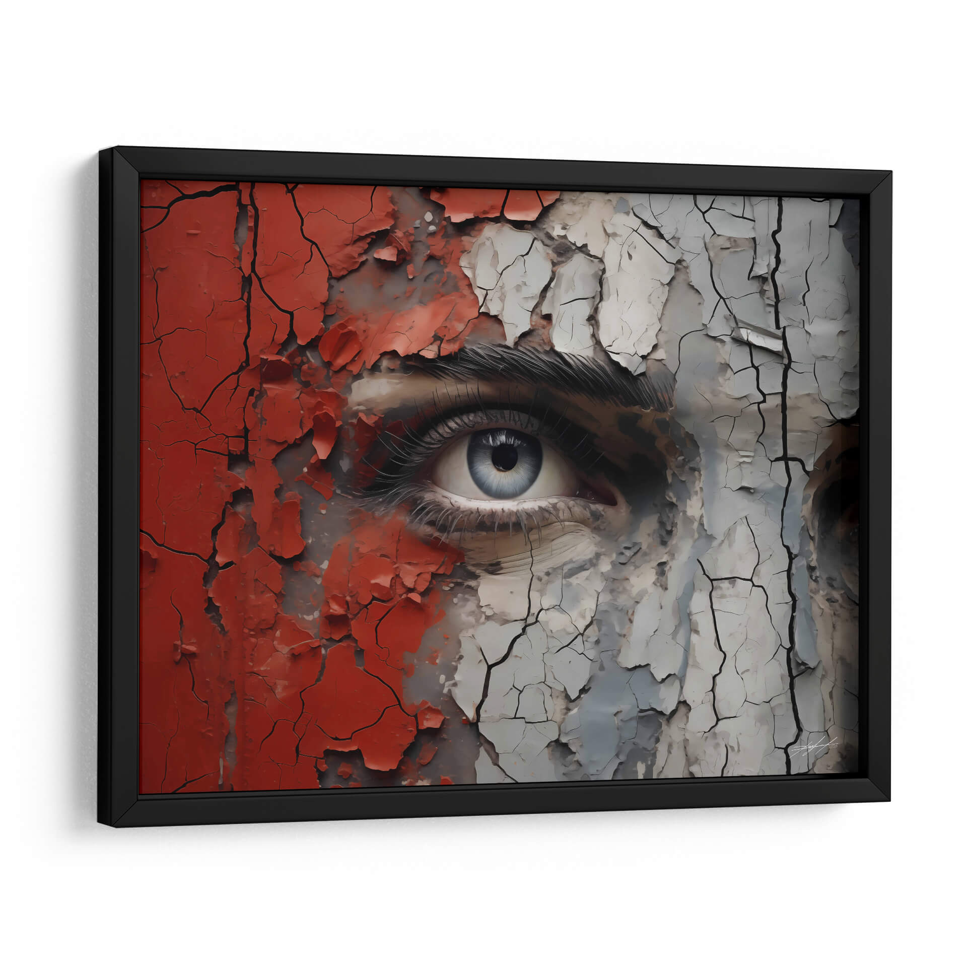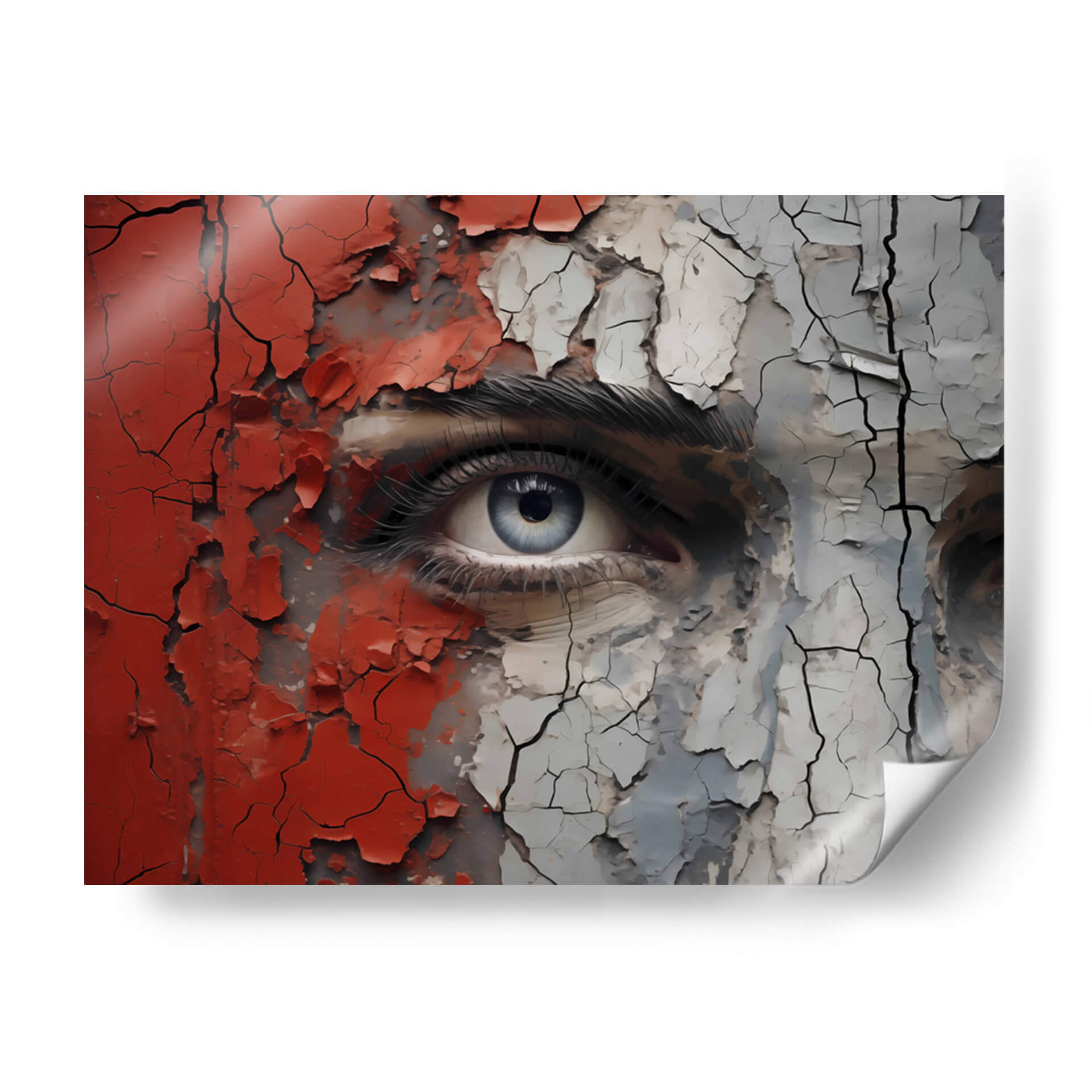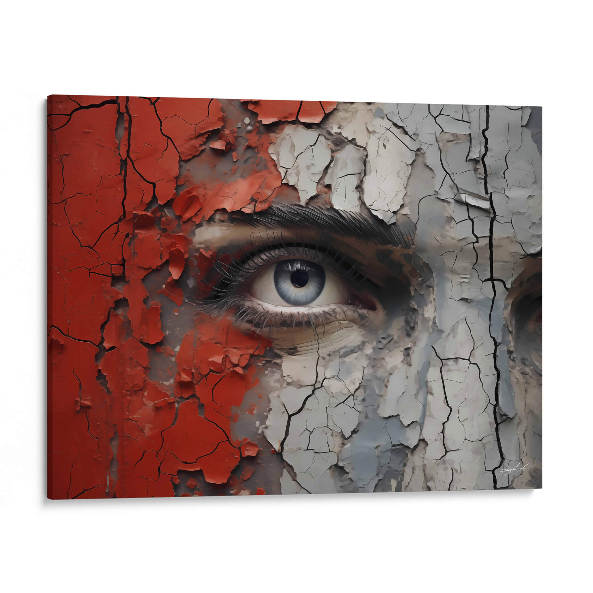 Sumérgete en la intensidad y el misterio de "VEO - 7" de DeLaVegaGaming, un cuadro decorativo que captura la esencia de una mirada profunda envuelta en texturas desgastadas y colores vibrantes. Esta obra de arte contemporáneo presenta un primer plano impactante de un ojo azul penetrante, rodeado por fragmentos de pintura roja y gris que se agrietan y desprenden, revelando capas subyacentes de complejidad. La técnica empleada crea una sensación de tiempo y experiencia, como si la superficie estuviera contando una historia de transformación y resistencia. La paleta de colores, dominada por el contraste entre el rojo audaz, el gris neutro y el azul etéreo del iris, genera una tensión visual cautivadora. El estilo, que combina realismo detallado en el ojo con elementos abstractos y texturizados en el resto de la composición, resulta en una pieza única y moderna. "VEO - 7" es ideal para aquellos que buscan añadir un toque de introspección y carácter a sus espacios, ya sea una sala de estar contemporánea, un estudio creativo o un dormitorio que invite a la reflexión. Este cuadro decorativo es una invitación a la contemplación, fusionando la vulnerabilidad de la mirada con la fuerza de las texturas desgastadas.