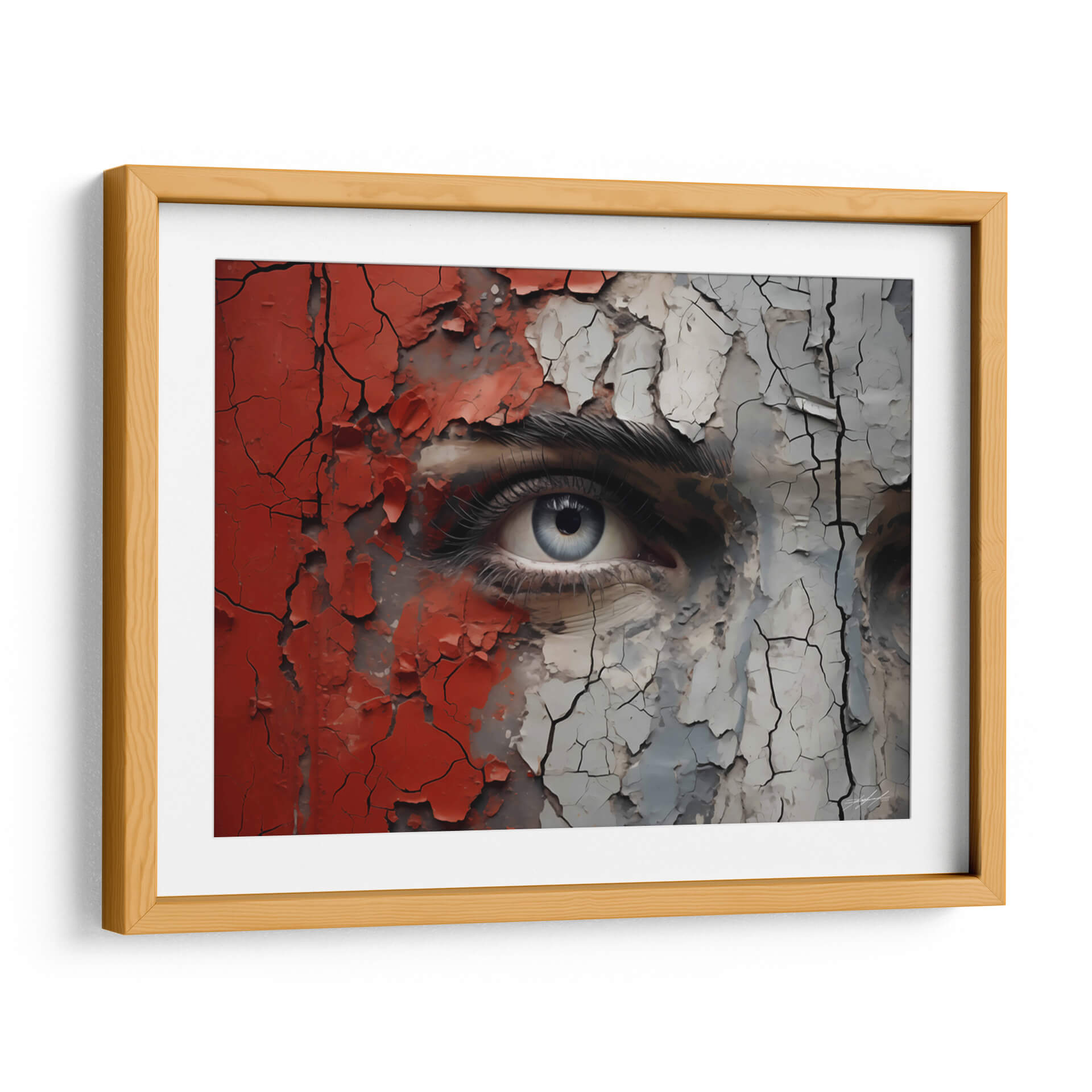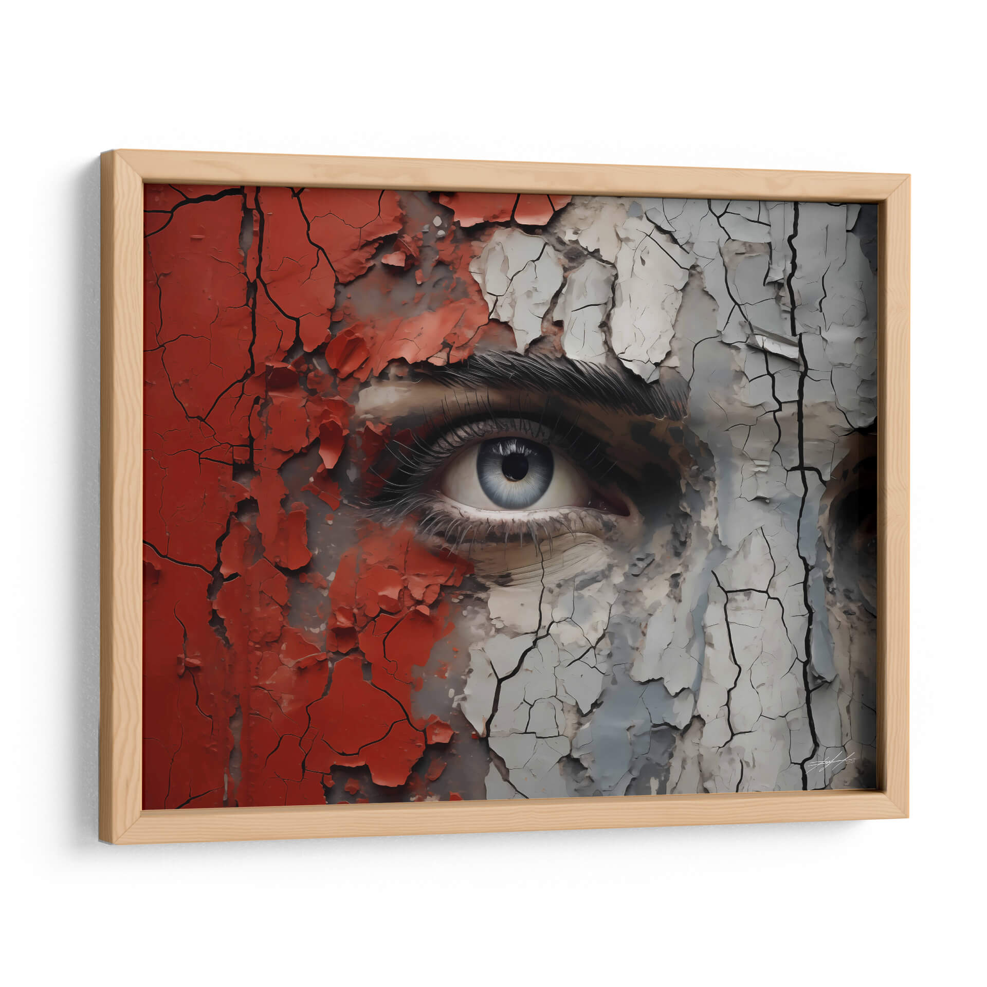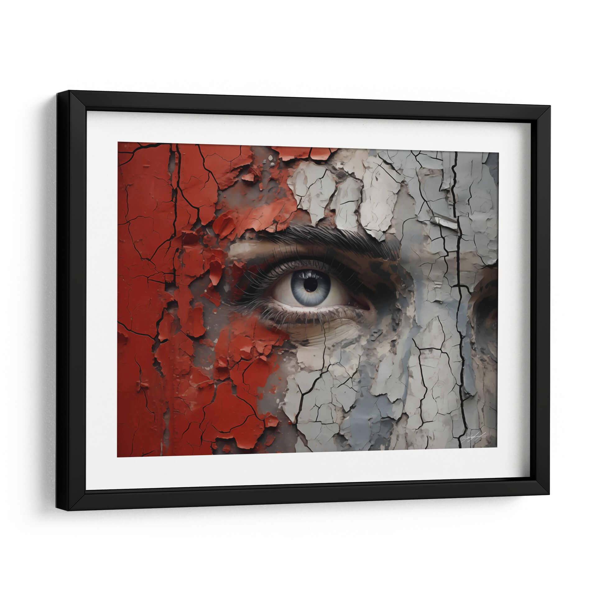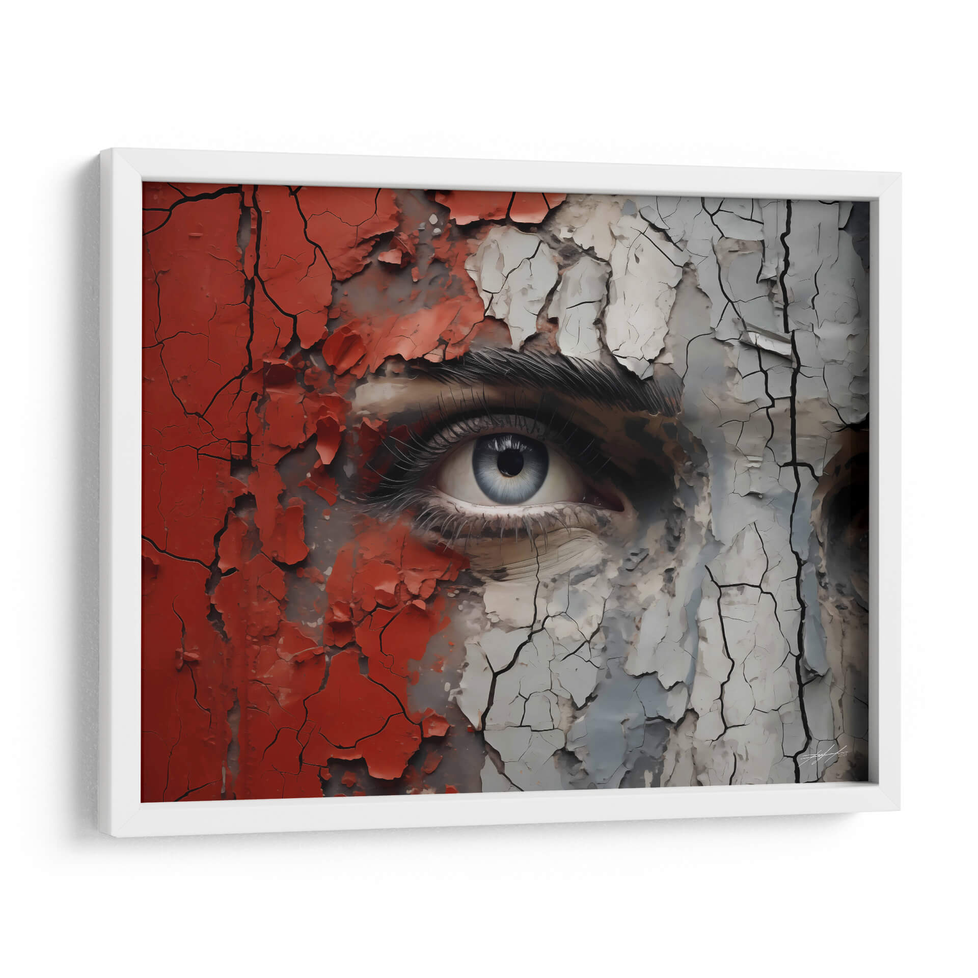 Sumérgete en la intensidad y el misterio de "VEO - 7" de DeLaVegaGaming, un cuadro decorativo que captura la esencia de una mirada profunda envuelta en texturas desgastadas y colores vibrantes. Esta obra de arte contemporáneo presenta un primer plano impactante de un ojo azul penetrante, rodeado por fragmentos de pintura roja y gris que se agrietan y desprenden, revelando capas subyacentes de complejidad. La técnica empleada crea una sensación de tiempo y experiencia, como si la superficie estuviera contando una historia de transformación y resistencia. La paleta de colores, dominada por el contraste entre el rojo audaz, el gris neutro y el azul etéreo del iris, genera una tensión visual cautivadora. El estilo, que combina realismo detallado en el ojo con elementos abstractos y texturizados en el resto de la composición, resulta en una pieza única y moderna. "VEO - 7" es ideal para aquellos que buscan añadir un toque de introspección y carácter a sus espacios, ya sea una sala de estar contemporánea, un estudio creativo o un dormitorio que invite a la reflexión. Este cuadro decorativo es una invitación a la contemplación, fusionando la vulnerabilidad de la mirada con la fuerza de las texturas desgastadas.