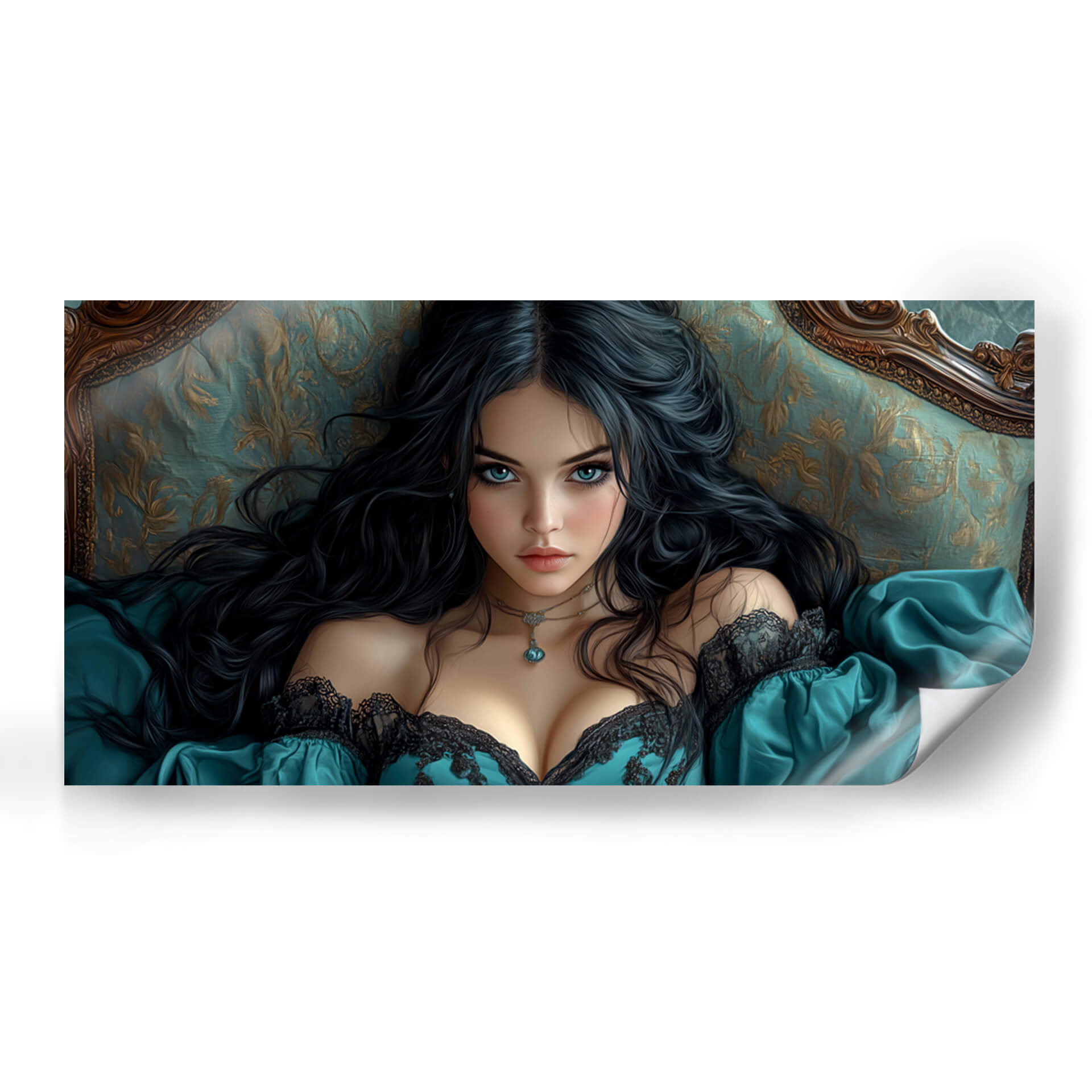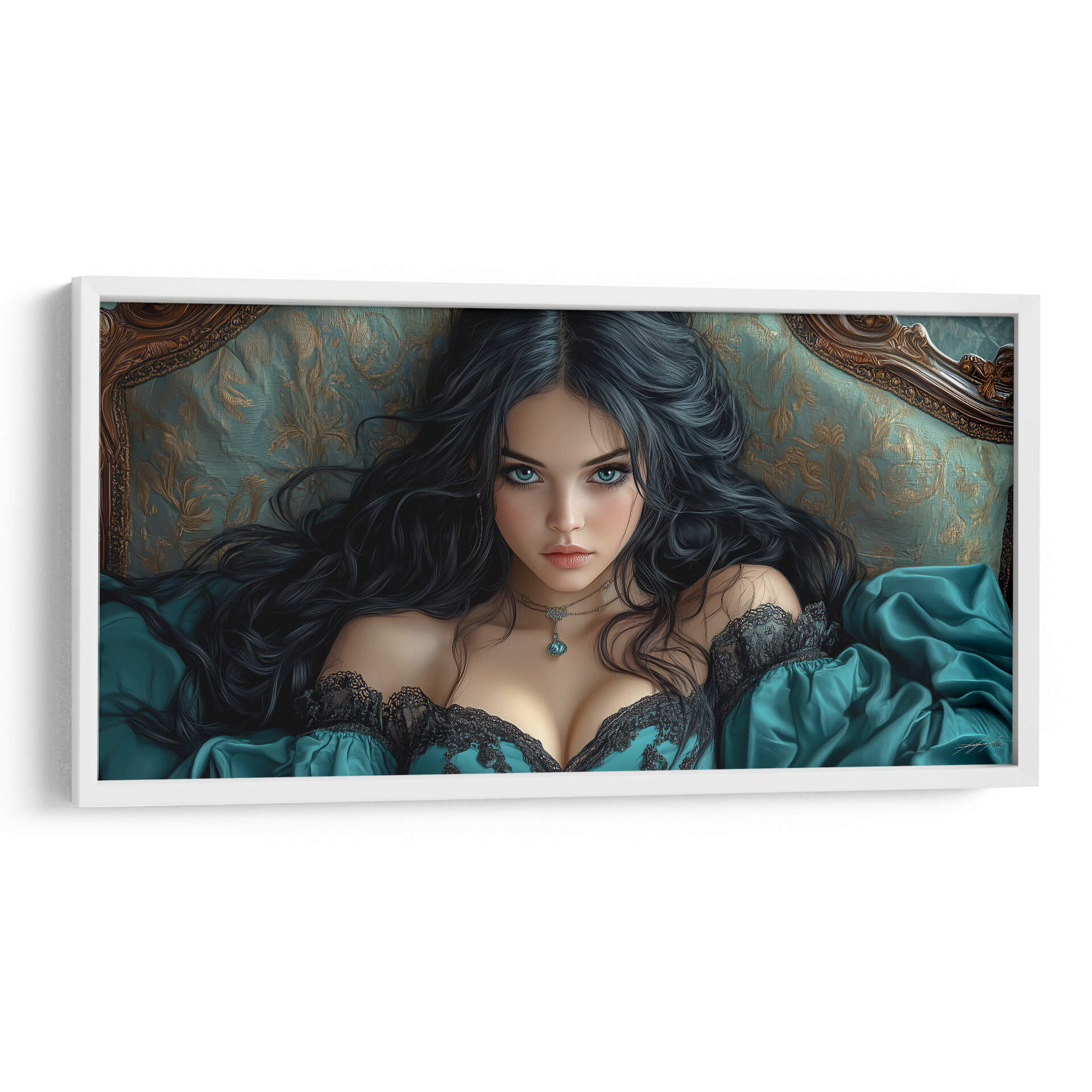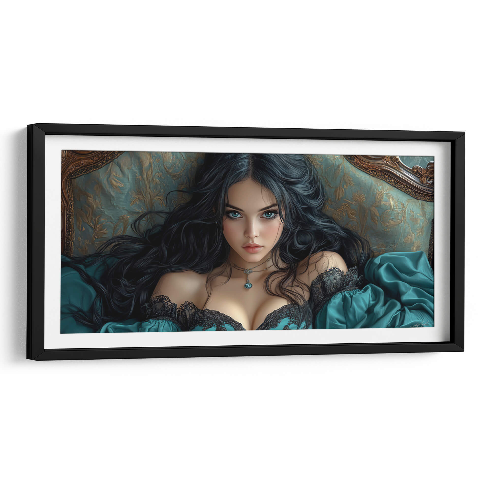 Sumérgete en la opulencia y el misterio con "Victorianas - IX", una obra de arte digital que evoca la sensualidad y la elegancia de una época pasada. La pieza presenta una figura femenina con una mirada penetrante y cautivadora, enmarcada por una cascada de cabello oscuro y una delicada vestimenta de encaje en tonos turquesa. El fondo, con su intrincado tapizado y detalles dorados, añade una capa de riqueza y sofisticación, transportando al espectador a un salón suntuoso. La paleta de colores, dominada por los profundos azules verdosos del vestido y el turquesa de las joyas, contrasta sutilmente con los tonos cálidos y dorados del entorno, creando una atmósfera de intimidad y lujo. Esta obra, con su estilo realista y un toque de fantasía, es perfecta para aquellos que buscan añadir un punto focal dramático y seductor a su decoración. Ideal para un dormitorio principal, un vestidor o incluso una sala de estar con carácter, "Victorianas - IX" invita a la contemplación y a la admiración, convirtiéndose en una pieza central que no pasará desapercibida. Su composición, centrada en la figura y su expresión, genera una conexión directa con el observador, haciendo de este cuadro decorativo una elección excepcional para amantes del arte con gusto por lo clásico y lo etéreo.