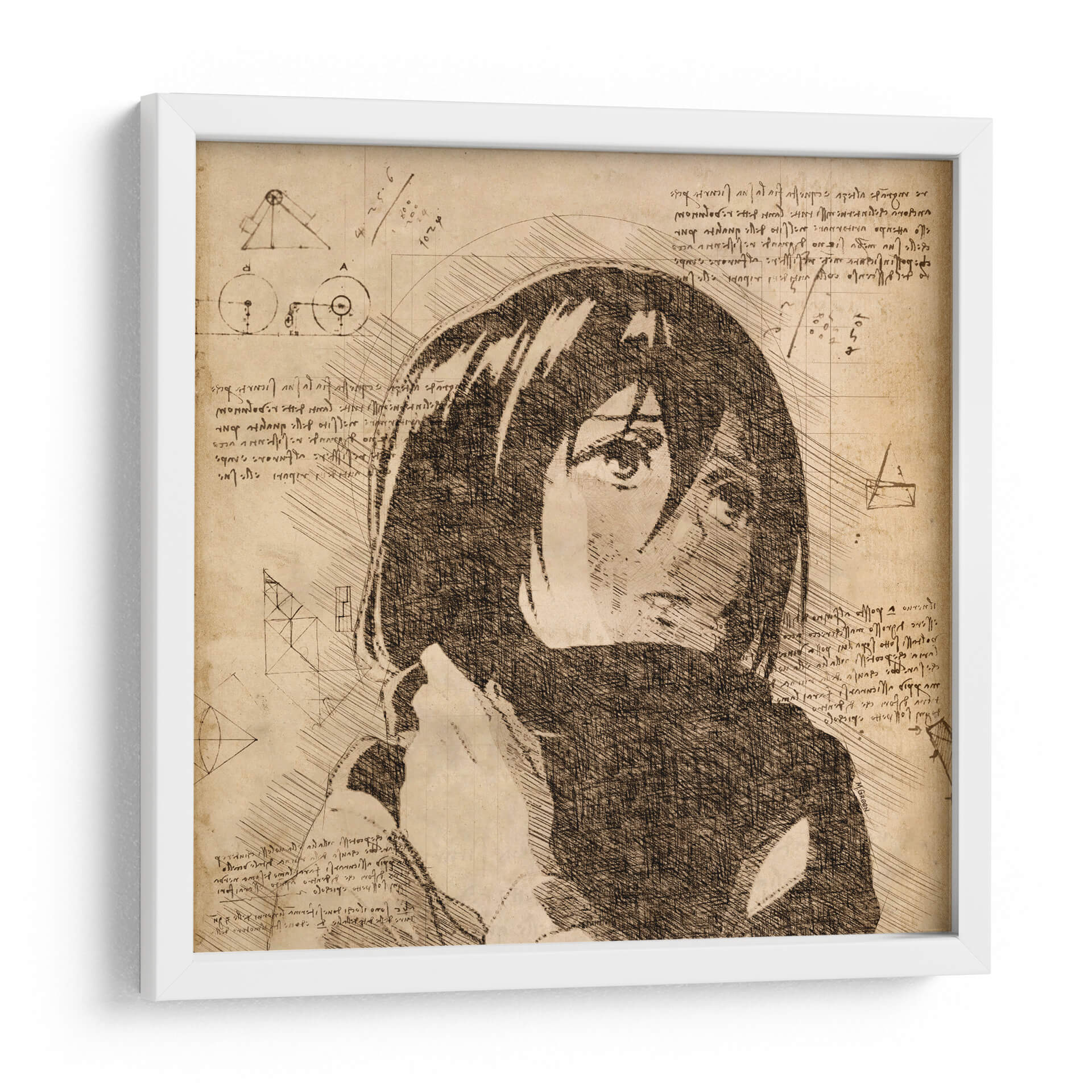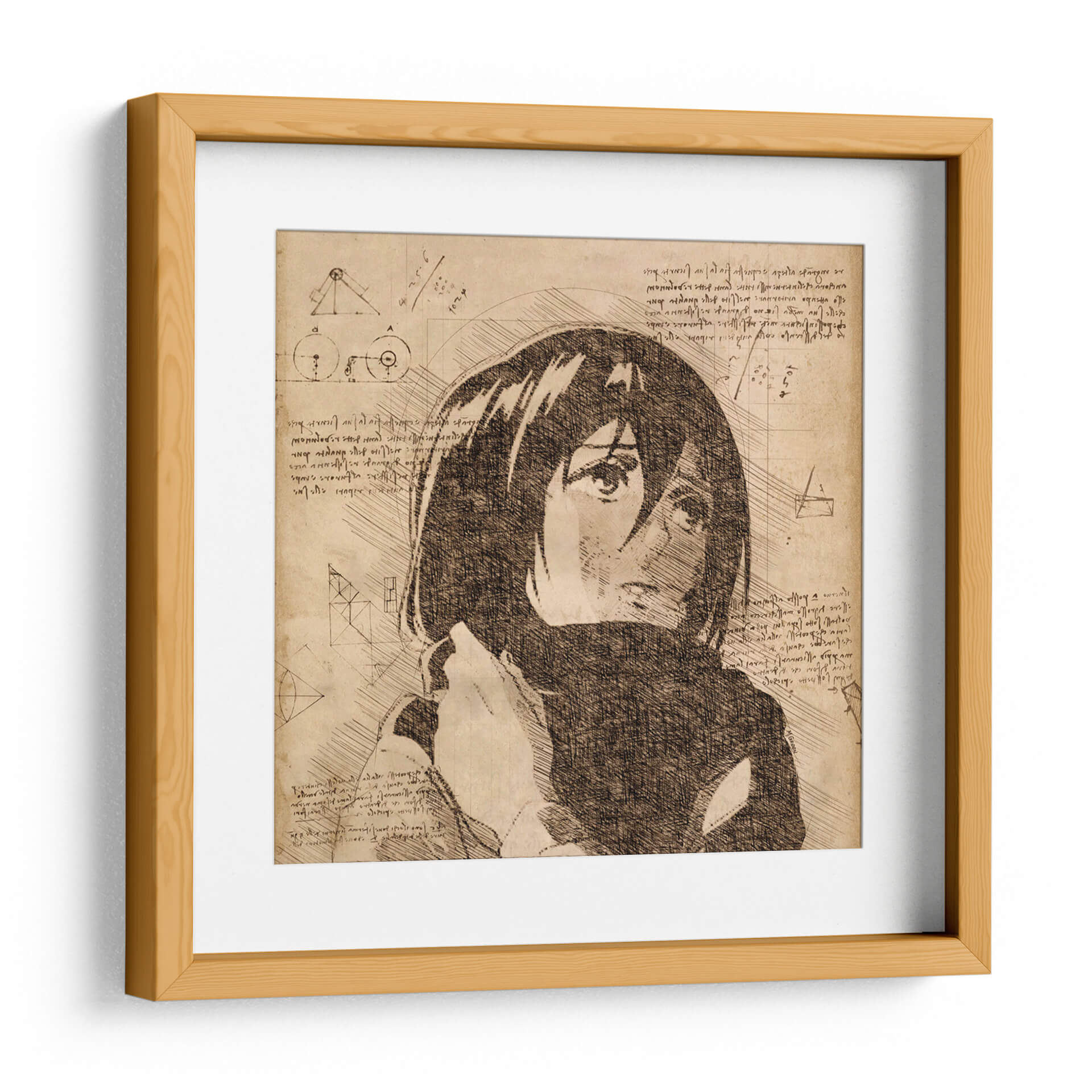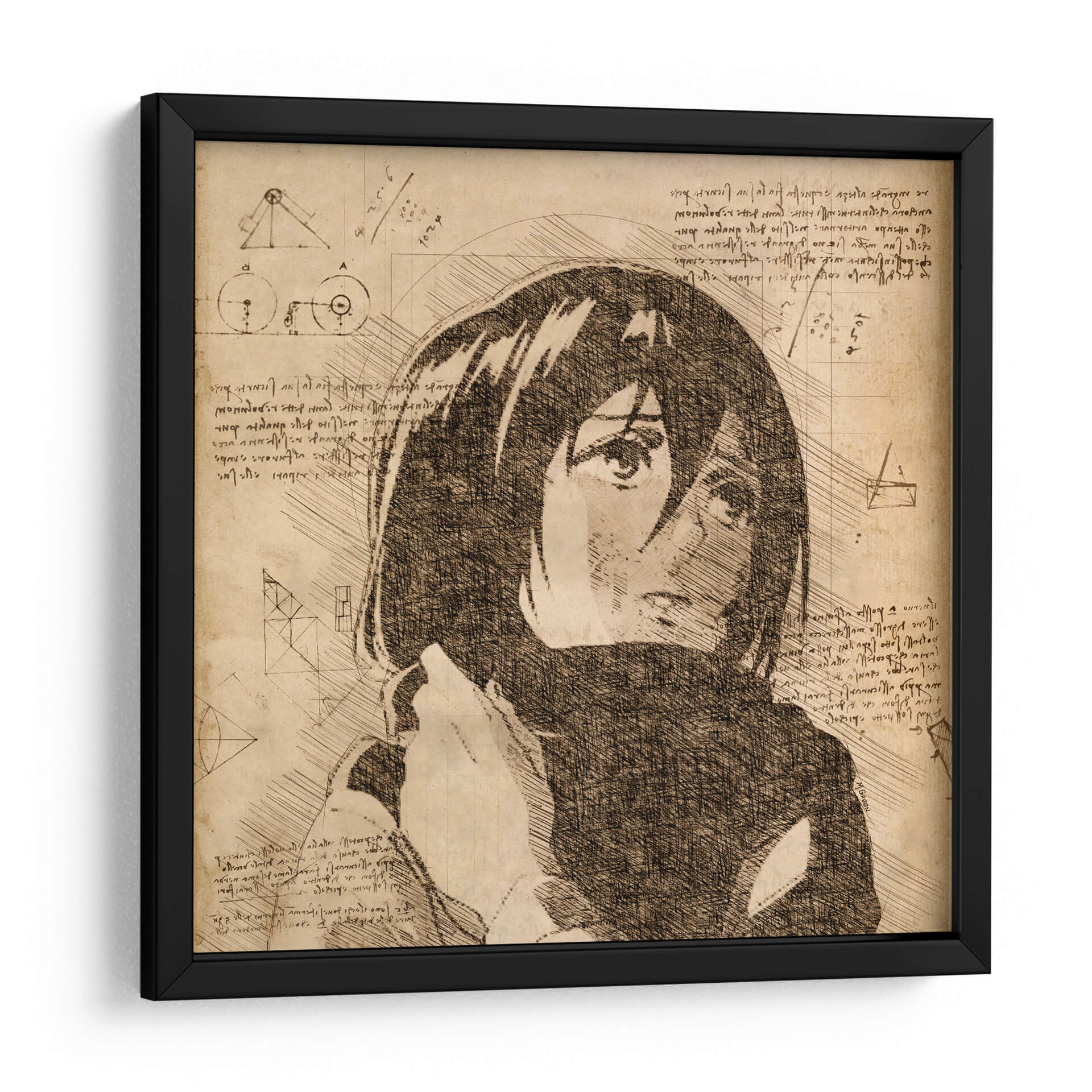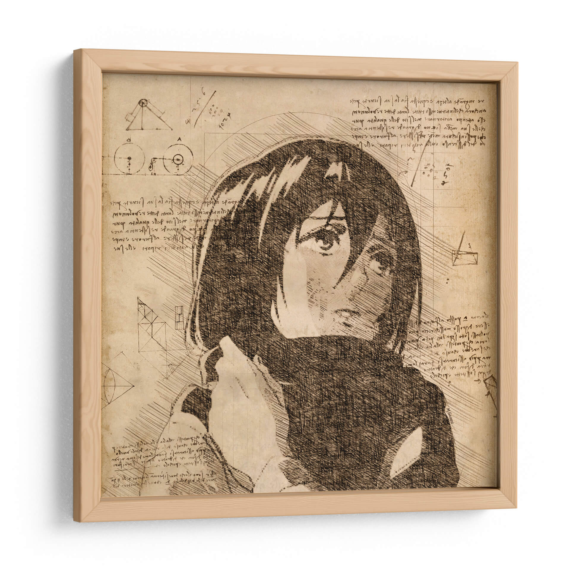 Este cautivador cuadro decorativo, inspirado en el estilo de Da Vinci, presenta un retrato conmovedor de una figura femenina. La obra se caracteriza por su estética de boceto a mano alzada, evocando la atmósfera de los estudios renacentistas. Los trazos de lápiz y tinta, en tonos sepia y tierra, se entrelazan sobre un fondo que simula pergamino antiguo, adornado con diagramas técnicos y anotaciones manuscritas que recuerdan los cuadernos de Leonardo da Vinci. La mirada de la protagonista, introspectiva y enigmática, dirige la atención hacia su expresión sutilmente melancólica. La composición, centrada en el rostro y las manos delicadamente dibujadas, crea una conexión íntima con el espectador. Este cuadro es una pieza excepcional para quienes aprecian el arte con un toque clásico y misterioso, ideal para añadir profundidad y carácter a una biblioteca, un estudio o una sala de estar con un estilo ecléctico o tradicional. Su diseño atemporal lo convierte en un punto focal que invita a la contemplación y la admiración, fusionando el arte del Renacimiento con una sensibilidad contemporánea.