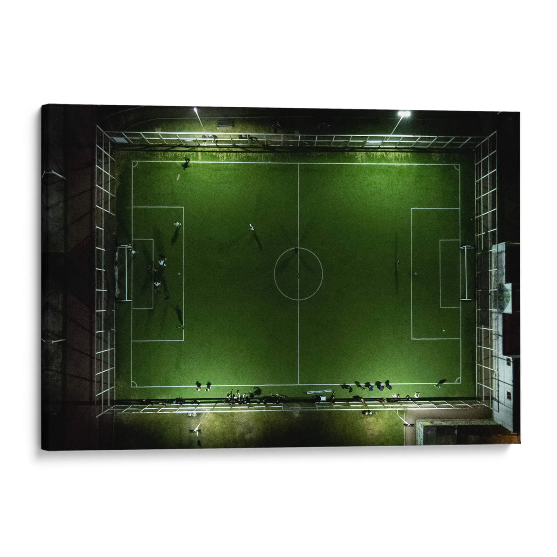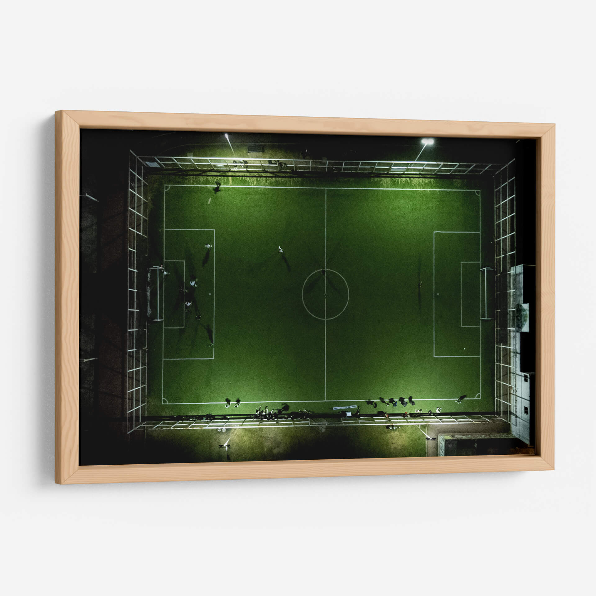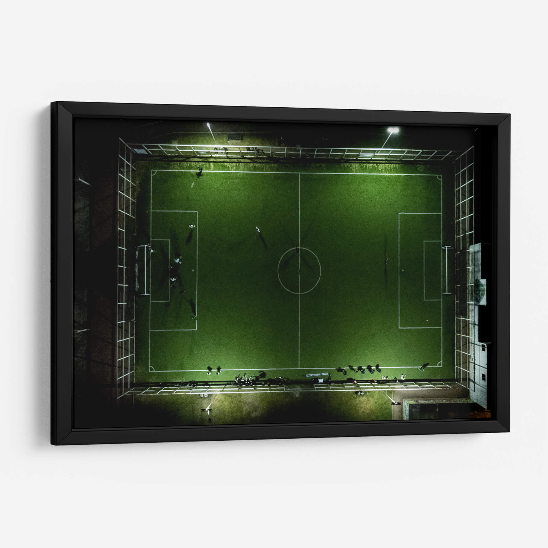 Captura la esencia vibrante del deporte y la pasión por el juego con "Campo de Juego", una obra de arte visualmente impactante del artista Peter PerezDiaz. Esta pieza ofrece una perspectiva aérea única de un campo de fútbol iluminado por focos, creando un ambiente dinámico y cautivador. Los tonos verdes intensos del césped contrastan con las líneas blancas nítidas y la oscuridad circundante, realzados por el brillo estratégico de la iluminación artificial que proyecta sombras alargadas y añade profundidad. Se percibe la actividad humana en forma de figuras difuminadas de jugadores y espectadores, sugiriendo el clímax de un partido o un entrenamiento nocturno. La composición, vista desde una altura considerable, evoca una sensación de orden y estrategia, a la vez que captura la energía latente del momento deportivo. "Campo de Juego" es ideal para decorar espacios que buscan inspirar acción, compañerismo y dedicación, como oficinas modernas, salas de estar de aficionados al deporte o incluso gimnasios. Este cuadro decorativo no solo embellece tu pared, sino que también infunde un espíritu de competencia y perseverancia en tu entorno, convirtiéndose en un punto focal que evoca emociones y conversaciones.