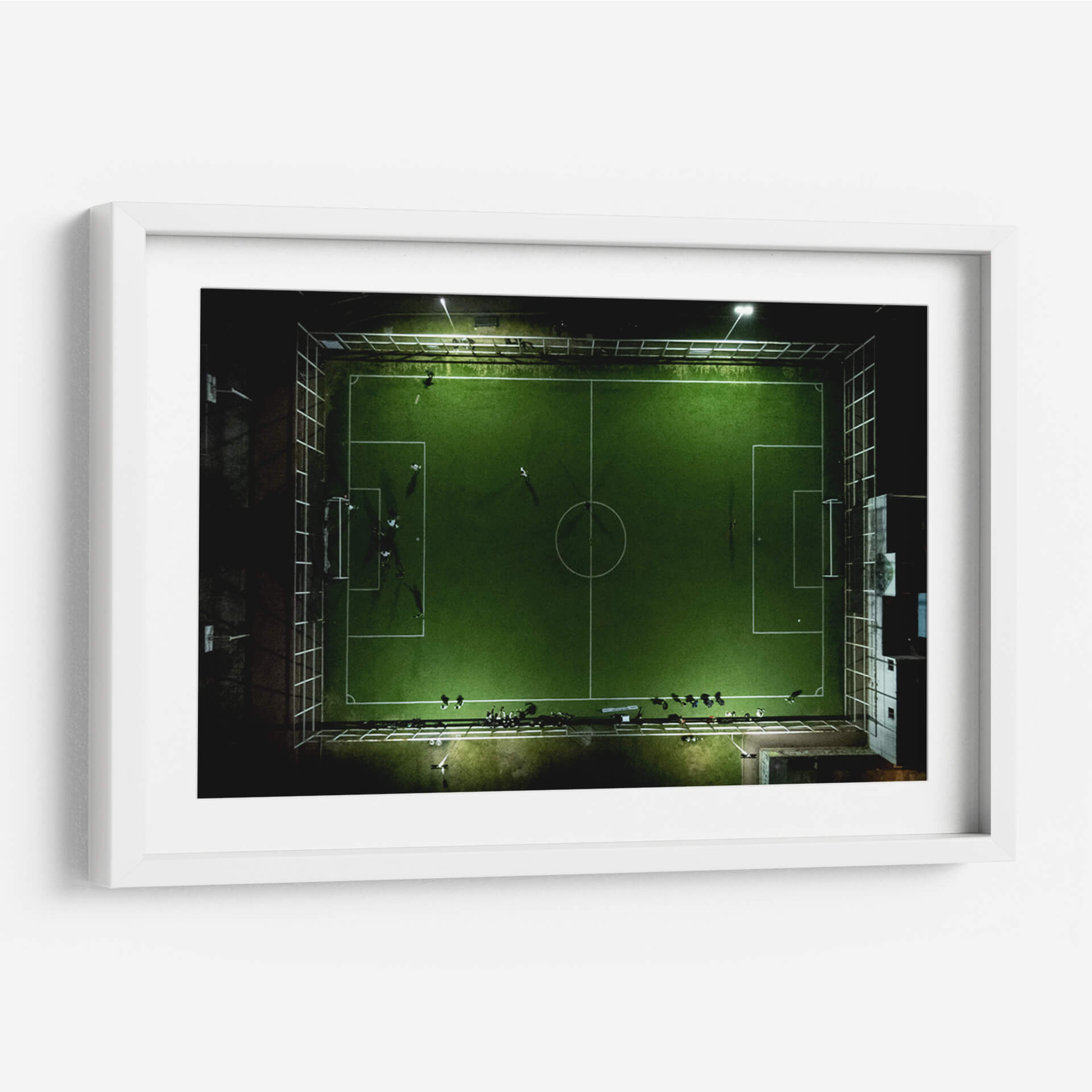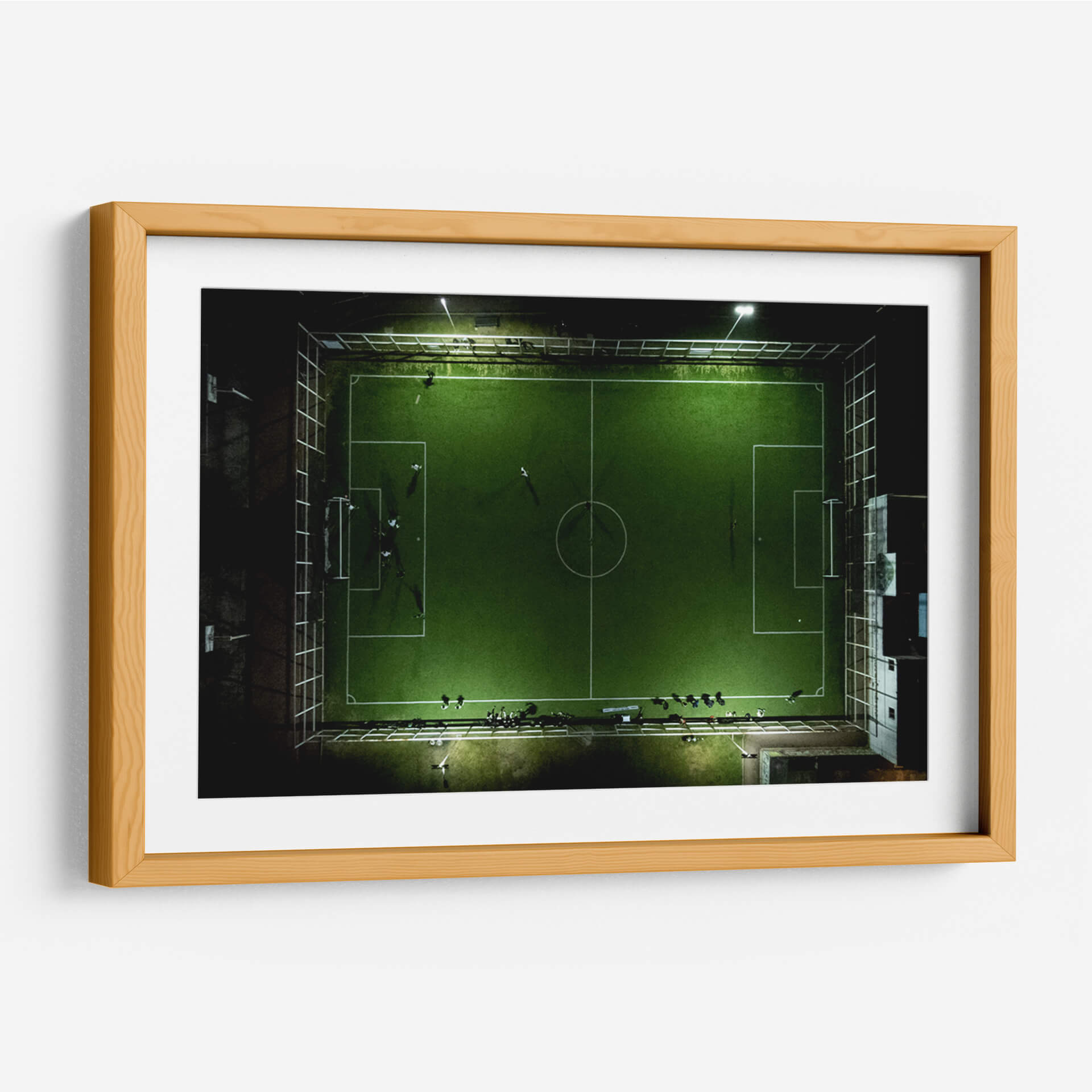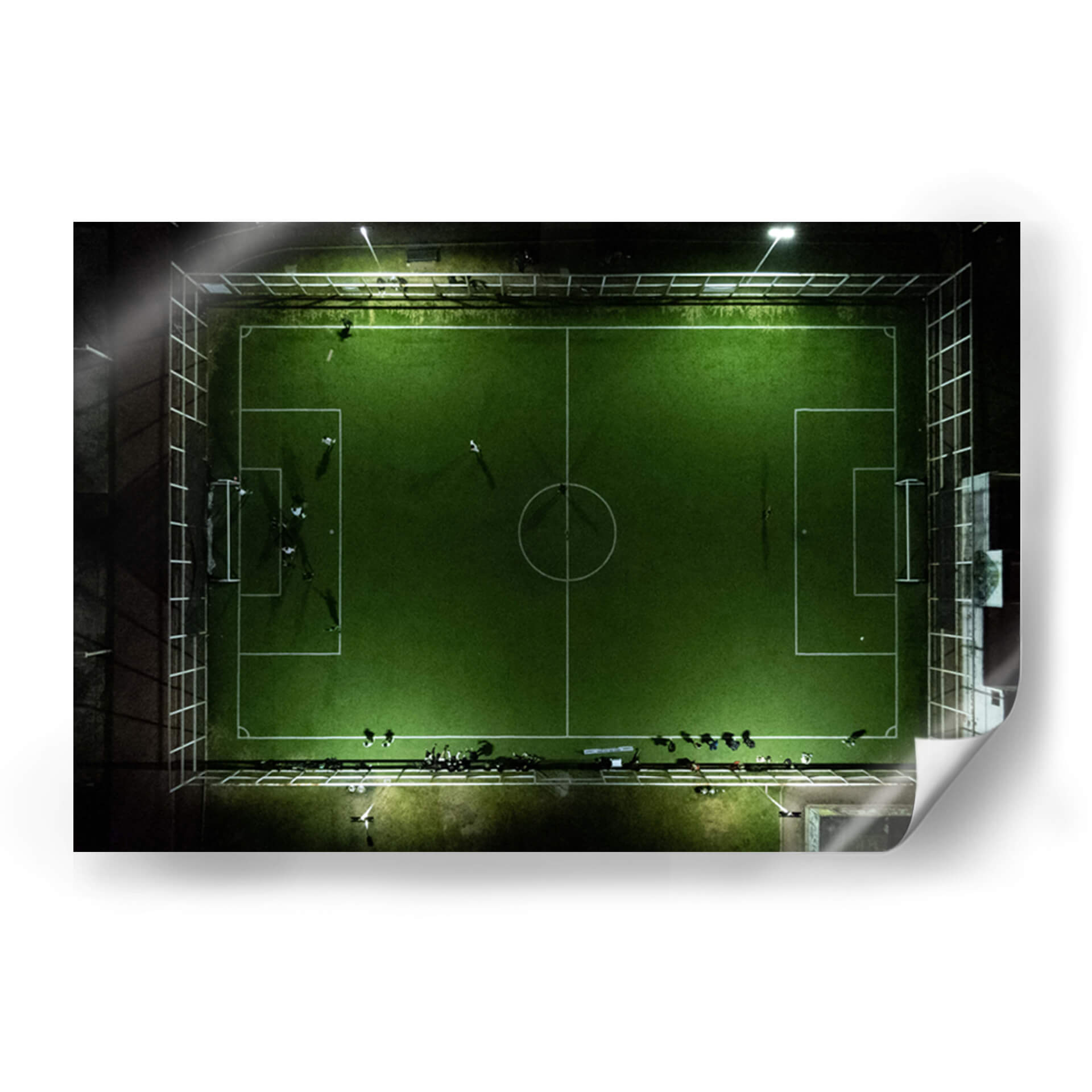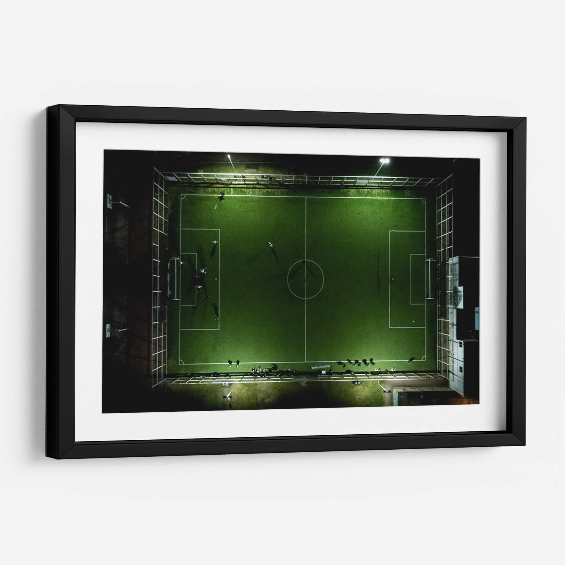 Captura la esencia vibrante del deporte y la pasión por el juego con "Campo de Juego", una obra de arte visualmente impactante del artista Peter PerezDiaz. Esta pieza ofrece una perspectiva aérea única de un campo de fútbol iluminado por focos, creando un ambiente dinámico y cautivador. Los tonos verdes intensos del césped contrastan con las líneas blancas nítidas y la oscuridad circundante, realzados por el brillo estratégico de la iluminación artificial que proyecta sombras alargadas y añade profundidad. Se percibe la actividad humana en forma de figuras difuminadas de jugadores y espectadores, sugiriendo el clímax de un partido o un entrenamiento nocturno. La composición, vista desde una altura considerable, evoca una sensación de orden y estrategia, a la vez que captura la energía latente del momento deportivo. "Campo de Juego" es ideal para decorar espacios que buscan inspirar acción, compañerismo y dedicación, como oficinas modernas, salas de estar de aficionados al deporte o incluso gimnasios. Este cuadro decorativo no solo embellece tu pared, sino que también infunde un espíritu de competencia y perseverancia en tu entorno, convirtiéndose en un punto focal que evoca emociones y conversaciones.