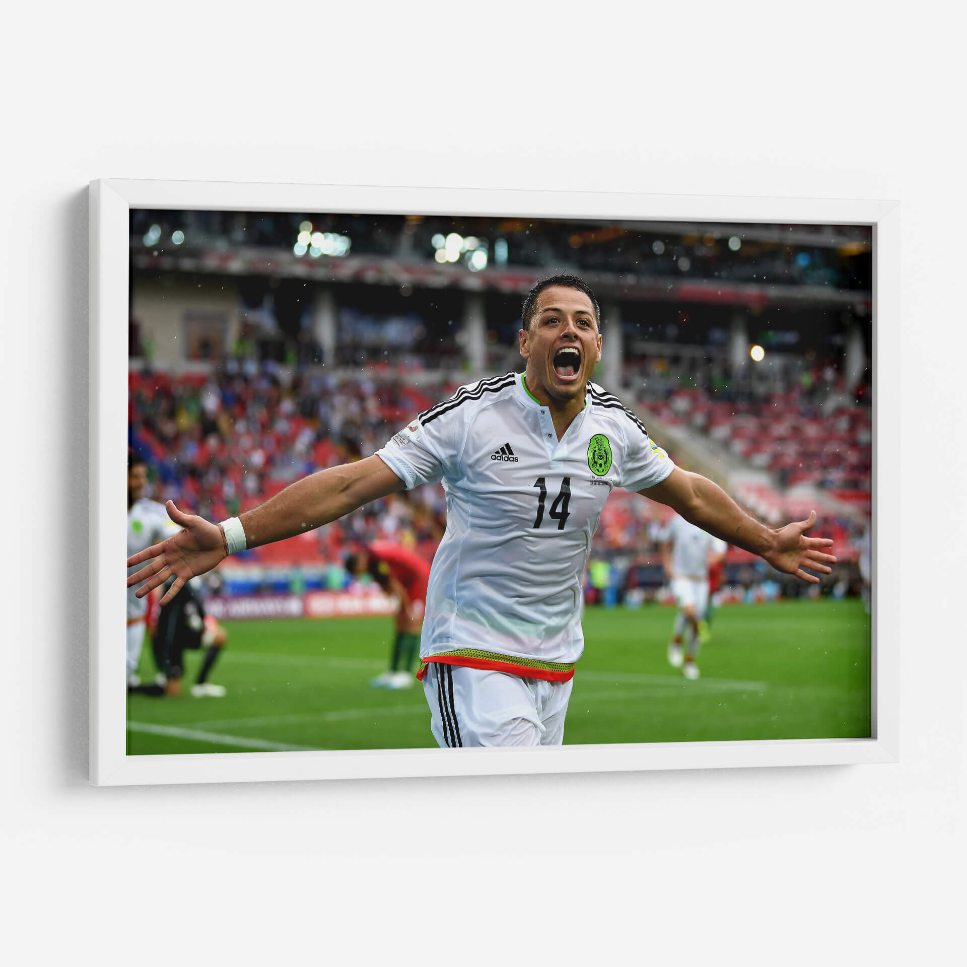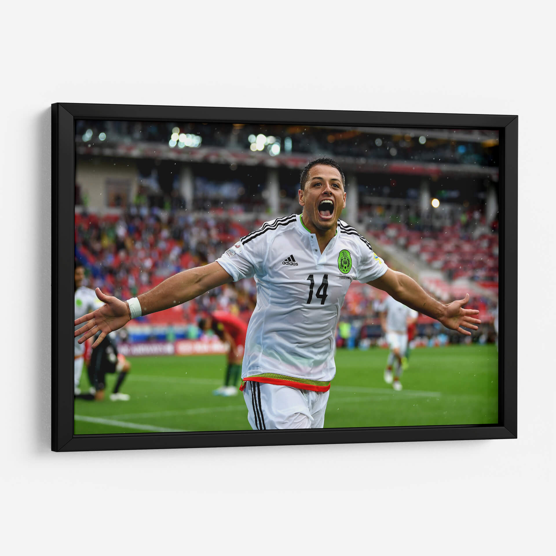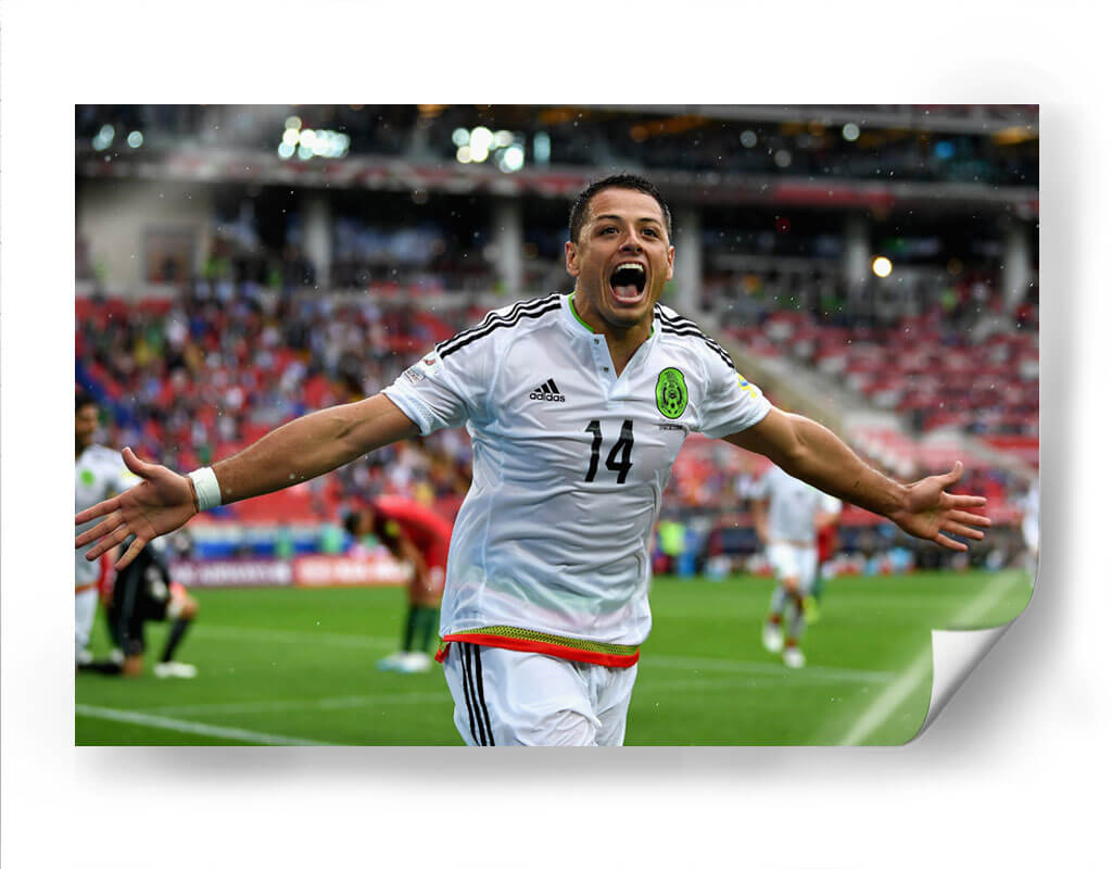 Captura la euforia y la pasión del fútbol con este vibrante cuadro decorativo del "Chicharito" con la Selección Mexicana. La obra inmortaliza un momento de pura celebración, con el icónico jugador en pleno festejo, jersey blanco y el número 14 visible, desatando la alegría en el campo. Los colores vivos del césped, el uniforme y el público de fondo crean una atmósfera dinámica y emocionante, perfecta para cualquier aficionado al deporte rey. Este cuadro es una pieza de arte contemporáneo que evoca la adrenalina de un gol importante y el orgullo nacional. Ideal para decorar salas de estar, estudios, oficinas o cualquier espacio donde se desee inyectar energía y un espíritu ganador. Su composición centrada en la figura del jugador, con los brazos extendidos y la mirada triunfal, lo convierte en un punto focal que sin duda atraerá miradas y generará conversación. Transforma tu entorno con la esencia del deporte y celebra la trayectoria de una leyenda del fútbol mexicano.