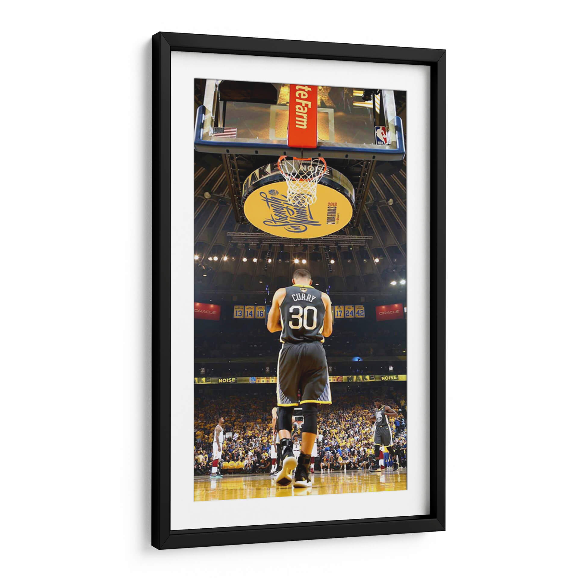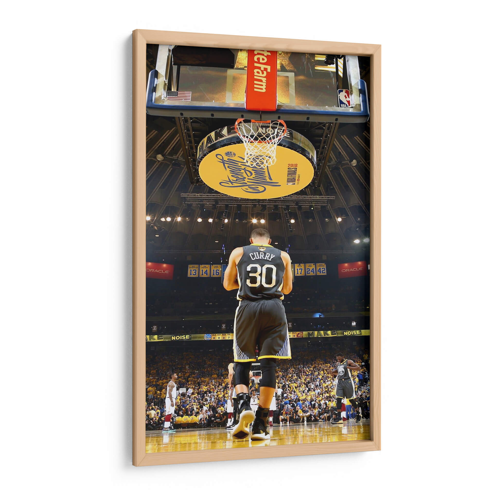 Captura la intensidad y el legado del baloncesto con este impresionante cuadro decorativo de Stephen Curry. La obra retrata al icónico jugador en un momento de concentración, visto desde atrás, luciendo su camiseta con el número 30 y el nombre 'CURRY'. El fondo se sumerge en la vibrante atmósfera de un partido de baloncesto profesional, con la multitud animando y las luces del estadio creando un ambiente electrizante. Los colores predominantes, como el dorado, negro y toques de rojo en la lona publicitaria, aportan profundidad y dinamismo a la composición. Este cuadro es una pieza de arte contemporáneo perfecta para cualquier aficionado al baloncesto o para quienes buscan inyectar energía y pasión en su hogar u oficina. Su estilo fotográfico y la composición centrada en el jugador lo convierten en un punto focal ideal para salas de estar, estudios o espacios dedicados al deporte. Transmite una sensación de determinación, grandeza y el espíritu de equipo, evocando la emoción de los momentos cumbre de la NBA. Un homenaje visual a la "fuerza en los números" y a uno de los jugadores más influyentes de la era moderna del baloncesto.