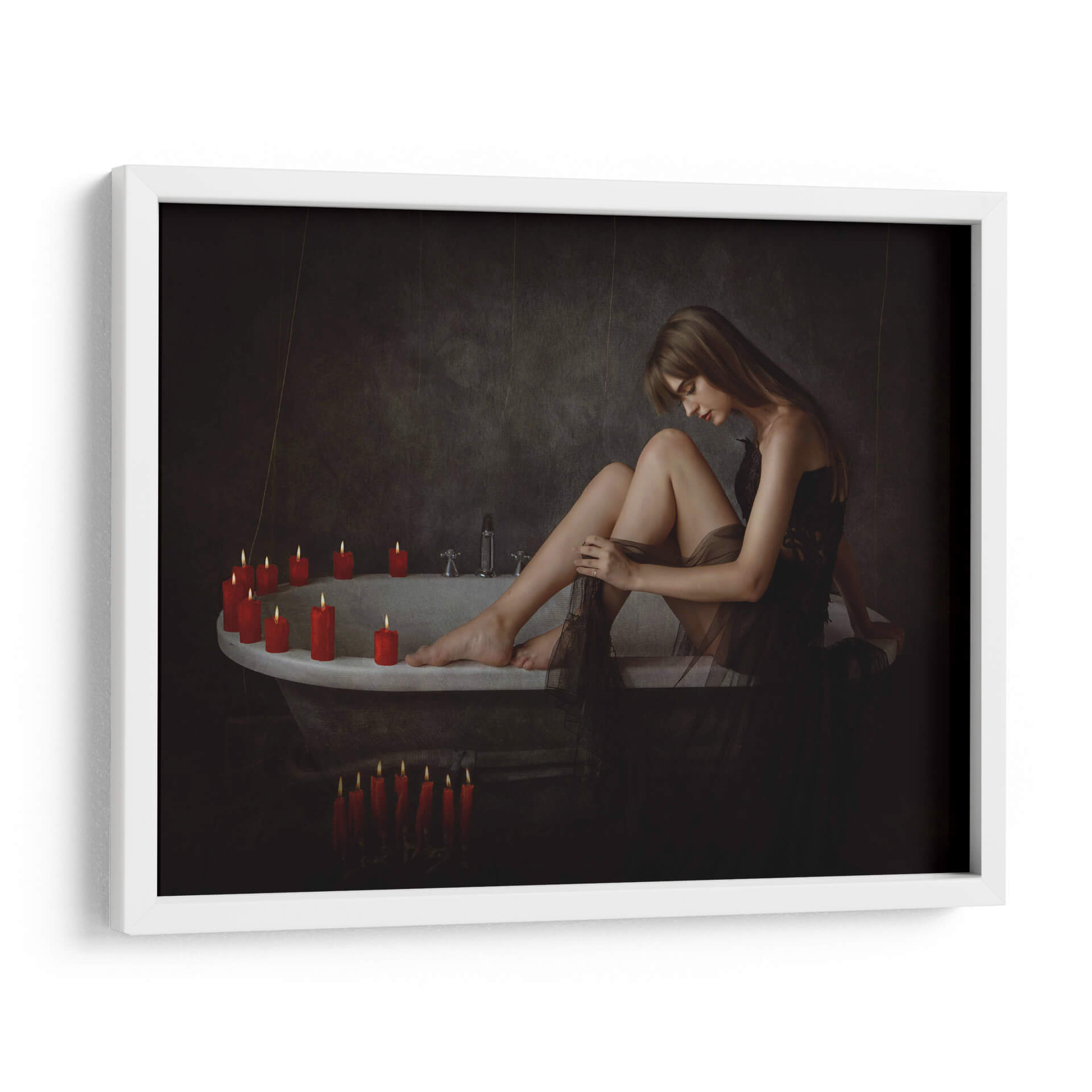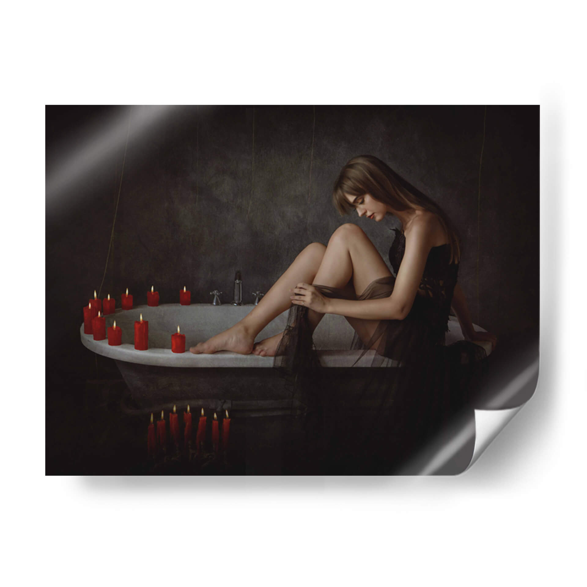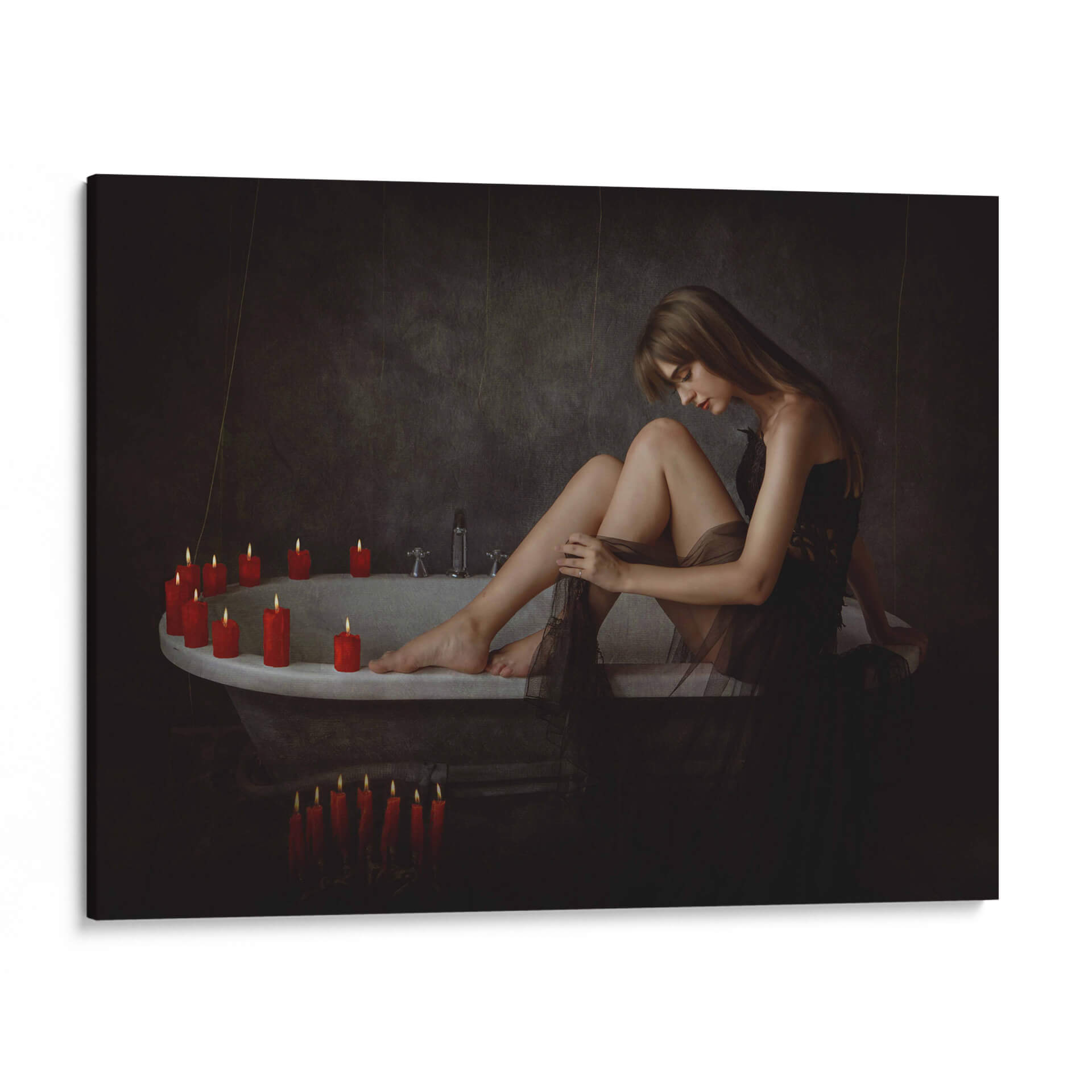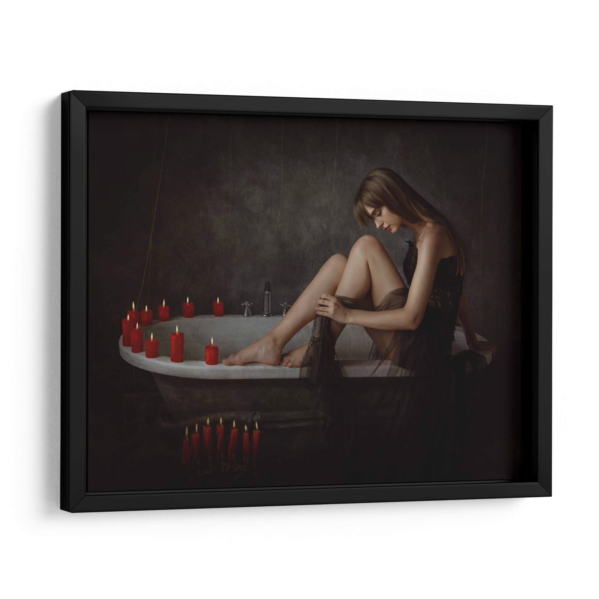 Sumérgete en la atmósfera íntima y enigmática de "Tori sobre la tina", una obra maestra del artista Sebastian Kisworo. Este cuadro decorativo captura un momento de introspección femenina, donde la suave luz de las velas ilumina la serenidad y la vulnerabilidad de una mujer en un baño antiguo. La paleta de colores, dominada por tonos oscuros y contrastada por el cálido resplandor de las velas rojas, crea un ambiente de calma y misterio, ideal para espacios que buscan un toque de sofisticación y profundidad emocional. La composición cuidadosa y el estilo realista-cinematográfico de Kisworo invitan a la contemplación, haciendo de esta pieza un punto focal cautivador para tu hogar u oficina. Transforma tus paredes en una galería personal con esta evocadora representación de la quietud y la belleza efímera. "Tori sobre la tina" es más que una simple imagen; es una invitación a la reflexión y a la conexión con uno mismo, perfecta para añadir un aire de elegancia atemporal a cualquier decoración.